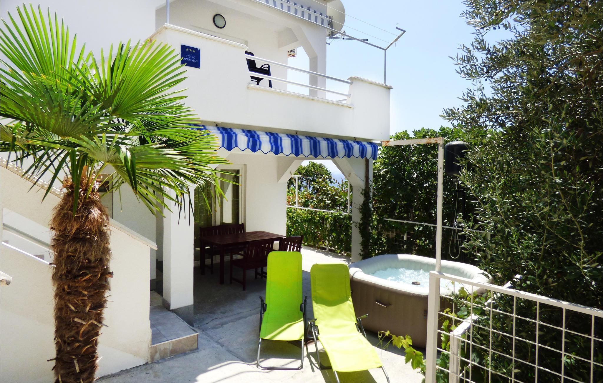 Das Haus liegt auf einem hügeligen Gelände und es gibt keine Zufahrt zum Haus. Die letzten 20 m müssen Sie zu Fuß gehen. Das Ferienhaus besteht aus zwei Etagen, die durch Außentreppen miteinander verbunden sind. Jede Etage verfügt über eine ausgestattete Küche mit Wohnzimmer. Im Erdgeschoss finden Sie ein Schlafzimmer mit Zugang zur Terrasse. Der erste Stock bietet Platz in zwei Schlafzimmern. Das Haus ist damit ideal, wenn Sie mit zwei Familien reisen, aber Privatsphäre wünschen.