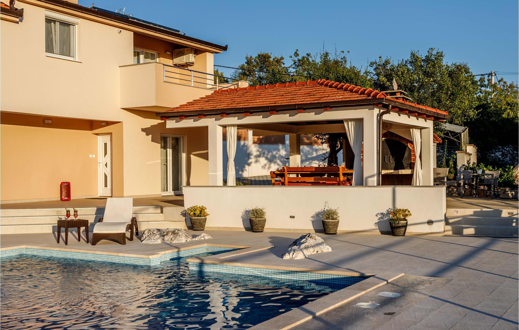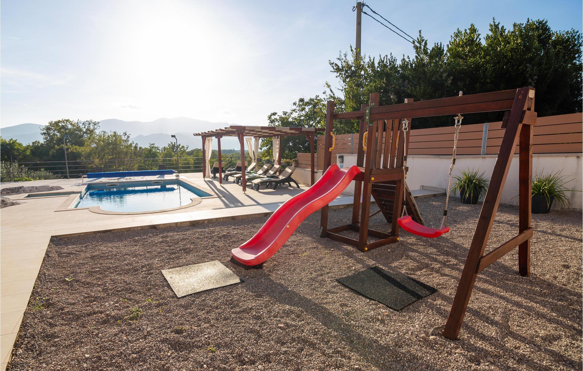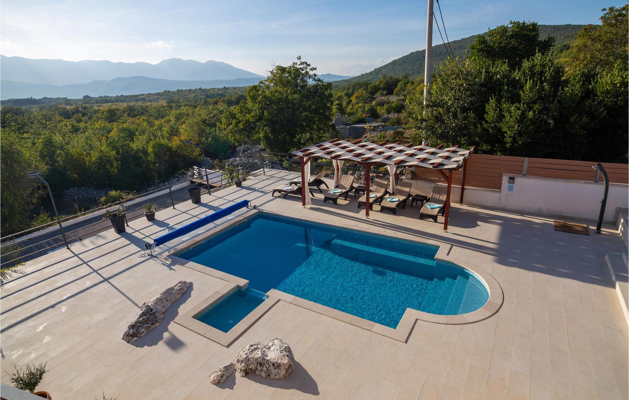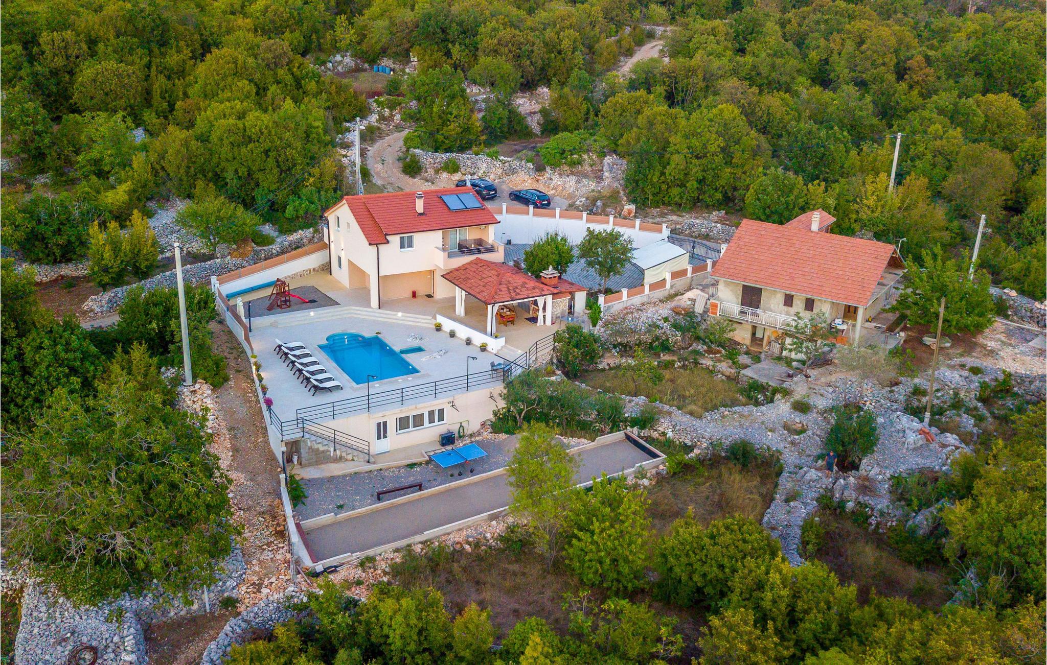 Egal, ob Sie einen ruhigen oder aktiven Urlaub in der Natur verbringen möchten, ist dieses wunderbare Ferienhaus die ideale Wahl für Sie. Es ist modern und komfortabel eingerichtete und mit allem ausgestattet, was Sie für einen erholsamen Urlaub brauchen. Dieses wunderbare Anwesen besticht besonders durch seinen tollen Außenbereich. An und in Ihrem beheizten Pool mit Hydromassagedüsen werden Sie viele schöne Stunden verbringen. Entspannen Sie auf einer der Sonnenliegen oder im Whirlpool, während die Kleinen im Pool planschen. Auf den schönen Terrassen können Sie herrlich frühstücken oder den Tag mit einem Glas dalmatinischen Wein ausklingen lassen. während Sie das tolle Panorama genießen. auch ein Grill für gemeinsame Grillabende steht Ihnen zur Verfügung. Ihre Kinder können sich in den vielen Einrichtungen für die Kleinsten vergnügen. Gemeinsame können Sie Tischtennis oder Darts spielen.