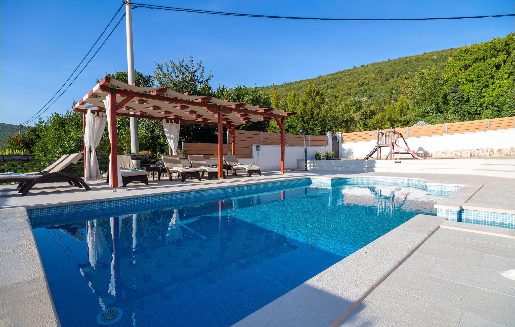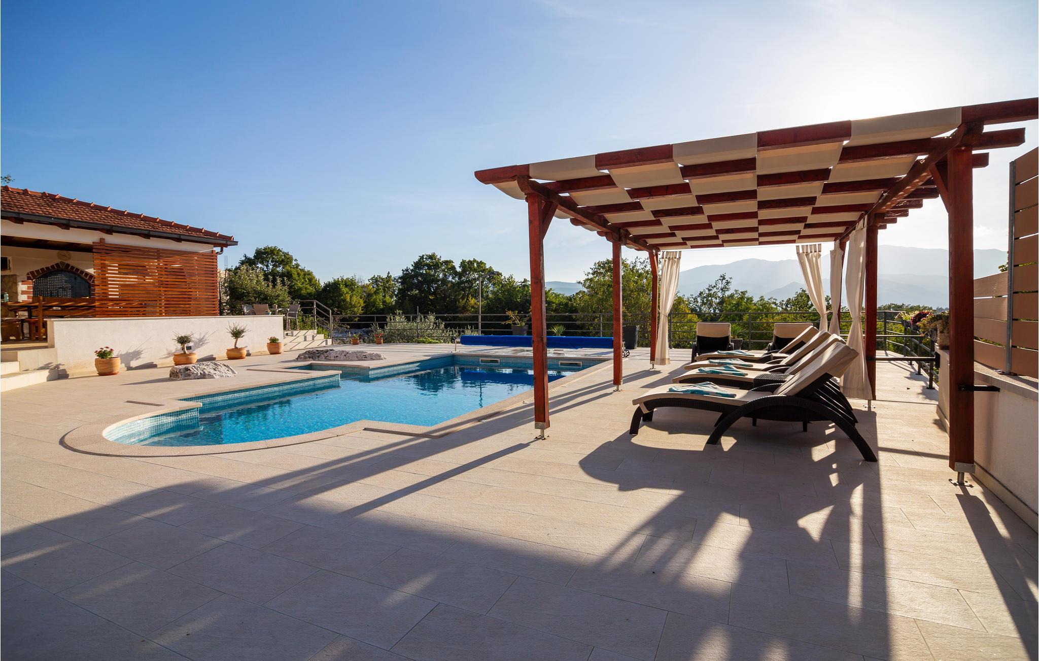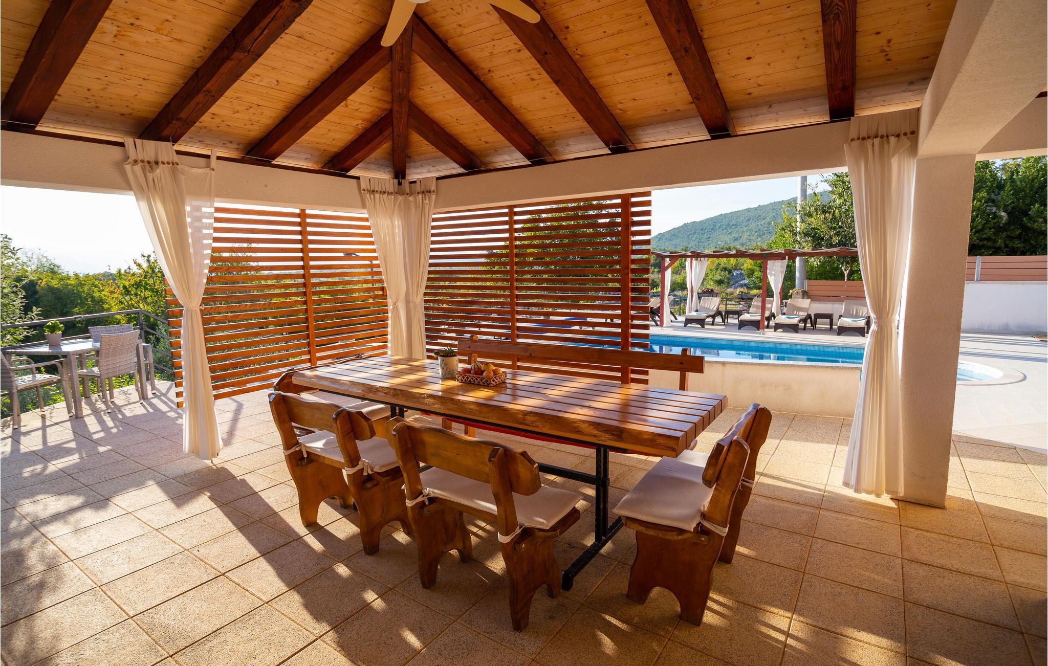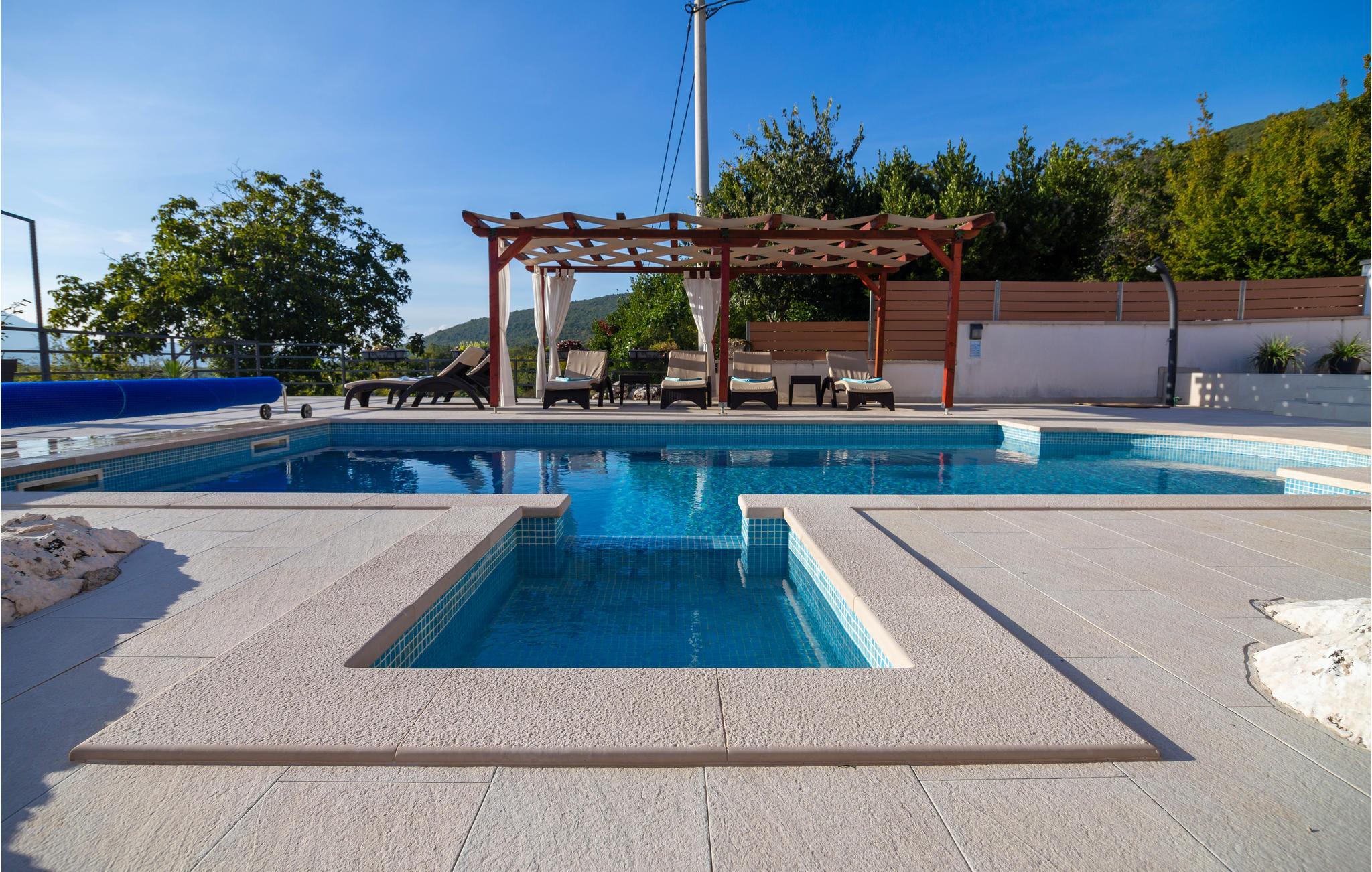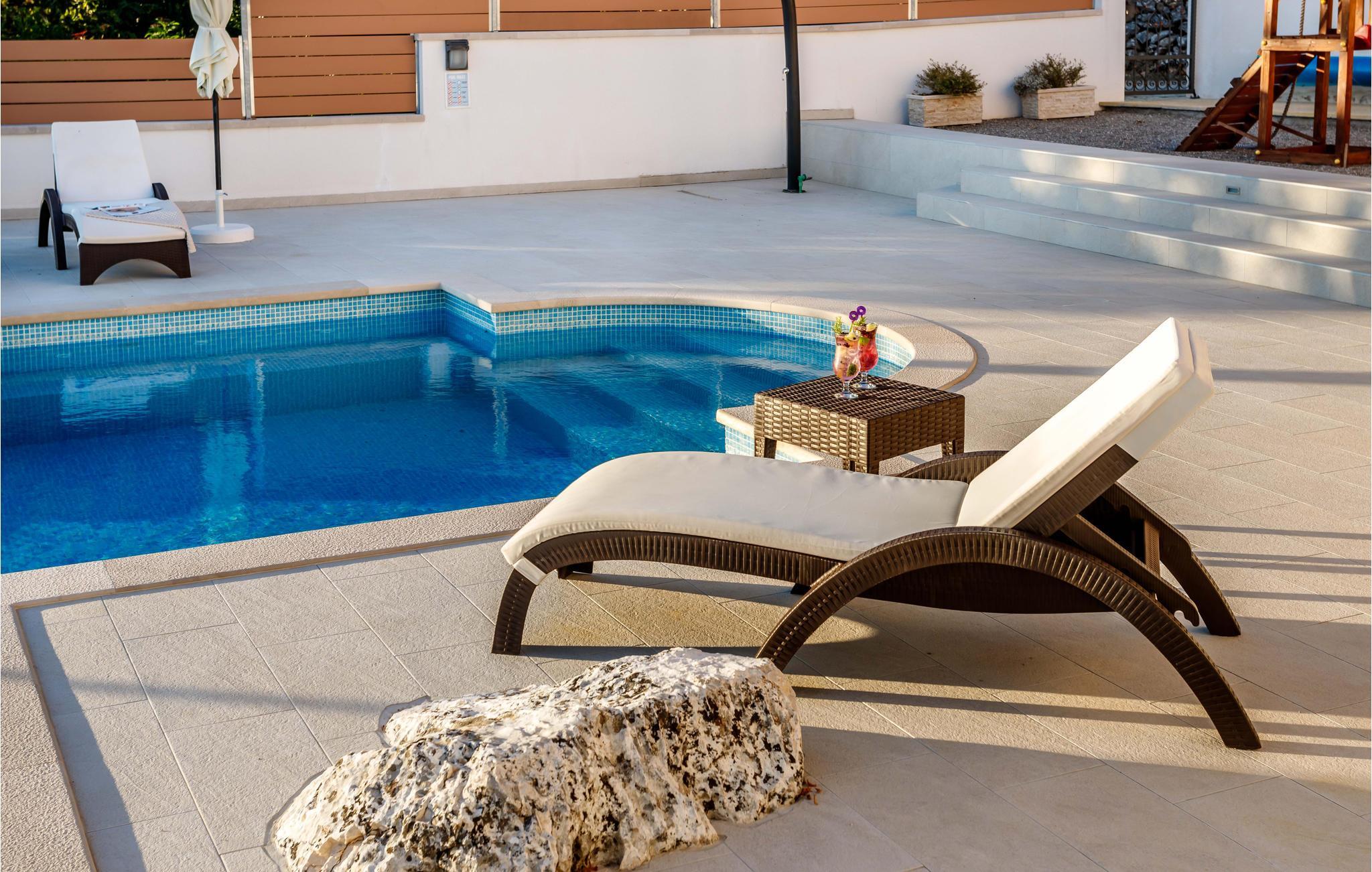 Egal, ob Sie einen ruhigen oder aktiven Urlaub in der Natur verbringen möchten, ist dieses wunderbare Ferienhaus die ideale Wahl für Sie. Es ist modern und komfortabel eingerichtete und mit allem ausgestattet, was Sie für einen erholsamen Urlaub brauchen. Dieses wunderbare Anwesen besticht besonders durch seinen tollen Außenbereich. An und in Ihrem beheizten Pool mit Hydromassagedüsen werden Sie viele schöne Stunden verbringen. Entspannen Sie auf einer der Sonnenliegen oder im Whirlpool, während die Kleinen im Pool planschen. Auf den schönen Terrassen können Sie herrlich frühstücken oder den Tag mit einem Glas dalmatinischen Wein ausklingen lassen. während Sie das tolle Panorama genießen. auch ein Grill für gemeinsame Grillabende steht Ihnen zur Verfügung. Ihre Kinder können sich in den vielen Einrichtungen für die Kleinsten vergnügen. Gemeinsame können Sie Tischtennis oder Darts spielen.