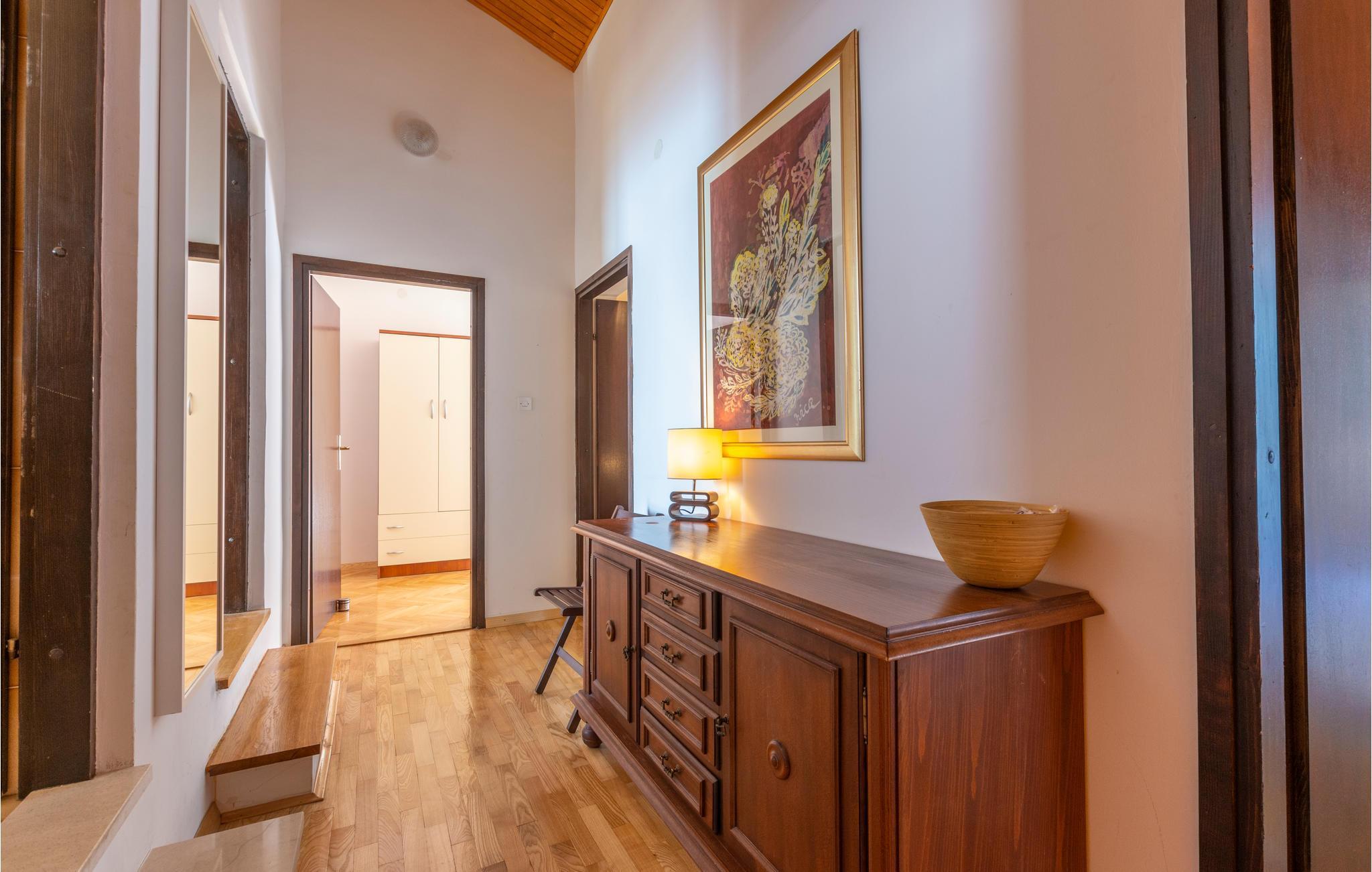 Dieses Ferienhaus befindet sich auf einem hügeligen Gelände in dem kleinen Ort Pisak. Es besteht aus zwei Etagen. Im ersten Stock befinden sich eine Küche mit Esszimmer, ein Badezimmer mit Dusche sowie ein Wohnzimmer mit einer geräumigen Terrasse mit Panoramablick auf das Meer und die Inseln. Eine Innentreppe führt in den zweiten Stock mit einem Badezimmer mit Badewanne, vier Schlafzimmern und drei separaten Balkonen. Das Haus liegt auf einem Hügel, wobei Treppen zum Erdgeschoss führen, wo sich ein Außengrill für die Zubereitung köstlicher Mahlzeiten befindet. Erkunden Sie die örtlichen Strände mit feinem Kies und kristallklarem Meer. Besuchen Sie Omis und Makarska, die eine Menge Spaß und Sportmöglichkeiten für einen aktiven Urlaub bieten.