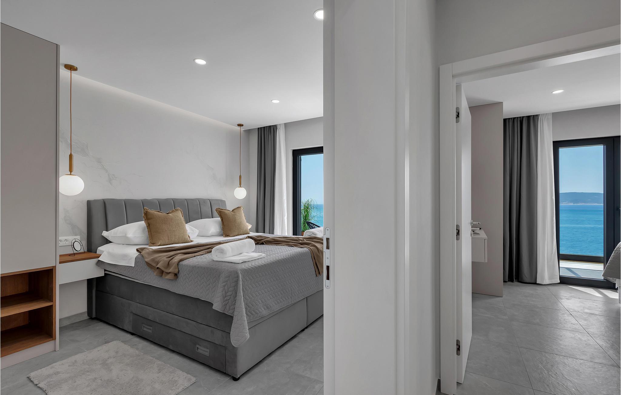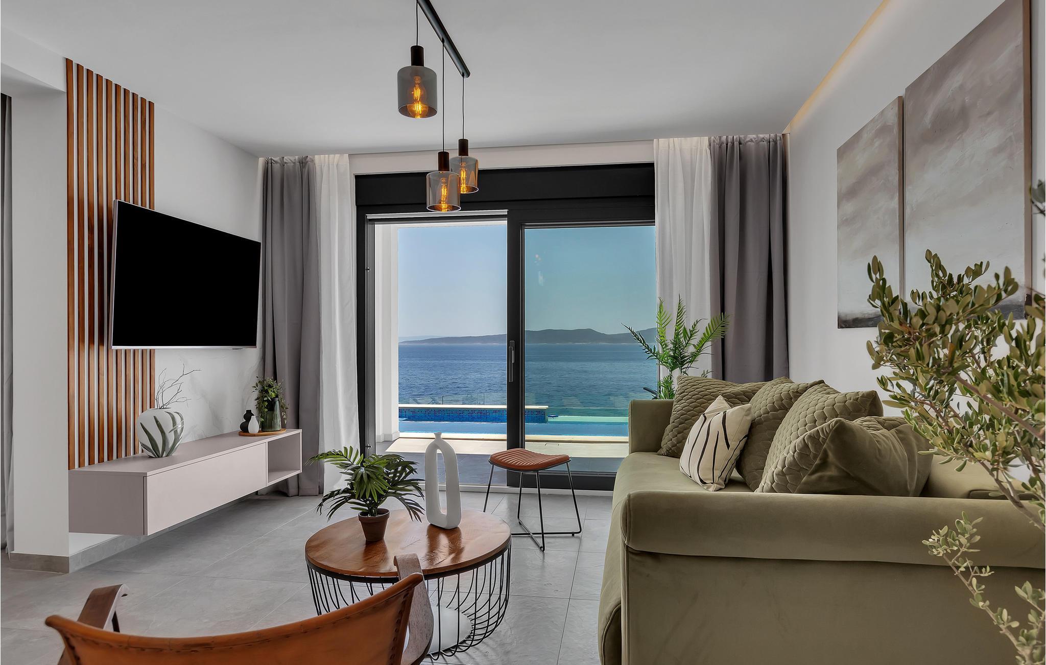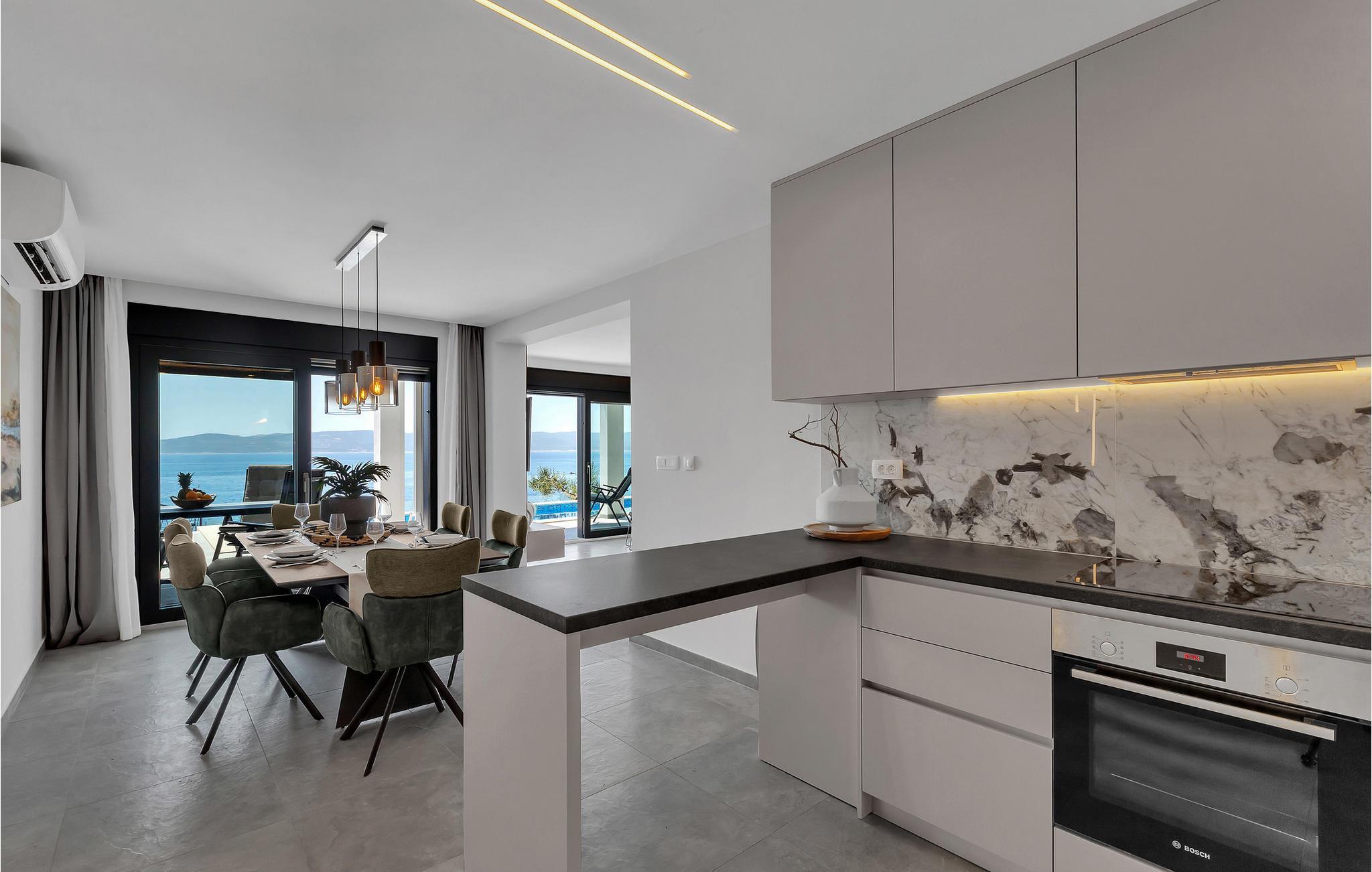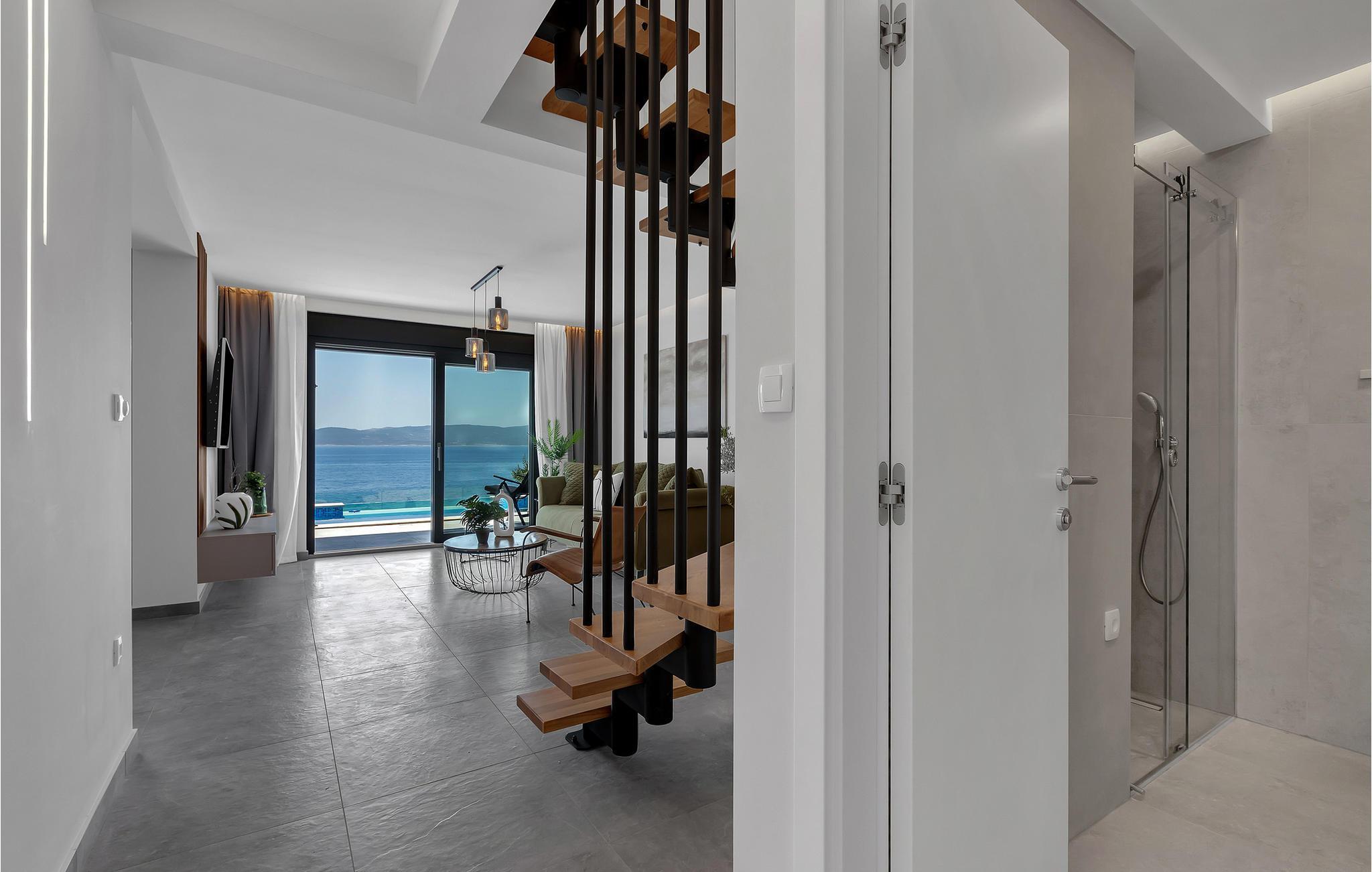 Dieses elegante Haus strahlt eine ruhige und luxuriöse Atmosphäre aus, die durch den Panoramablick auf das tiefblaue Meer untermalt wird. Hier können Sie auf dem Sofa entspannen und dabei zusehen, wie das Sonnenlicht sanft über das Wasser gleitet. Verbringen Sie gemütliche Stunden beim Lesen oder bei anregenden Gesprächen in stilvollem Ambiente. In der modernen Küche können Sie gemeinsam kochen und den Abend bei einem guten Essen und einem Glas Wein genießen.