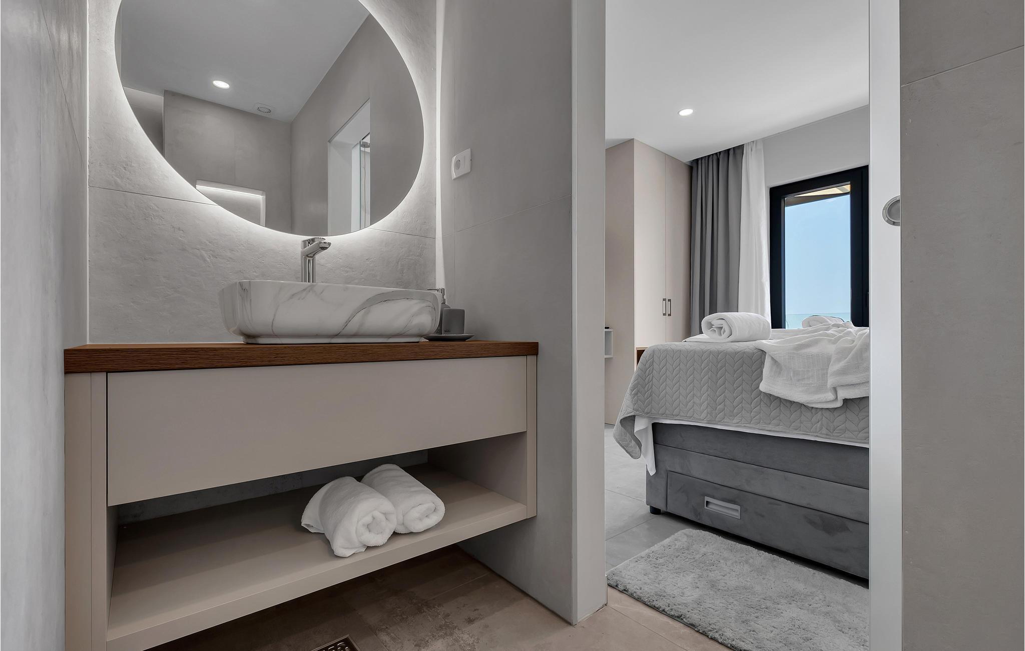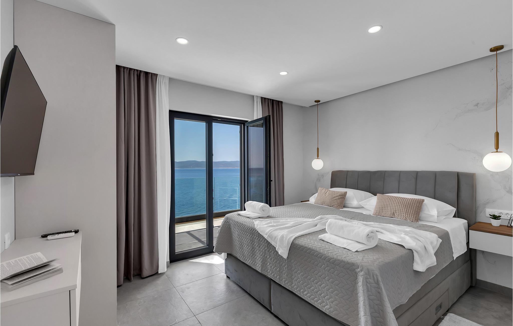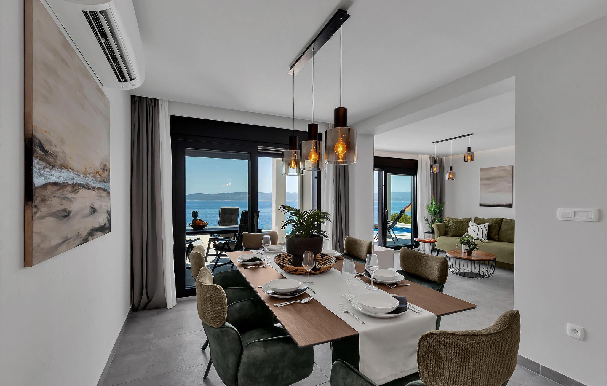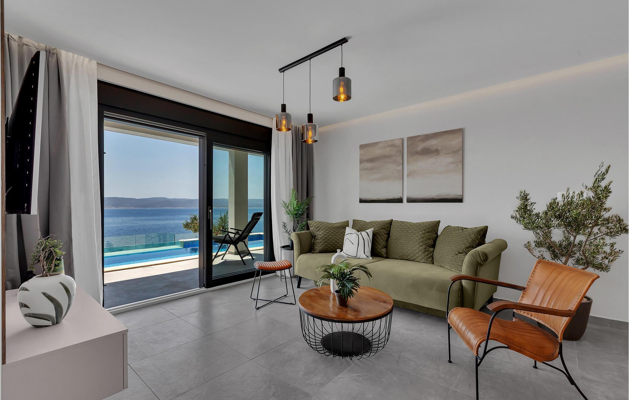 Dieses elegante Haus strahlt eine ruhige und luxuriöse Atmosphäre aus, die durch den Panoramablick auf das tiefblaue Meer untermalt wird. Hier können Sie auf dem Sofa entspannen und dabei zusehen, wie das Sonnenlicht sanft über das Wasser gleitet. Verbringen Sie gemütliche Stunden beim Lesen oder bei anregenden Gesprächen in stilvollem Ambiente. In der modernen Küche können Sie gemeinsam kochen und den Abend bei einem guten Essen und einem Glas Wein genießen.