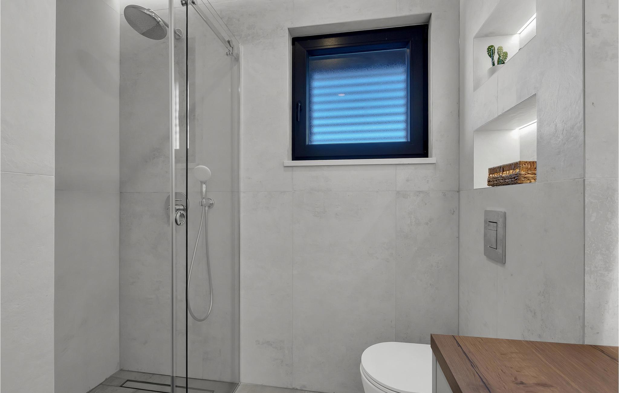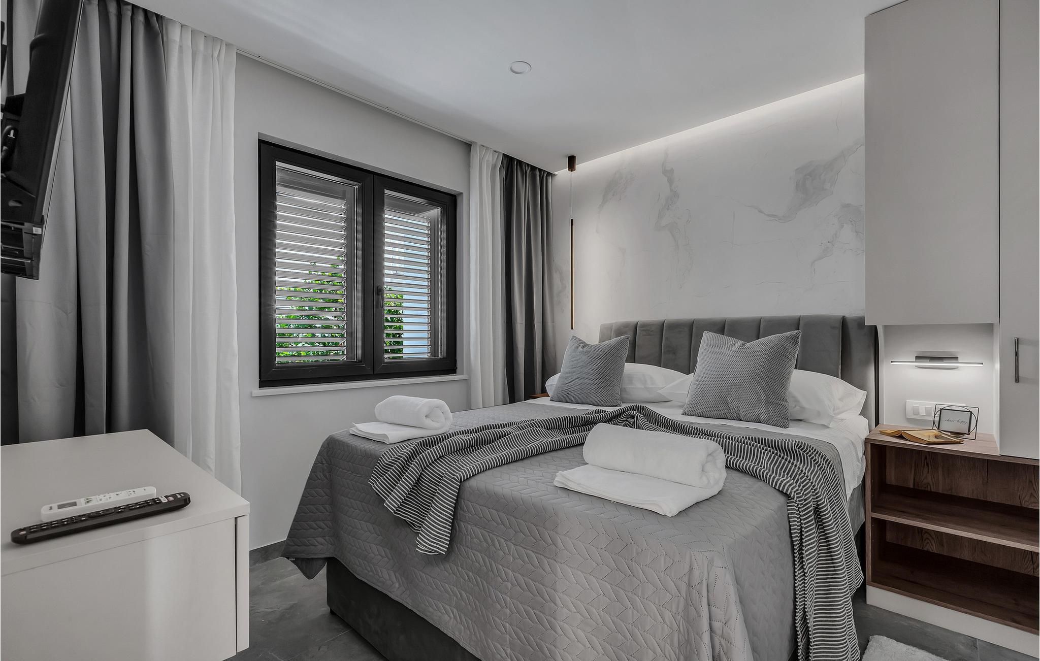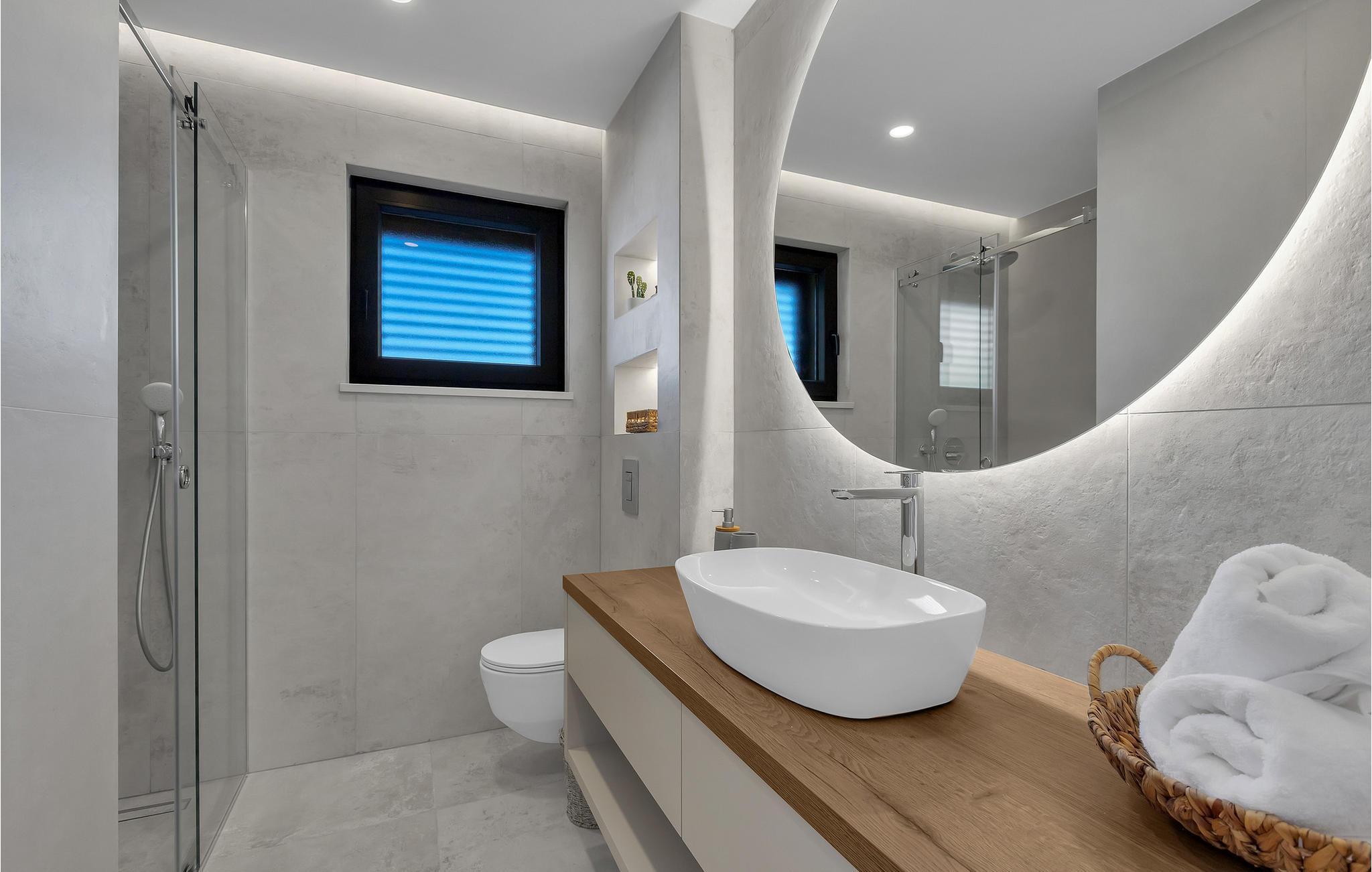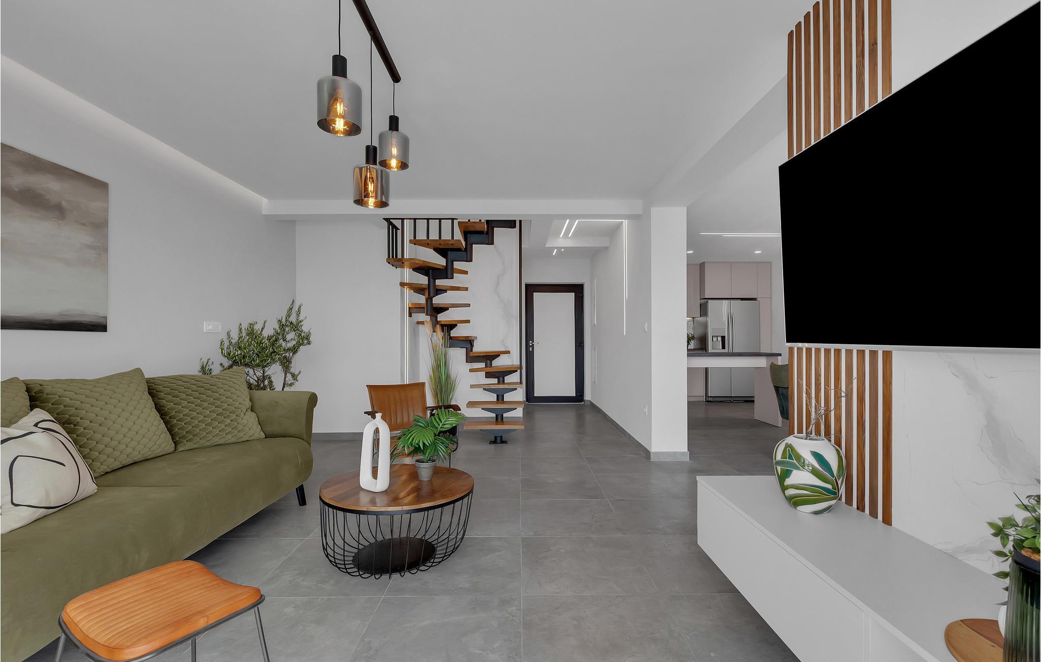 Dieses elegante Haus strahlt eine ruhige und luxuriöse Atmosphäre aus, die durch den Panoramablick auf das tiefblaue Meer untermalt wird. Hier können Sie auf dem Sofa entspannen und dabei zusehen, wie das Sonnenlicht sanft über das Wasser gleitet. Verbringen Sie gemütliche Stunden beim Lesen oder bei anregenden Gesprächen in stilvollem Ambiente. In der modernen Küche können Sie gemeinsam kochen und den Abend bei einem guten Essen und einem Glas Wein genießen.