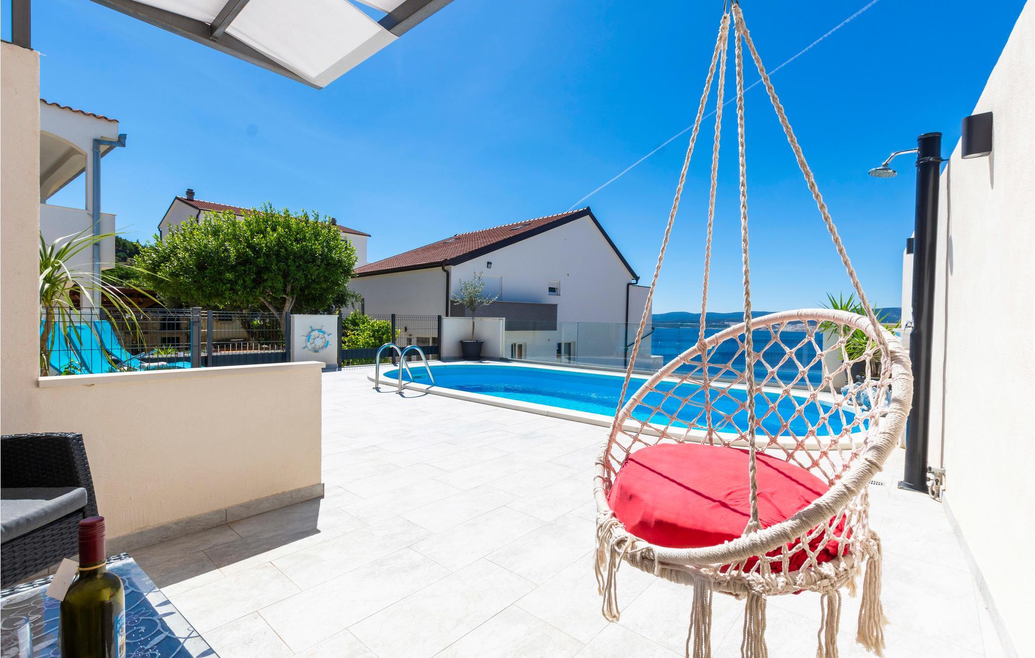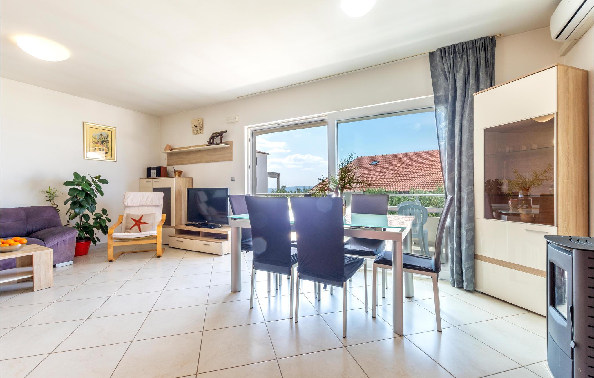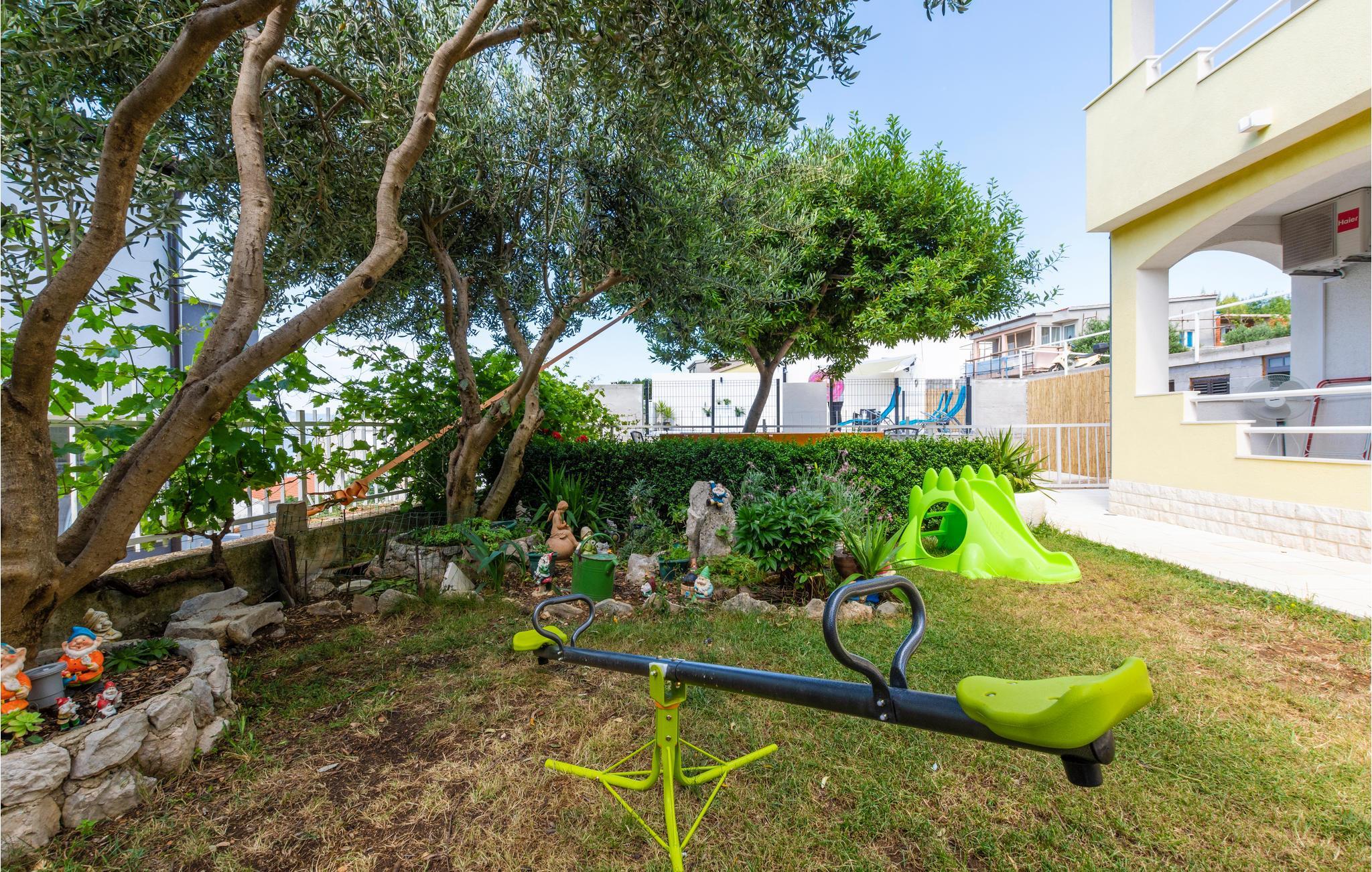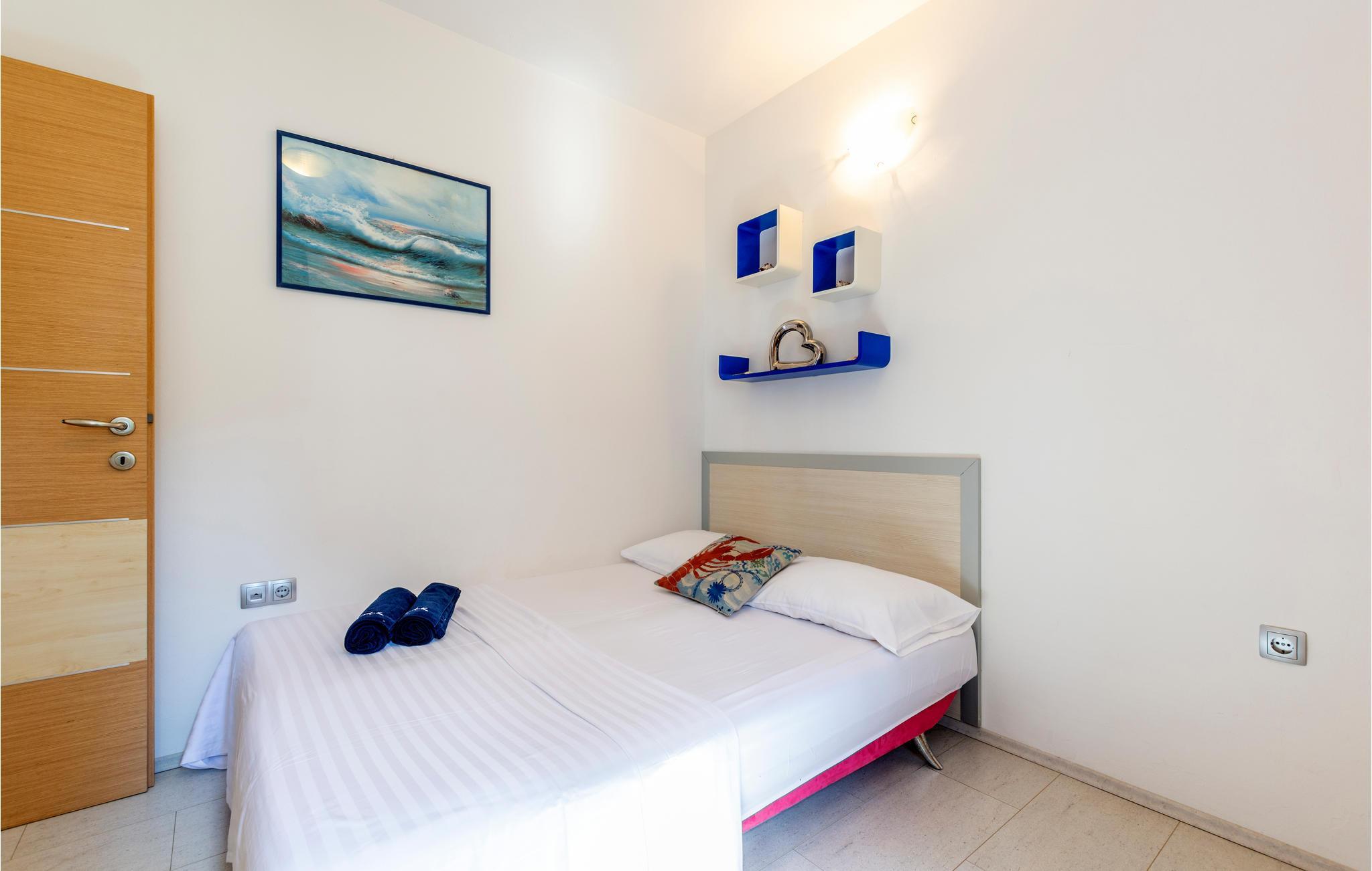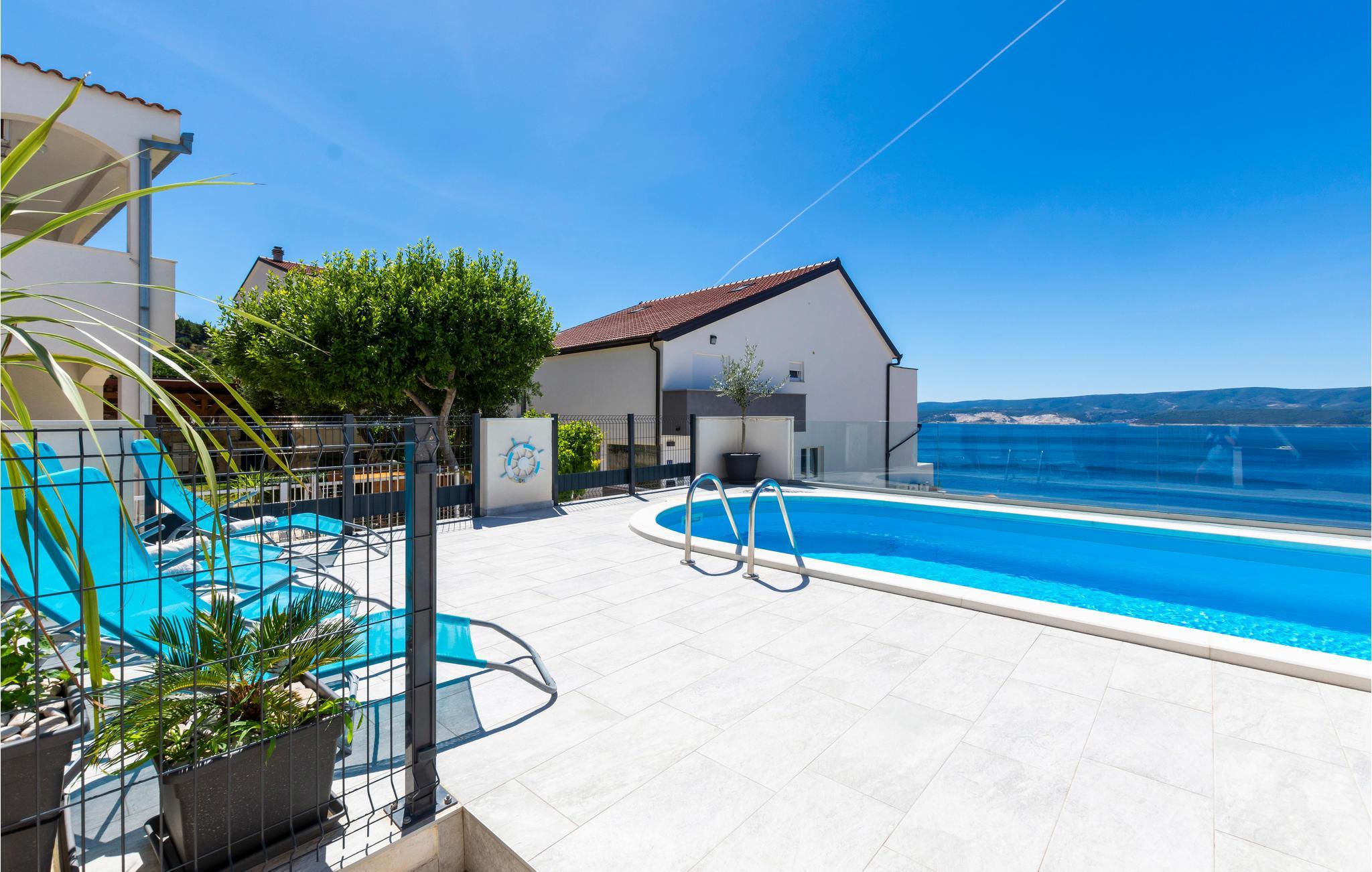 Das wunderschön und modern eingerichtete Ferienhaus ist eine ideale Wahl für zwei Familien oder Gruppen von Freunden, die ihre Sommer zusammen verbringen möchten. Das Haus befindet sich auf einem Terrassengrundstück und erstreckt sich über zwei Etagen mit jeweils eigenem Eingang. Im ersten Stock befindet sich ein Wohnzimmer mit Küche, drei Schlafzimmer und zwei Badezimmer. Vom ersten Stock geht es den Weg hinunter ins Erdgeschoss, wo sich zwei weitere Schlafzimmer mit Badezimmern befinden.