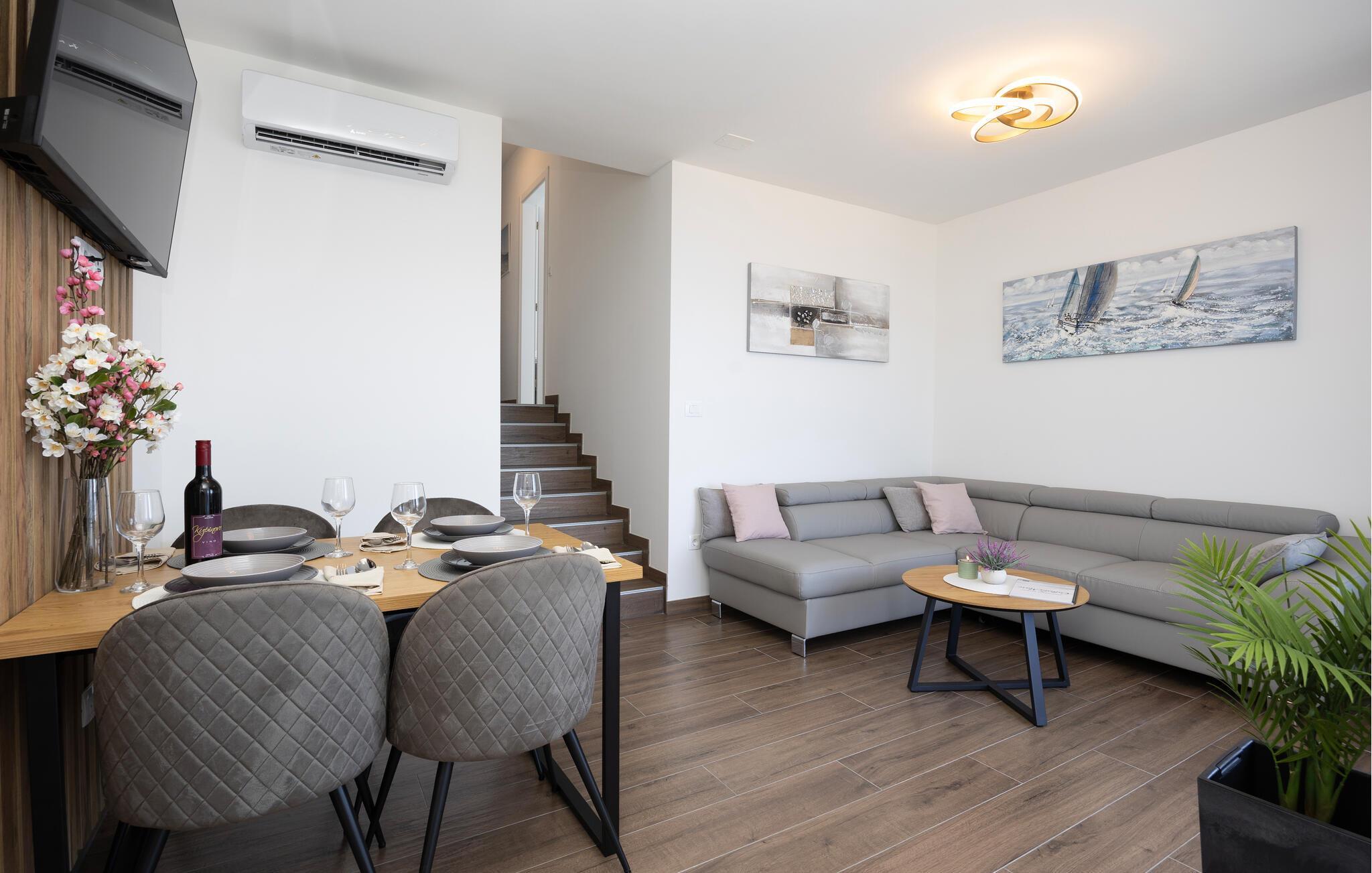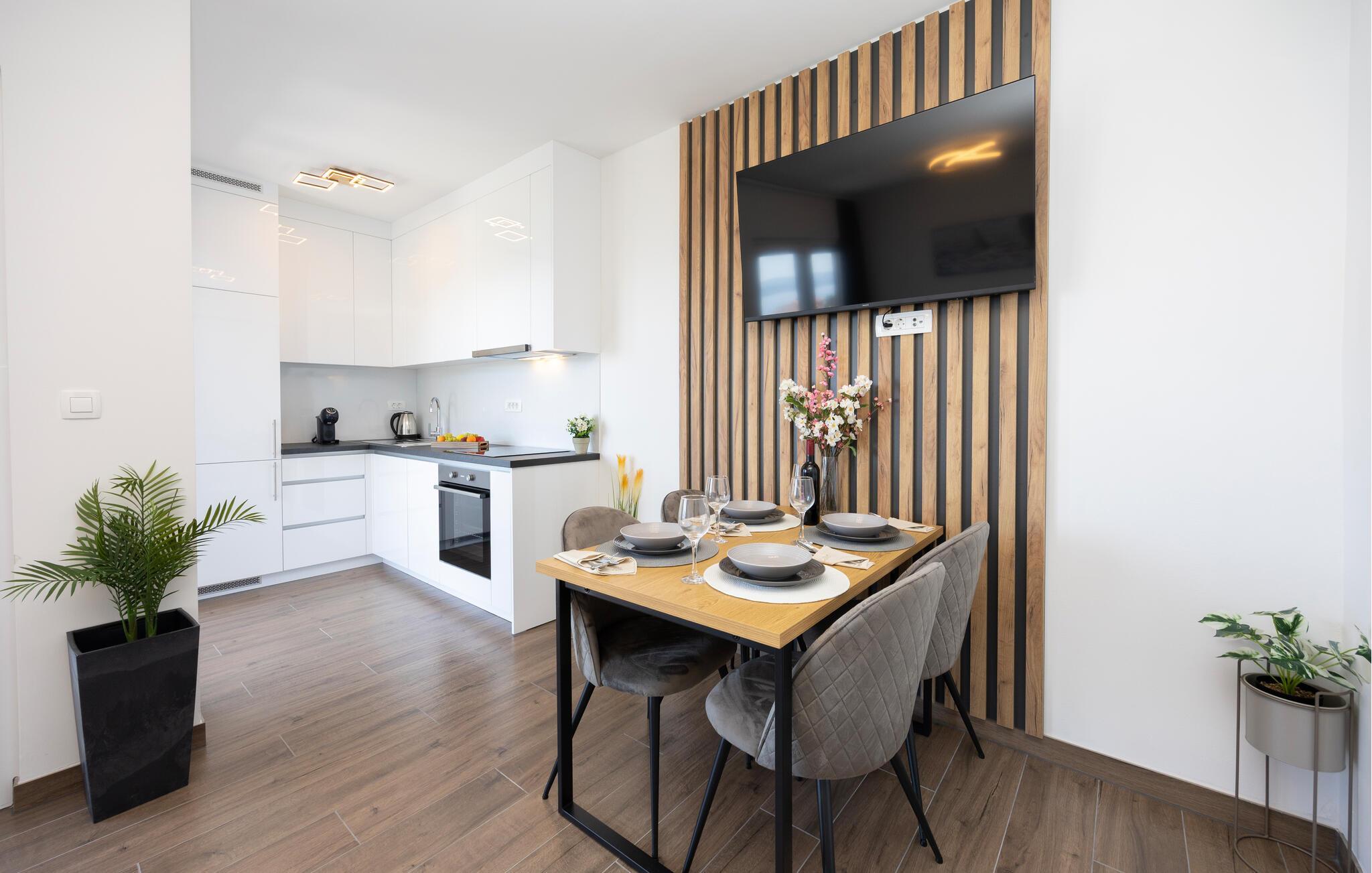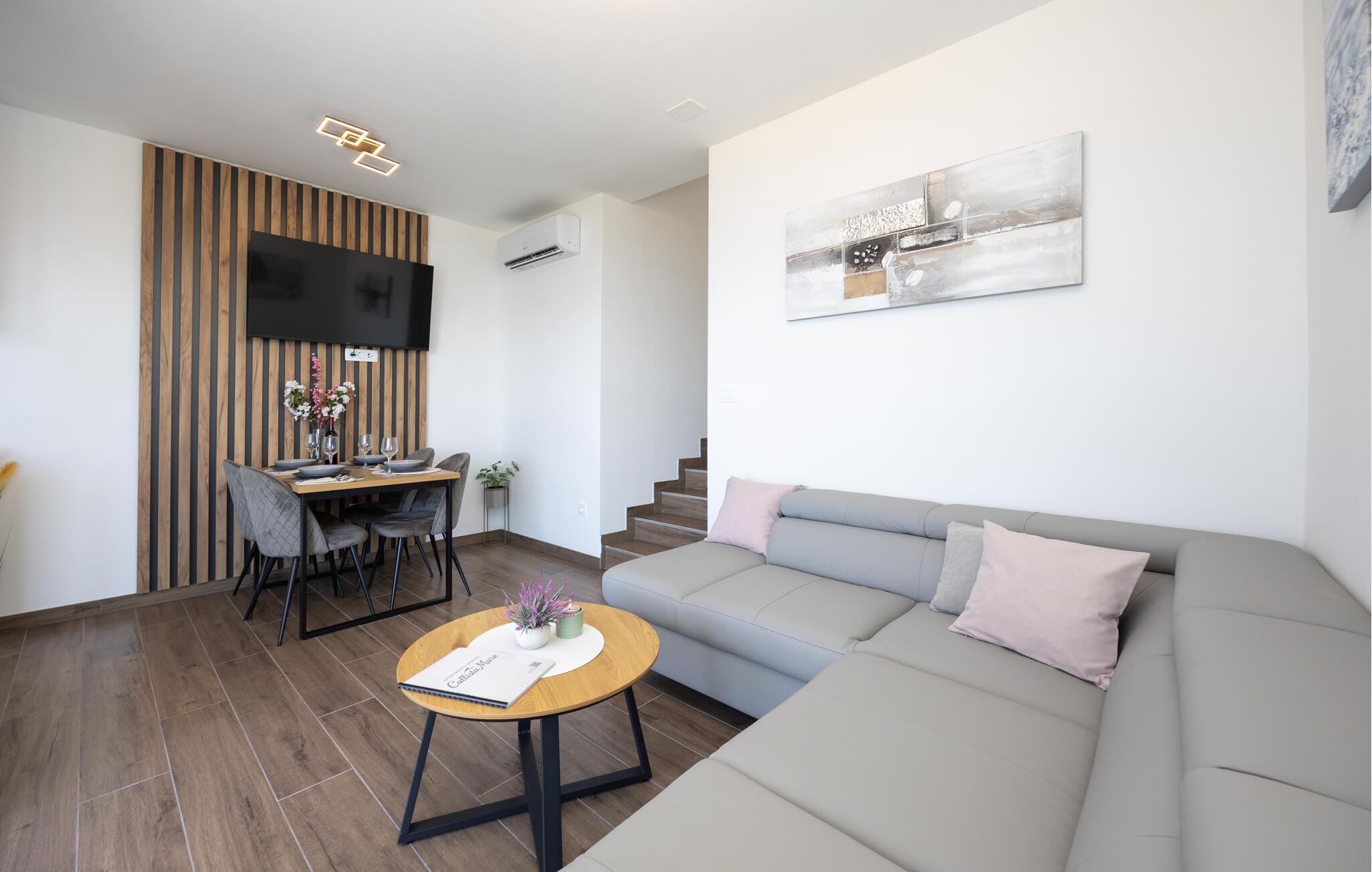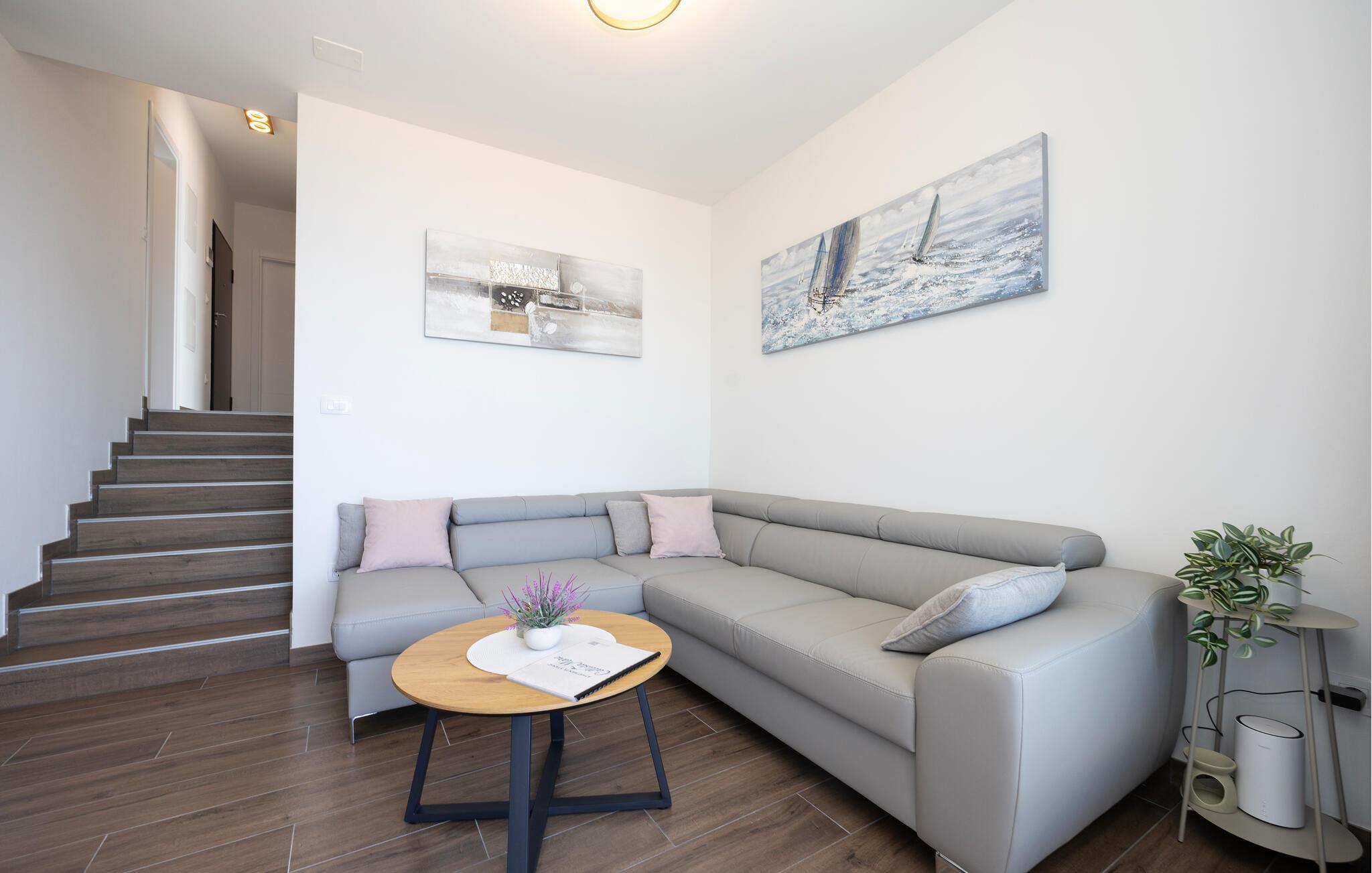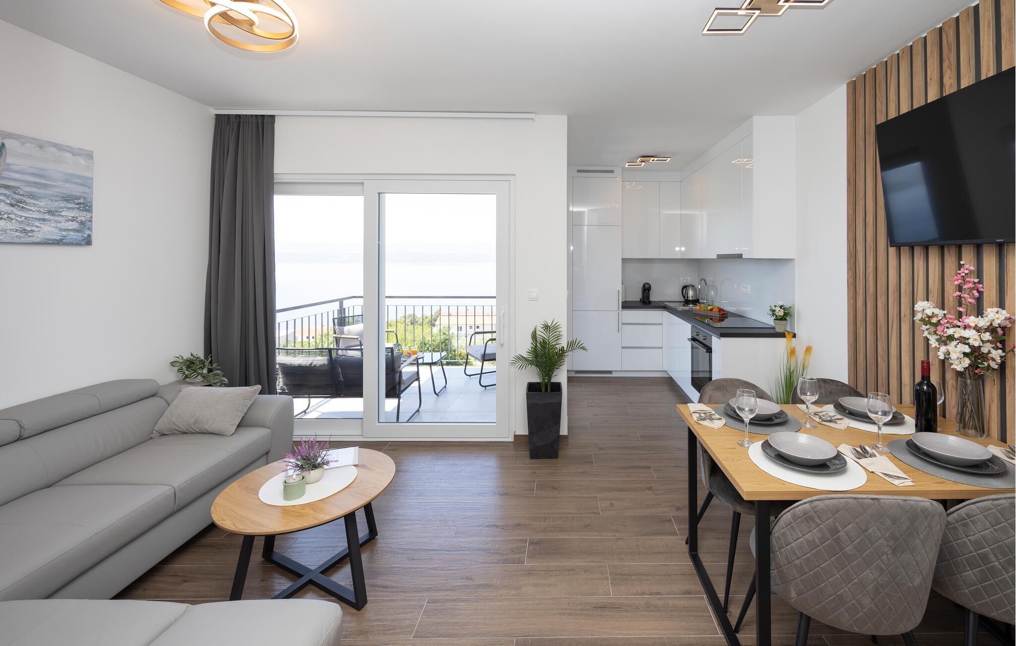 Diese moderne Wohnung bietet Ihnen alles, was Sie für einen komfortablen Aufenthalt benötigen. Profitieren Sie von der idealen Lage nur wenige Gehminuten vom Strand entfernt und genießen Sie die Nähe zu Restaurants, Cafés und Einkaufsmöglichkeiten. Machen Sie es sich auf dem großen Sofa im Wohnbereich gemütlich, genießen Sie gemeinsame Mahlzeiten am Esstisch und bereiten Sie Ihre Lieblingsgerichte in der Küche zu. Die Wohnung bietet auch direkten Zugang zur Terrasse mit Blick auf die Adria.