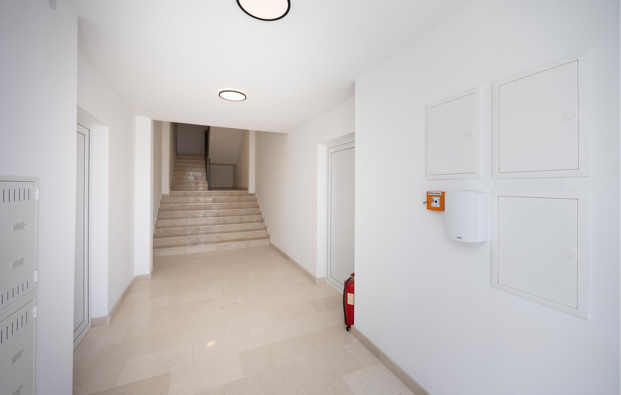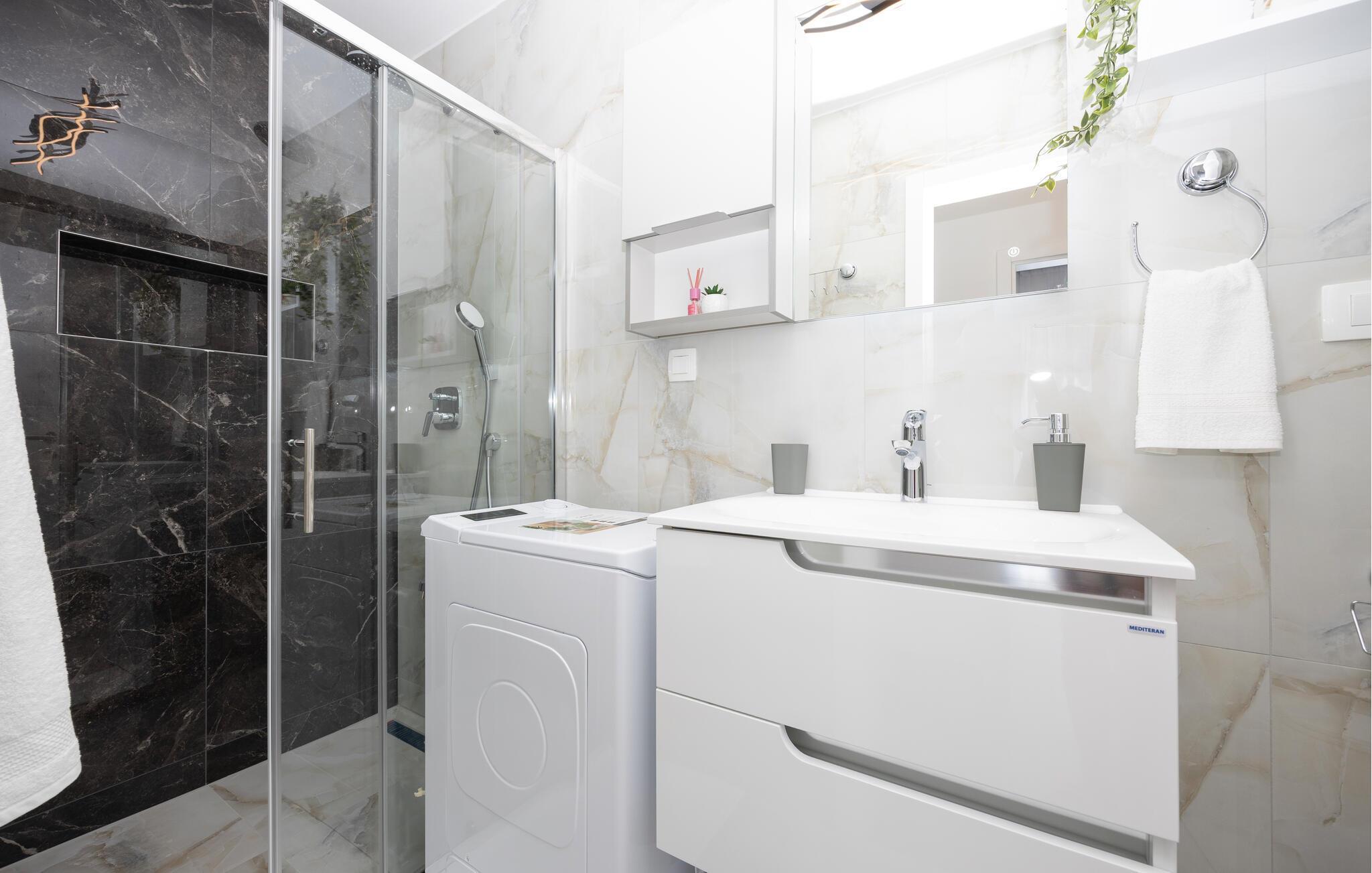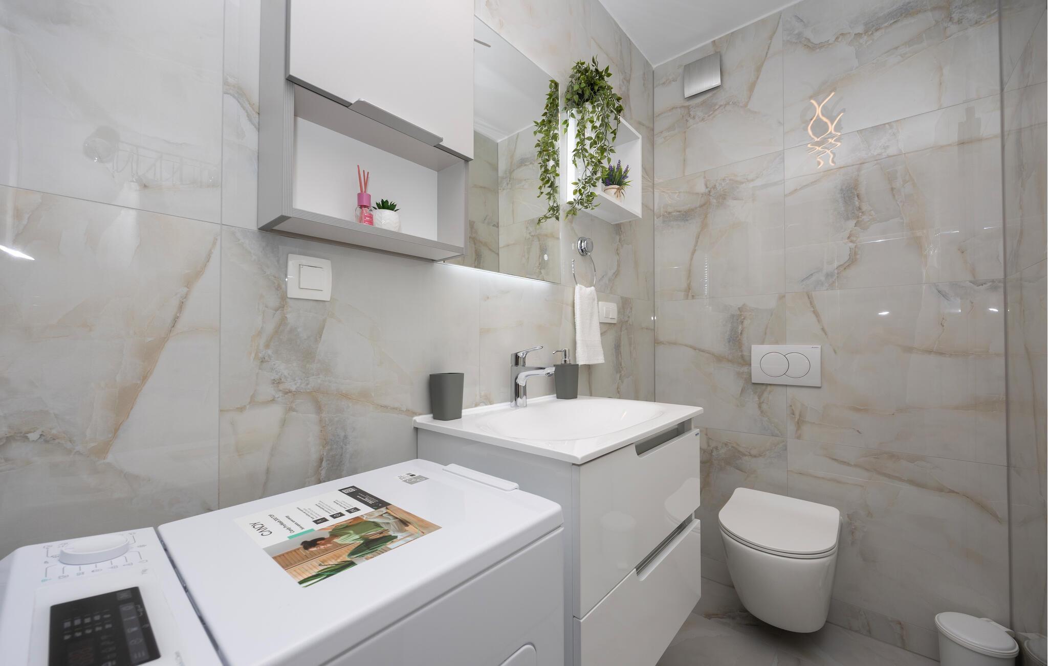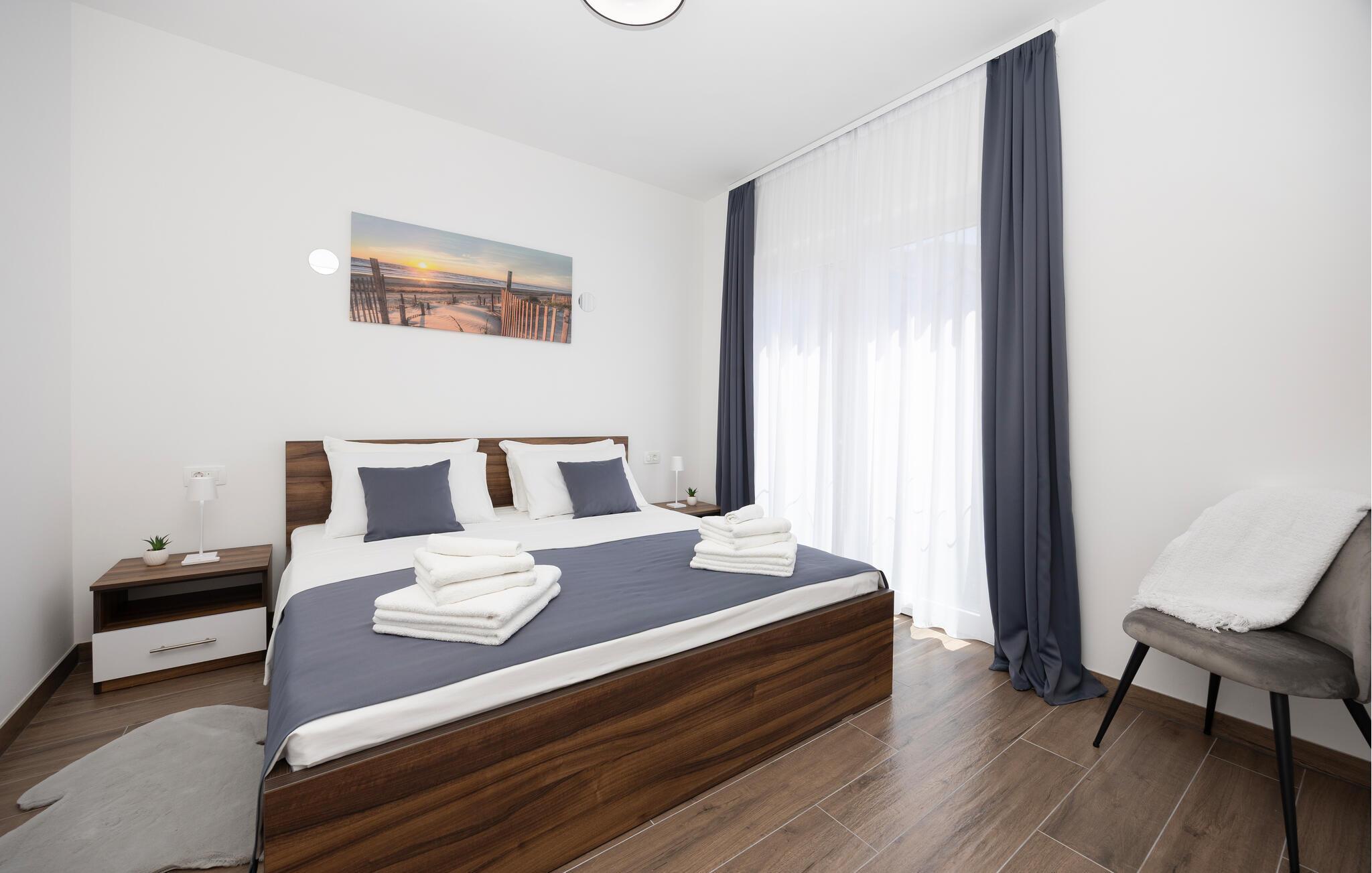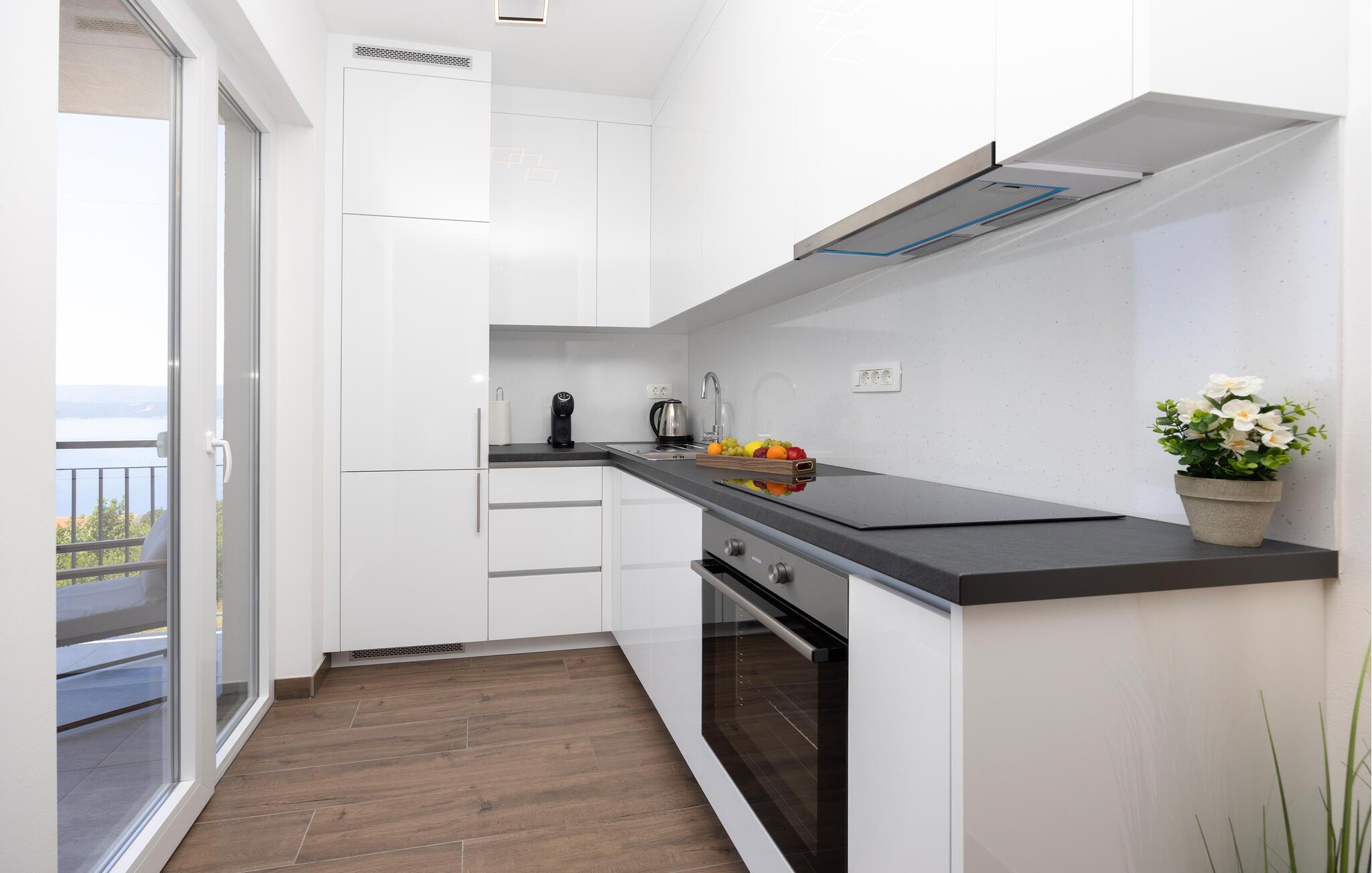 Diese moderne Wohnung bietet Ihnen alles, was Sie für einen komfortablen Aufenthalt benötigen. Profitieren Sie von der idealen Lage nur wenige Gehminuten vom Strand entfernt und genießen Sie die Nähe zu Restaurants, Cafés und Einkaufsmöglichkeiten. Machen Sie es sich auf dem großen Sofa im Wohnbereich gemütlich, genießen Sie gemeinsame Mahlzeiten am Esstisch und bereiten Sie Ihre Lieblingsgerichte in der Küche zu. Die Wohnung bietet auch direkten Zugang zur Terrasse mit Blick auf die Adria.