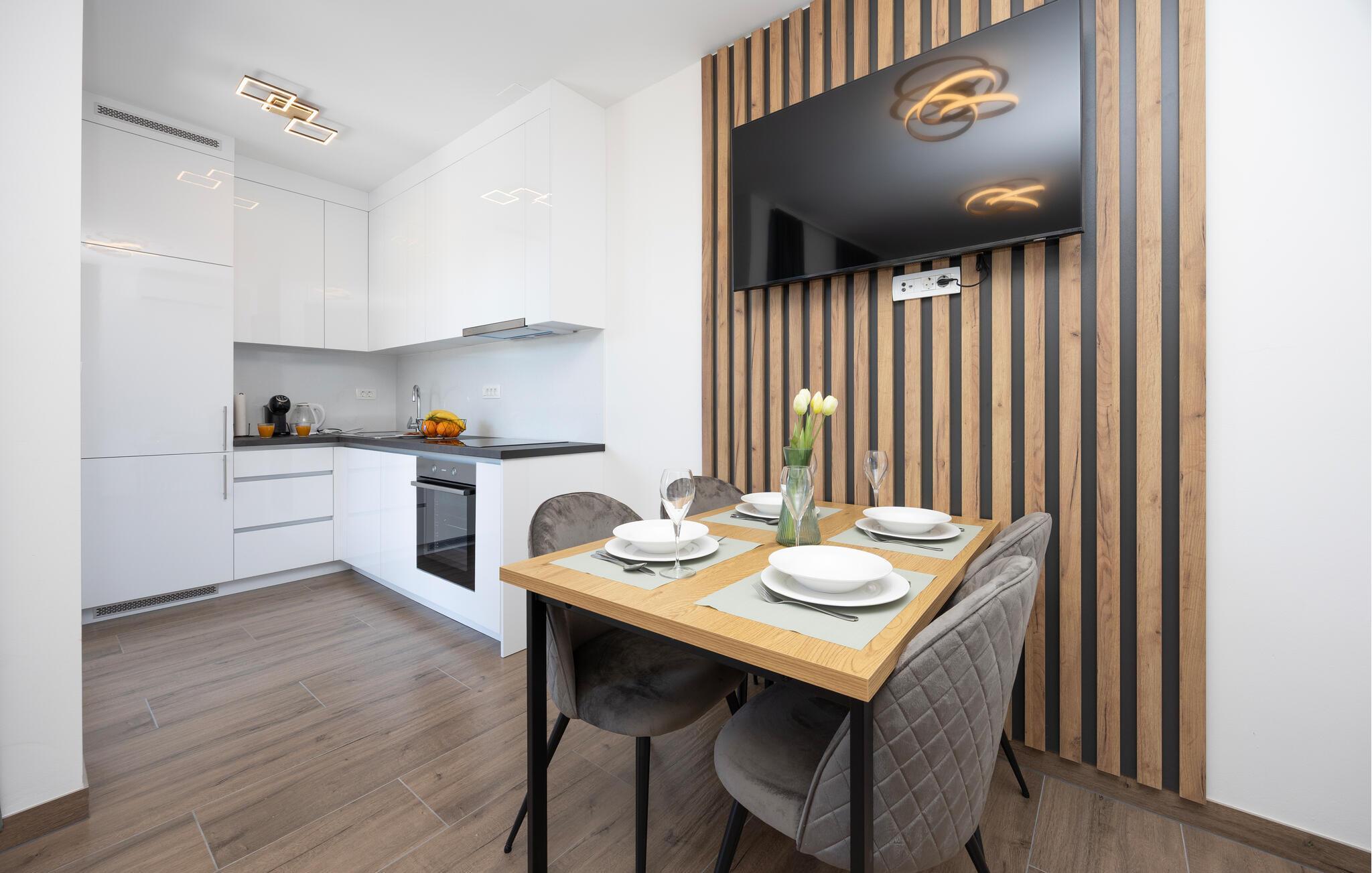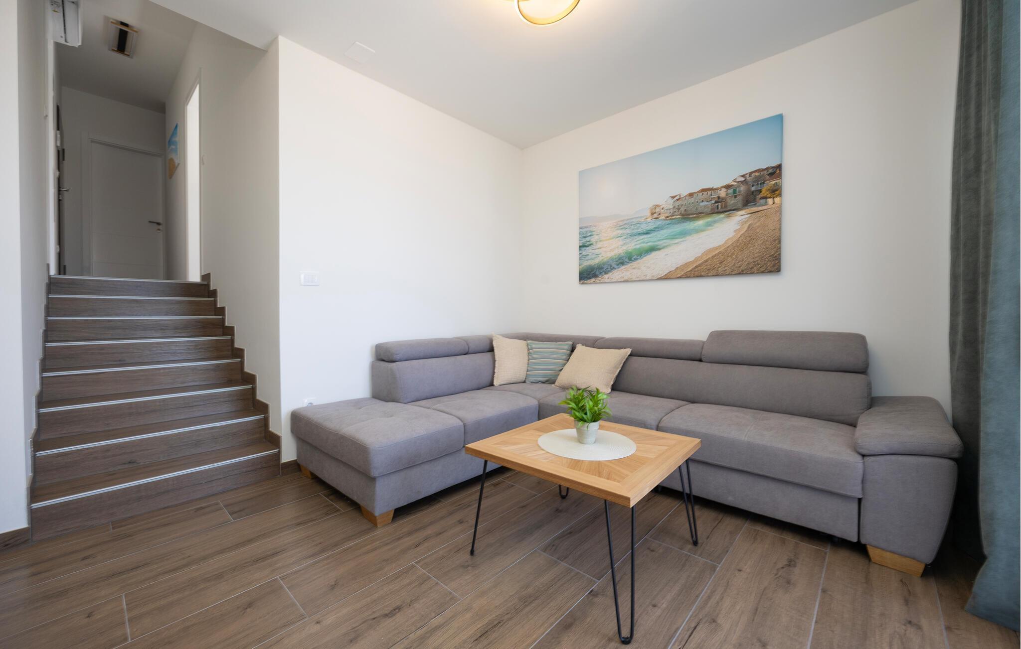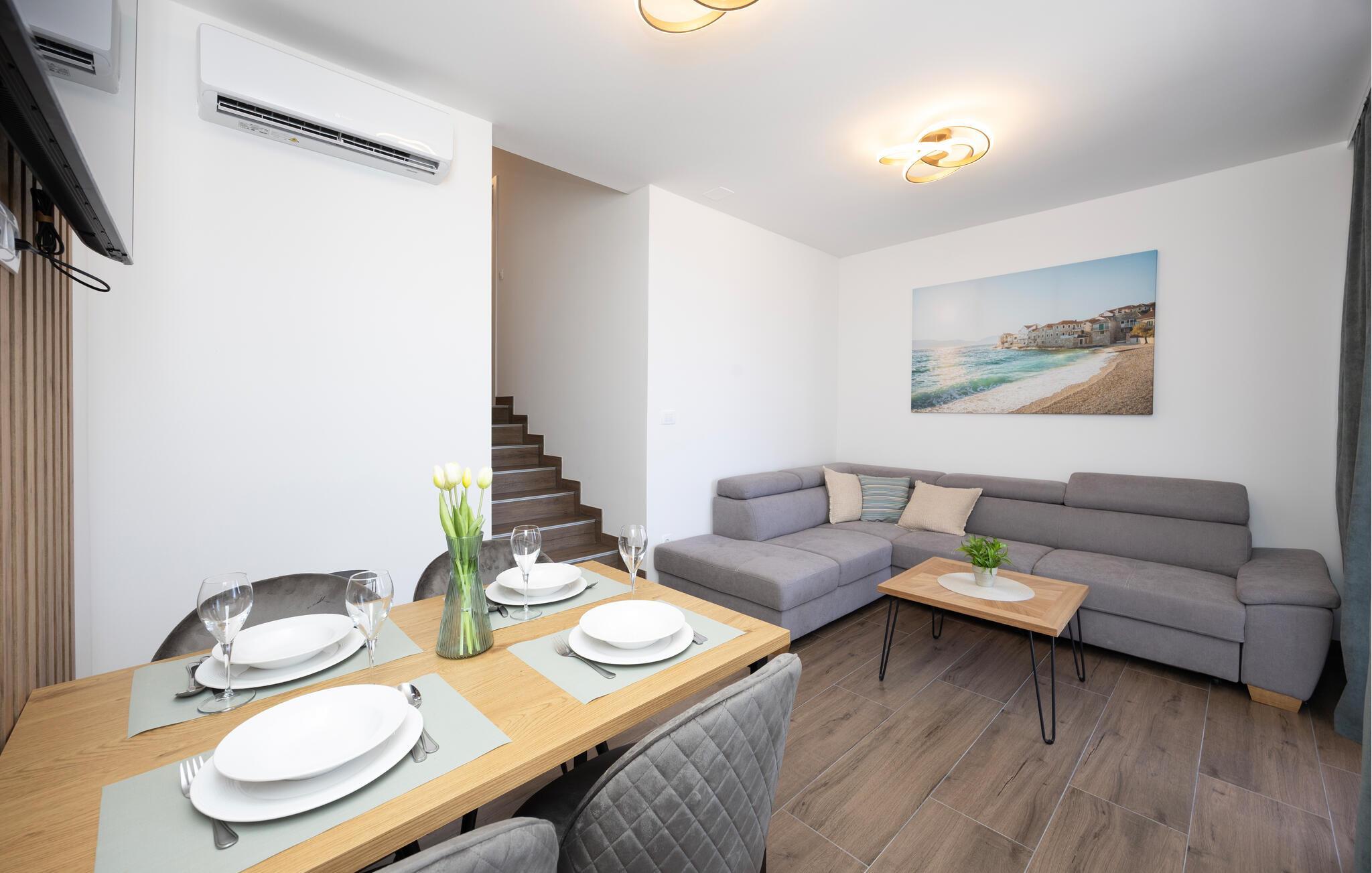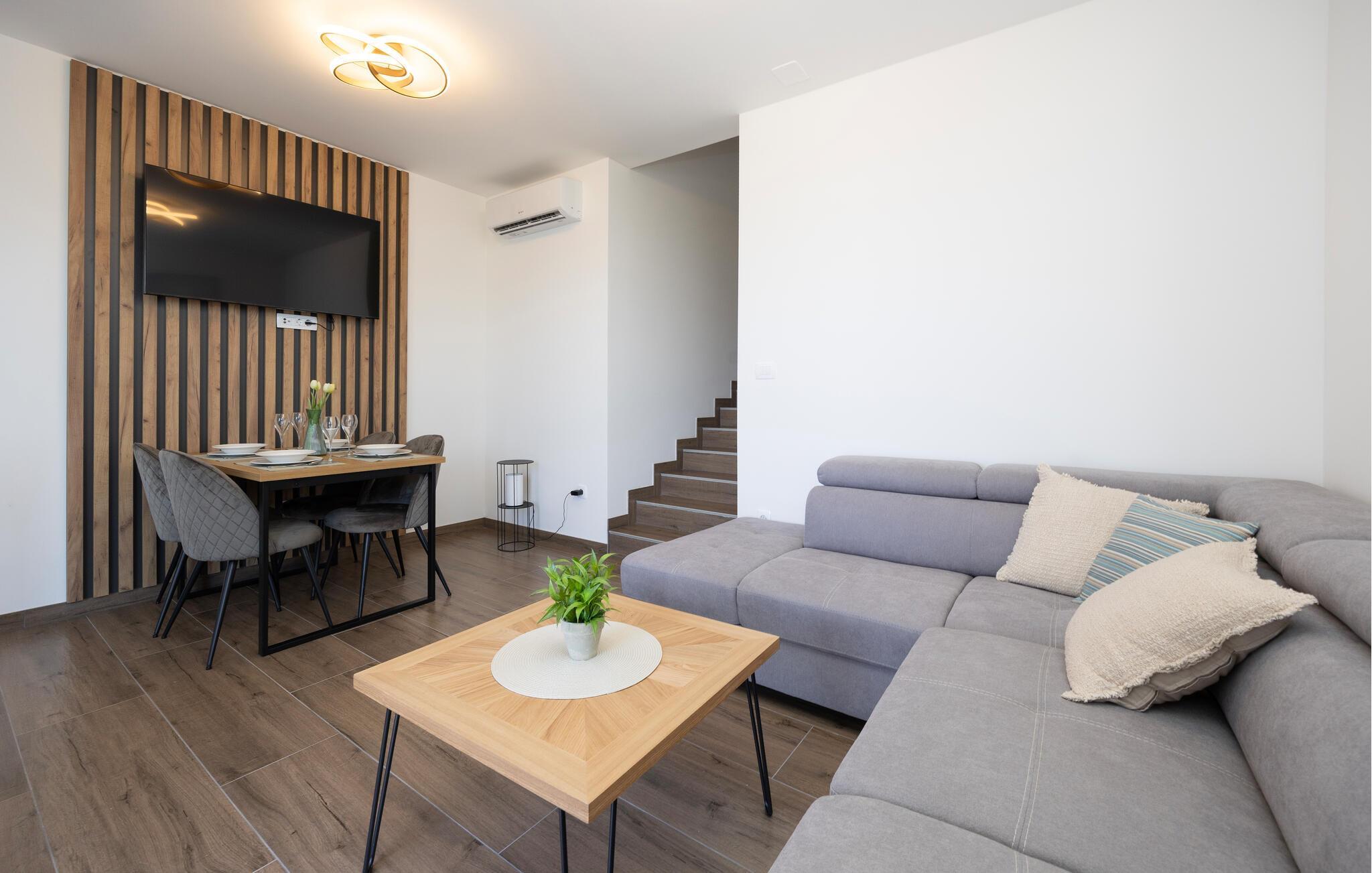 Diese moderne Wohnung bietet Ihnen alles, was Sie für einen komfortablen Aufenthalt benötigen. Profitieren Sie von der idealen Lage nur wenige Gehminuten vom Strand entfernt und genießen Sie die Nähe zu Restaurants, Cafés und Einkaufsmöglichkeiten. Machen Sie es sich auf dem großen Sofa im Wohnbereich gemütlich, genießen Sie gemeinsame Mahlzeiten am Esstisch und bereiten Sie Ihre Lieblingsgerichte in der Küche zu. Die Wohnung bietet auch direkten Zugang zur Terrasse mit Blick auf die Adria.