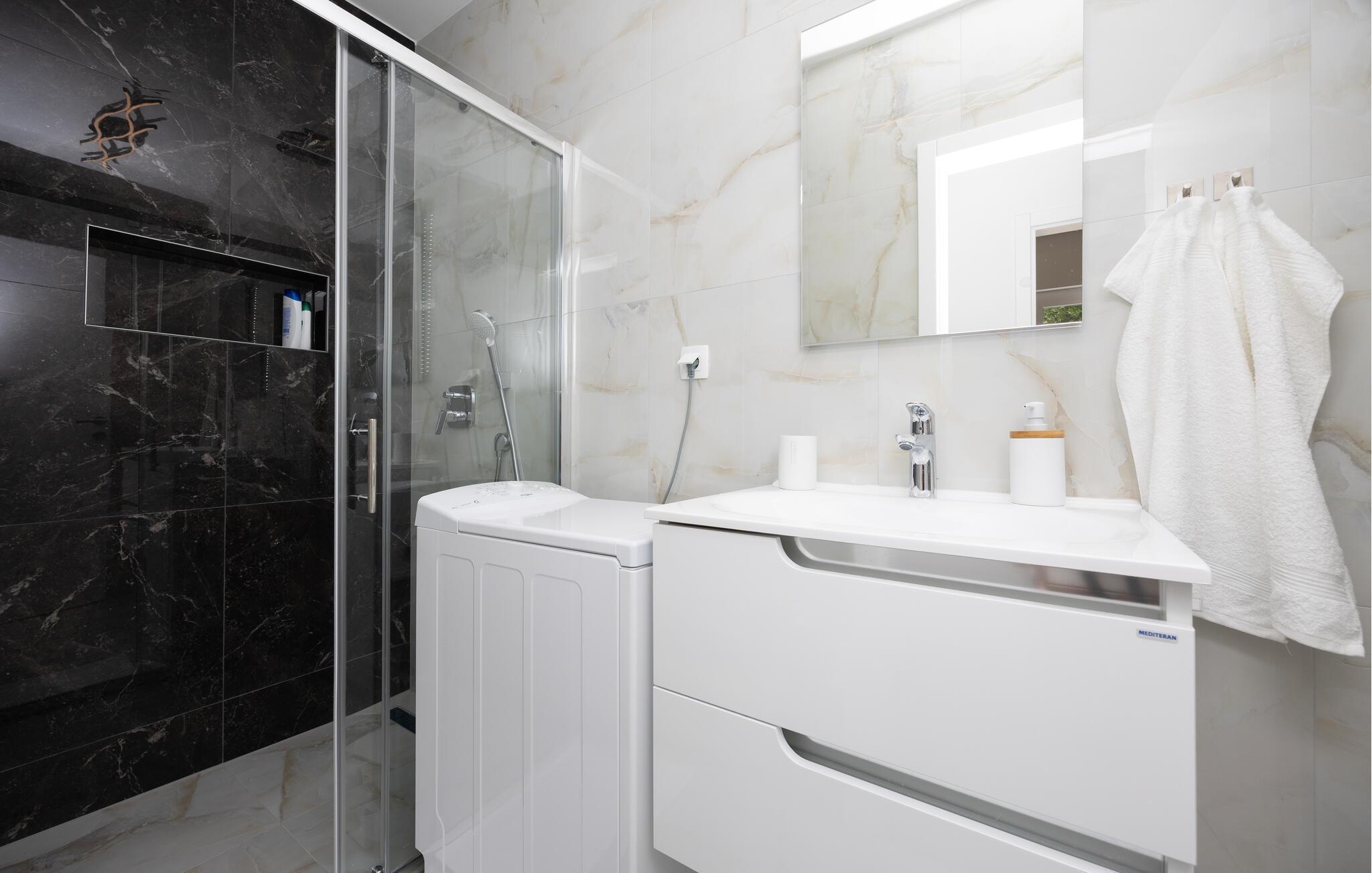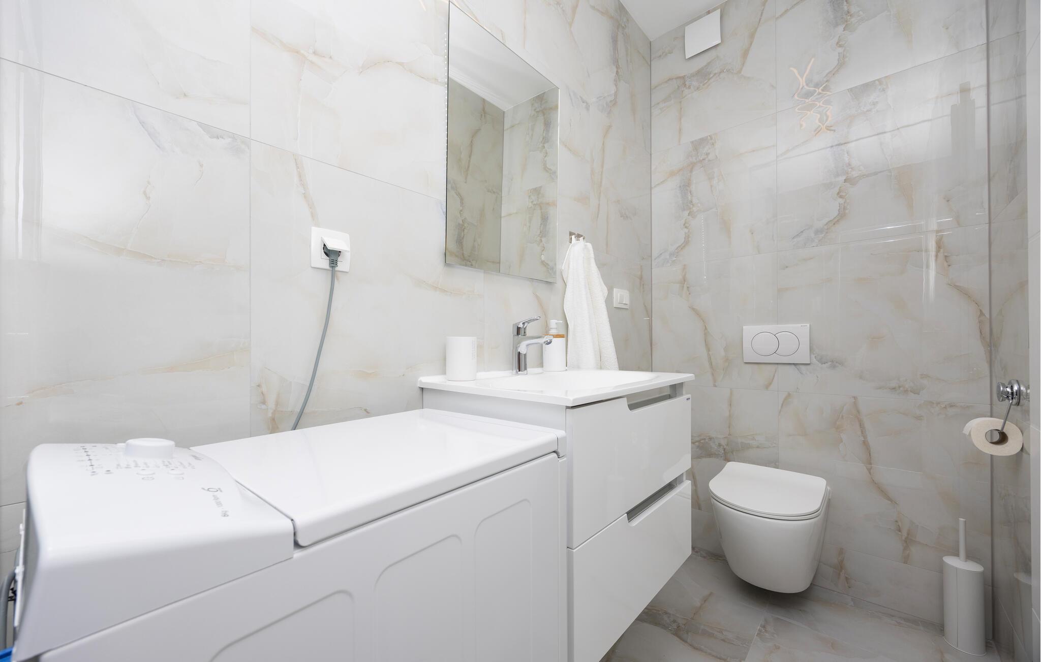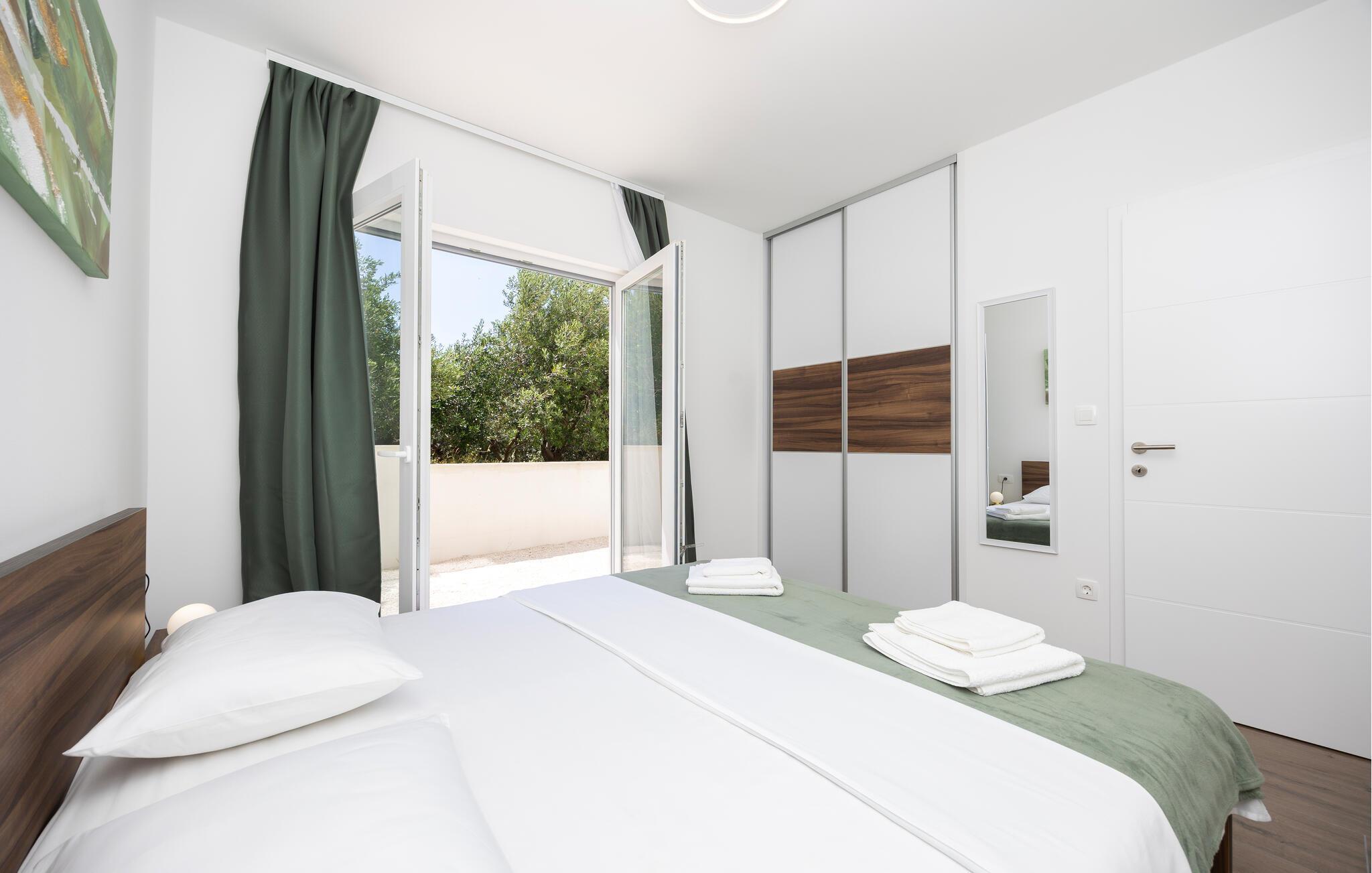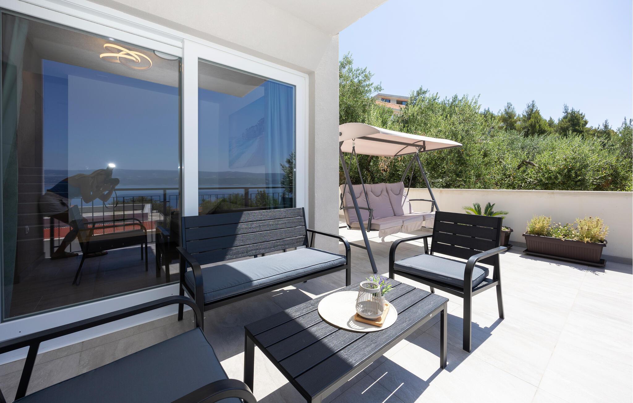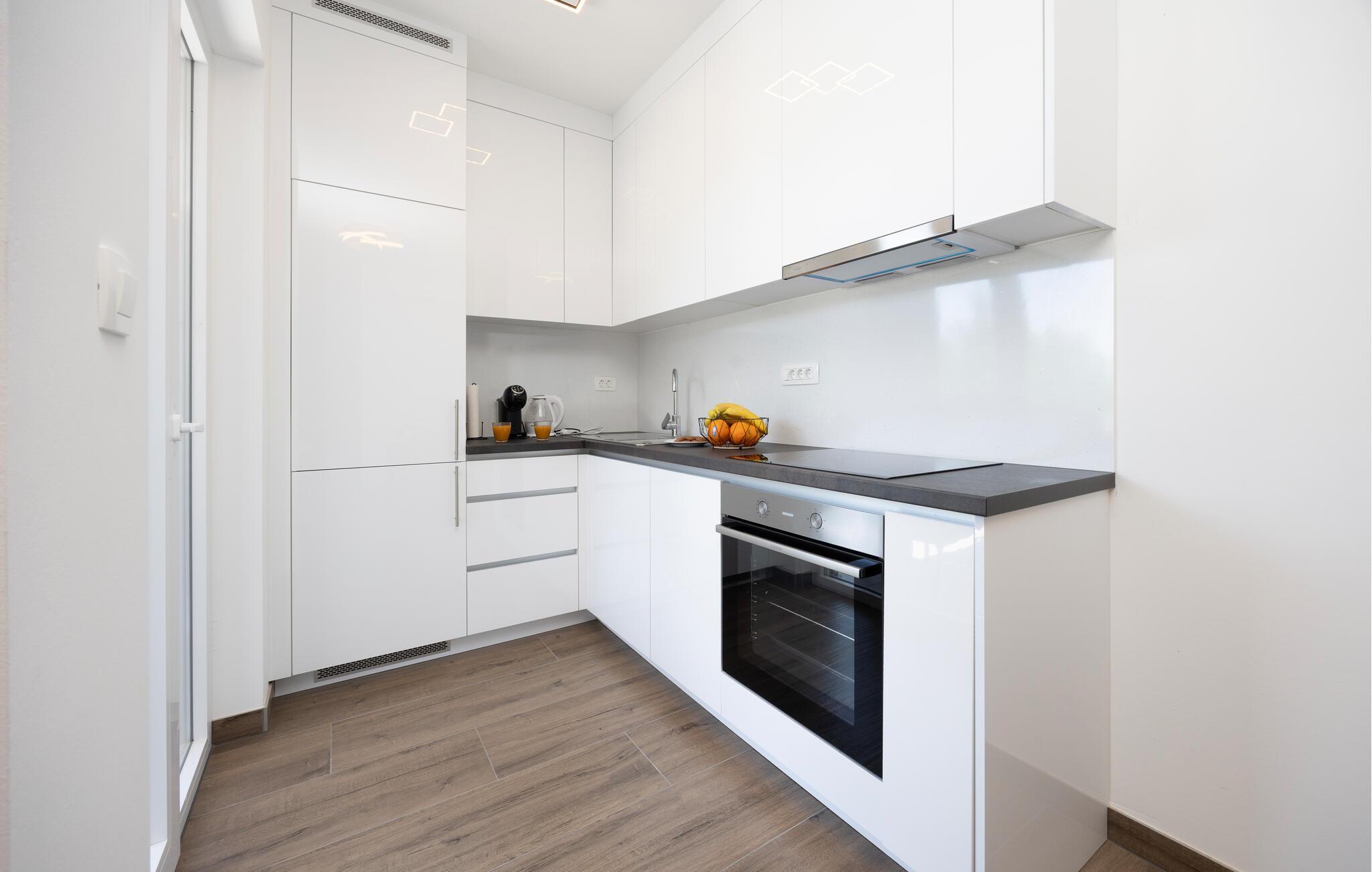 Diese moderne Wohnung bietet Ihnen alles, was Sie für einen komfortablen Aufenthalt benötigen. Profitieren Sie von der idealen Lage nur wenige Gehminuten vom Strand entfernt und genießen Sie die Nähe zu Restaurants, Cafés und Einkaufsmöglichkeiten. Machen Sie es sich auf dem großen Sofa im Wohnbereich gemütlich, genießen Sie gemeinsame Mahlzeiten am Esstisch und bereiten Sie Ihre Lieblingsgerichte in der Küche zu. Die Wohnung bietet auch direkten Zugang zur Terrasse mit Blick auf die Adria.