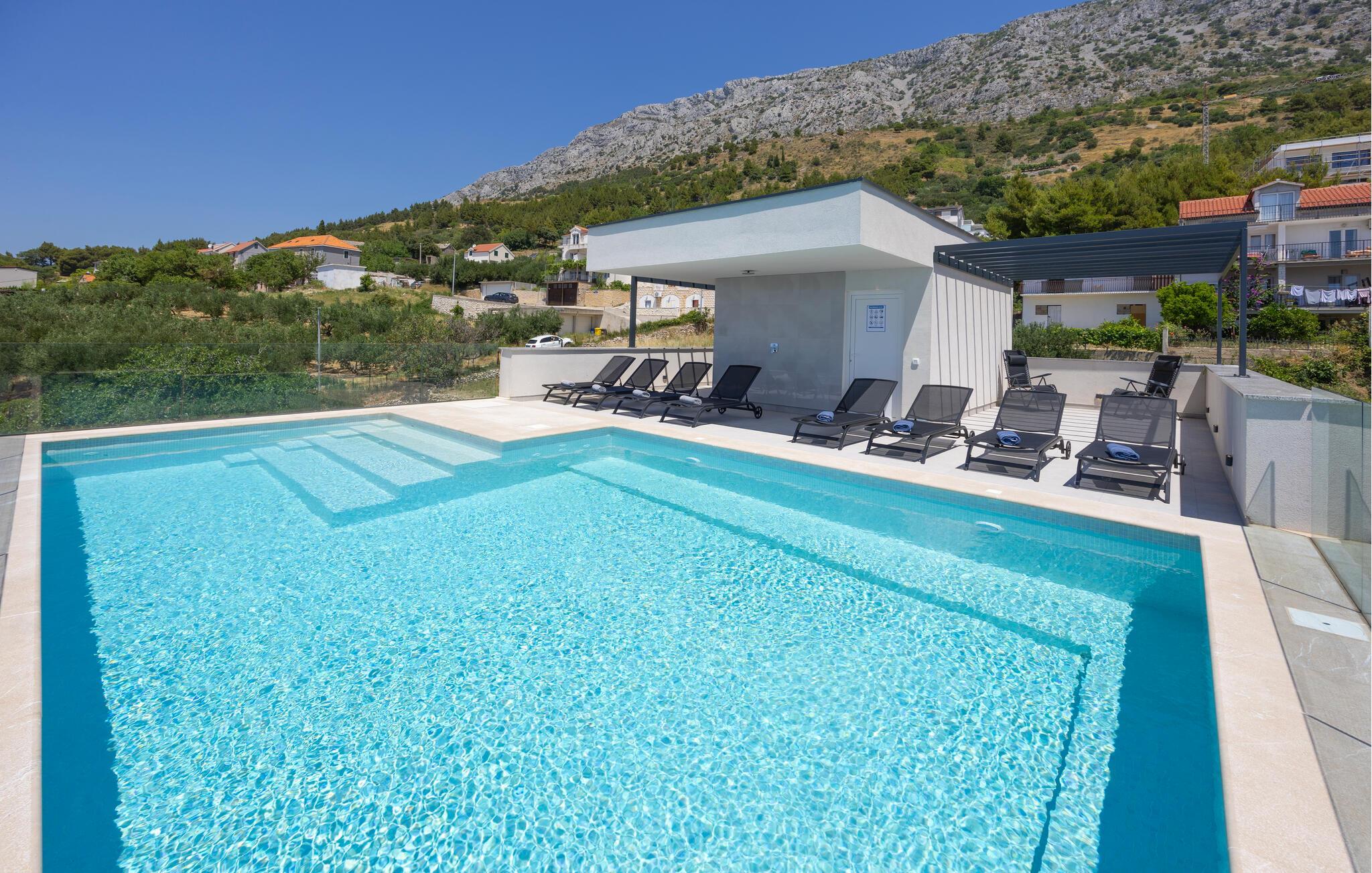 Entspannen Sie auf den bequemen Liegestühlen und lassen Sie den Blick über das glitzernde Wasser schweifen. Der gemeinschaftlich genutzte Pool lädt zu einem erfrischenden Bad mit Panoramaausblick ein, ideal für warme Sommertage und romantische Sonnenuntergänge.