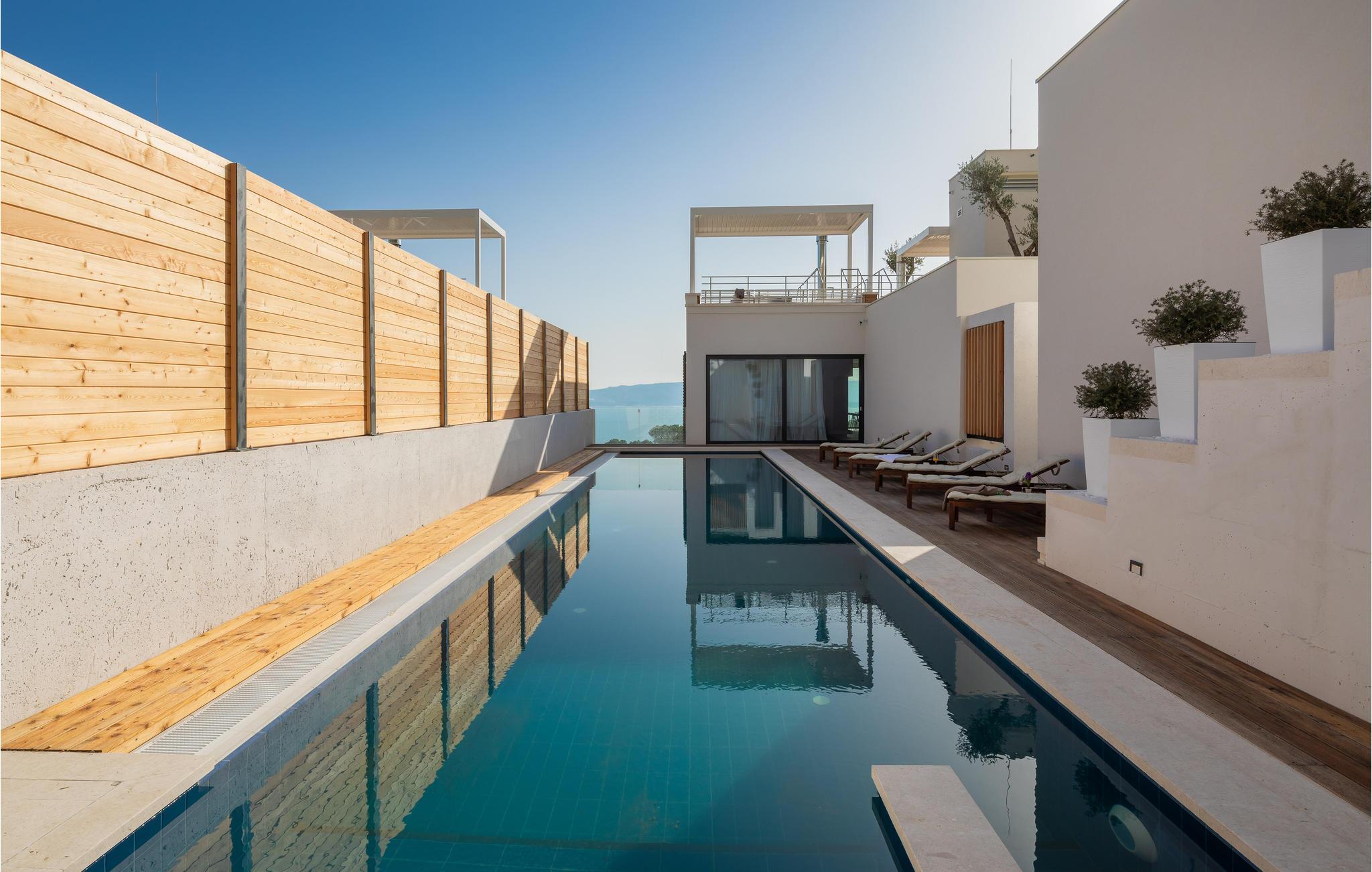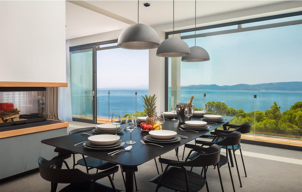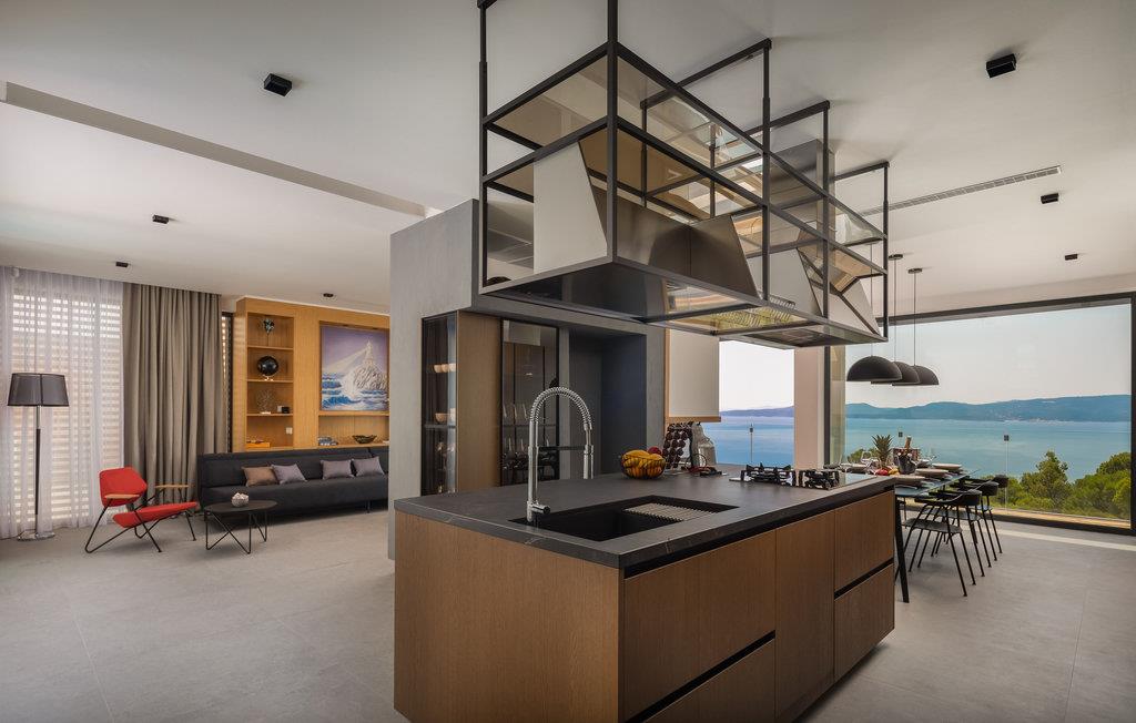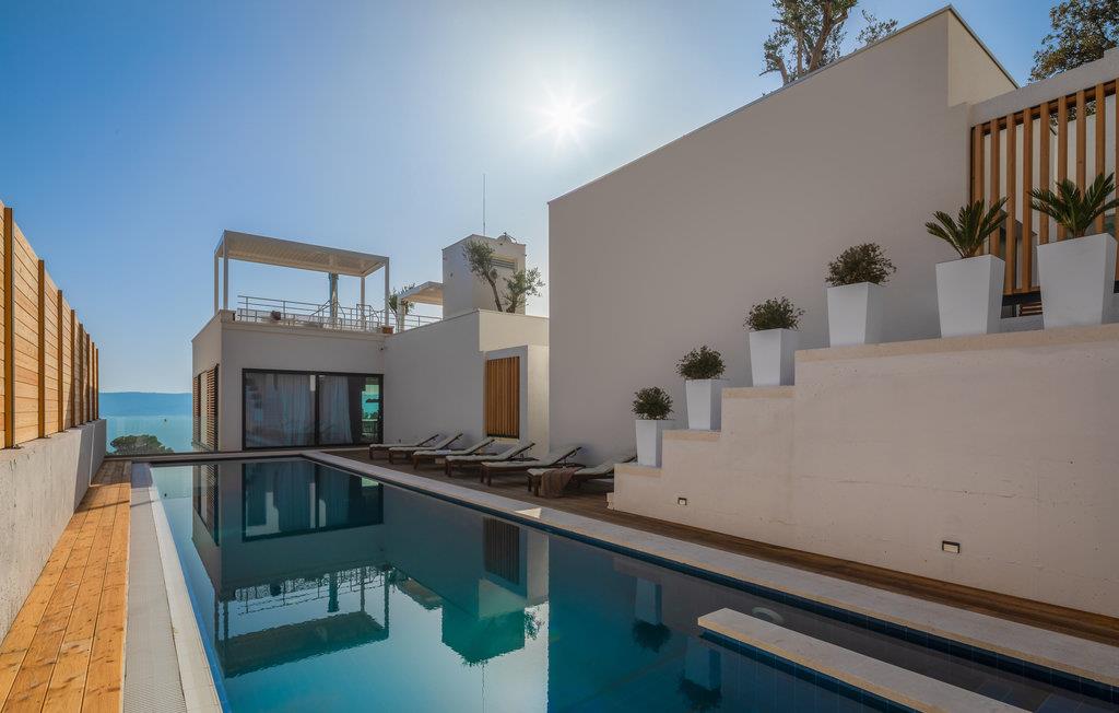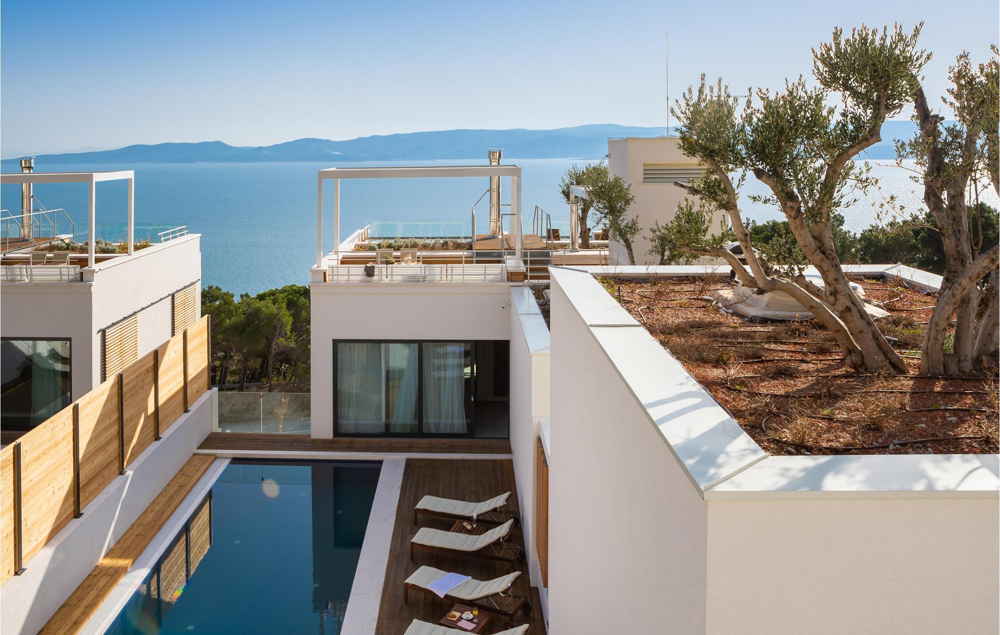 Kommen Sie in diese stilvoll eingerichtete Ferienunterkunft und freuen Sie sich auf einen fantastischen Urlaub. Genießen Sie den wundervollen Panoramablick auf das Meer und die Insel Brac von der großzügigen zentralen Terrasse aus, die direkt mit allen Zimmern und dem Wohnzimmer verbunden ist. Erfrischen Sie sich in dem großen Pool oder ziehen Sie sogar ein paar Bahnen. Er bietet Platz genug für ein bisschen Morgensport. Sonnen Sie sich anschließend und verbringen Sie entspannte Stunden bei unvergesslichen Sonnenuntergängen. Profitieren Sie auch von dem großartigen Wellnessbereich mit Whirlpool, Sauna, Fitnessgeräten und Tepidarium. Wenn Sie etwas Privatsphäre benötigen, können Sie diese in Ruhe auf einer der separaten Außenterrassen für jedes Zimmer genießen.