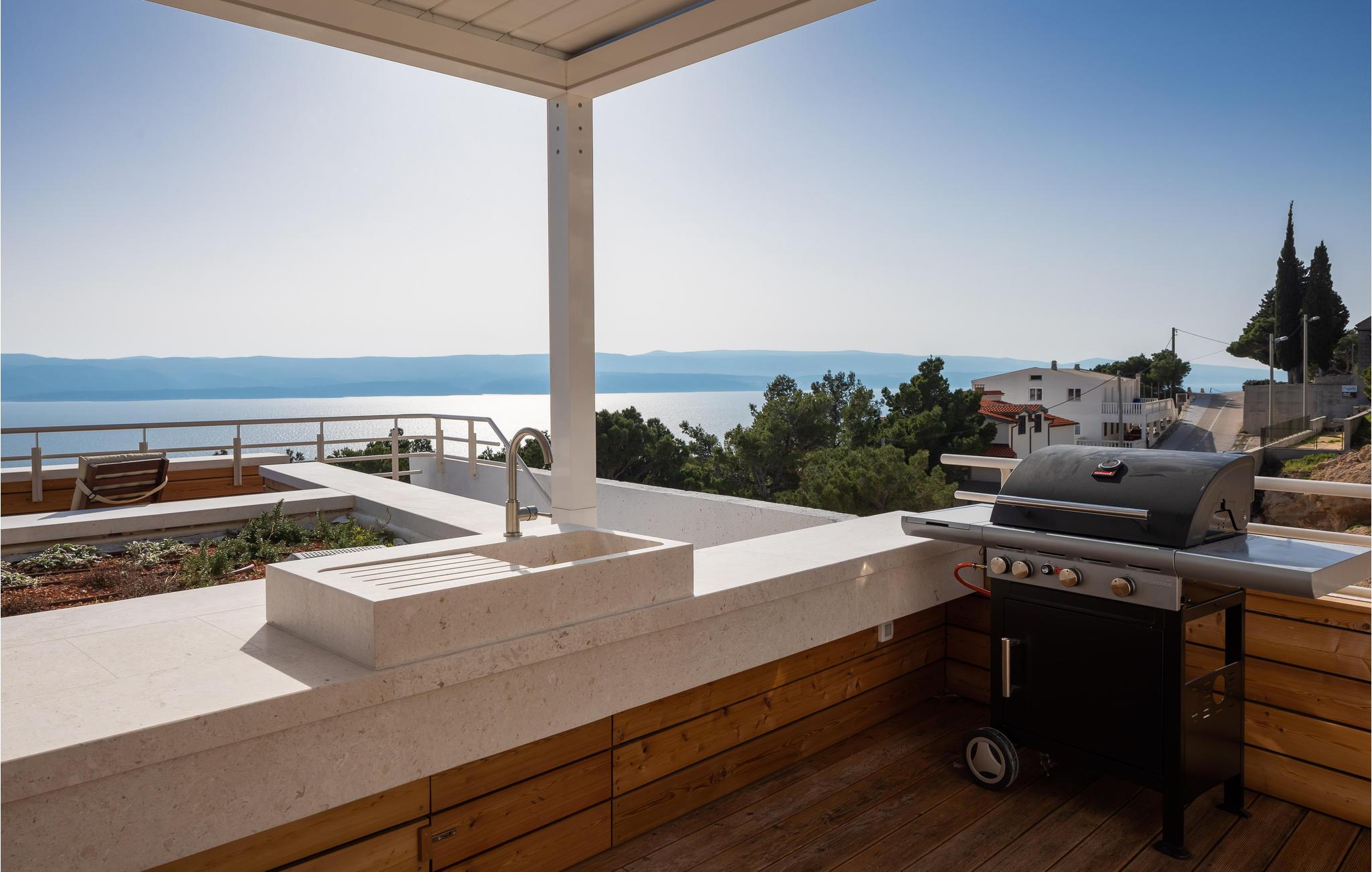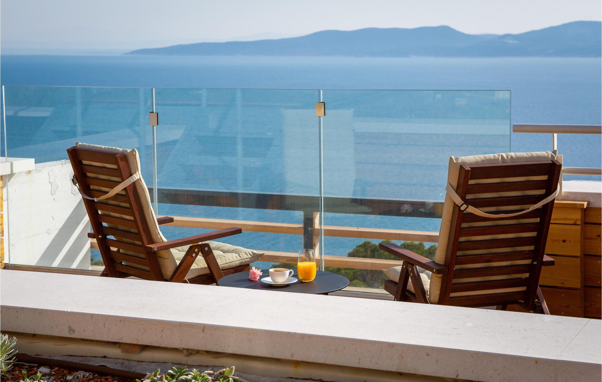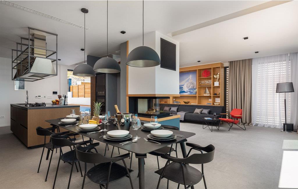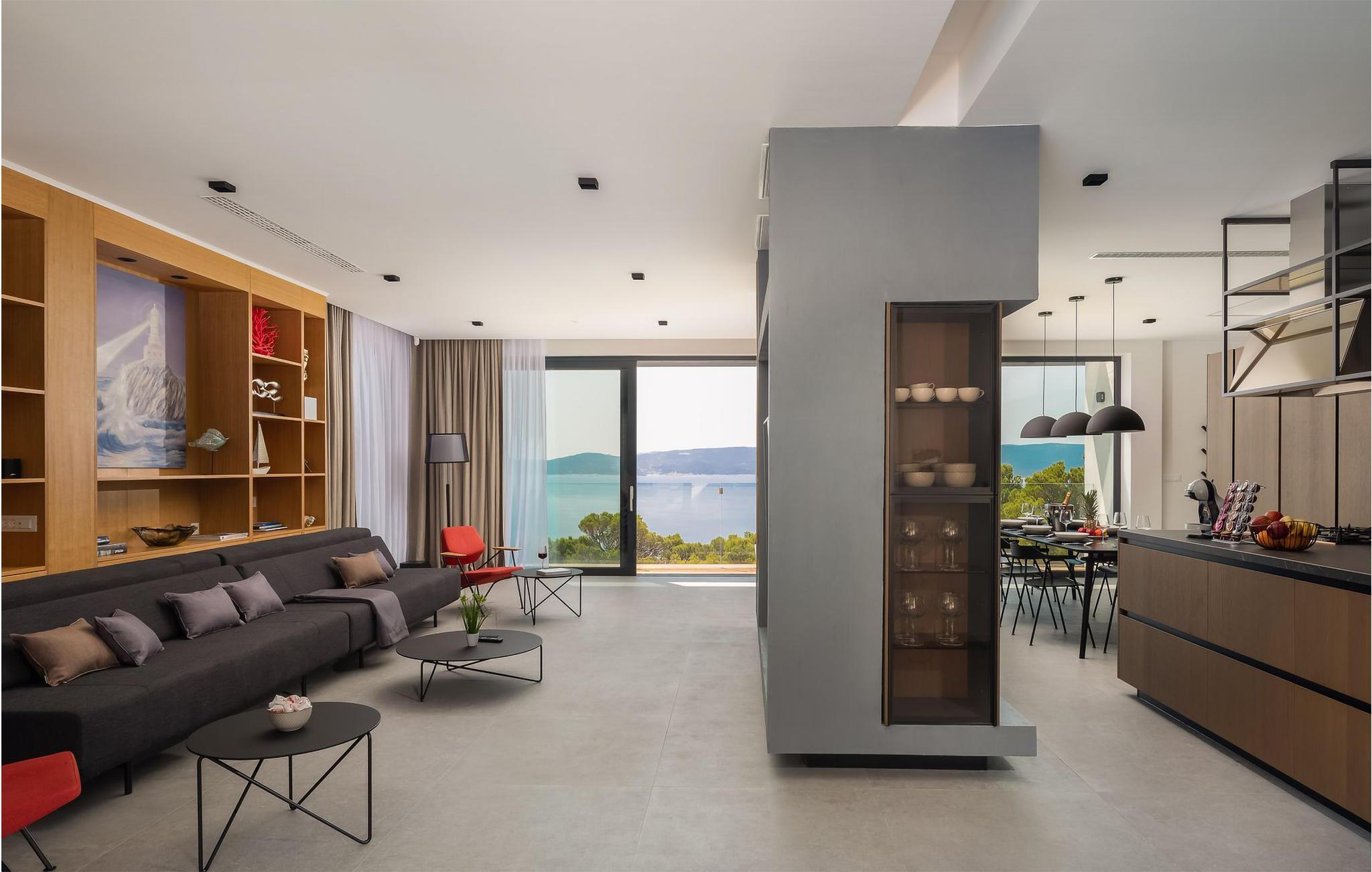 Kommen Sie in diese stilvoll eingerichtete Ferienunterkunft und freuen Sie sich auf einen fantastischen Urlaub. Genießen Sie den wundervollen Panoramablick auf das Meer und die Insel Brac von der großzügigen zentralen Terrasse aus, die direkt mit allen Zimmern und dem Wohnzimmer verbunden ist. Erfrischen Sie sich in dem großen Pool oder ziehen Sie sogar ein paar Bahnen. Er bietet Platz genug für ein bisschen Morgensport. Sonnen Sie sich anschließend und verbringen Sie entspannte Stunden bei unvergesslichen Sonnenuntergängen. Profitieren Sie auch von dem großartigen Wellnessbereich mit Whirlpool, Sauna, Fitnessgeräten und Tepidarium. Wenn Sie etwas Privatsphäre benötigen, können Sie diese in Ruhe auf einer der separaten Außenterrassen für jedes Zimmer genießen.
