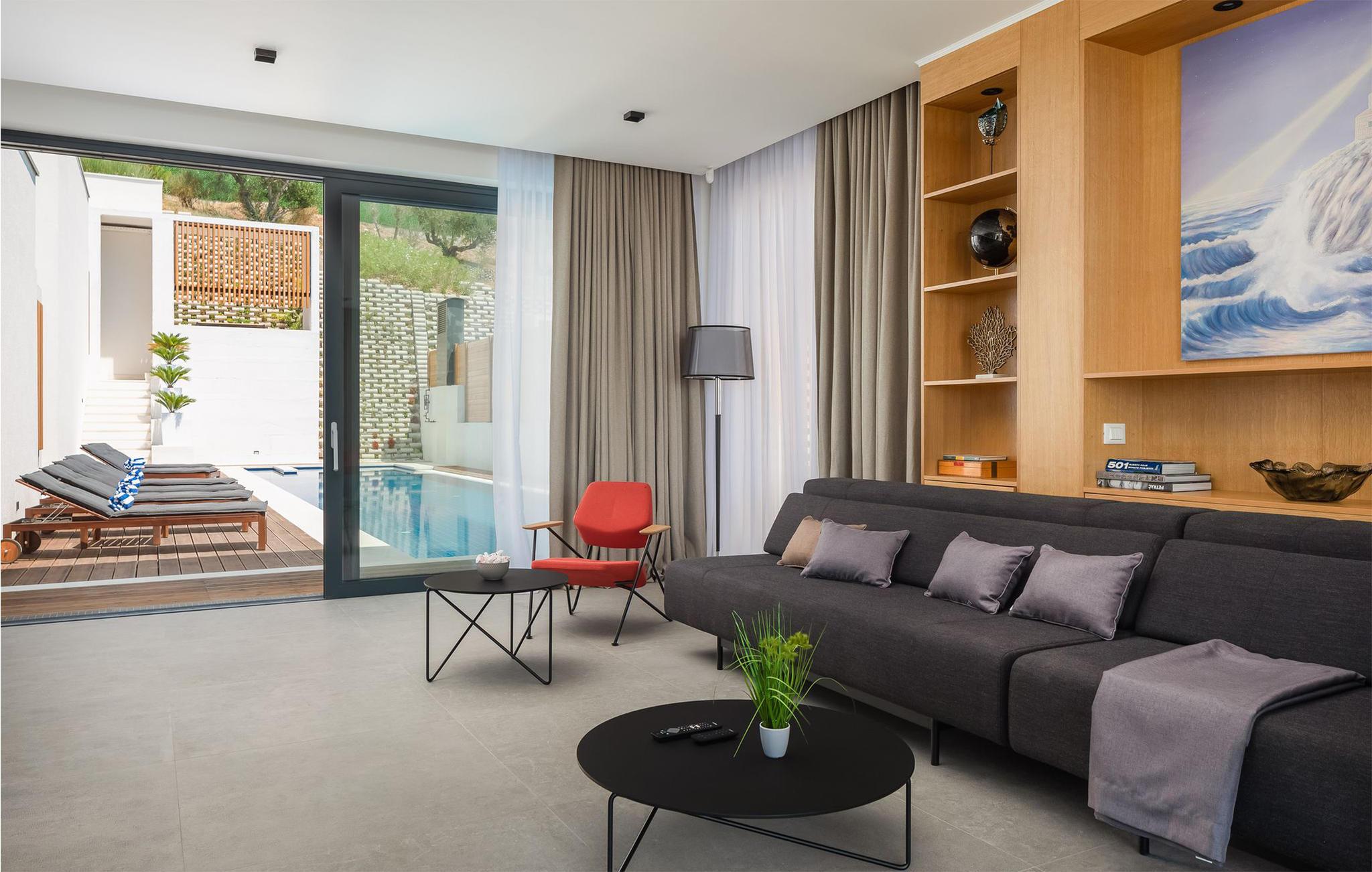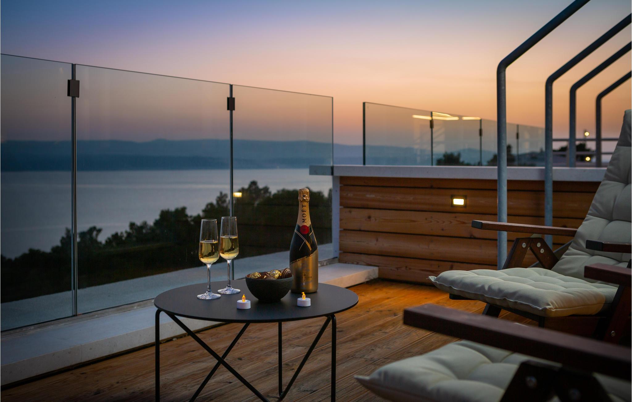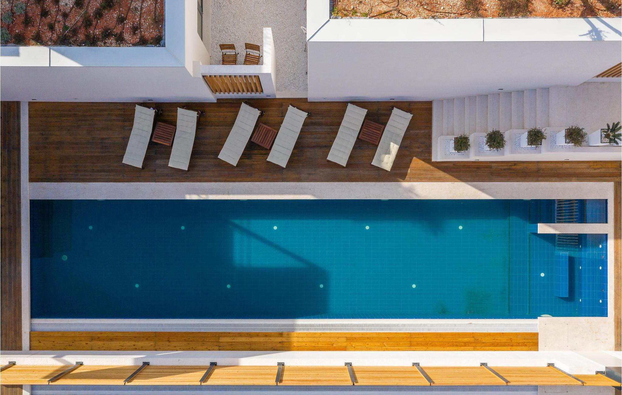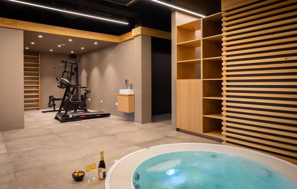 Kommen Sie in diese stilvoll eingerichtete Ferienunterkunft und freuen Sie sich auf einen fantastischen Urlaub. Genießen Sie den wundervollen Panoramablick auf das Meer und die Insel Brac von der großzügigen zentralen Terrasse aus, die direkt mit allen Zimmern und dem Wohnzimmer verbunden ist. Erfrischen Sie sich in dem großen Pool oder ziehen Sie sogar ein paar Bahnen. Er bietet Platz genug für ein bisschen Morgensport. Sonnen Sie sich anschließend und verbringen Sie entspannte Stunden bei unvergesslichen Sonnenuntergängen. Profitieren Sie auch von dem großartigen Wellnessbereich mit Whirlpool, Sauna, Fitnessgeräten und Tepidarium. Wenn Sie etwas Privatsphäre benötigen, können Sie diese in Ruhe auf einer der separaten Außenterrassen für jedes Zimmer genießen.
