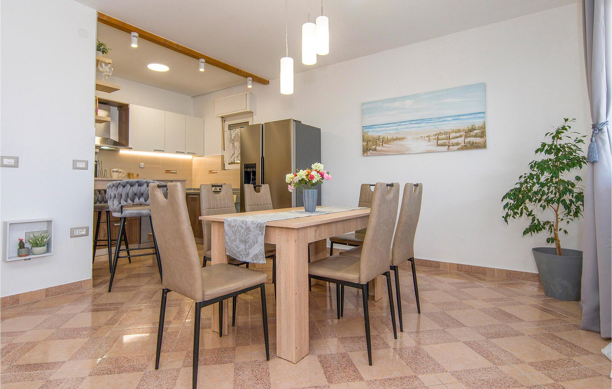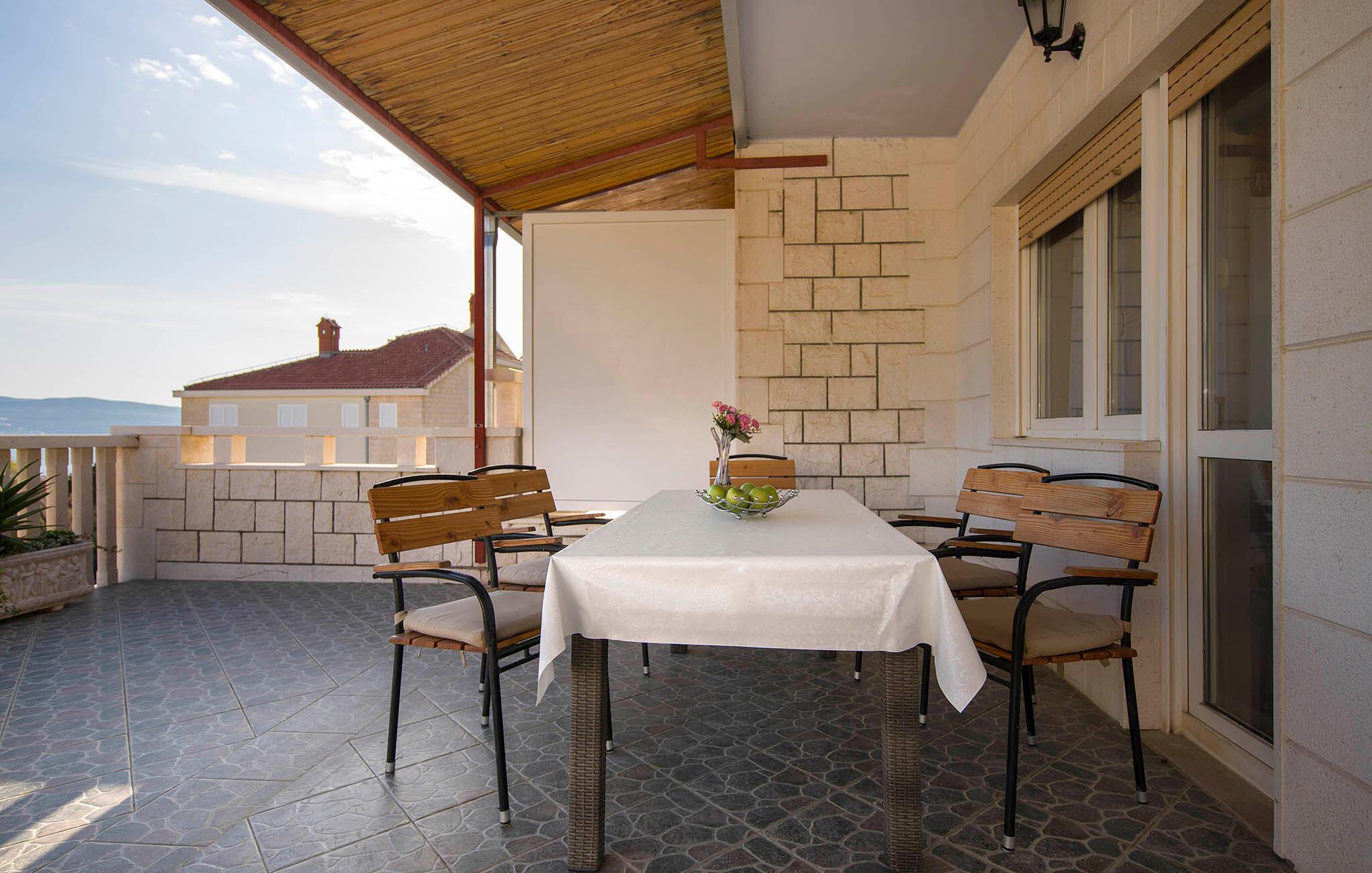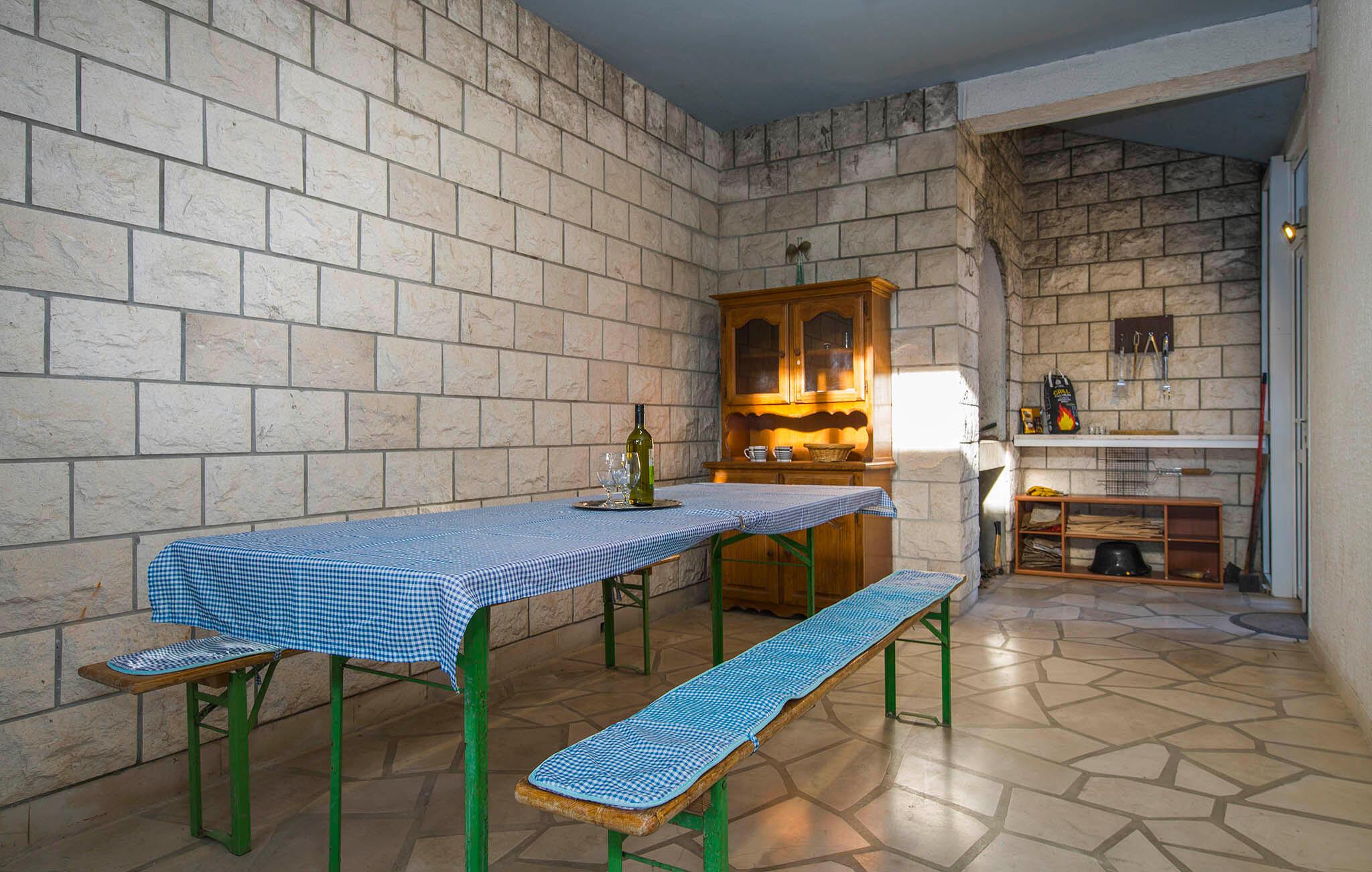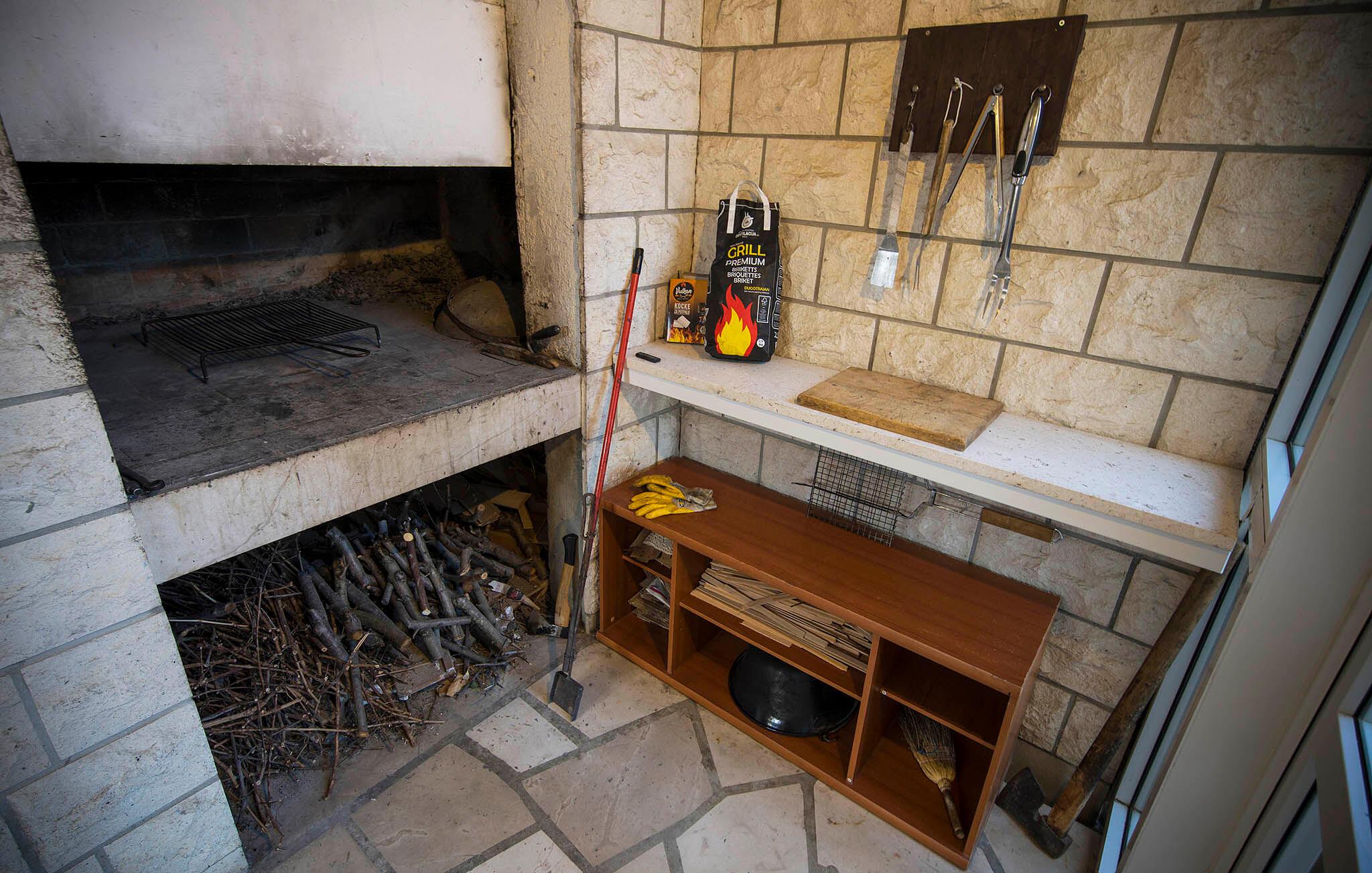 Treten Sie hinaus auf die weitläufige Terrasse und genießen Sie den beruhigenden Blick auf die blaue Adria. Nehmen Sie auf den Sonnenliegen Platz oder suchen Sie unter dem überdachten Bereich Schatten für eine Pause während der warmen Stunden. Nutzen Sie den gemauerten Grill und die Außenküche, um frische Zutaten zuzubereiten, und verbringen Sie gesellige Abende am Terrassentisch.
