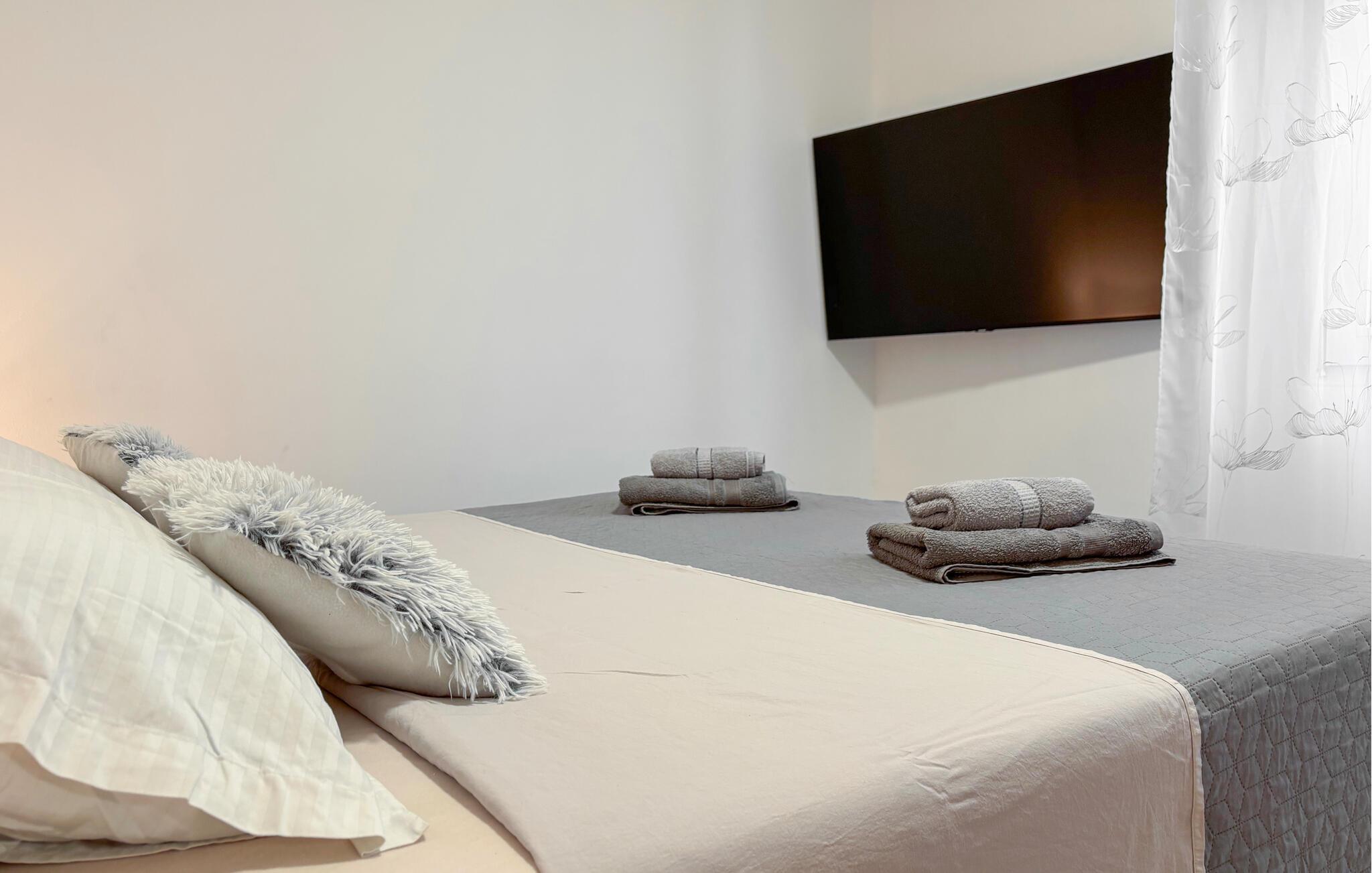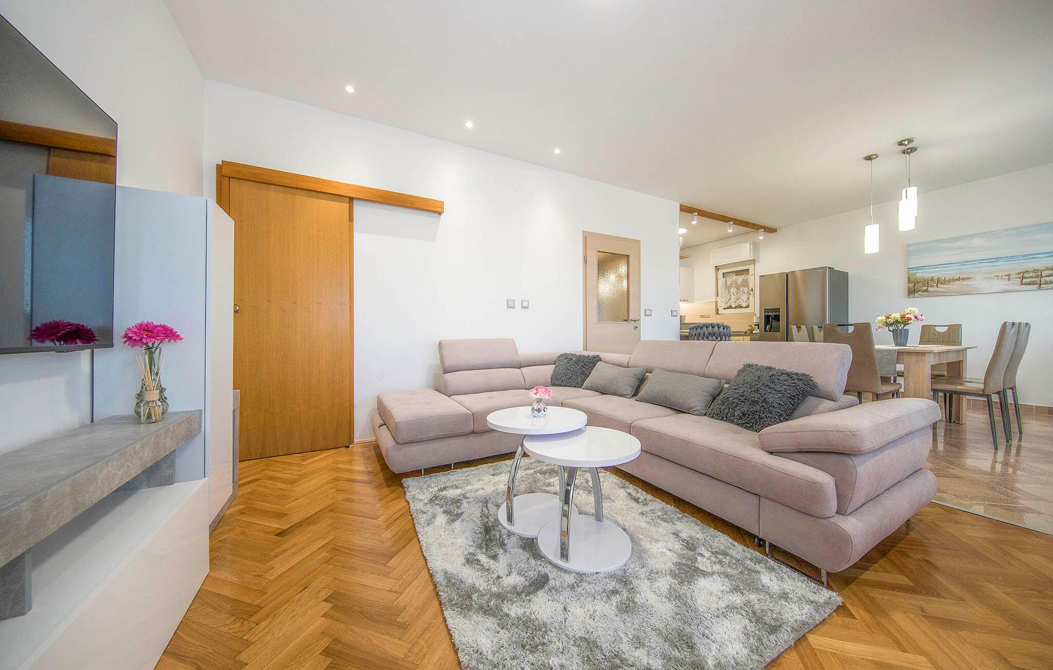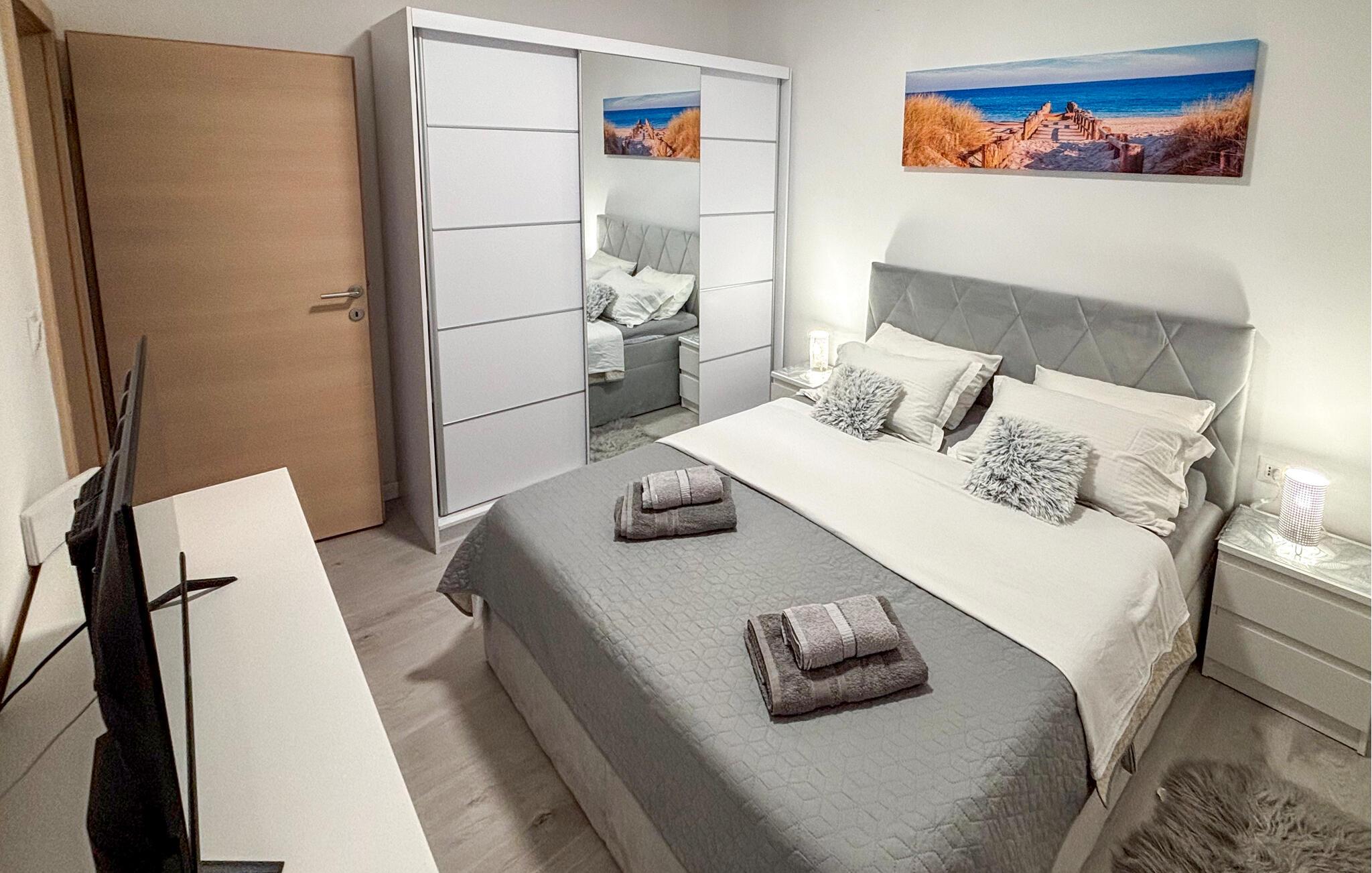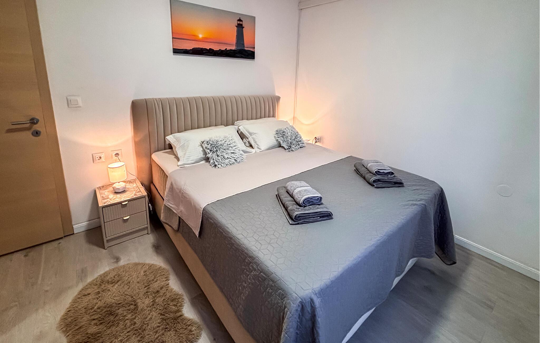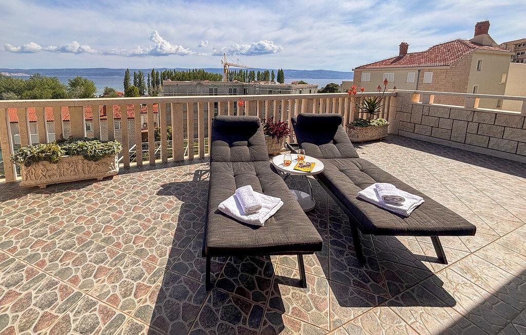 Treten Sie hinaus auf die weitläufige Terrasse und genießen Sie den beruhigenden Blick auf die blaue Adria. Nehmen Sie auf den Sonnenliegen Platz oder suchen Sie unter dem überdachten Bereich Schatten für eine Pause während der warmen Stunden. Nutzen Sie den gemauerten Grill und die Außenküche, um frische Zutaten zuzubereiten, und verbringen Sie gesellige Abende am Terrassentisch.
