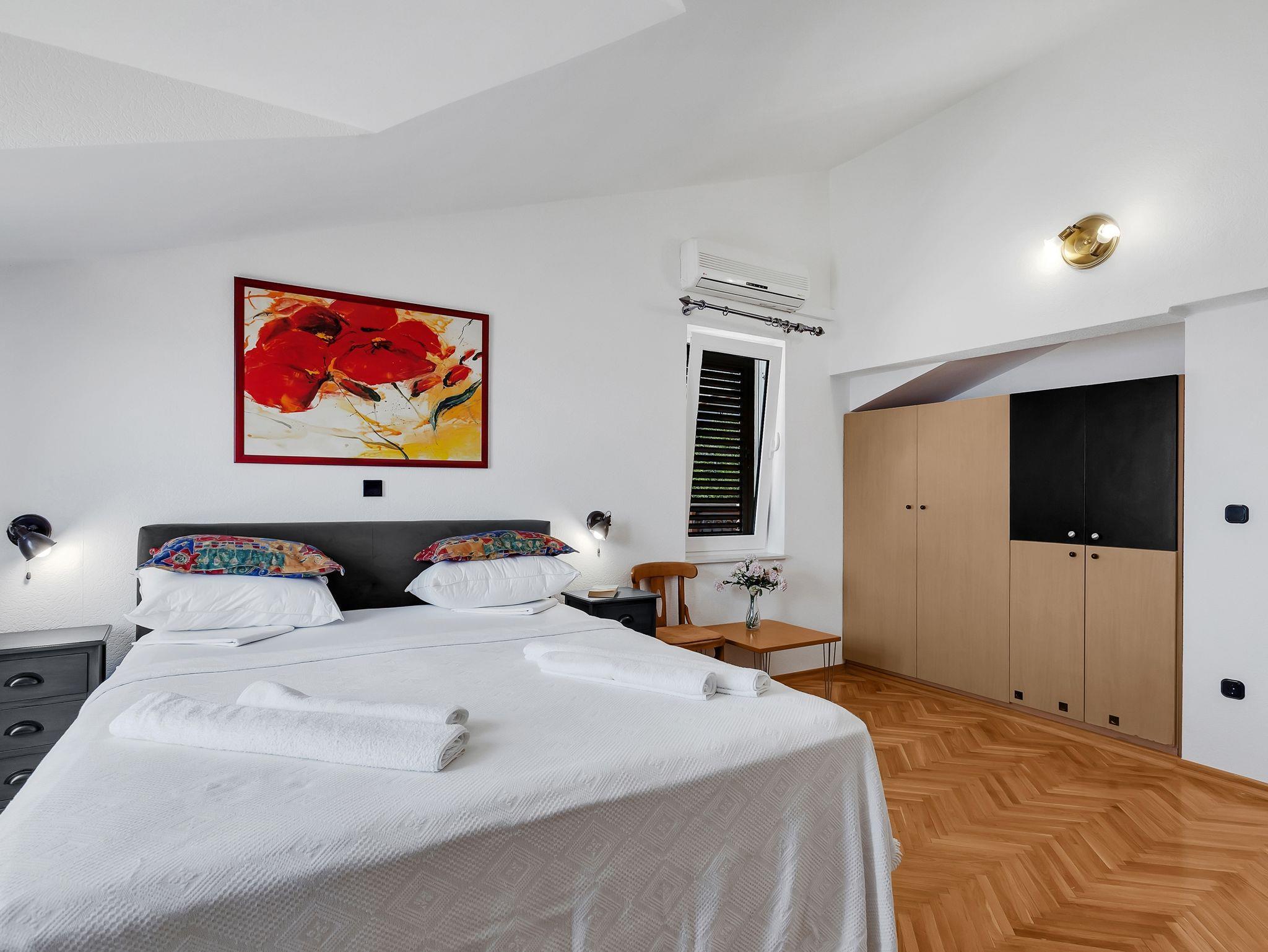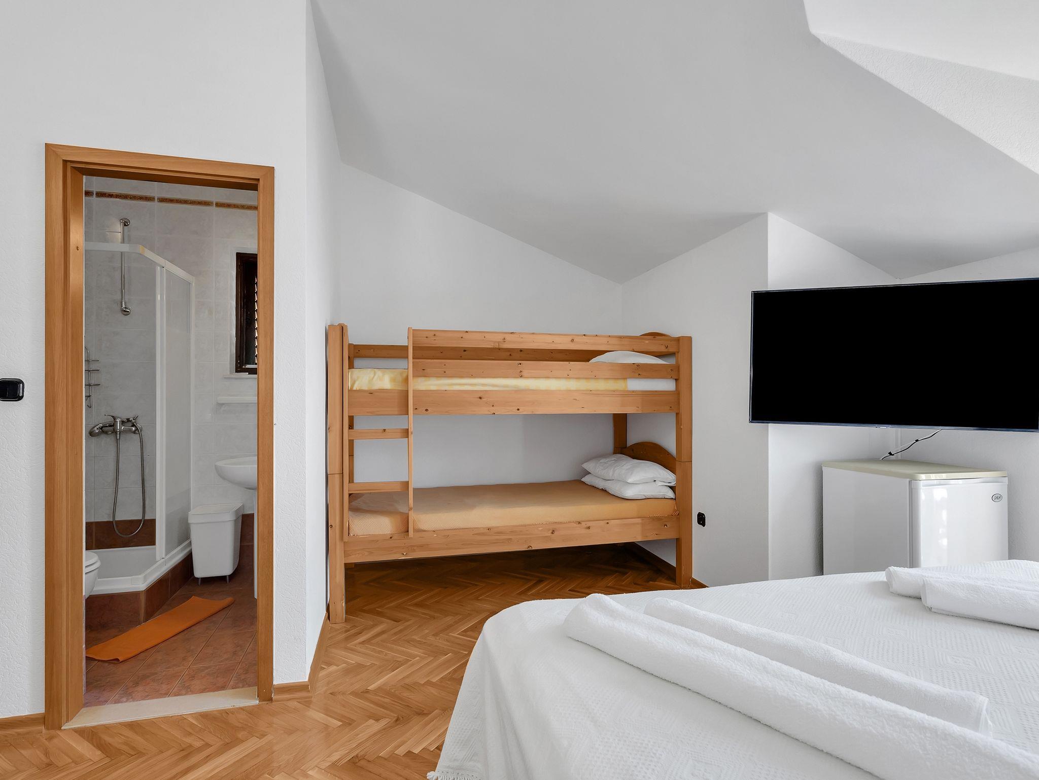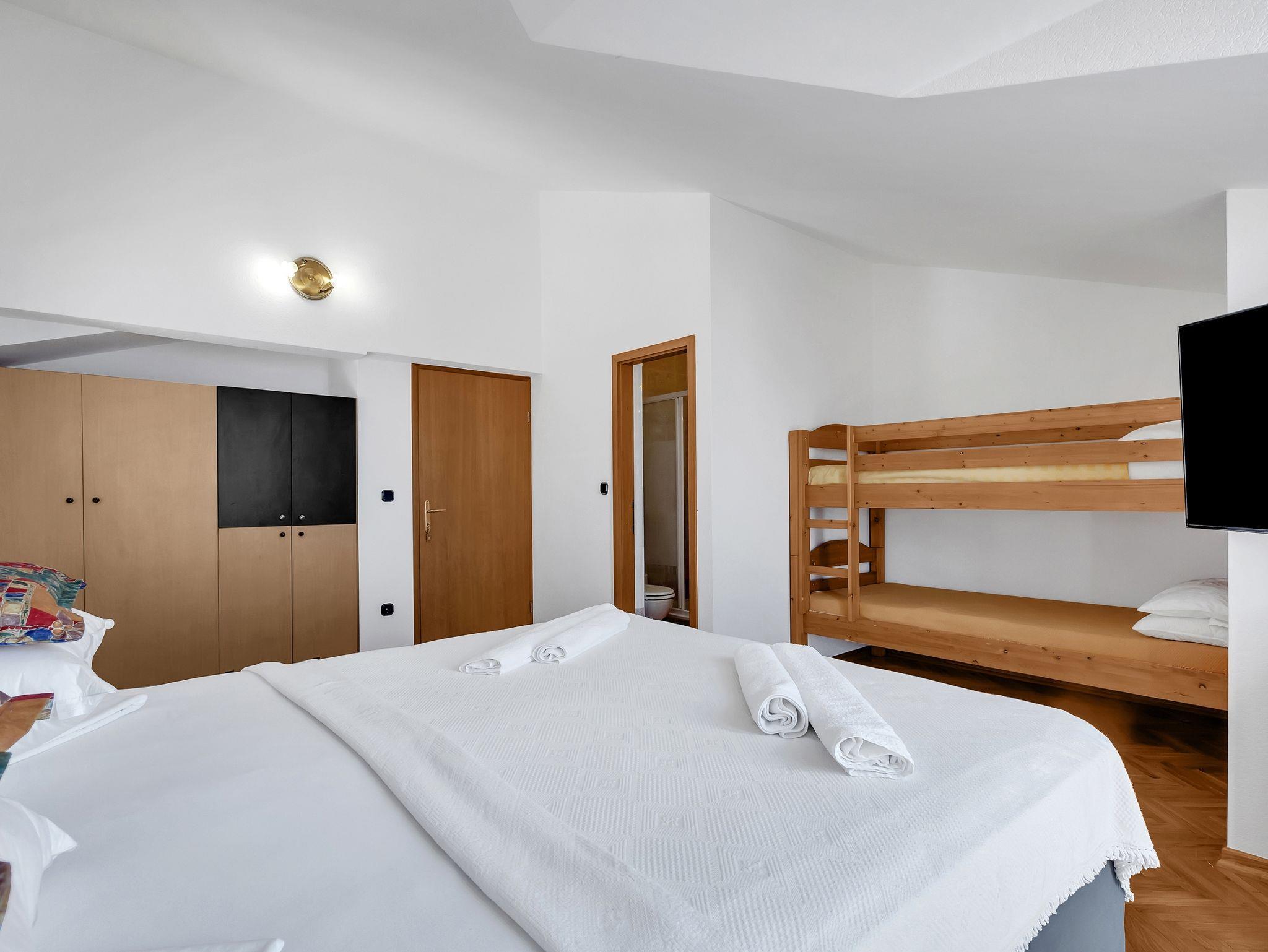 Zimmer bietet Platz für 4 Gäste. Die Betten sind in Schlafzimmern, die es 1 gibt, innerhalb einer Gesamtfläche von 22m2, angeordnet. Die Gäste haben einen eigenen Balkon zur Verfügung, auf der sie in warmen Sommernächten genießen können. Das Zimmer bietet Meerblick. In der Unterkunftseinheit besteht die Möglichkeit des Mitbringens von Haustieren gegen Aufpreis. Die reservierte Unterkunftseinheit ist ein Zimmer mit eigenem Badezimmer ohne die Möglichkeit der Nutzung einer Küche. Die reservierte Unterkunftseinheit verfügt über einen gemeinsame Terrasse. IM PREIS INBEGRIFFEN: Kurtaxe, Endreinigung, Klimatisierung, Parkplatz, Internet, Bügeleisen, Bügelbrett, Föhn. VERBINDLICHE ZUSÄTZLICHE KOSTEN: Aufzahlung für Kurzaufenthalte (prozentualer Zuschlag pro Nächtigungsanzahl: 30% - 1, 20% - 2, 10% - 3). UNVERBINDLICHE ZUSÄTZLICHE KOSTEN: Haustiere (10,00 € pro Nacht). Die Verfügbarkeit zusätzlicher Dienstleistungen in Ihrem reservierten Termin und die Preise derselben (falls nicht aufgeführt) müssen im Voraus überprüft werden. Zusätzliche Dienstleistungen die in der Zahlungsaufforderung nicht aufgeführt sind werden direkt beim Vermieter bezahlt, angenommen der Gast nutzt auch diese. Ermäßigung auf den Grundpreis: Gratistag 14=13 (bei einem Aufenthalt von 14 Tagen oder mehr erhalten Sie einen Gratistag für den Aufenthalt bis 31.12.26).
