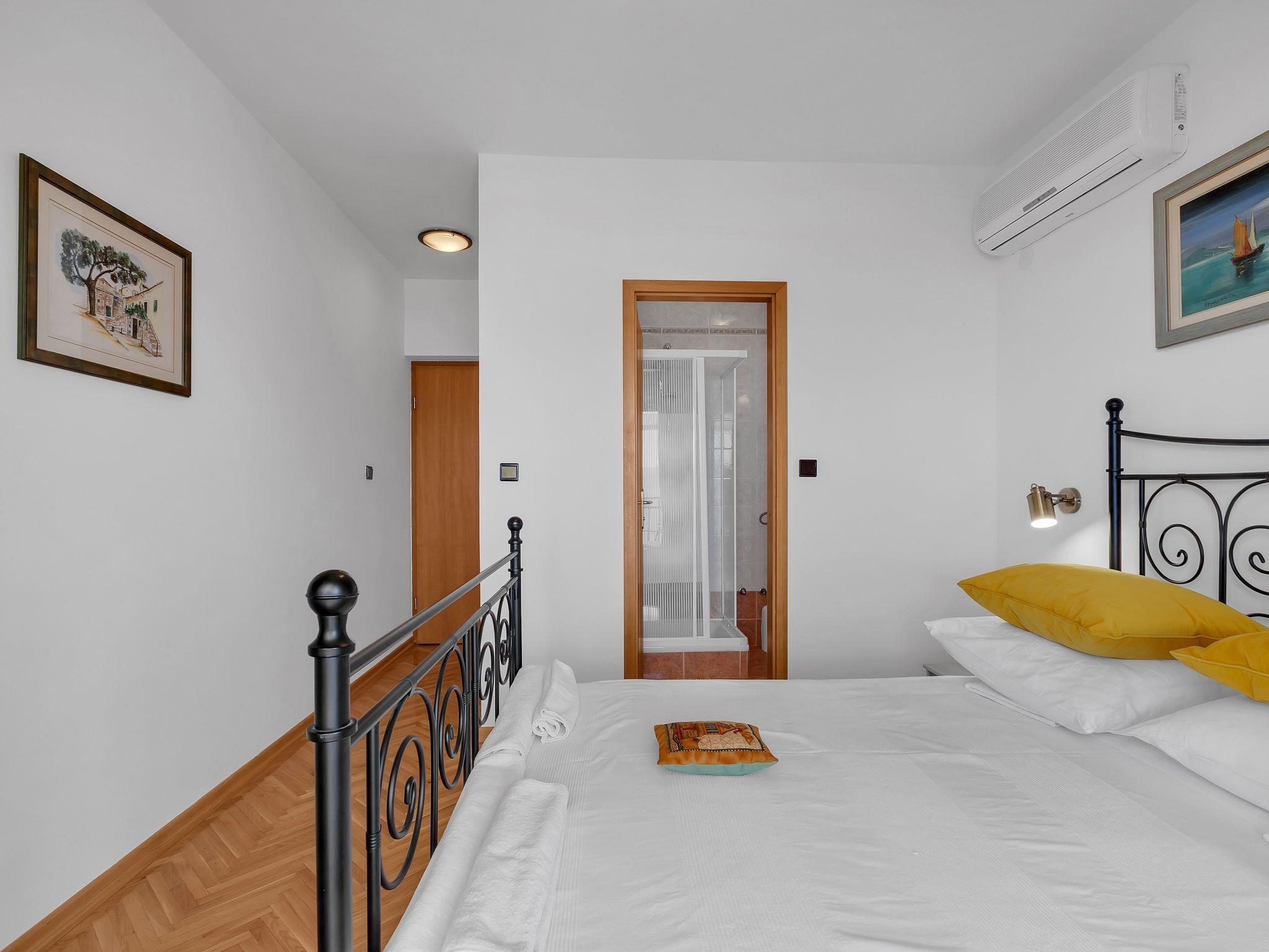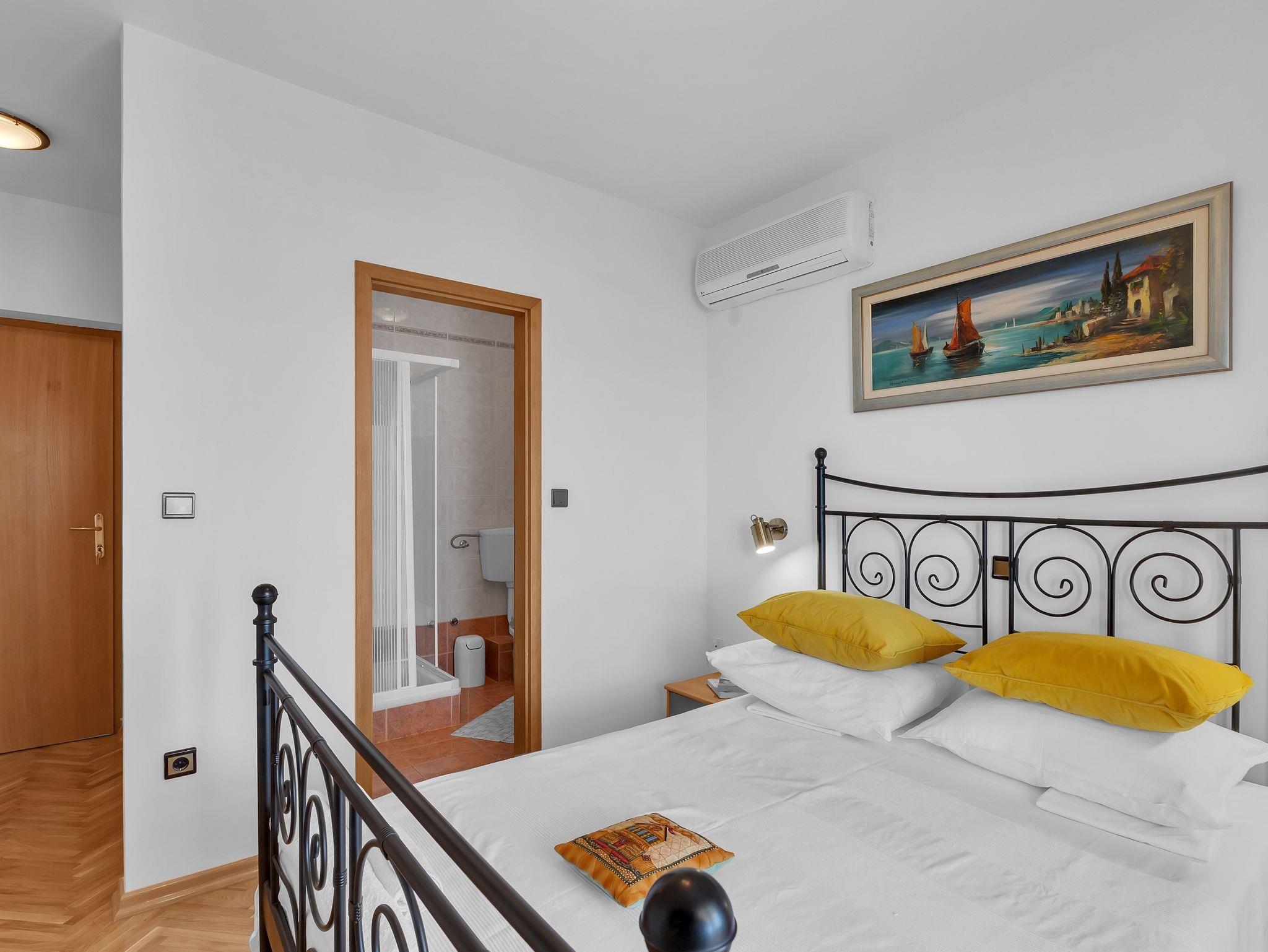 Zimmer bietet Platz für 2 Gäste. Die Betten sind in Schlafzimmern, die es 1 gibt, innerhalb einer Gesamtfläche von 19m2, angeordnet. Die Gäste haben einen eigenen Balkon zur Verfügung, auf der sie in warmen Sommernächten genießen können. Das Zimmer bietet Meerblick. In der Unterkunftseinheit besteht die Möglichkeit des Mitbringens von Haustieren gegen Aufpreis. Die reservierte Unterkunftseinheit ist ein Zimmer mit eigenem Badezimmer ohne die Möglichkeit der Nutzung einer Küche. IM PREIS INBEGRIFFEN: Kurtaxe, Endreinigung, Klimatisierung, Parkplatz, Internet, Bügeleisen, Bügelbrett, Föhn. VERBINDLICHE ZUSÄTZLICHE KOSTEN: Aufzahlung für Kurzaufenthalte (prozentualer Zuschlag pro Nächtigungsanzahl: 30% - 1, 20% - 2, 10% - 3). UNVERBINDLICHE ZUSÄTZLICHE KOSTEN: Haustiere (10,00 € pro Nacht). Die Verfügbarkeit zusätzlicher Dienstleistungen in Ihrem reservierten Termin und die Preise derselben (falls nicht aufgeführt) müssen im Voraus überprüft werden. Zusätzliche Dienstleistungen die in der Zahlungsaufforderung nicht aufgeführt sind werden direkt beim Vermieter bezahlt, angenommen der Gast nutzt auch diese. Ermäßigung auf den Grundpreis: Gratistag 14=13 (bei einem Aufenthalt von 14 Tagen oder mehr erhalten Sie einen Gratistag für den Aufenthalt bis 31.12.26).