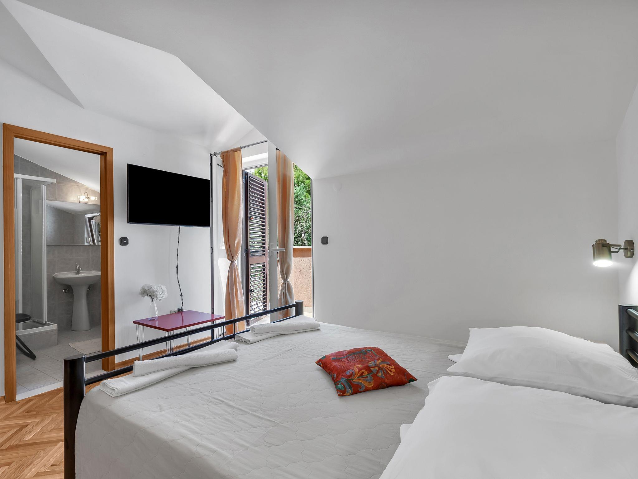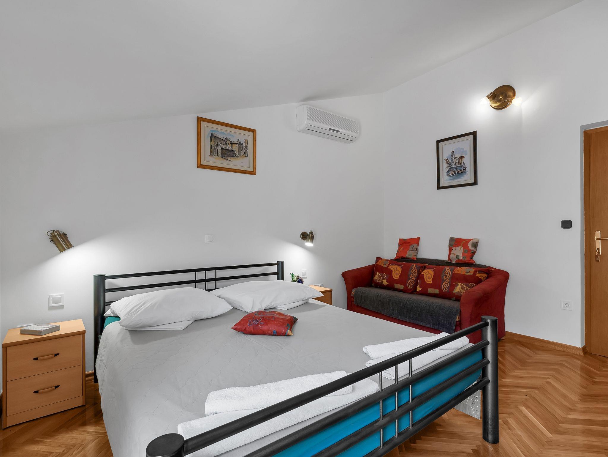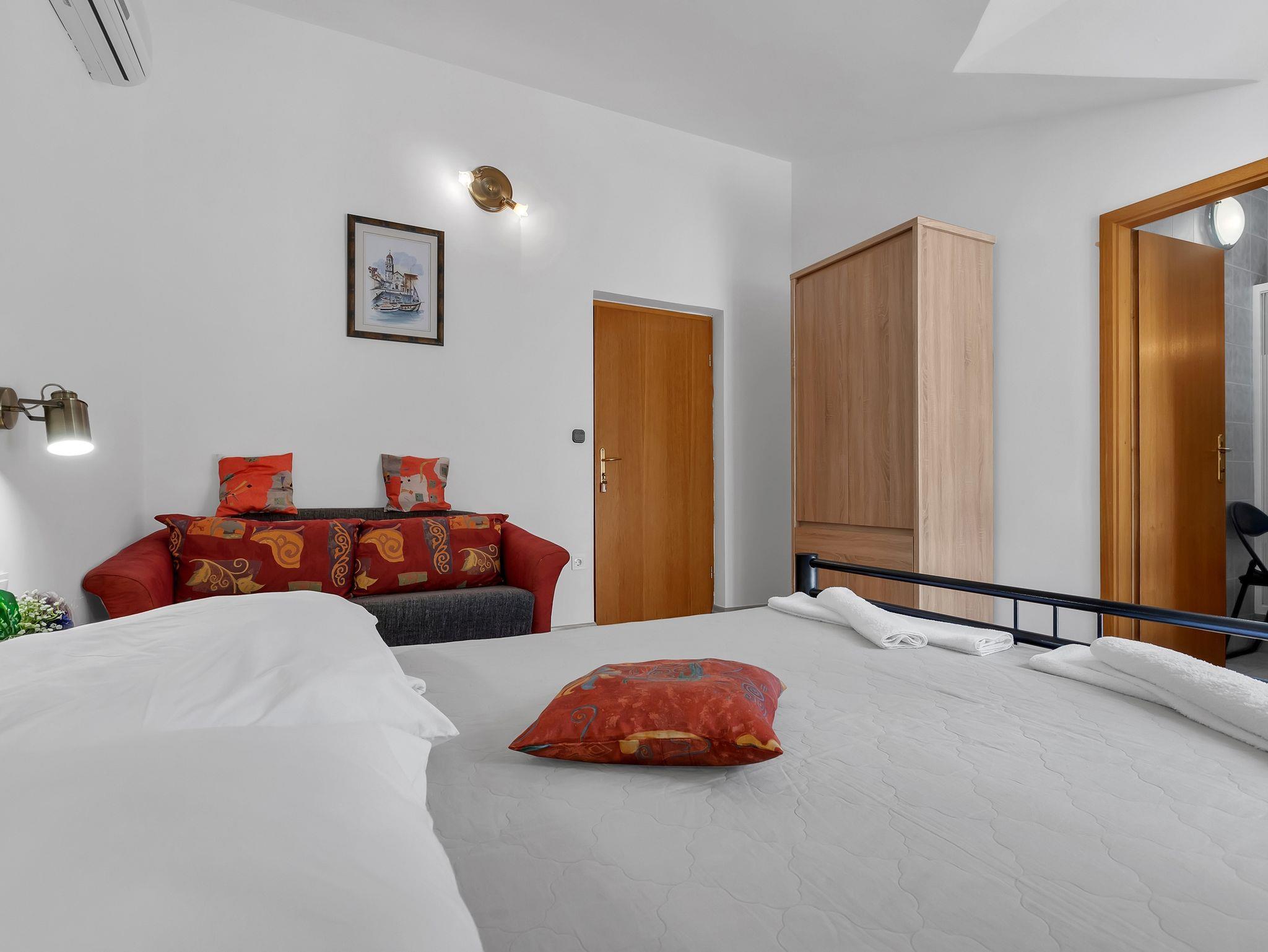 Zimmer bietet Platz für 3 Gäste. Die Betten sind in Schlafzimmern, die es 1 gibt, innerhalb einer Gesamtfläche von 19m2, angeordnet. Die Gäste haben einen eigenen Balkon zur Verfügung, auf der sie in warmen Sommernächten genießen können. Das Zimmer bietet Meerblick. In der Unterkunftseinheit besteht die Möglichkeit des Mitbringens von Haustieren gegen Aufpreis. Die reservierte Unterkunftseinheit ist ein Zimmer mit eigenem Badezimmer ohne die Möglichkeit der Nutzung einer Küche. Die reservierte Unterkunftseinheit verfügt über einen gemeinsame Terrasse. IM PREIS INBEGRIFFEN: Kurtaxe, Endreinigung, Klimatisierung, Parkplatz, Internet, Bügeleisen, Bügelbrett, Föhn. VERBINDLICHE ZUSÄTZLICHE KOSTEN: Aufzahlung für Kurzaufenthalte (prozentualer Zuschlag pro Nächtigungsanzahl: 30% - 1, 20% - 2, 10% - 3). UNVERBINDLICHE ZUSÄTZLICHE KOSTEN: Haustiere (10,00 € pro Nacht). Die Verfügbarkeit zusätzlicher Dienstleistungen in Ihrem reservierten Termin und die Preise derselben (falls nicht aufgeführt) müssen im Voraus überprüft werden. Zusätzliche Dienstleistungen die in der Zahlungsaufforderung nicht aufgeführt sind werden direkt beim Vermieter bezahlt, angenommen der Gast nutzt auch diese. Ermäßigung auf den Grundpreis: Gratistag 14=13 (bei einem Aufenthalt von 14 Tagen oder mehr erhalten Sie einen Gratistag für den Aufenthalt bis 31.12.26).