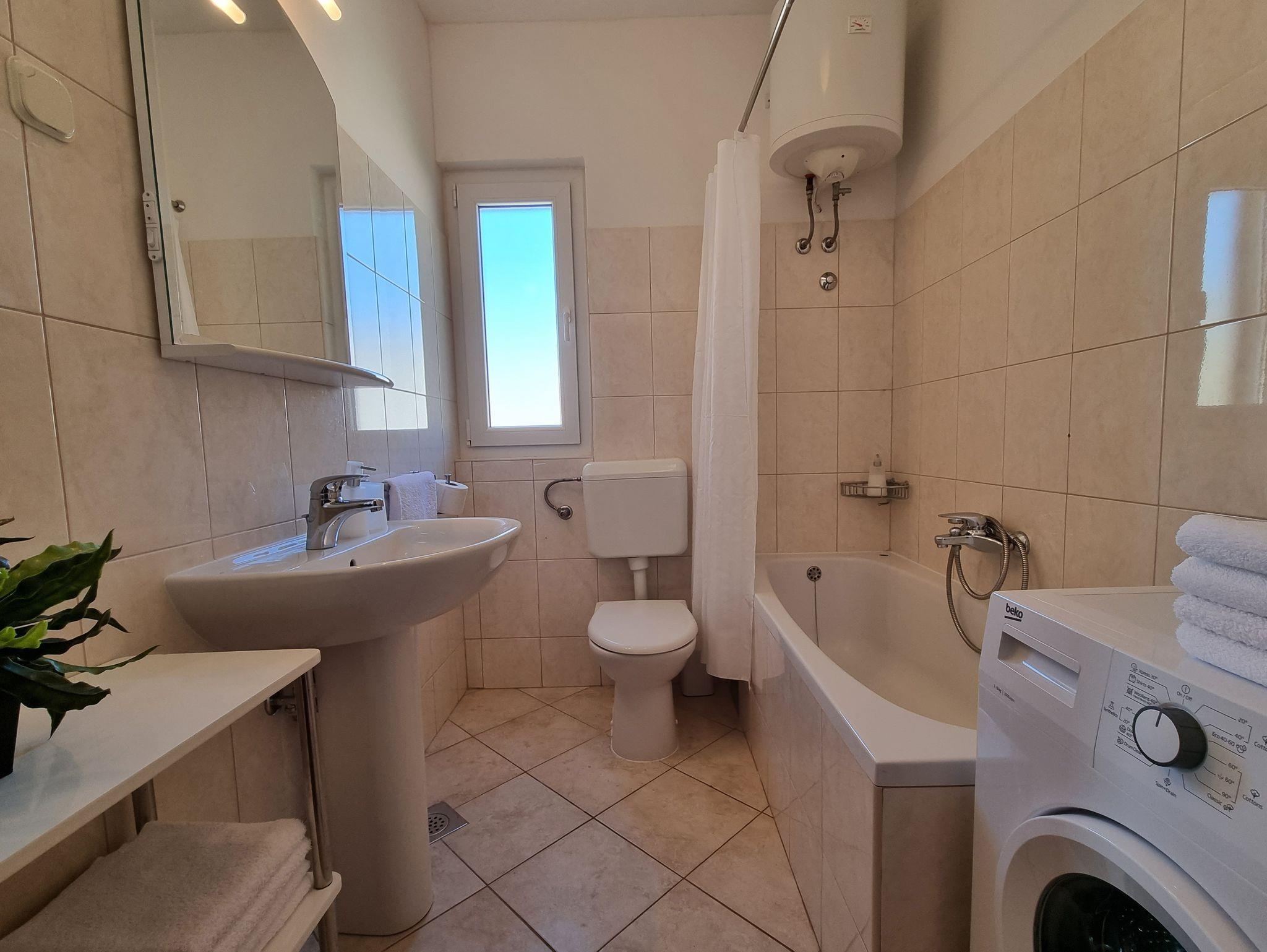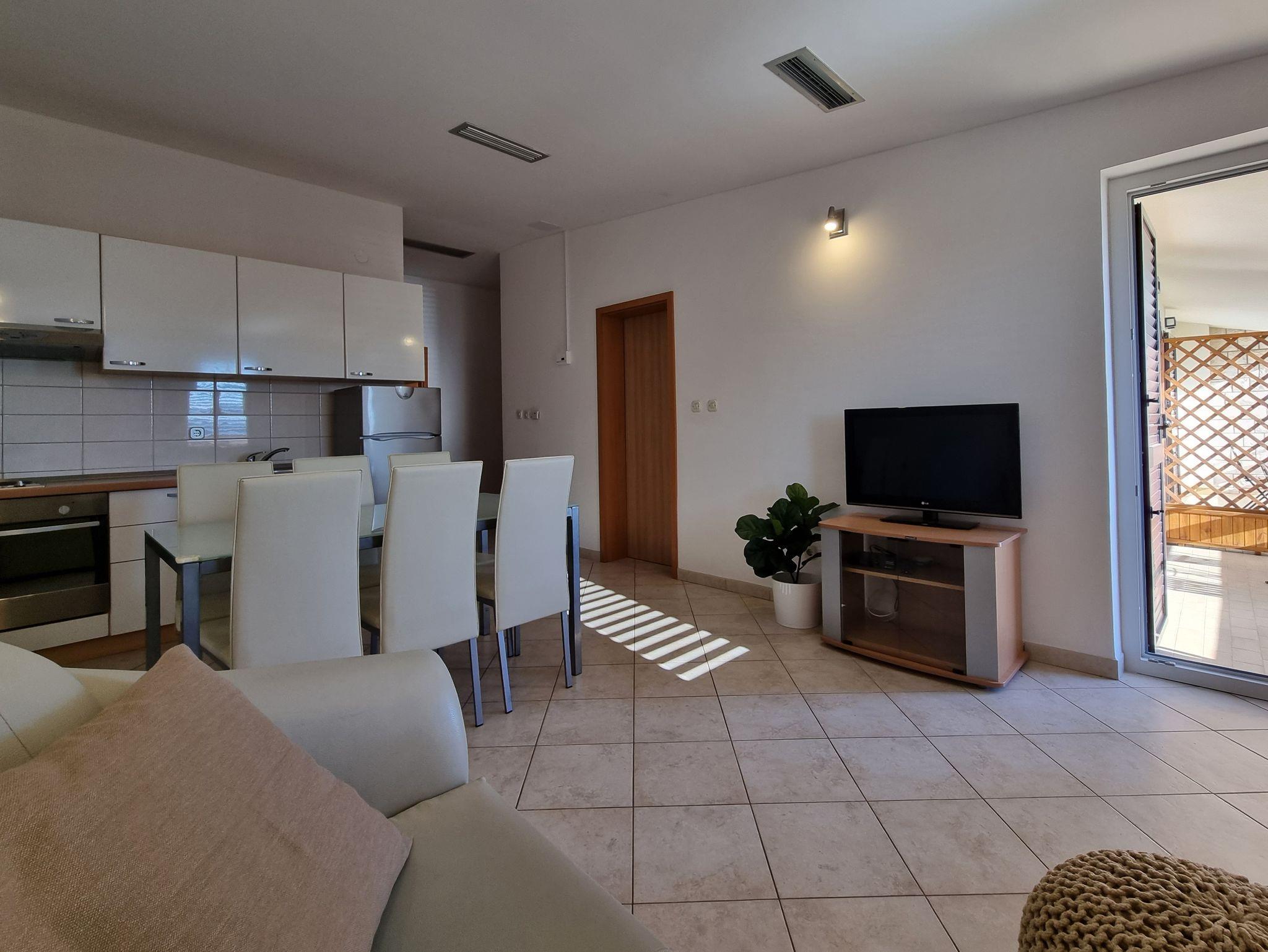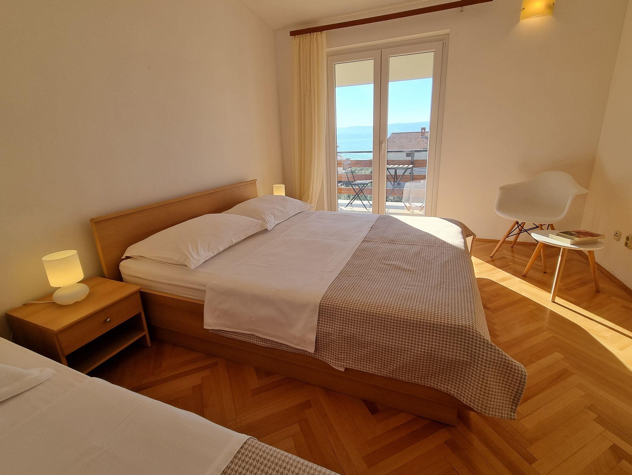 Ferienwohnung bietet Platz für 6 Gäste. Die Betten sind in Schlafzimmern, die es 2 gibt, innerhalb einer Gesamtfläche von 46m2, angeordnet. Die Gäste haben einen eigenen Balkon zur Verfügung, auf der sie in warmen Sommernächten genießen können. Das Apartment bietet Meerblick. Es ist erlaubt, Speisen auf dem Gemeinschafts-Grill vorzubereiten. Die reservierte Unterkunftseinheit verfügt über einen gemeinsame Terrasse. IM PREIS INBEGRIFFEN: Kurtaxe, Endreinigung, Klimatisierung, Parkplatz, Internet. VERBINDLICHE ZUSÄTZLICHE KOSTEN: Aufzahlung für Kurzaufenthalte (prozentualer Zuschlag pro Nächtigungsanzahl: 30% - 1, 20% - 2, 10% - 3). Die Verfügbarkeit zusätzlicher Dienstleistungen in Ihrem reservierten Termin und die Preise derselben (falls nicht aufgeführt) müssen im Voraus überprüft werden. Zusätzliche Dienstleistungen die in der Zahlungsaufforderung nicht aufgeführt sind werden direkt beim Vermieter bezahlt, angenommen der Gast nutzt auch diese.
