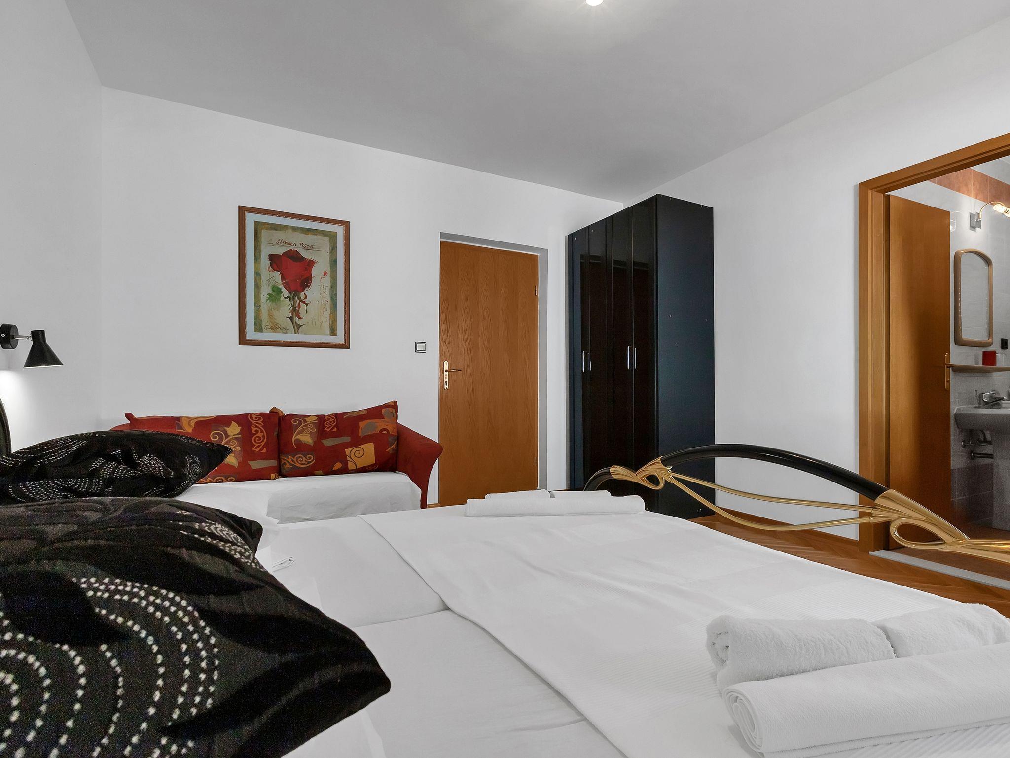 Zimmer bietet Platz für 3 Gäste. Die Betten sind in Schlafzimmern, die es 1 gibt, innerhalb einer Gesamtfläche von 19m2, angeordnet. Die Gäste haben einen eigenen Balkon zur Verfügung, auf der sie in warmen Sommernächten genießen können. In der Unterkunftseinheit besteht die Möglichkeit des Mitbringens von Haustieren gegen Aufpreis. Die reservierte Unterkunftseinheit ist ein Zimmer mit eigenem Badezimmer ohne die Möglichkeit der Nutzung einer Küche. IM PREIS INBEGRIFFEN: Kurtaxe, Endreinigung, Klimatisierung, Parkplatz, Internet, Bügeleisen, Bügelbrett, Föhn. VERBINDLICHE ZUSÄTZLICHE KOSTEN: Aufzahlung für Kurzaufenthalte (prozentualer Zuschlag pro Nächtigungsanzahl: 30% - 1, 20% - 2, 10% - 3). UNVERBINDLICHE ZUSÄTZLICHE KOSTEN: Haustiere (10,00 € pro Nacht). Die Verfügbarkeit zusätzlicher Dienstleistungen in Ihrem reservierten Termin und die Preise derselben (falls nicht aufgeführt) müssen im Voraus überprüft werden. Zusätzliche Dienstleistungen die in der Zahlungsaufforderung nicht aufgeführt sind werden direkt beim Vermieter bezahlt, angenommen der Gast nutzt auch diese. Ermäßigung auf den Grundpreis: Gratistag 14=13 (bei einem Aufenthalt von 14 Tagen oder mehr erhalten Sie einen Gratistag für den Aufenthalt bis 31.12.26).