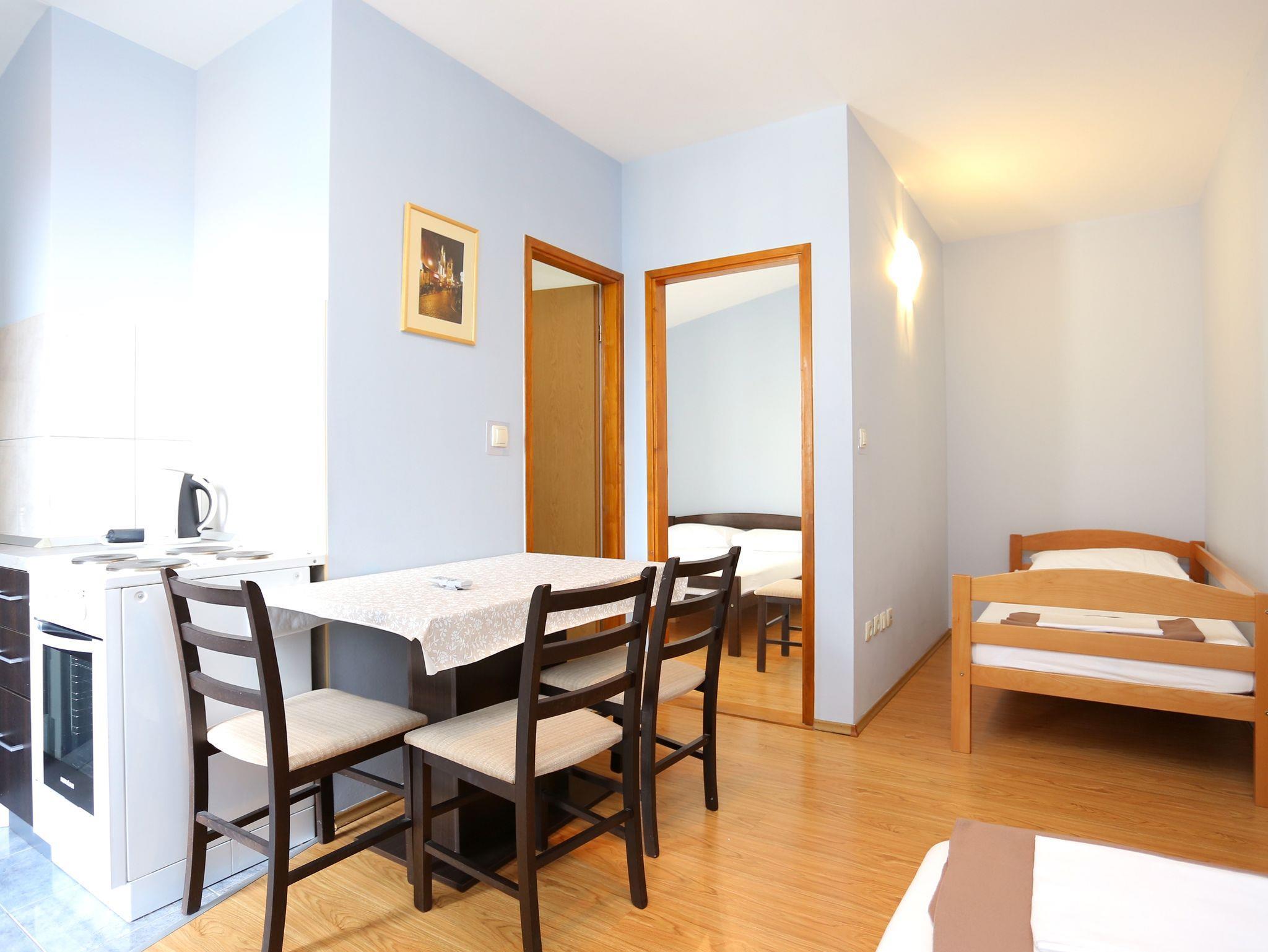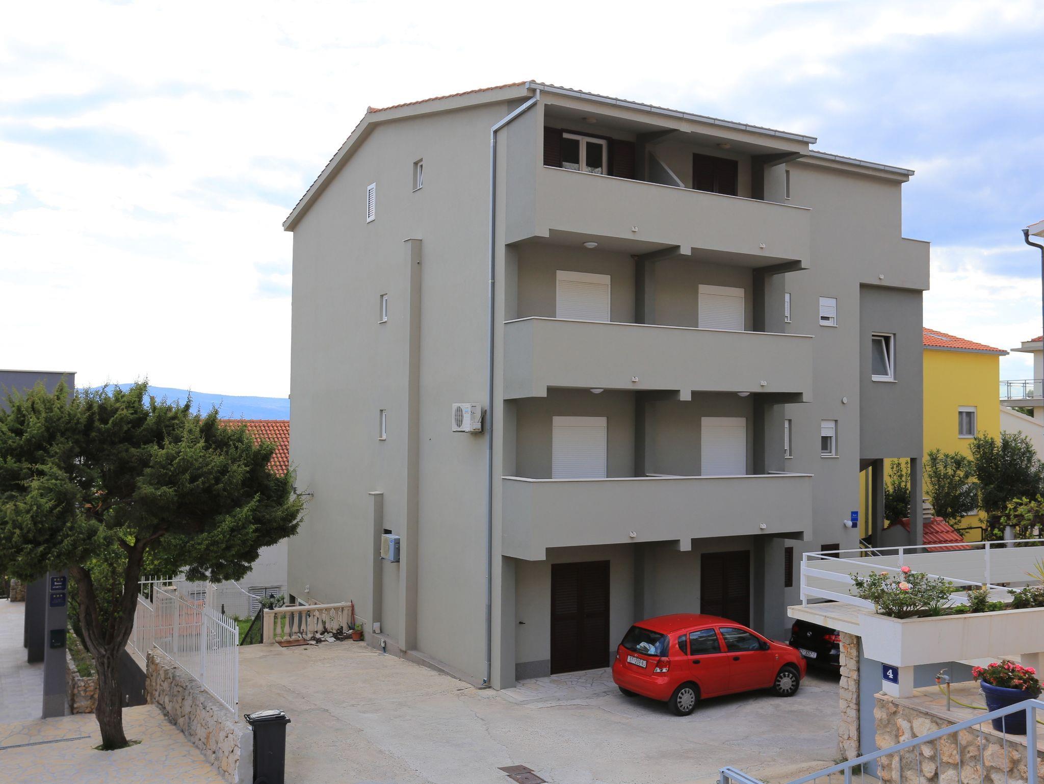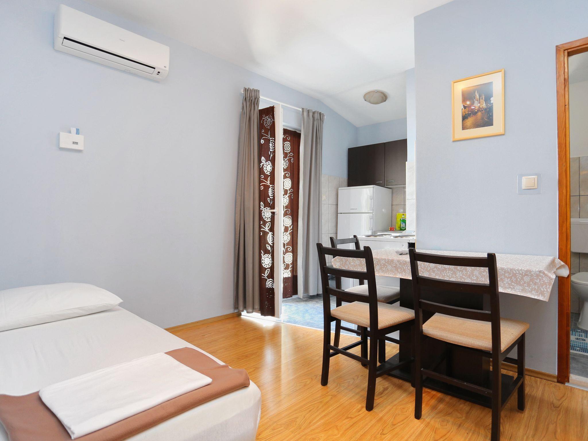 Ferienwohnung bietet Platz für 4 Gäste. Die Betten sind in Schlafzimmern, die es 1 gibt, und in Esszimmer, innerhalb einer Gesamtfläche von 28m2, angeordnet. Die Gäste haben eine eigene Terrasse zur Verfügung, auf der sie in warmen Sommernächten genießen können. Das Apartment bietet Meerblick. Es ist erlaubt, Speisen auf dem Gemeinschafts-Grill vorzubereiten. IM PREIS INBEGRIFFEN: Kurtaxe, Endreinigung, Klimatisierung, Parkplatz, Internet, Bügeleisen, Bügelbrett, Föhn. VERBINDLICHE ZUSÄTZLICHE KOSTEN: Aufzahlung für Kurzaufenthalte (prozentualer Zuschlag pro Nächtigungsanzahl: 30% - 1, 20% - 2, 10% - 3). Die Verfügbarkeit zusätzlicher Dienstleistungen in Ihrem reservierten Termin und die Preise derselben (falls nicht aufgeführt) müssen im Voraus überprüft werden. Zusätzliche Dienstleistungen die in der Zahlungsaufforderung nicht aufgeführt sind werden direkt beim Vermieter bezahlt, angenommen der Gast nutzt auch diese. Ermäßigung auf den Grundpreis: Gratistag 14=13 (bei einem Aufenthalt von 14 Tagen oder mehr erhalten Sie einen Gratistag für den Aufenthalt bis 31.12.26).