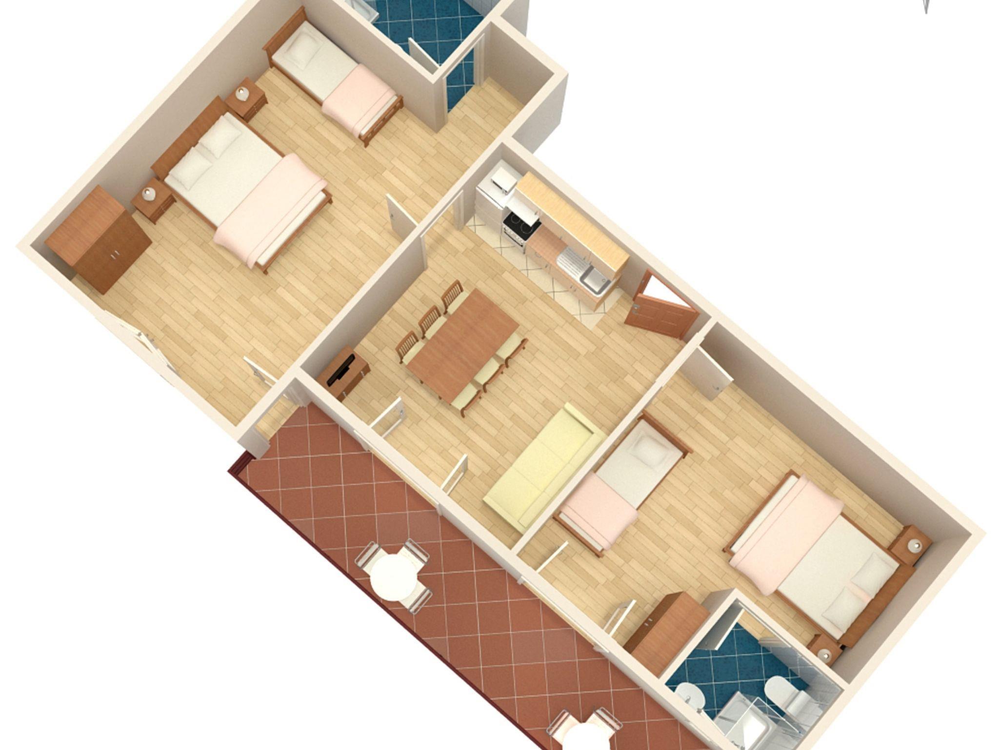 Ferienwohnung bietet Platz für 7 Gäste. Die Betten sind in Schlafzimmern, die es 2 gibt, innerhalb einer Gesamtfläche von 55m2, angeordnet. Die Gäste haben eine eigene Terrasse zur Verfügung, auf der sie in warmen Sommernächten genießen können. Das Apartment bietet Meerblick. Es ist erlaubt, Speisen auf dem Gemeinschafts-Grill vorzubereiten. IM PREIS INBEGRIFFEN: Kurtaxe, Endreinigung, Klimatisierung, Parkplatz, Internet. VERBINDLICHE ZUSÄTZLICHE KOSTEN: Aufzahlung für Kurzaufenthalte (prozentualer Zuschlag pro Nächtigungsanzahl: 30% - 1, 20% - 2, 10% - 3). Die Verfügbarkeit zusätzlicher Dienstleistungen in Ihrem reservierten Termin und die Preise derselben (falls nicht aufgeführt) müssen im Voraus überprüft werden. Zusätzliche Dienstleistungen die in der Zahlungsaufforderung nicht aufgeführt sind werden direkt beim Vermieter bezahlt, angenommen der Gast nutzt auch diese.
