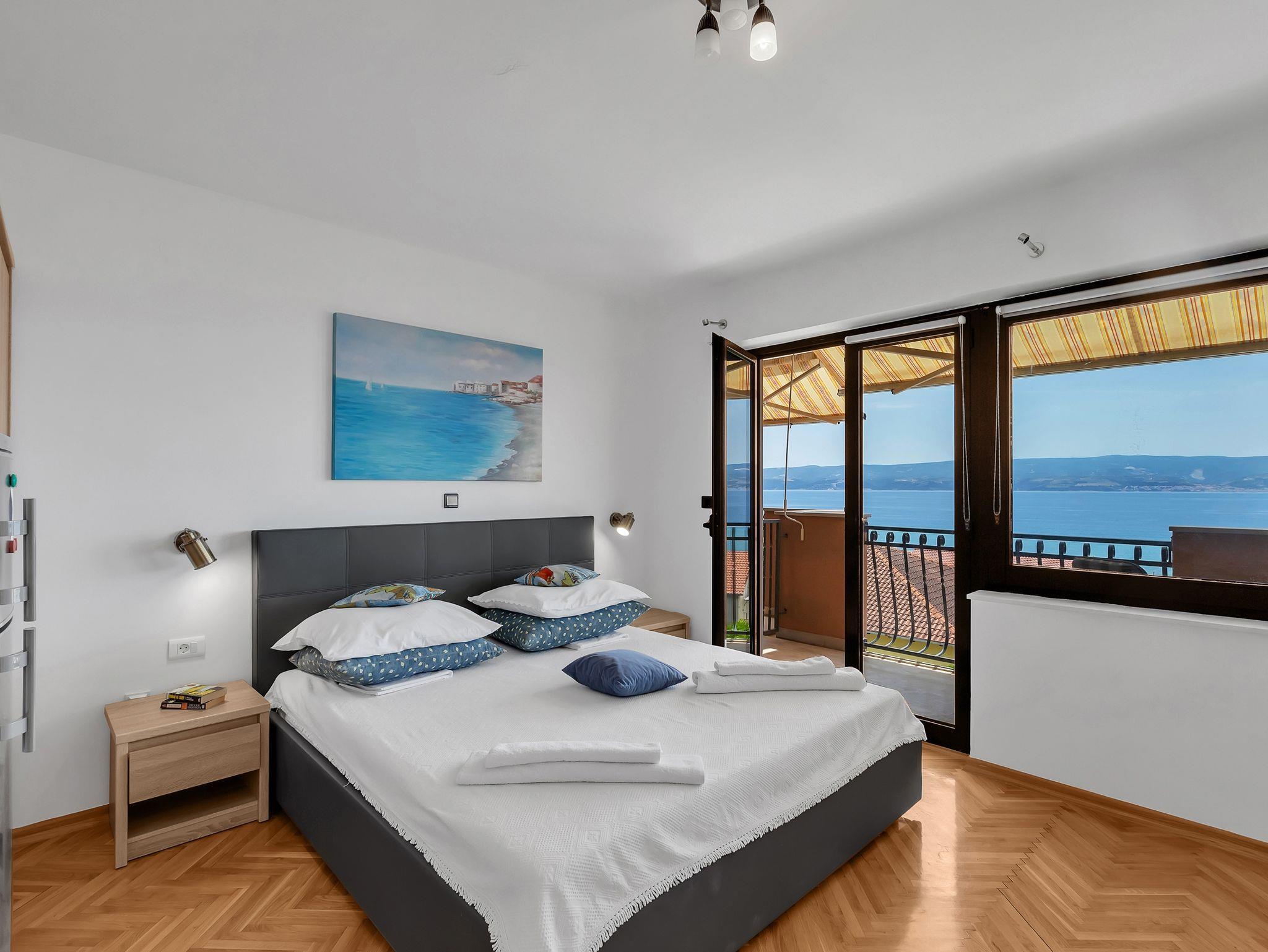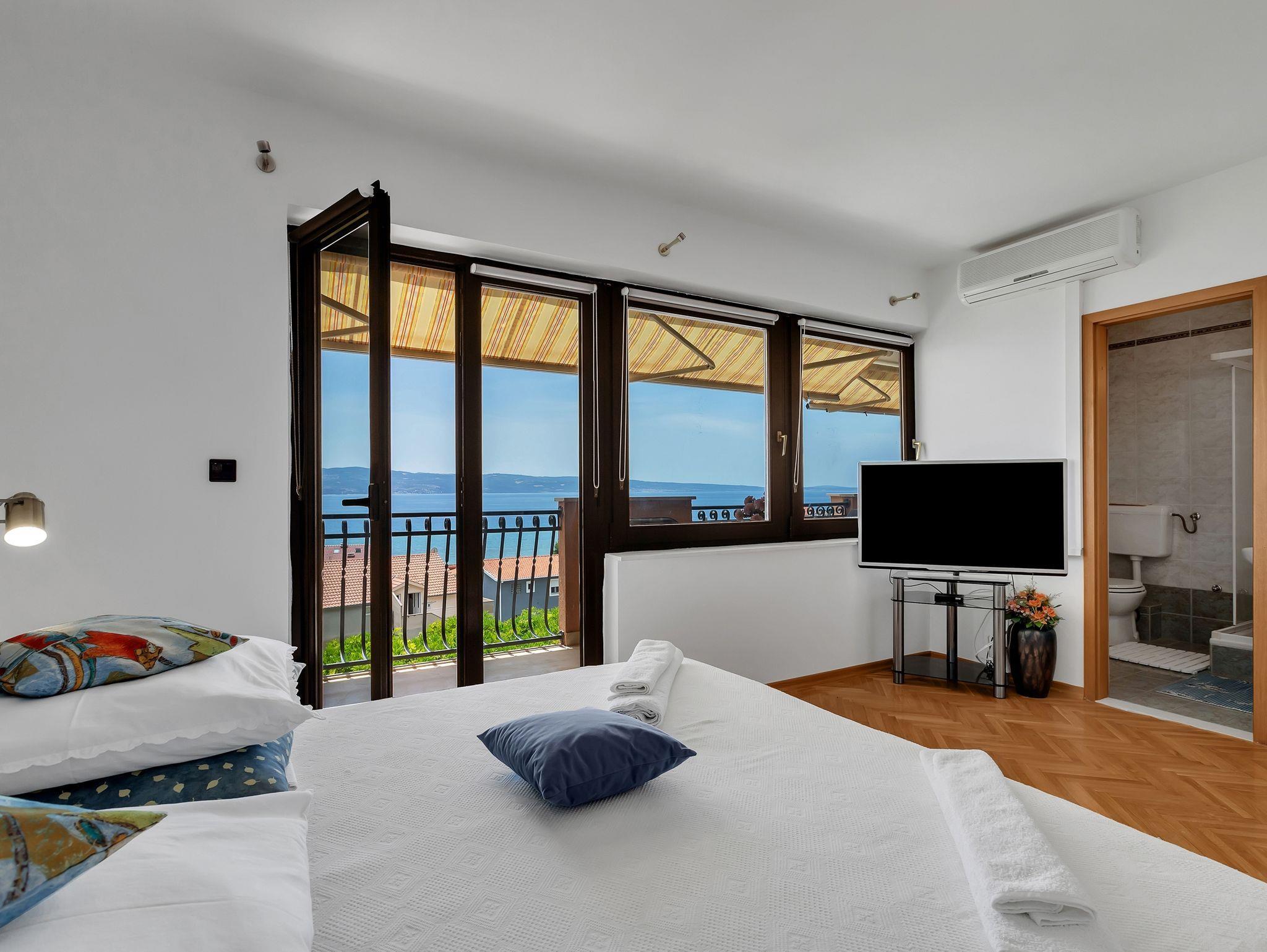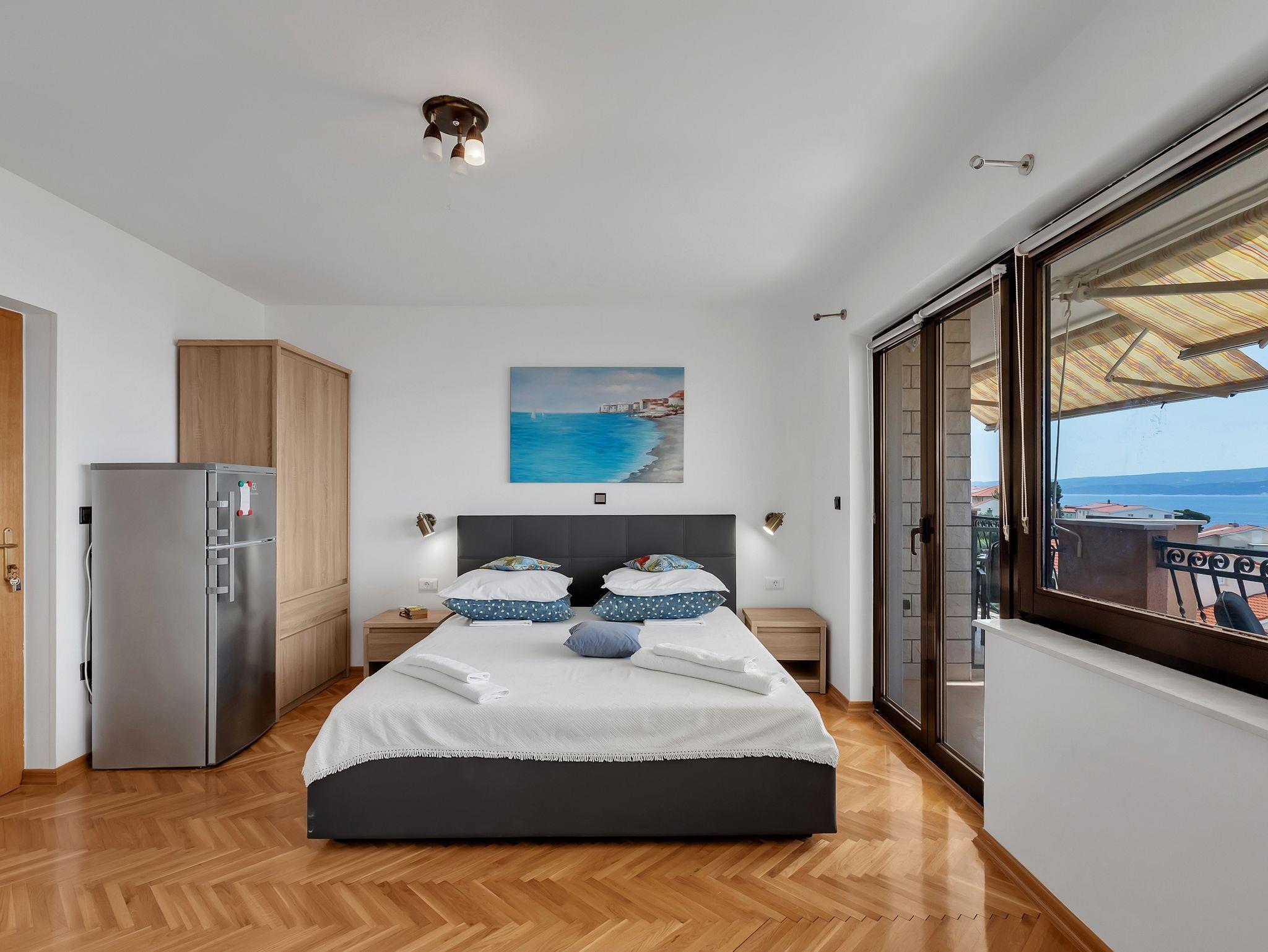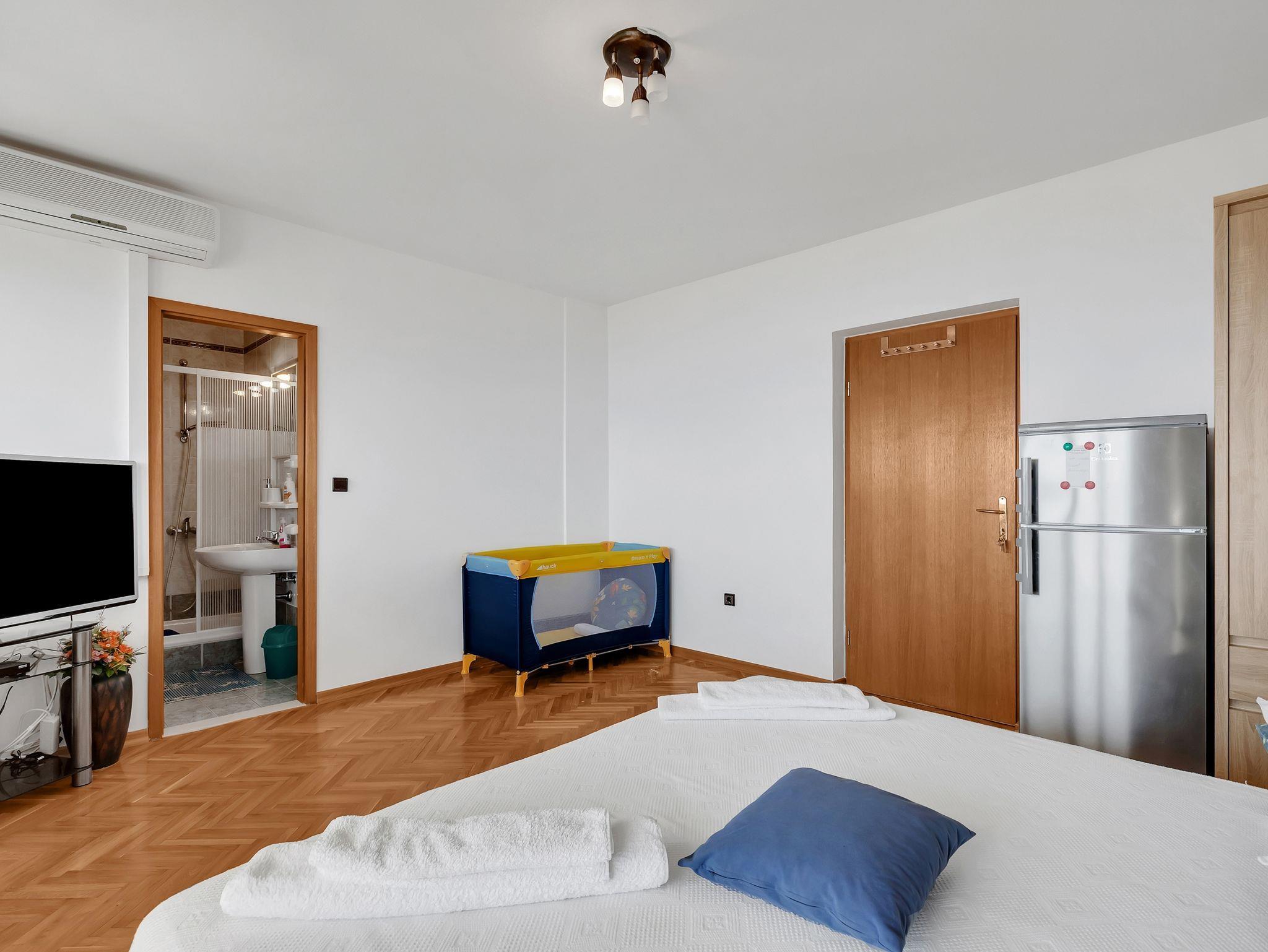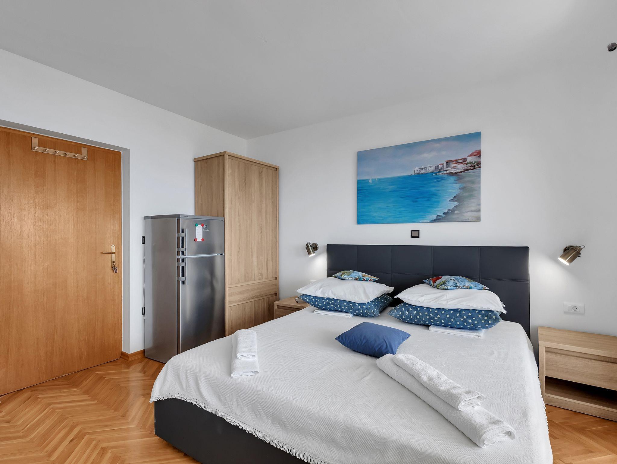 Zimmer bietet Platz für 4 Gäste. Die Betten sind in Schlafzimmern, die es 1 gibt, innerhalb einer Gesamtfläche von 20m2, angeordnet. Die Gäste haben einen eigenen Balkon zur Verfügung, auf der sie in warmen Sommernächten genießen können. Das Zimmer bietet Meerblick. In der Unterkunftseinheit besteht die Möglichkeit des Mitbringens von Haustieren gegen Aufpreis. Die reservierte Unterkunftseinheit ist ein Zimmer mit eigenem Badezimmer ohne die Möglichkeit der Nutzung einer Küche. IM PREIS INBEGRIFFEN: Kurtaxe, Endreinigung, Klimatisierung, Parkplatz, Internet, Bügeleisen, Bügelbrett, Föhn. VERBINDLICHE ZUSÄTZLICHE KOSTEN: Aufzahlung für Kurzaufenthalte (prozentualer Zuschlag pro Nächtigungsanzahl: 30% - 1, 20% - 2, 10% - 3). UNVERBINDLICHE ZUSÄTZLICHE KOSTEN: Haustiere (10,00 € pro Nacht). Die Verfügbarkeit zusätzlicher Dienstleistungen in Ihrem reservierten Termin und die Preise derselben (falls nicht aufgeführt) müssen im Voraus überprüft werden. Zusätzliche Dienstleistungen die in der Zahlungsaufforderung nicht aufgeführt sind werden direkt beim Vermieter bezahlt, angenommen der Gast nutzt auch diese. Ermäßigung auf den Grundpreis: Gratistag 14=13 (bei einem Aufenthalt von 14 Tagen oder mehr erhalten Sie einen Gratistag für den Aufenthalt bis 31.12.26).