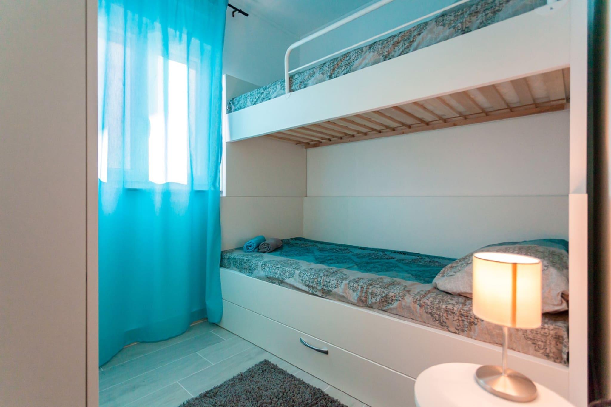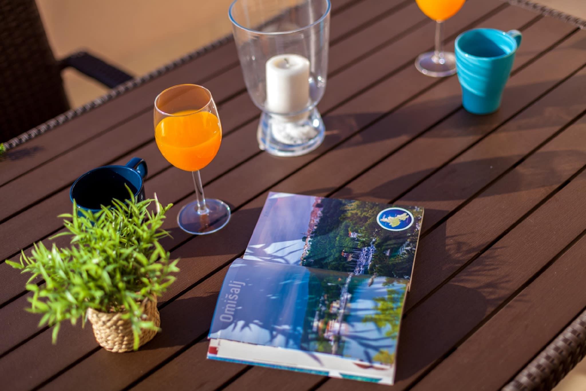 In der 1. Etage: (Wohnzimmer(Doppelschlafcouch, TV(Flatscreen)), Küche(Esstisch, Wasserkocher, Toaster, Kochherd, Kaffeemaschine, Mikrowelle, Kühl-/Gefrierkombination), Schlafzimmer(Doppelbett), Schlafzimmer(Etagenbett), Badezimmer(Dusche, Waschbecken, Toilette), Terrasse(alleinige Nutzung, überdacht, umzäunt)) Klimaanlage, Innenhof, Parkplatz