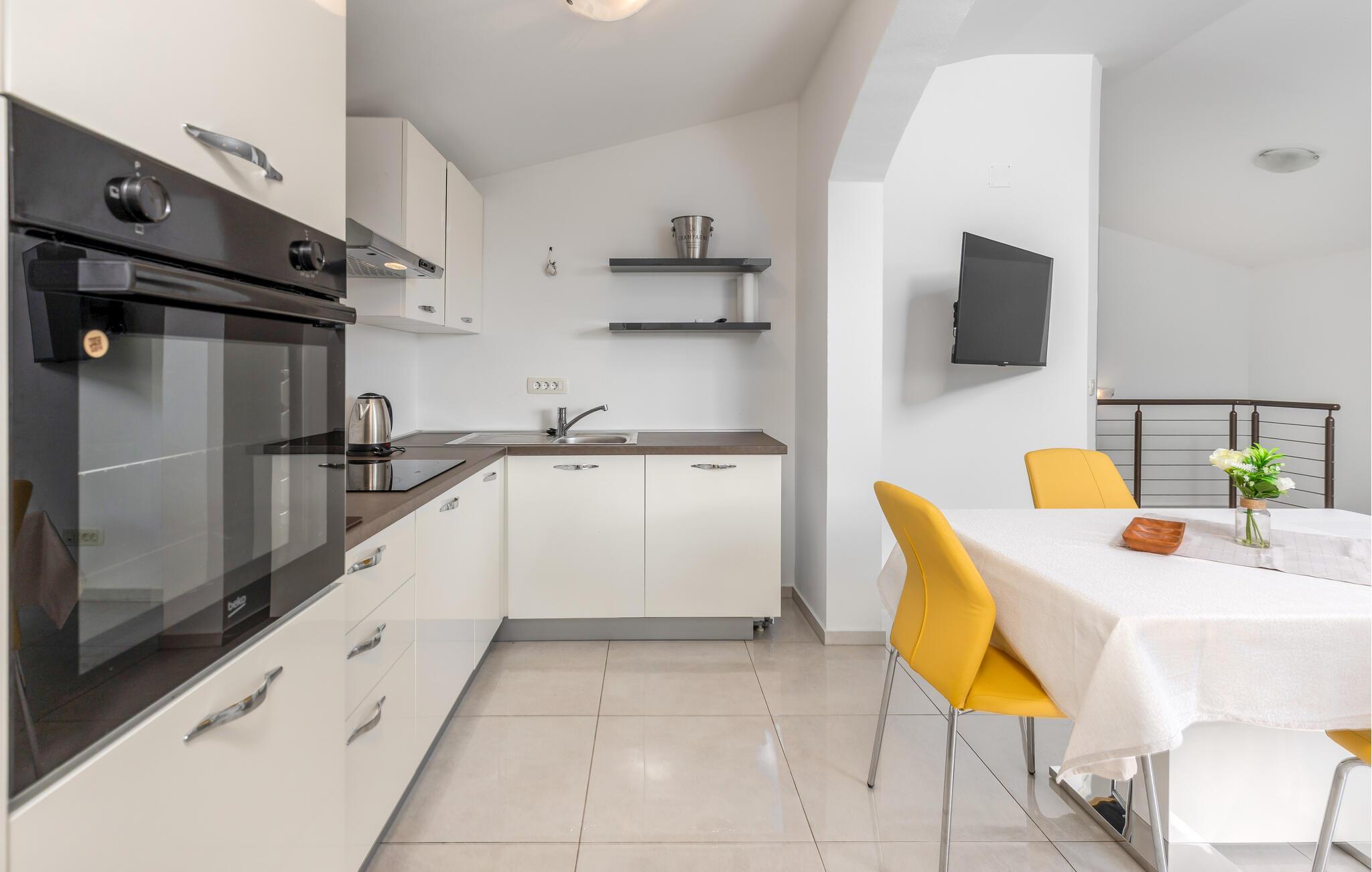 Eingebettet in die grünen Hügel südlich von Dobrec lädt Sie dieses komfortable Ferienhaus zu erholsamen Tagen ein und verwöhnt Sie mit einem bezaubernden Ausblick bis zum Meer. Bereiten Sie in der offenen Küche mediterrane Gerichte zu und lassen Sie die frische, wohltuende Atmosphäre bei entspannten Mahlzeiten auf sich wirken. Nach einem langen Tag können Sie einen Film streamen oder auf dem gemütlichen Sofa bei einem guten Buch entspannen.