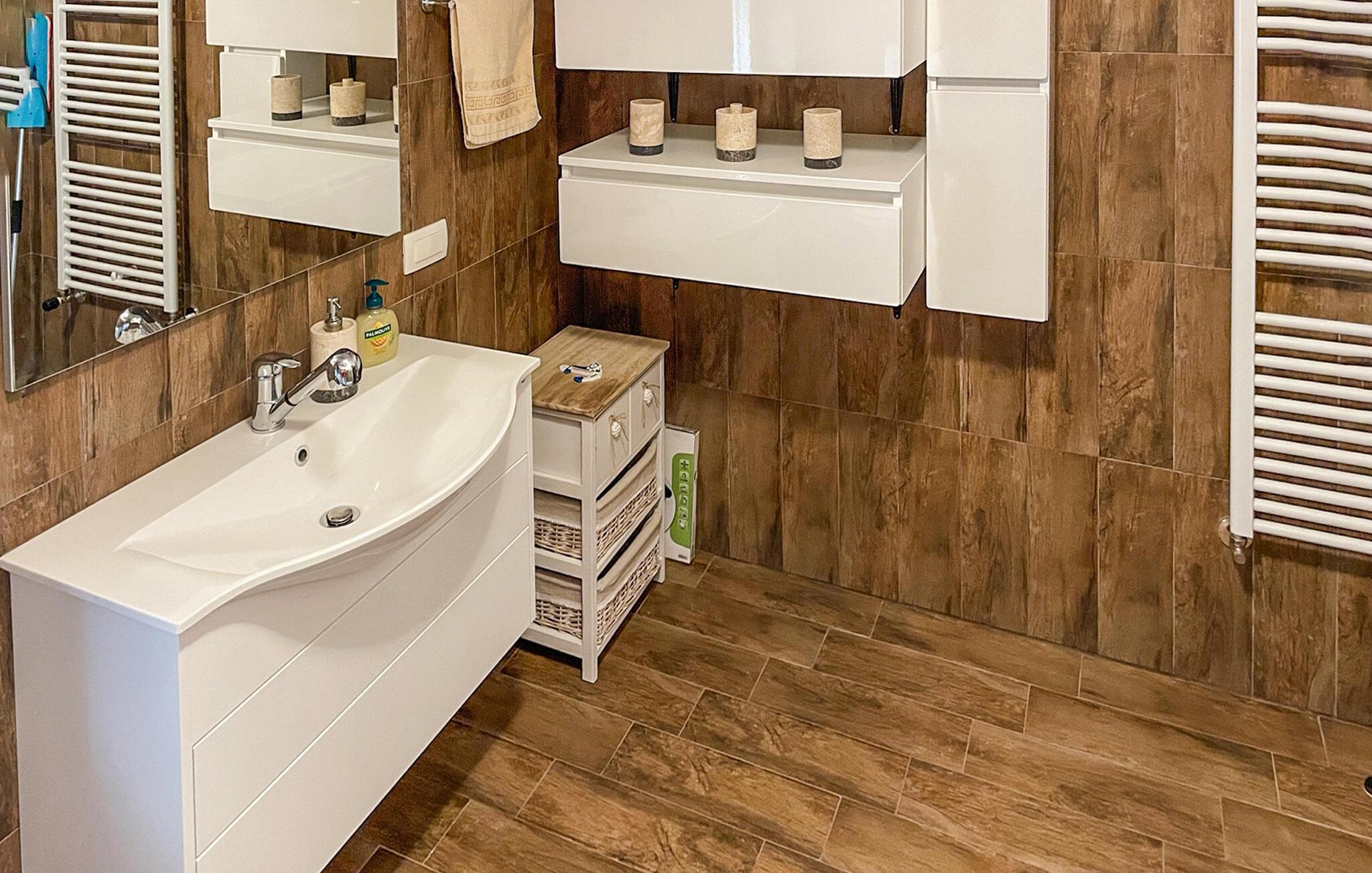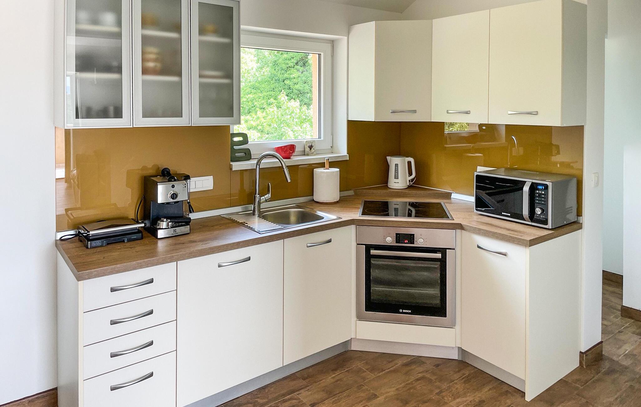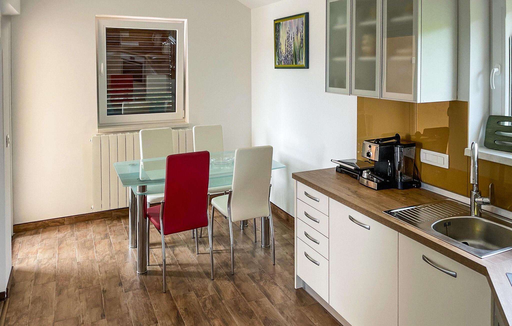 Im Inneren Ihrer Ferienwohnung nahe Rijeka erwartet Sie ein modern eingerichtetes Wohnzimmer, das mit einem bequemen Sofa und einem Fernseher ausgestattet ist. Entspannen Sie hier nach einem Tag voller Erkundungen in der Region und nutzen Sie Ihre Küche, um köstliche Mahlzeiten zuzubereiten. Probieren Sie lokale Spezialitäten aus und genießen Sie diese im stilvollen Essbereich.