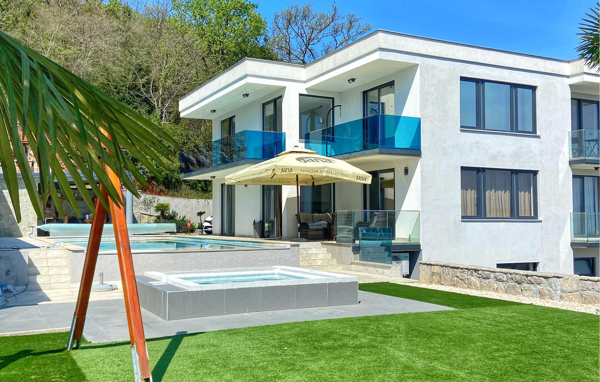Verbringen Sie einen zauberhaften Urlaub in diesem neuen, modernen Haus auf einem Hügel oberhalb der Riviera von Opatija.