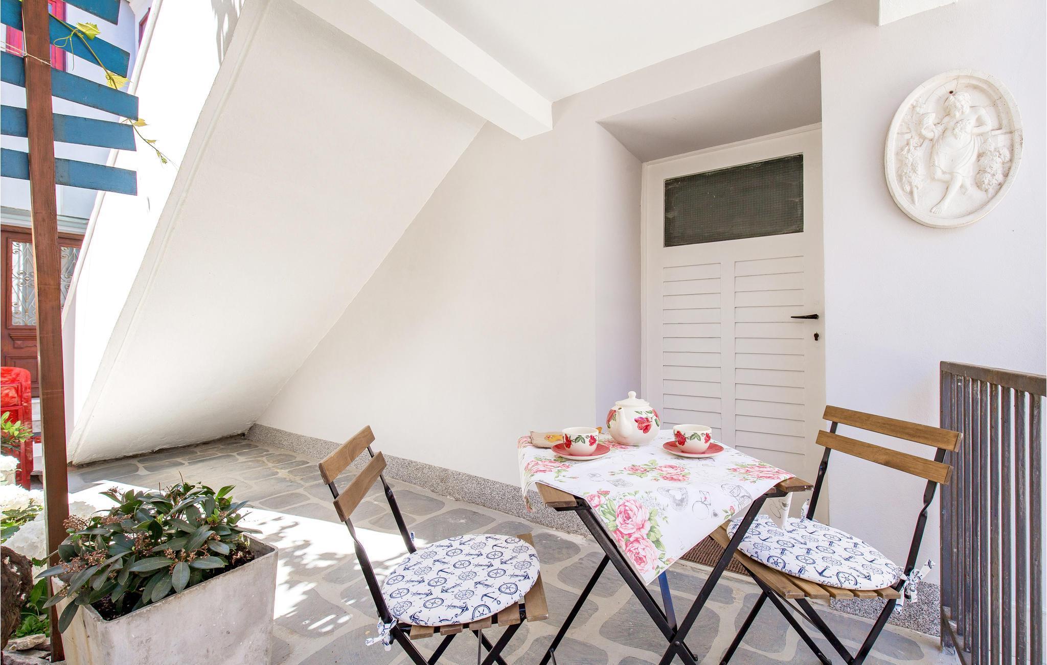 Es bietet Ruhe und Komfort mit einem charmanten Interieur, das von den Reisen des Eigentümers um die Welt inspiriert wurde. Im Erdgeschoss, am Fuße der Treppe, die zum Haus führt, befindet sich eine kleine Terrasse, und im Obergeschoss befindet sich ein Wohnzimmer mit Küche und Essbereich sowie eine geschlossene Terrasse am Eingang des Hauses. Die Terrasse ist von Weinreben umgeben, die Schatten für einen angenehmen Morgenkaffee bieten. Die Schlafzimmer befinden sich im zweiten Stock.