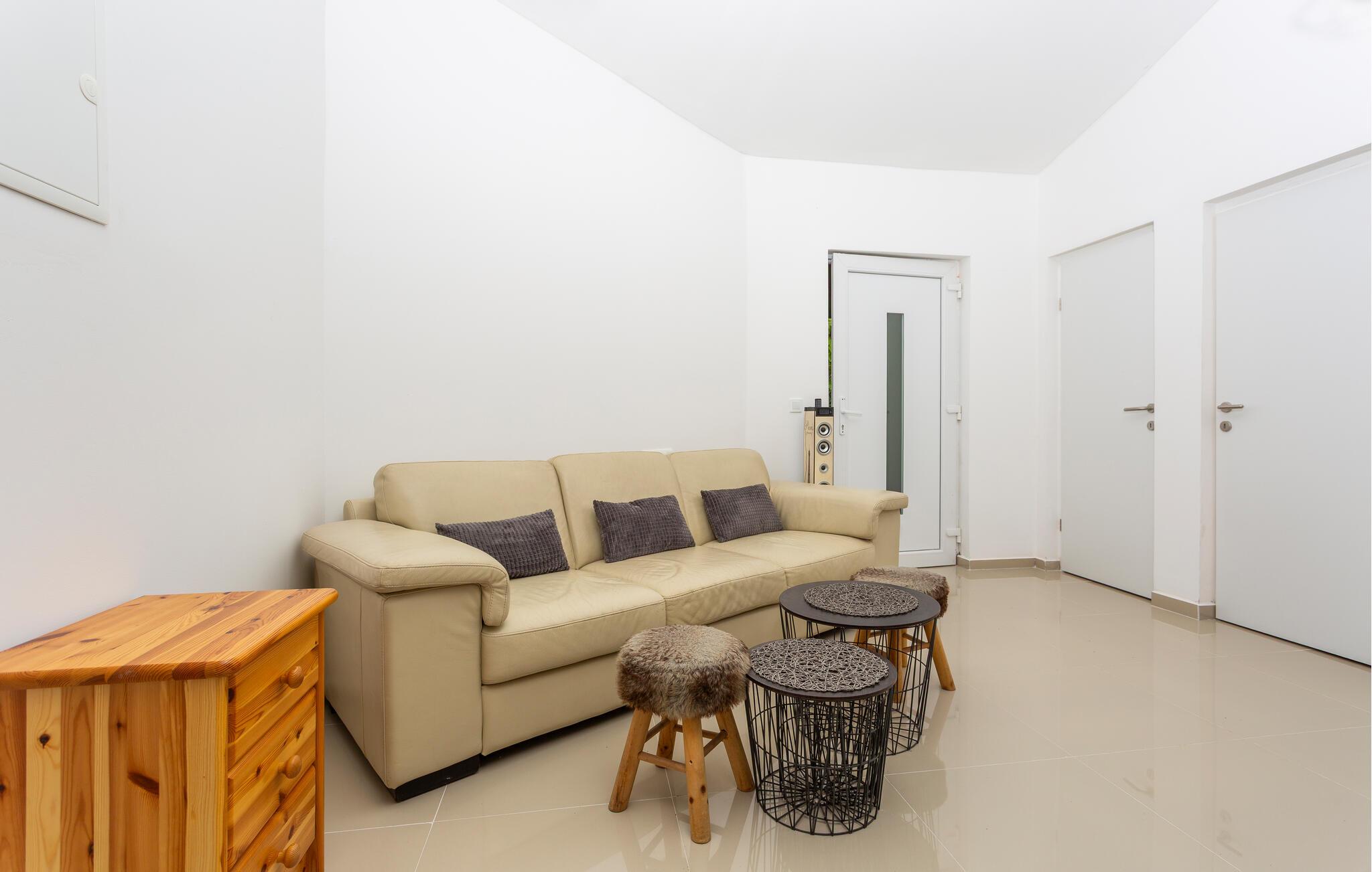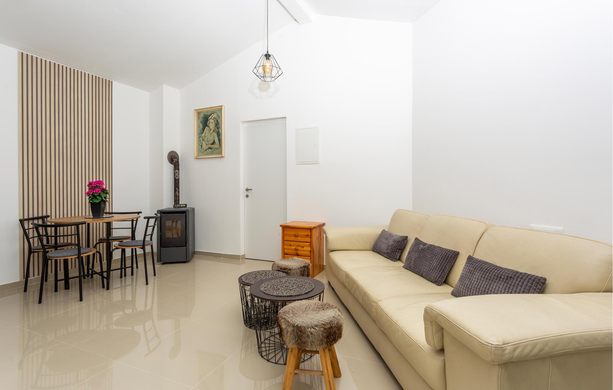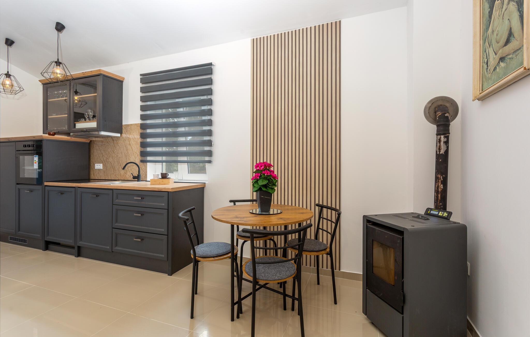 Treten Sie in den hellen Wohnbereich und lassen Sie sich von der modernen, klaren Einrichtung empfangen. Machen Sie es sich auf dem bequemen Sofa gemütlich oder genießen Sie ein gemeinsames Abendessen am runden Esstisch. Bereiten Sie in der eleganten Küche mit Holzarbeitsfläche und modernen Geräten Ihre Mahlzeiten zu.