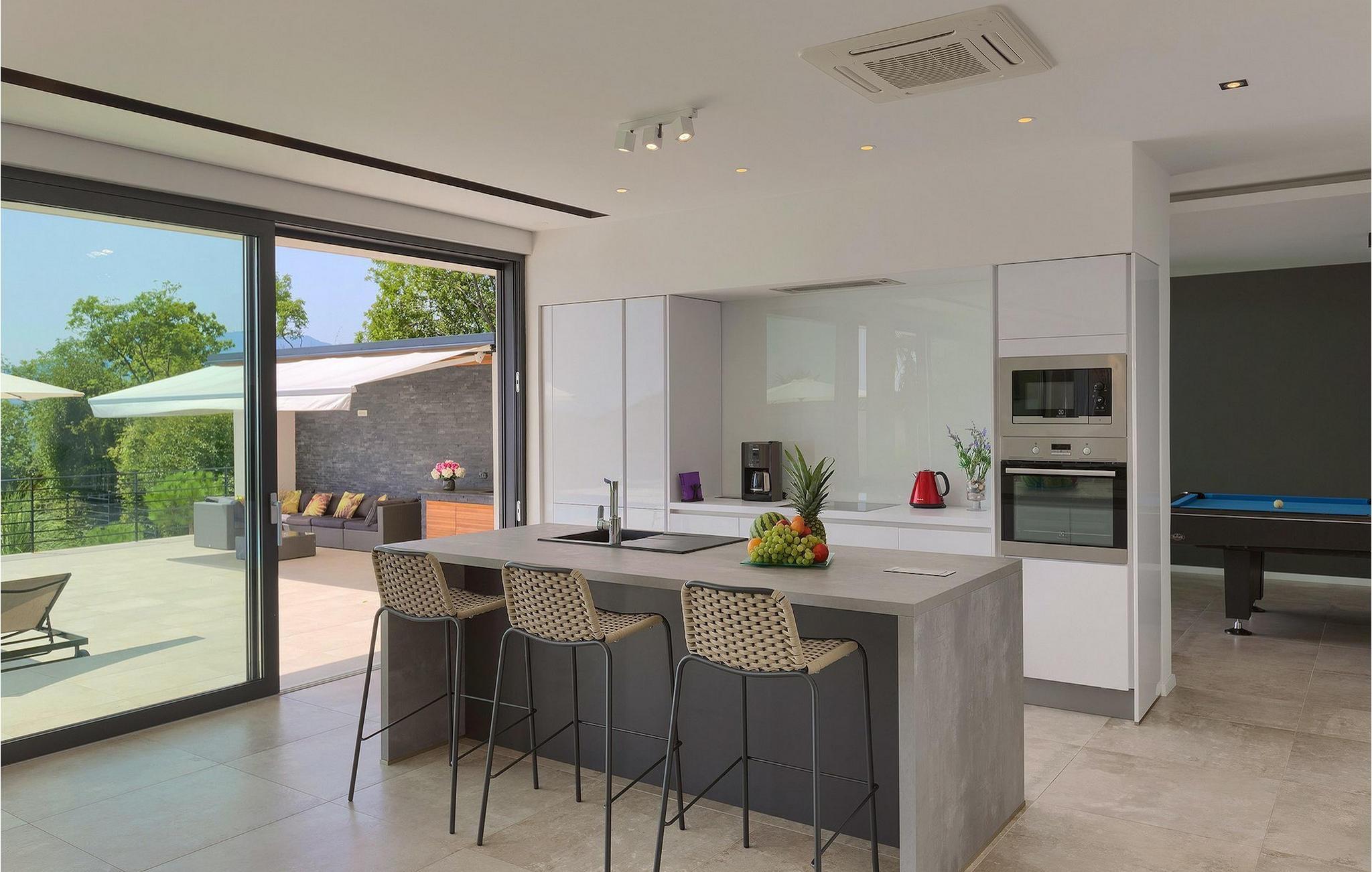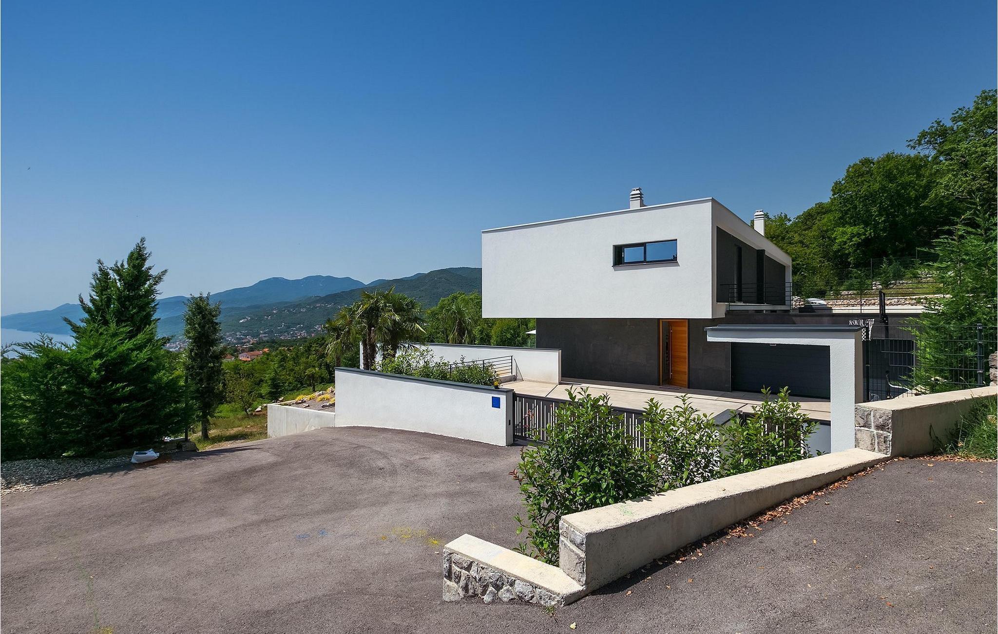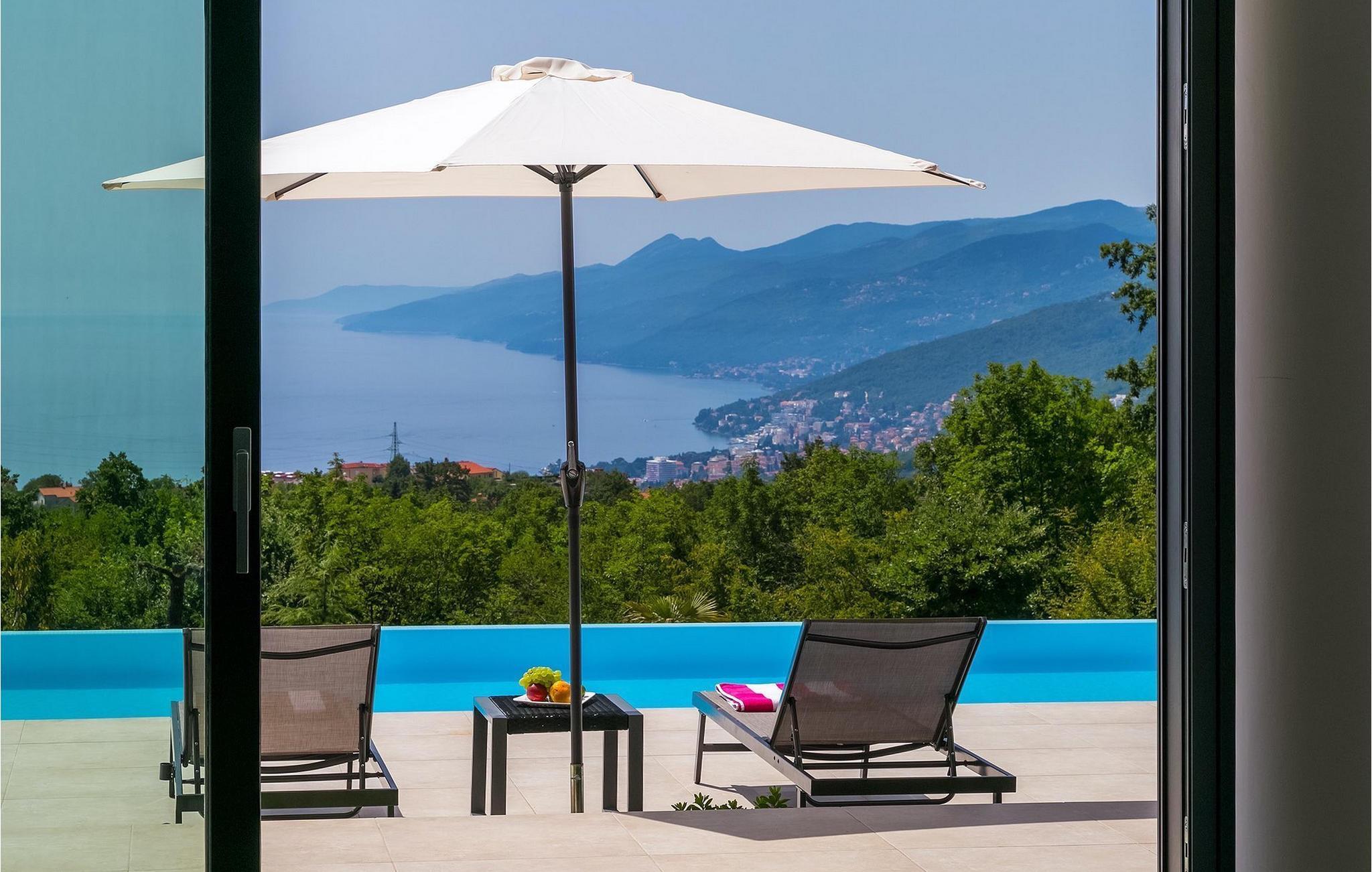 Diese wunderschöne Villa wird Sie mit ihrem modernen Design und einem fantastischen Panoramablick auf Opatija und die Kvarner-Bucht in Erstaunen versetzen. Die Villa befindet sich auf einem 1400 m2 großen Grundstück und verfügt über 4 Schlafzimmer, die sich alle im Obergeschoss befinden und über ein eigenes Badezimmer, TV und Klimaanlage verfügen. Dies macht sie zu einem perfekten Ferienhaus mit optimalem Komfort für 8 Personen. Das Erdgeschoss ist ein sehr stilvoll eingerichteter offen konzipierter Raum, der aus einem Ess- und Wohnbereich und einer geräumigen, völlig ausgestatteten Küche besteht. Hier gibt es auch einen separaten Raum mit Jacuzzi, Dusche und Sauna, sowie einen Raum mit einem Billardtisch für mehr Spaß. Das Wohnzimmer ist direkt mit der Terrasse verbunden, von der Sie die traumhafte Aussicht vom privaten Pool oder vom gemütlichen Loungebereich aus genießen können. Ein Essbereich im Freien mit einem Holzkohlegrill steht Ihnen ebenfalls zur Verfügung. Diese funktionale Villa bietet alles, was Sie für einen erholsamen und unterhaltsamen Urlaub benötigen, während ihre Lage Ihnen ermöglicht, alle Schönheiten der Kvarner-Region zu erkunden.Diese wunderschöne Villa befindet sich in der Nähe des kleinen Städtchen Kastav, nur ca. 6 km von Opatija und 10 km von Rijeka entfernt. Rijeka ist bekannt als der größte Hafen Kroatiens, aber auch für zahlreiche Restaurants, Cafés, Clubs, Bars und Veranstaltungen. Erleben Sie die Stimmung der Stadt bei einem Spaziergang entlang dem Korzo, erkunden Sie die Altstadt und besuchen Sie die Wallfahrtskirche in Trsat auf einem Hügel über der Stadt. Sie sollten auf jeden Fall dem Karneval in Rijeka, dem fünftgrößten Karneval weltweit, einen Besuch abstatten! Der Flughafen Rijeka befindet sich auf der Insel Krk, nur eine kurze Autofahrt von der Villa. Machen Sie einen Spaziergang entlang der wunderschönen Küstenpromenade "Lungomare" und genießen Sie romantische Spaziergänge beim Sonnenuntergang in der Stadt Opatija - die Perle der Adria.