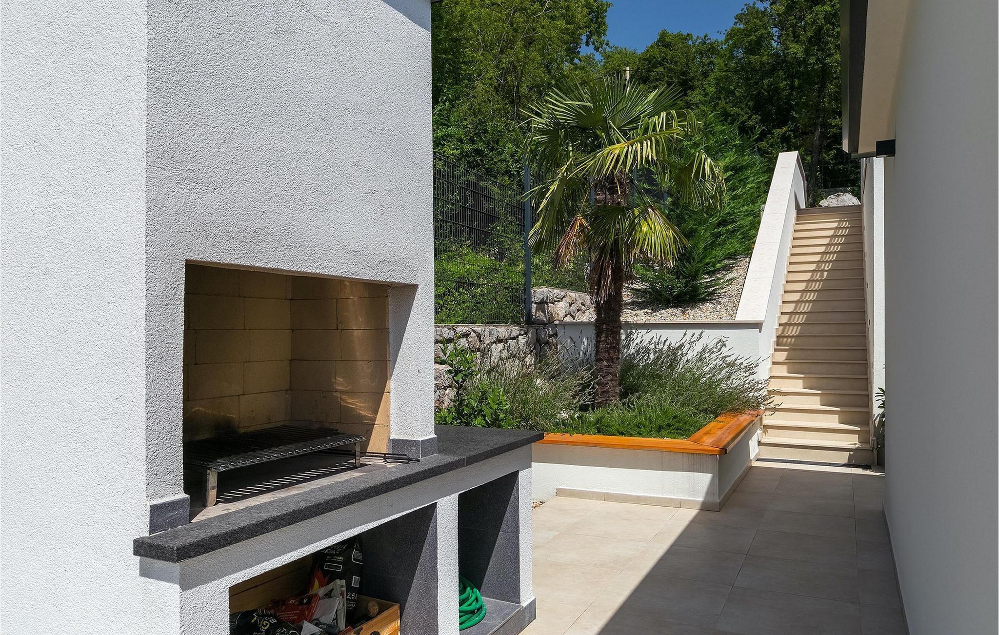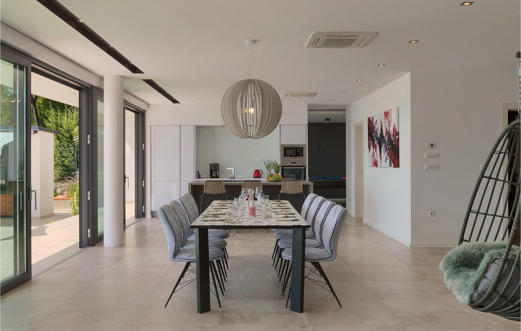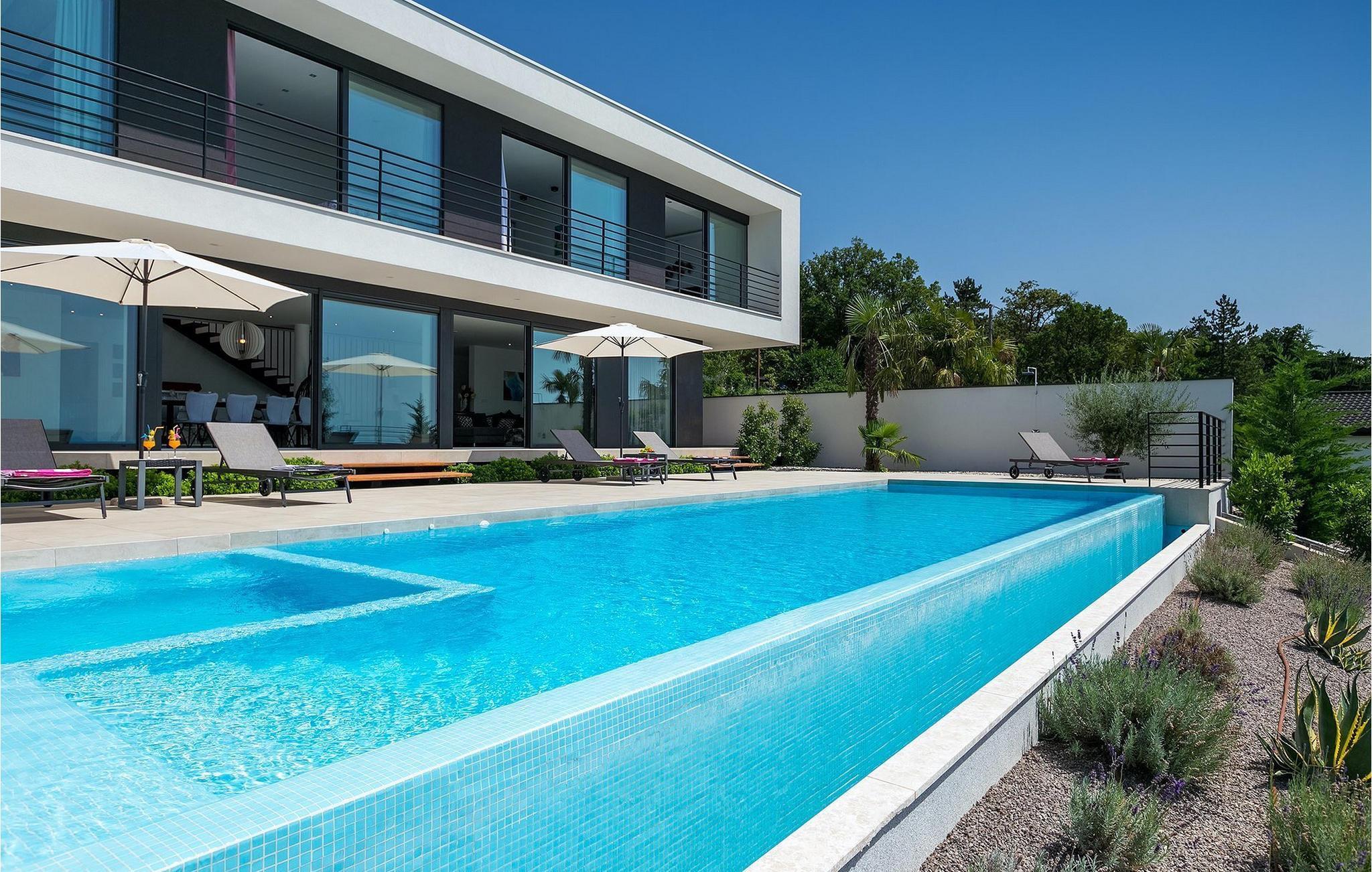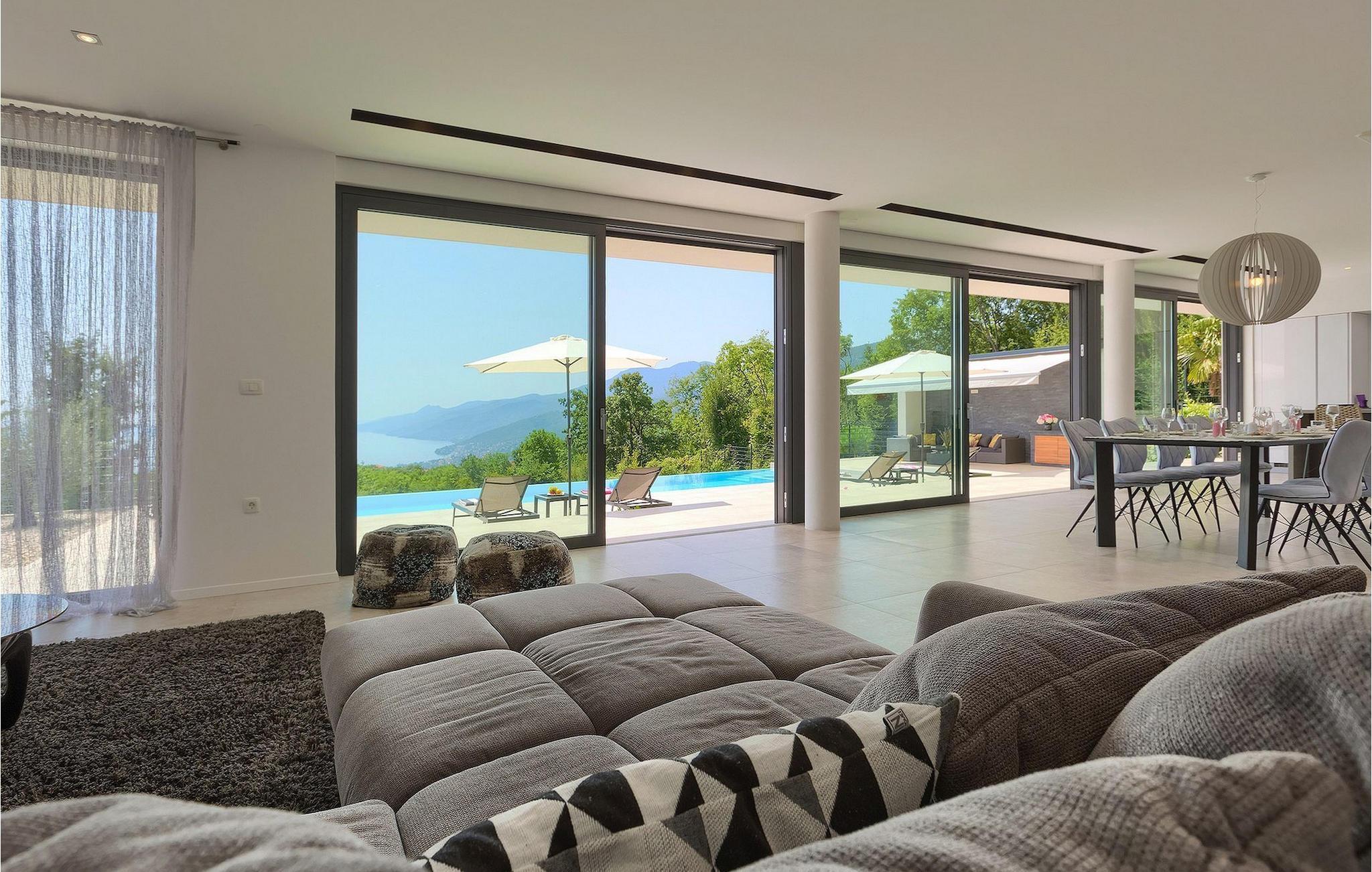 Diese wunderschöne Villa wird Sie mit ihrem modernen Design und einem fantastischen Panoramablick auf Opatija und die Kvarner-Bucht in Erstaunen versetzen. Die Villa befindet sich auf einem 1400 m2 großen Grundstück und verfügt über 4 Schlafzimmer, die sich alle im Obergeschoss befinden und über ein eigenes Badezimmer, TV und Klimaanlage verfügen. Dies macht sie zu einem perfekten Ferienhaus mit optimalem Komfort für 8 Personen. Das Erdgeschoss ist ein sehr stilvoll eingerichteter offen konzipierter Raum, der aus einem Ess- und Wohnbereich und einer geräumigen, völlig ausgestatteten Küche besteht. Hier gibt es auch einen separaten Raum mit Jacuzzi, Dusche und Sauna, sowie einen Raum mit einem Billardtisch für mehr Spaß. Das Wohnzimmer ist direkt mit der Terrasse verbunden, von der Sie die traumhafte Aussicht vom privaten Pool oder vom gemütlichen Loungebereich aus genießen können. Ein Essbereich im Freien mit einem Holzkohlegrill steht Ihnen ebenfalls zur Verfügung. Diese funktionale Villa bietet alles, was Sie für einen erholsamen und unterhaltsamen Urlaub benötigen, während ihre Lage Ihnen ermöglicht, alle Schönheiten der Kvarner-Region zu erkunden.Diese wunderschöne Villa befindet sich in der Nähe des kleinen Städtchen Kastav, nur ca. 6 km von Opatija und 10 km von Rijeka entfernt. Rijeka ist bekannt als der größte Hafen Kroatiens, aber auch für zahlreiche Restaurants, Cafés, Clubs, Bars und Veranstaltungen. Erleben Sie die Stimmung der Stadt bei einem Spaziergang entlang dem Korzo, erkunden Sie die Altstadt und besuchen Sie die Wallfahrtskirche in Trsat auf einem Hügel über der Stadt. Sie sollten auf jeden Fall dem Karneval in Rijeka, dem fünftgrößten Karneval weltweit, einen Besuch abstatten! Der Flughafen Rijeka befindet sich auf der Insel Krk, nur eine kurze Autofahrt von der Villa. Machen Sie einen Spaziergang entlang der wunderschönen Küstenpromenade "Lungomare" und genießen Sie romantische Spaziergänge beim Sonnenuntergang in der Stadt Opatija - die Perle der Adria.
