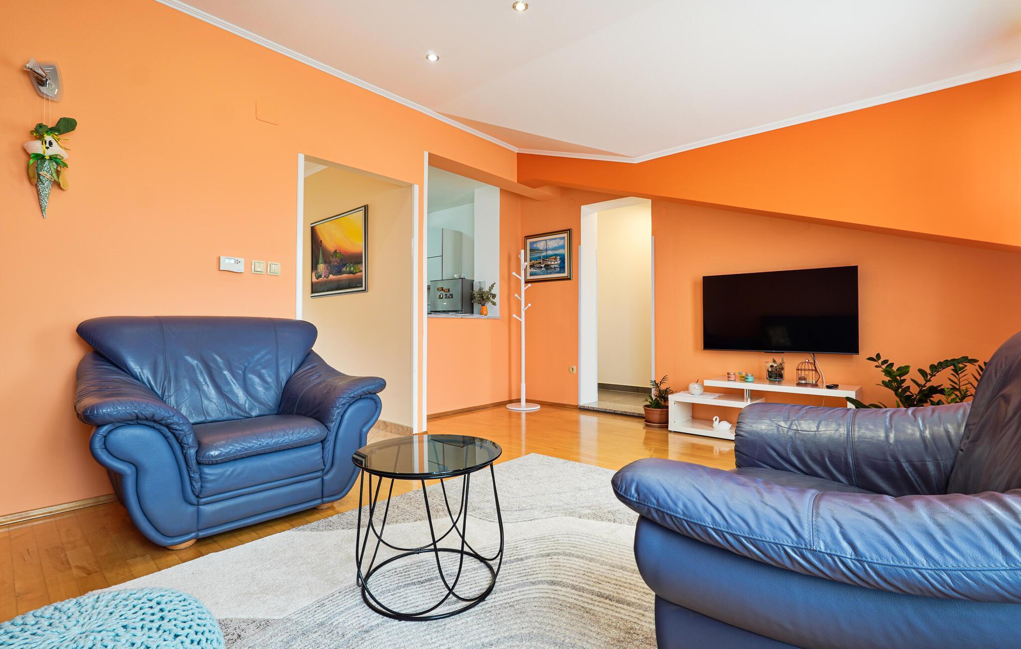 Diese behagliche Wohnung ist wie geschaffen für eine angenehme Auszeit vom Alltag. Ein farbenfroher Wohnraum mit großzügigen Sesseln, ein Fernseher und eine praktische Küche schaffen eine Atmosphäre, in der Sie schnell abschalten und sich einem entspanntem Urlaubsgefühl hingeben können. Egal ob Sie Musik hören, Ihre Lieblingsserie streamen oder einfach plaudern – hier gestalten Sie den Tag nach Ihren Wünschen.