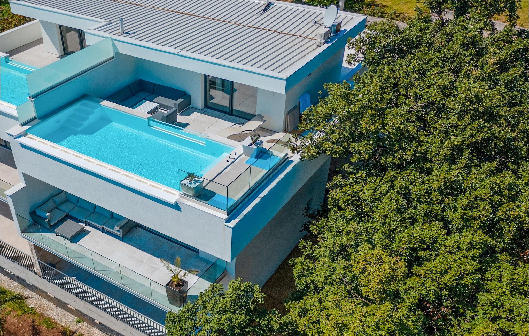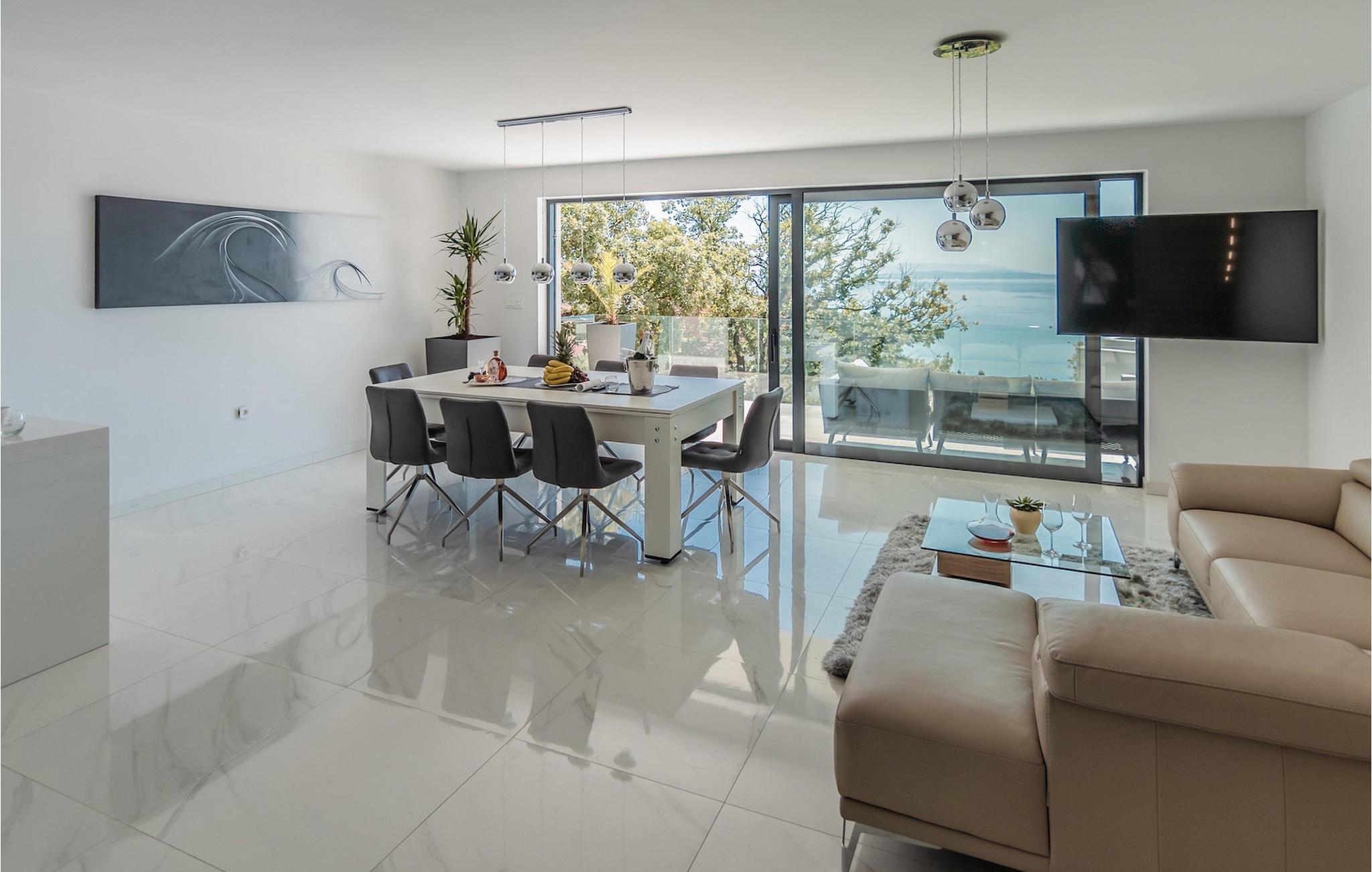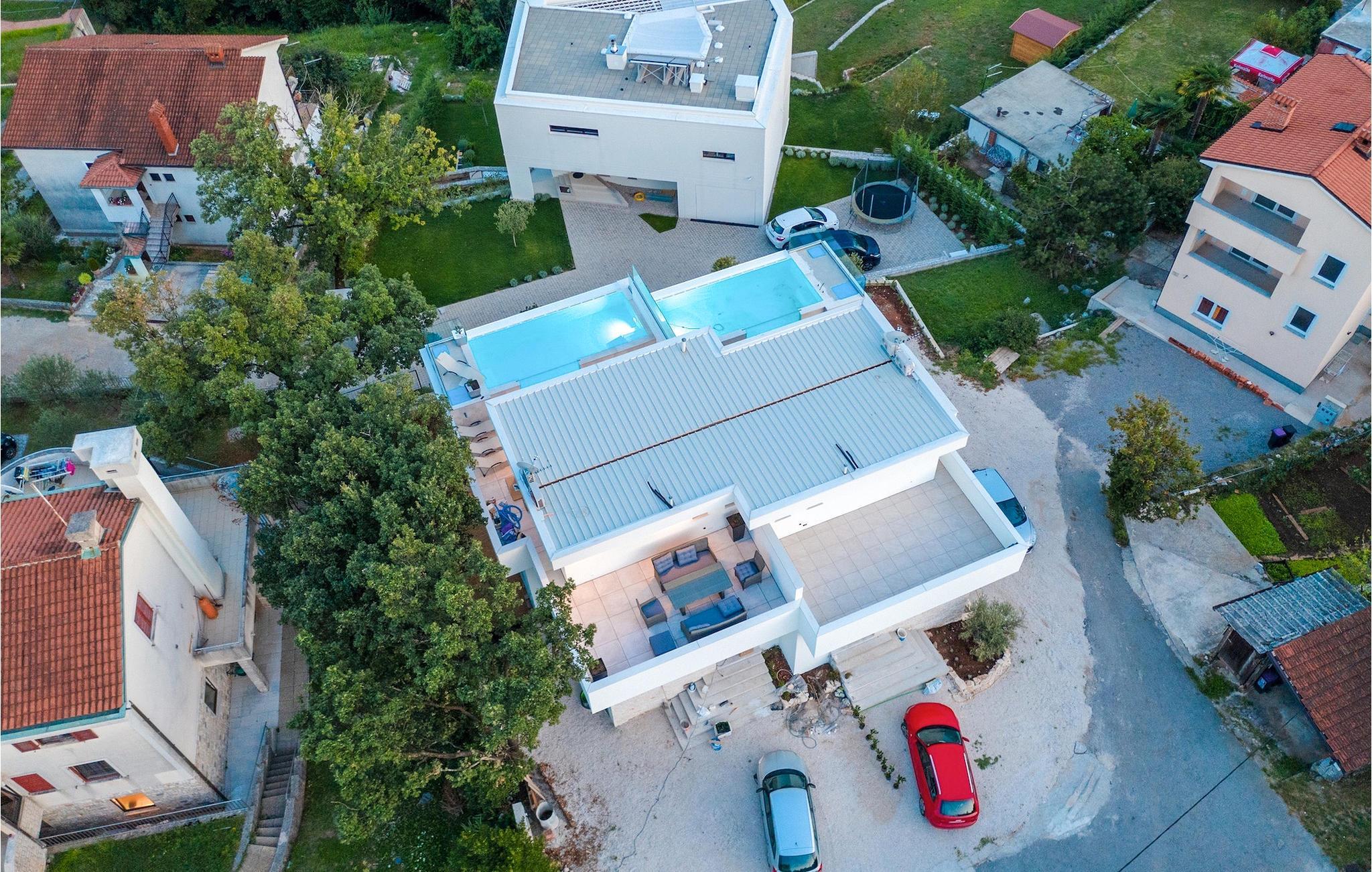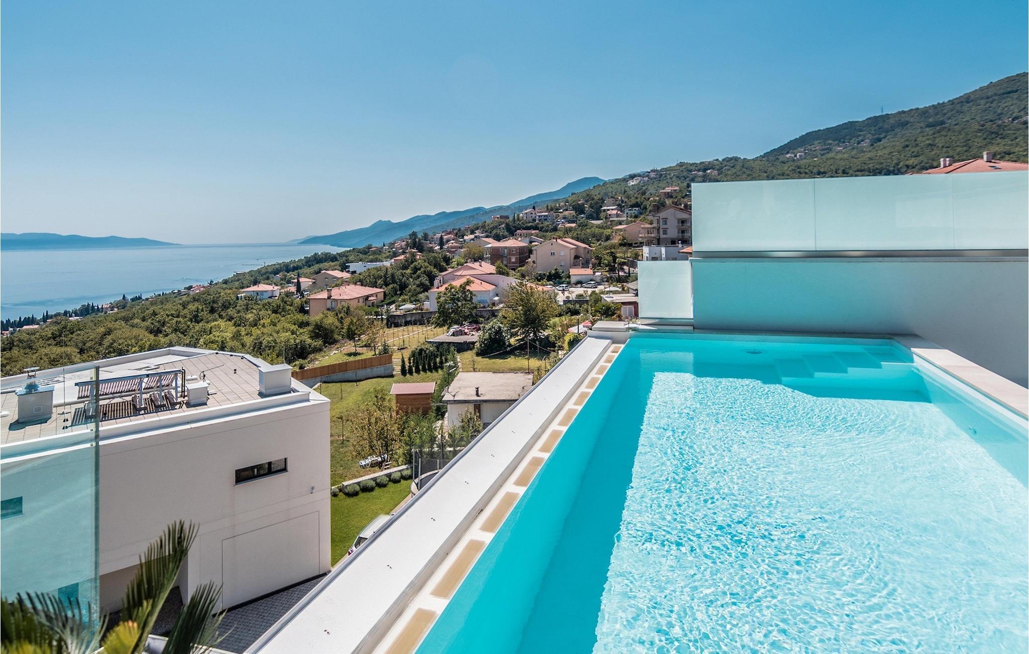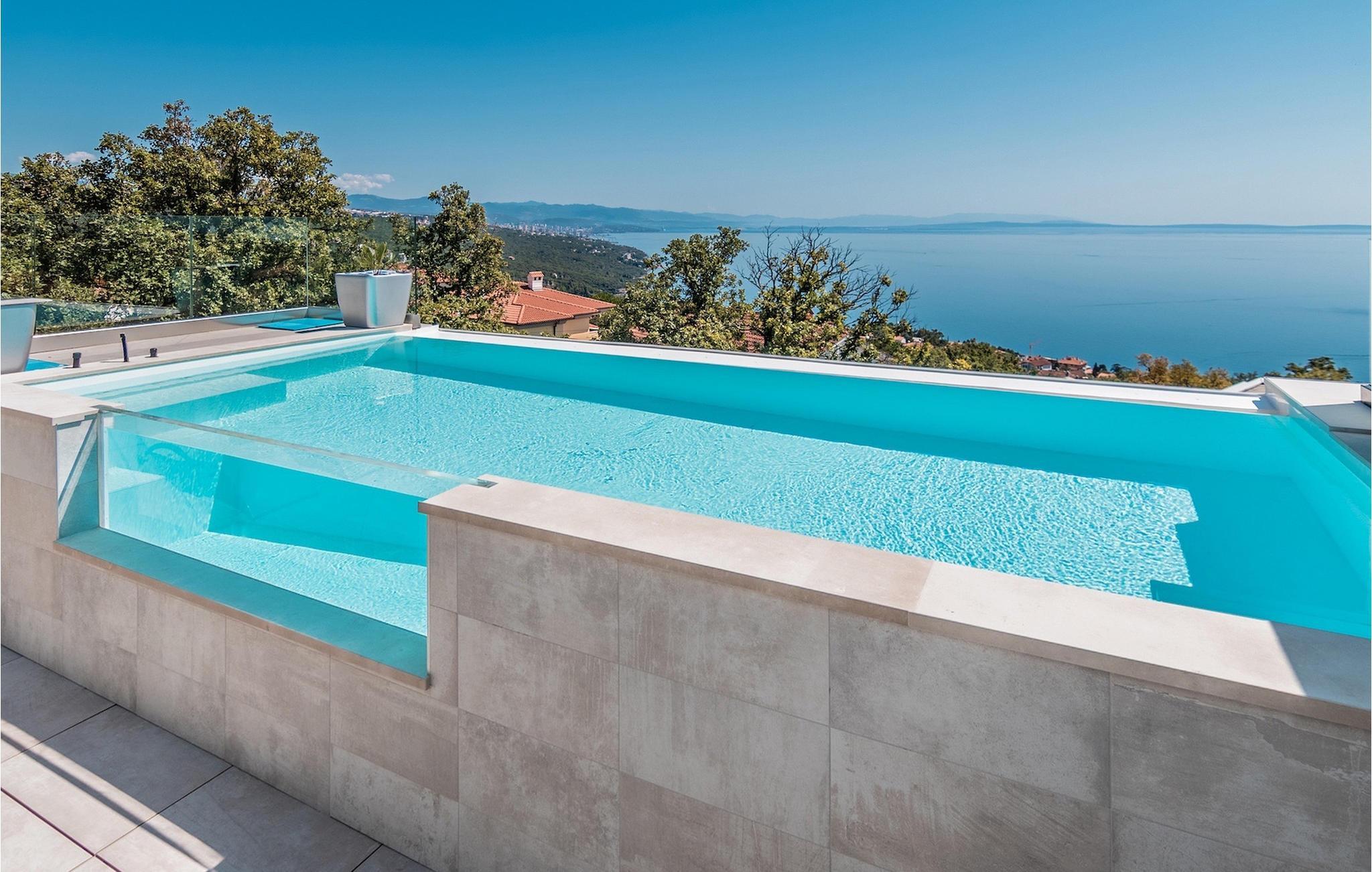 Die Villa ist in drei Ebenen unterteilt. Im Erdgeschoss befinden sich zwei Doppelbettzimmer mit jeweils eigenem Bad mit Dusche, TV und Klimaanlage. Im ersten Stock befinden sich ein moderner Wohn- und Essbereich mit Küche und ein Badezimmer. Der Esstisch lässt sich leicht zu einem Billardtisch umwandeln. Auf derselben Etage gibt es ein Extrazimmer für zwei Kinder mehr auf Anfrage. Die imposante Holztreppe führt zu einem weiteren Schlafzimmer mit Doppelbett im zweiten Stock. Das Zimmer verfügt über eigenes Badezimmer, TV und Klimaanlage. Auf jeder Etage dieser Villa steht Ihnen jeweils eine Terrasse zur Verfügung, auf der Sie mit Familie und Freunden die Sonne oder den Sternenhimmel genießen können. Den Pool auf dem Dach der Villa, der zum Schwimmen über den Wolken der Kvarner Bucht einlädt, werden Sie nur ungern verlassen.