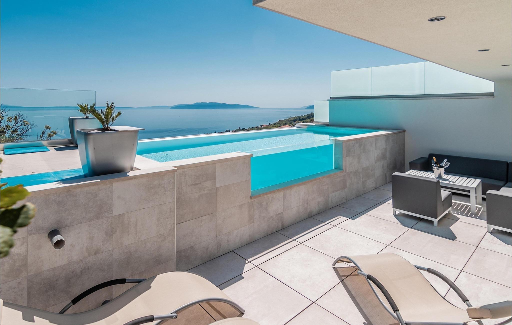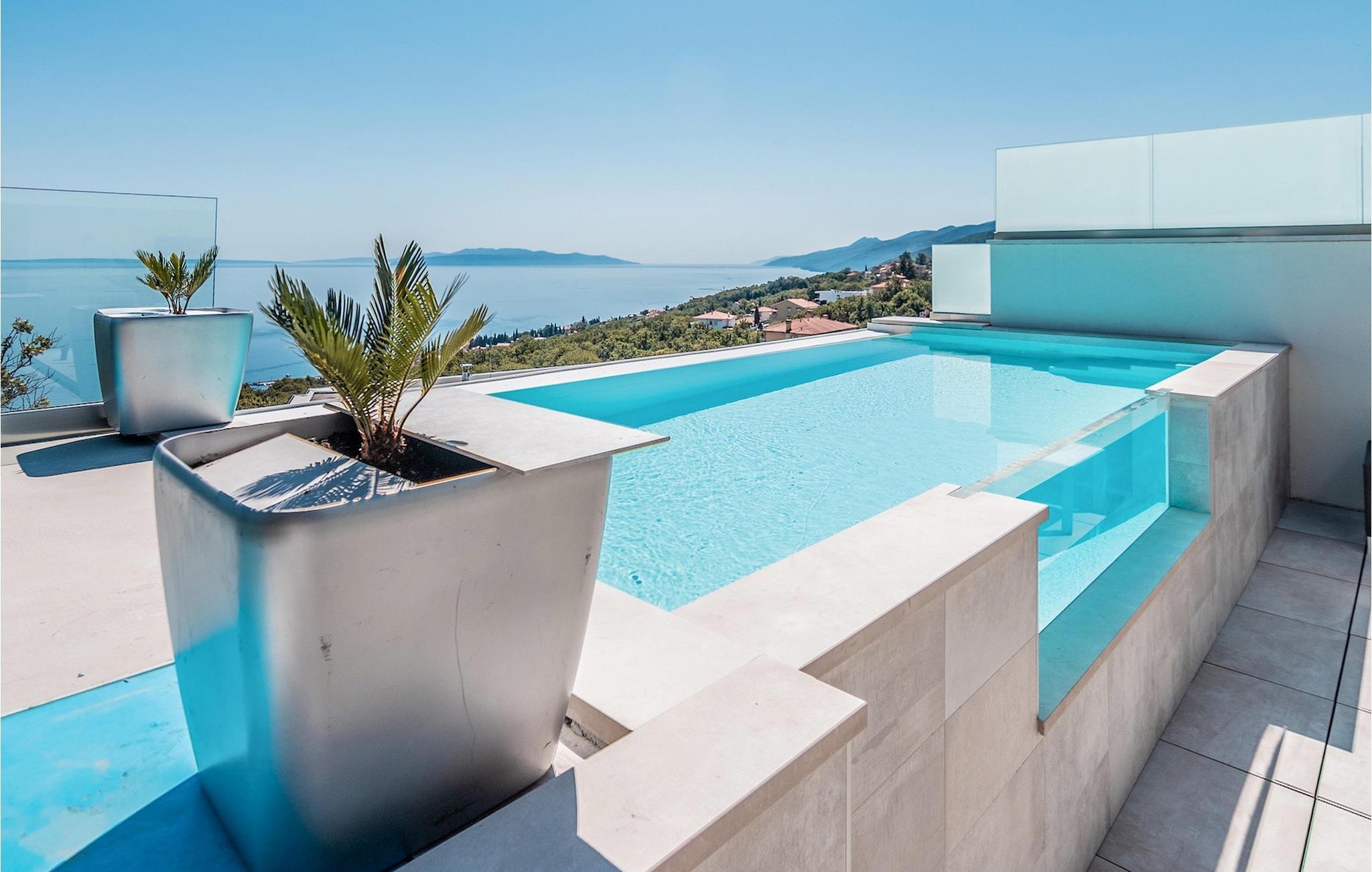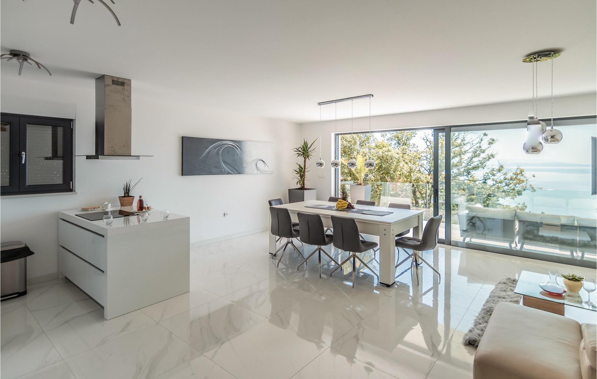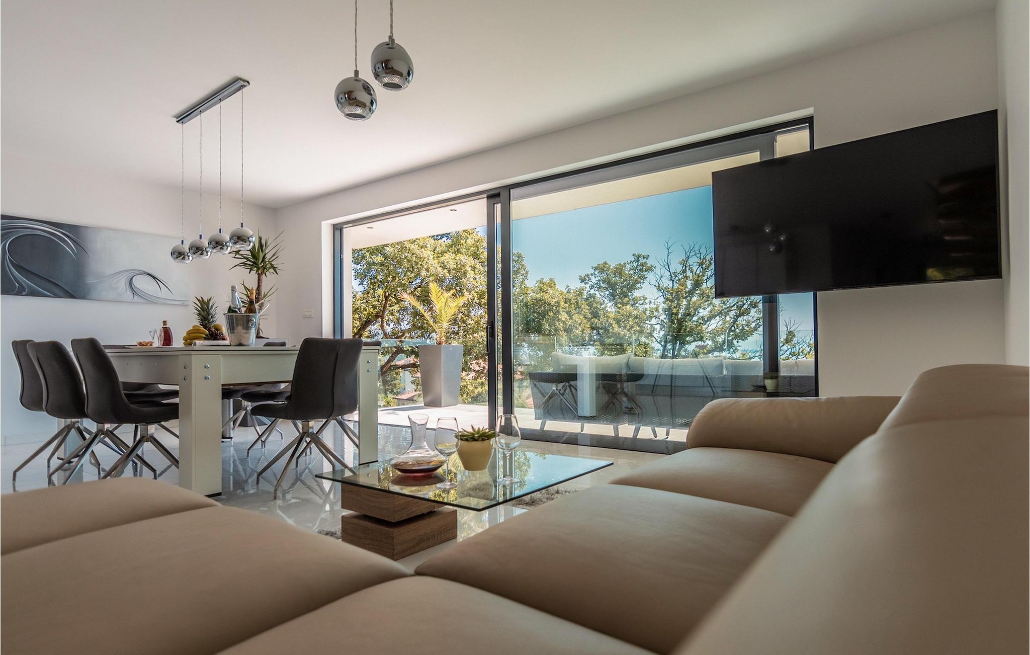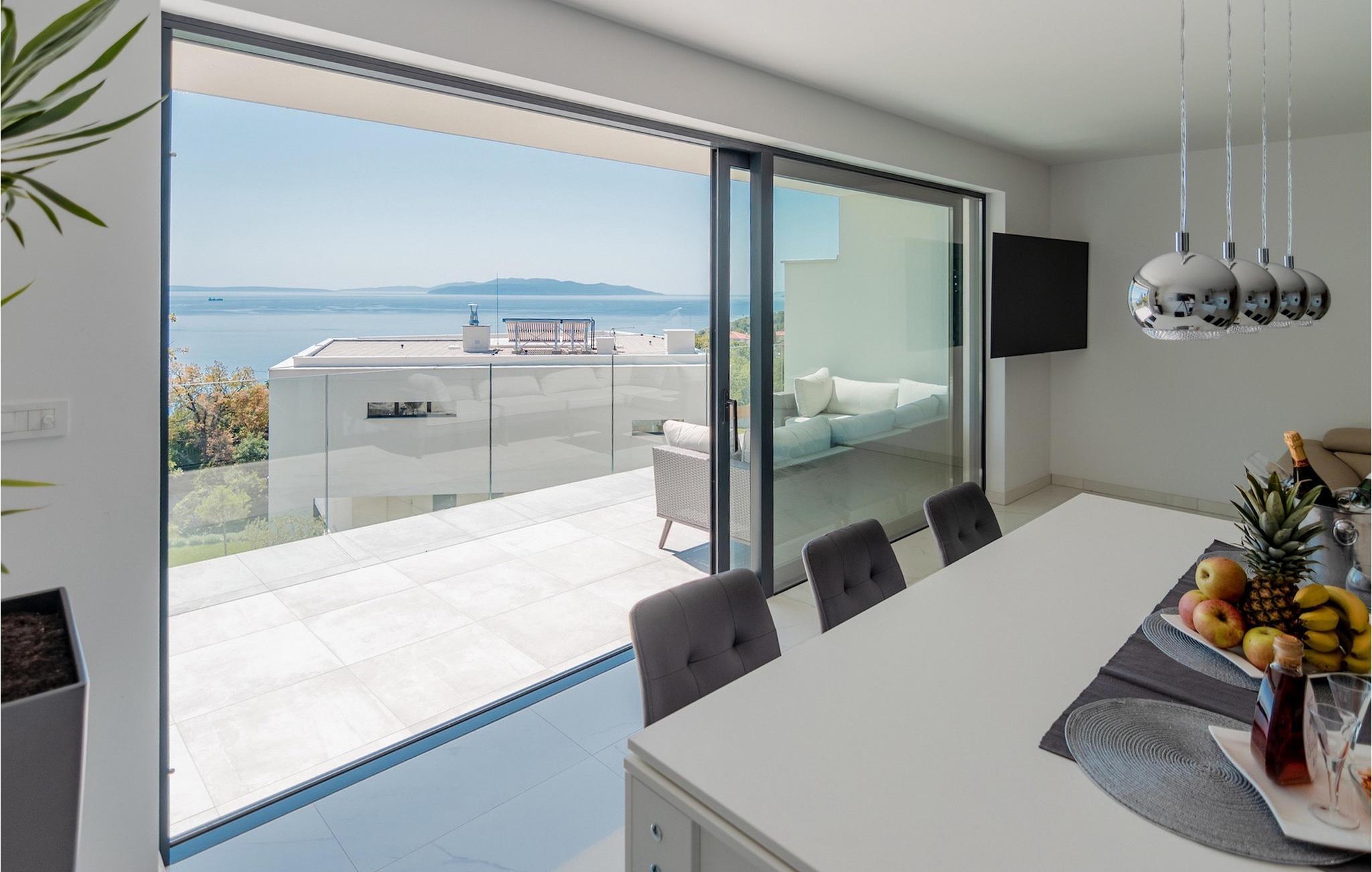 Die Villa ist in drei Ebenen unterteilt. Im Erdgeschoss befinden sich zwei Doppelbettzimmer mit jeweils eigenem Bad mit Dusche, TV und Klimaanlage. Im ersten Stock befinden sich ein moderner Wohn- und Essbereich mit Küche und ein Badezimmer. Der Esstisch lässt sich leicht zu einem Billardtisch umwandeln. Auf derselben Etage gibt es ein Extrazimmer für zwei Kinder mehr auf Anfrage. Die imposante Holztreppe führt zu einem weiteren Schlafzimmer mit Doppelbett im zweiten Stock. Das Zimmer verfügt über eigenes Badezimmer, TV und Klimaanlage. Auf jeder Etage dieser Villa steht Ihnen jeweils eine Terrasse zur Verfügung, auf der Sie mit Familie und Freunden die Sonne oder den Sternenhimmel genießen können. Den Pool auf dem Dach der Villa, der zum Schwimmen über den Wolken der Kvarner Bucht einlädt, werden Sie nur ungern verlassen.