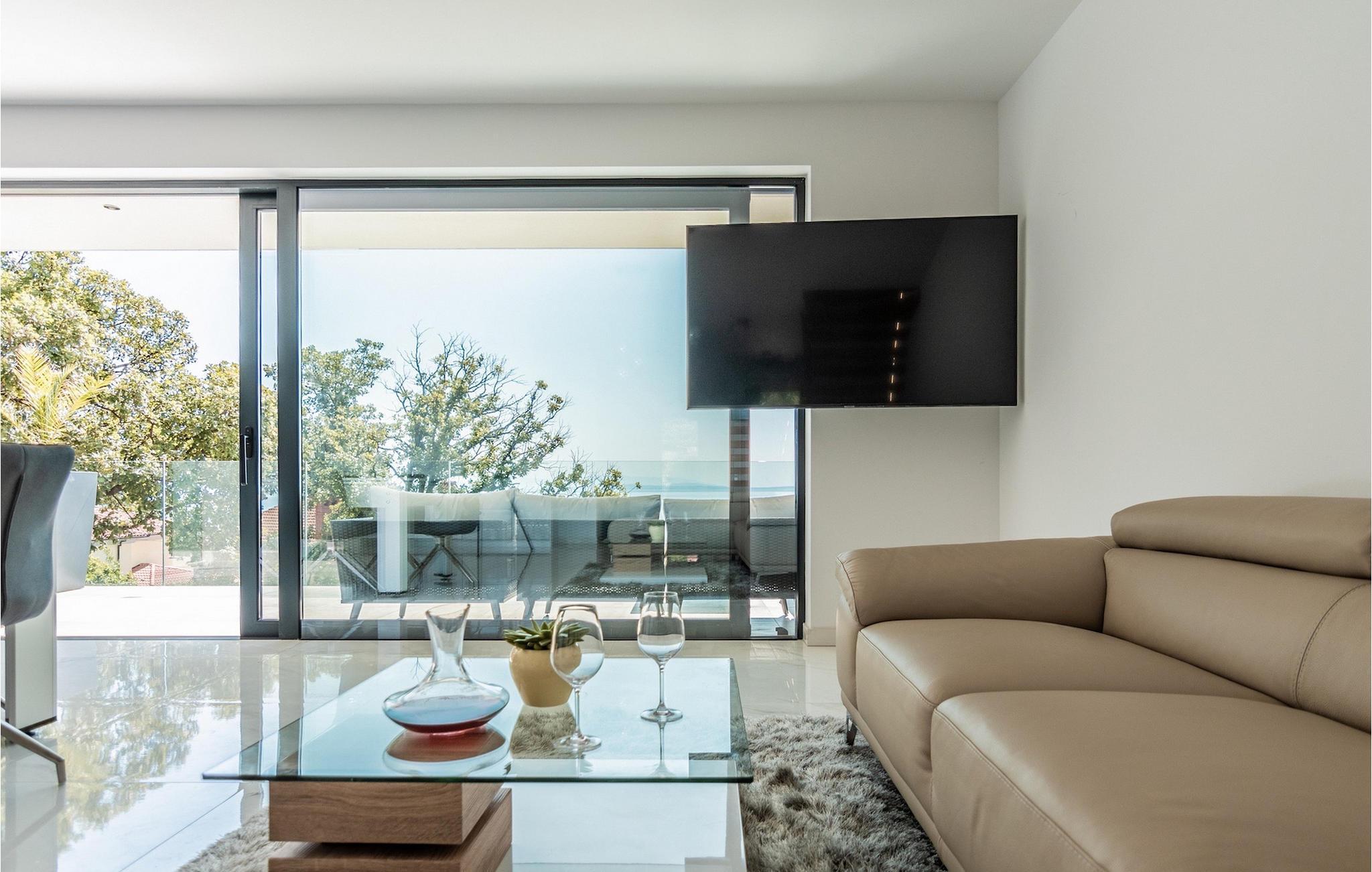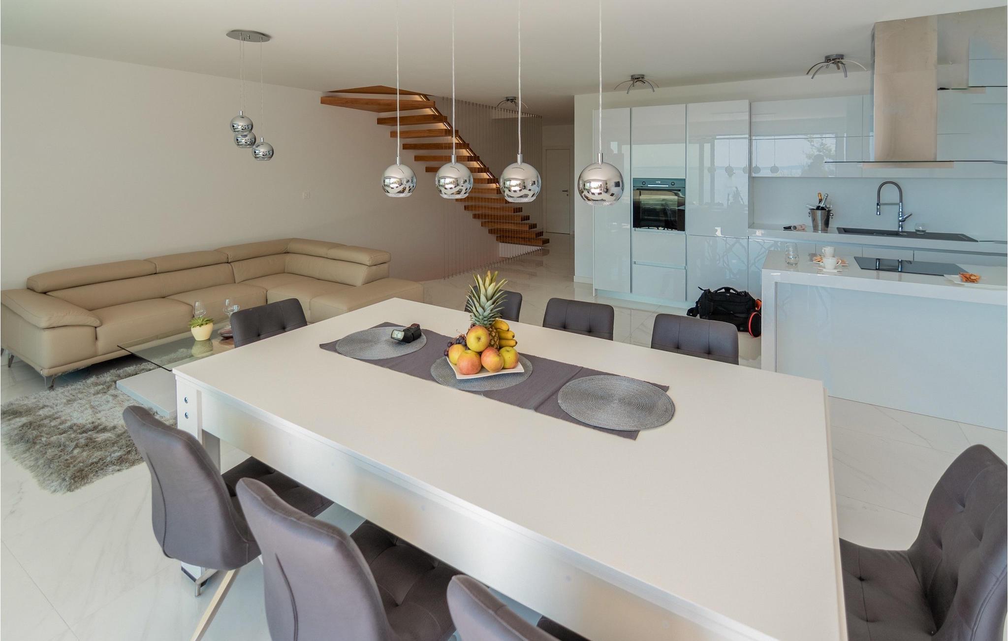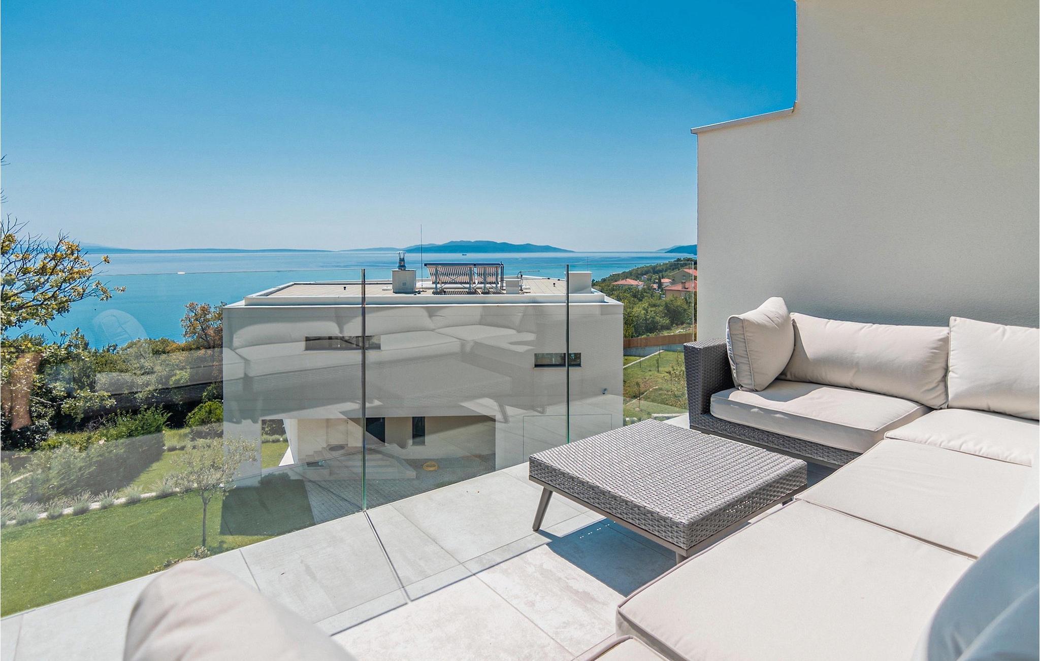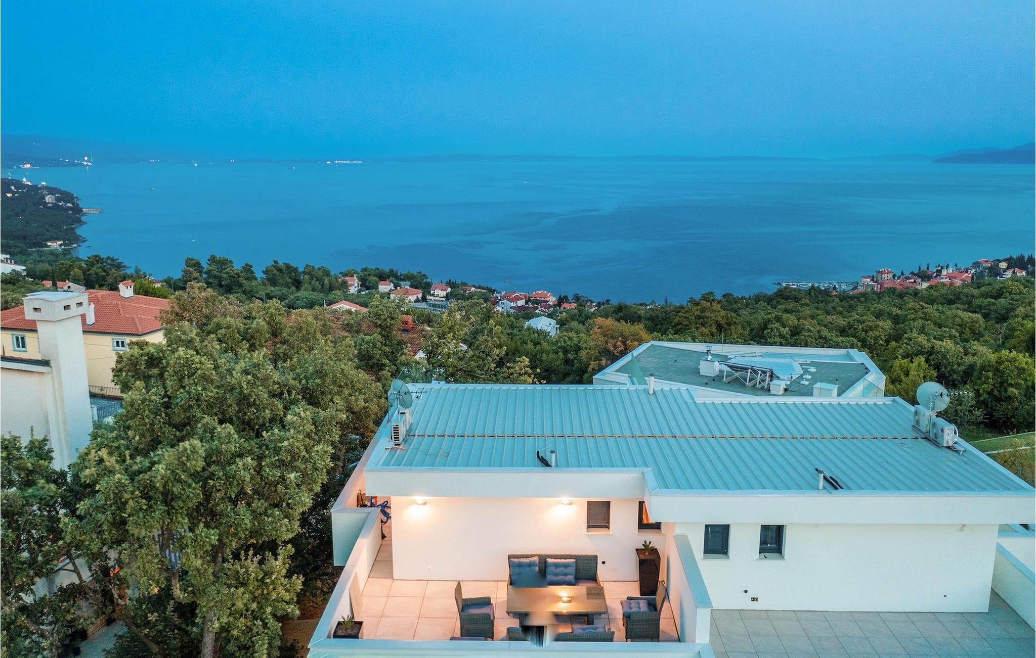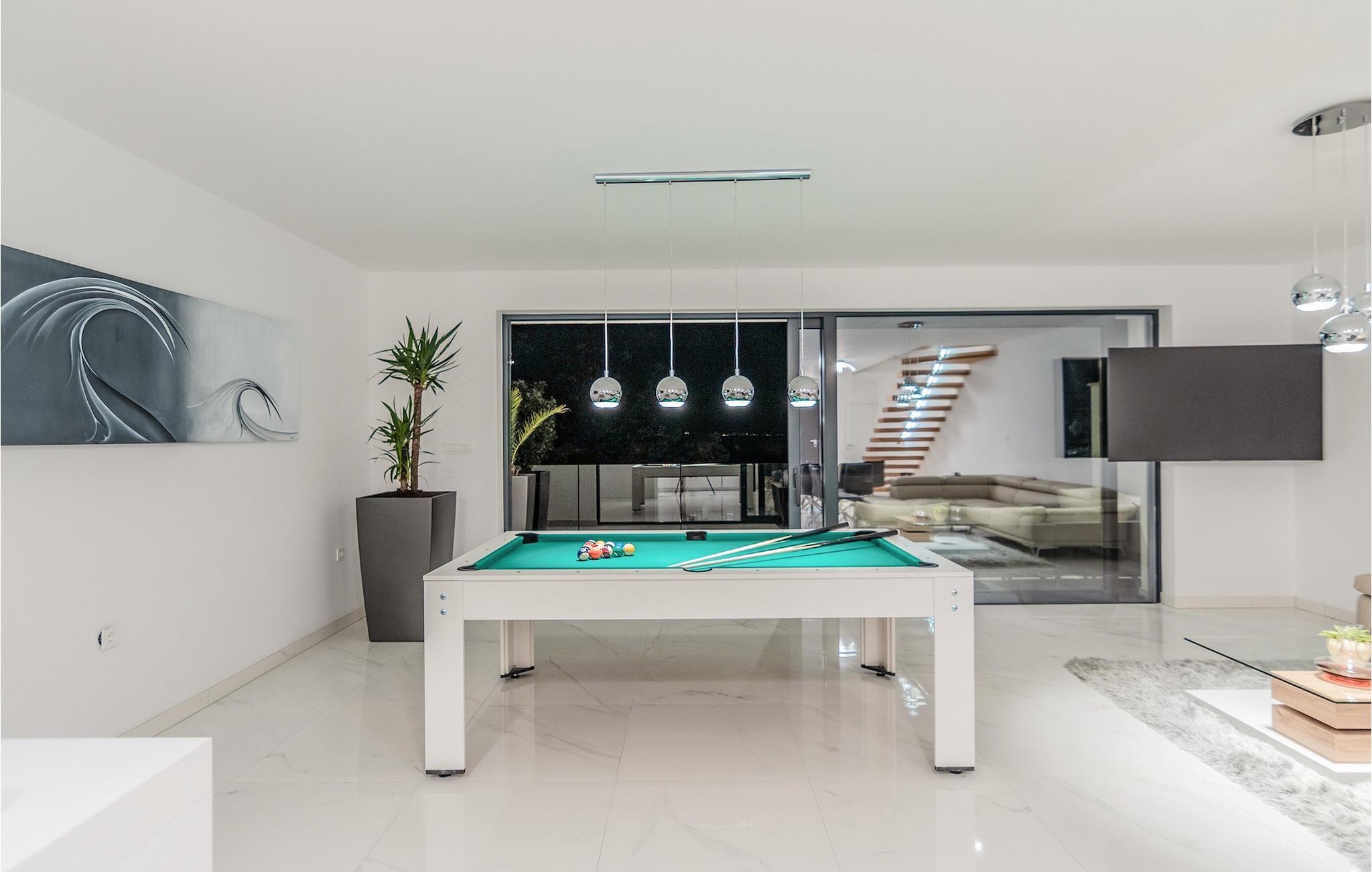 Die Villa ist in drei Ebenen unterteilt. Im Erdgeschoss befinden sich zwei Doppelbettzimmer mit jeweils eigenem Bad mit Dusche, TV und Klimaanlage. Im ersten Stock befinden sich ein moderner Wohn- und Essbereich mit Küche und ein Badezimmer. Der Esstisch lässt sich leicht zu einem Billardtisch umwandeln. Auf derselben Etage gibt es ein Extrazimmer für zwei Kinder mehr auf Anfrage. Die imposante Holztreppe führt zu einem weiteren Schlafzimmer mit Doppelbett im zweiten Stock. Das Zimmer verfügt über eigenes Badezimmer, TV und Klimaanlage. Auf jeder Etage dieser Villa steht Ihnen jeweils eine Terrasse zur Verfügung, auf der Sie mit Familie und Freunden die Sonne oder den Sternenhimmel genießen können. Den Pool auf dem Dach der Villa, der zum Schwimmen über den Wolken der Kvarner Bucht einlädt, werden Sie nur ungern verlassen.