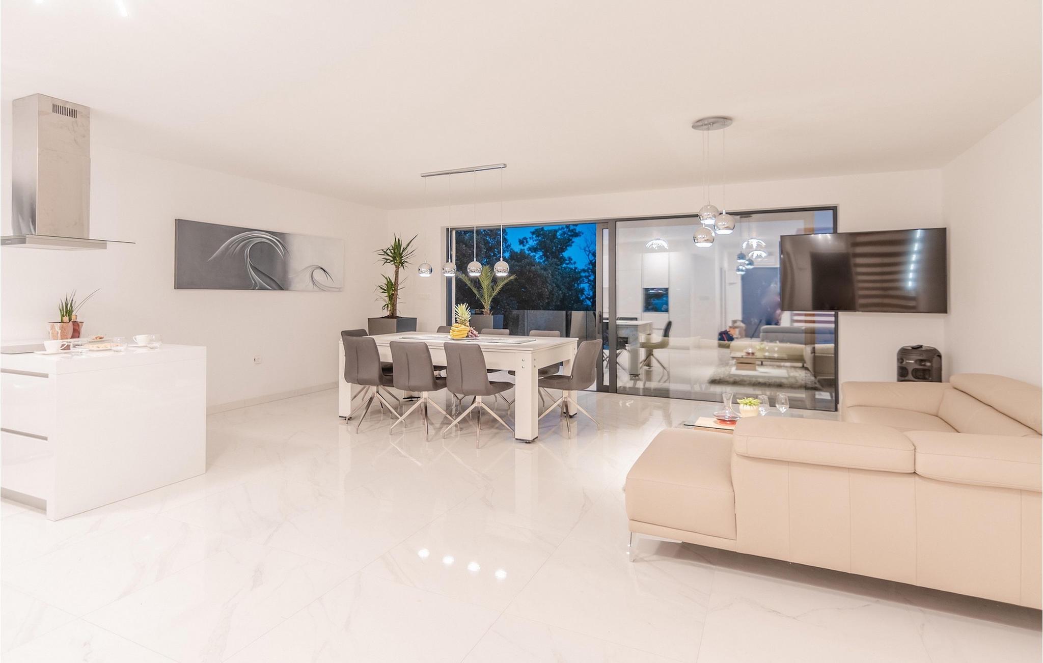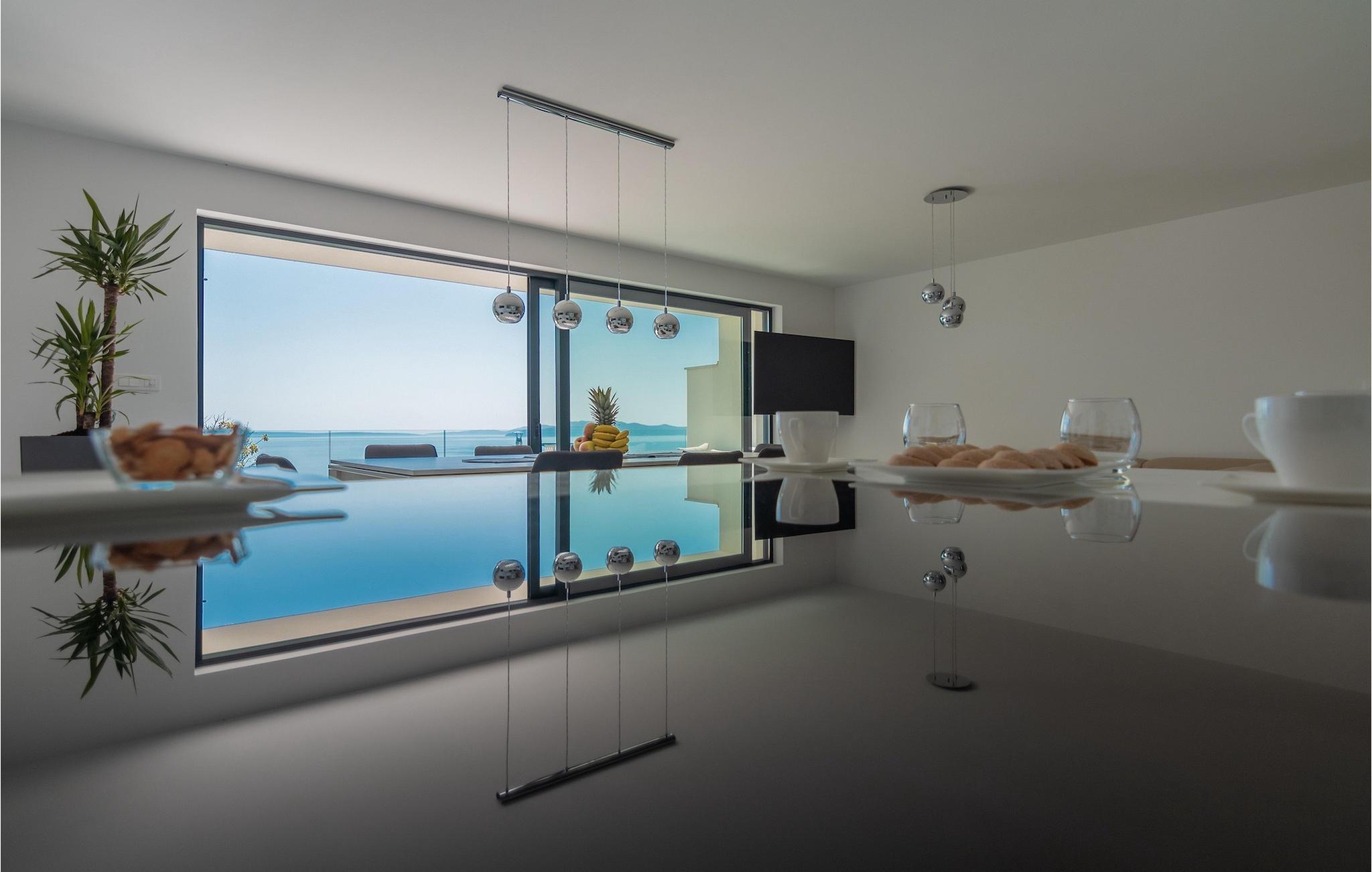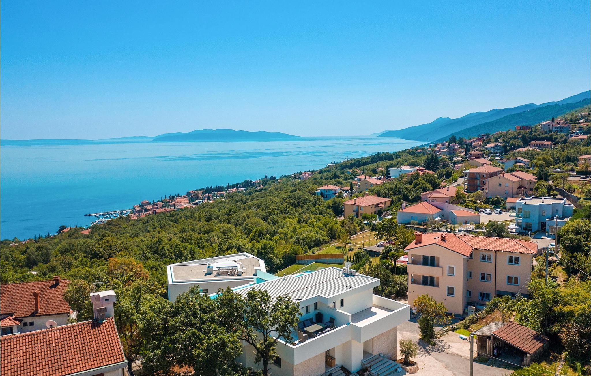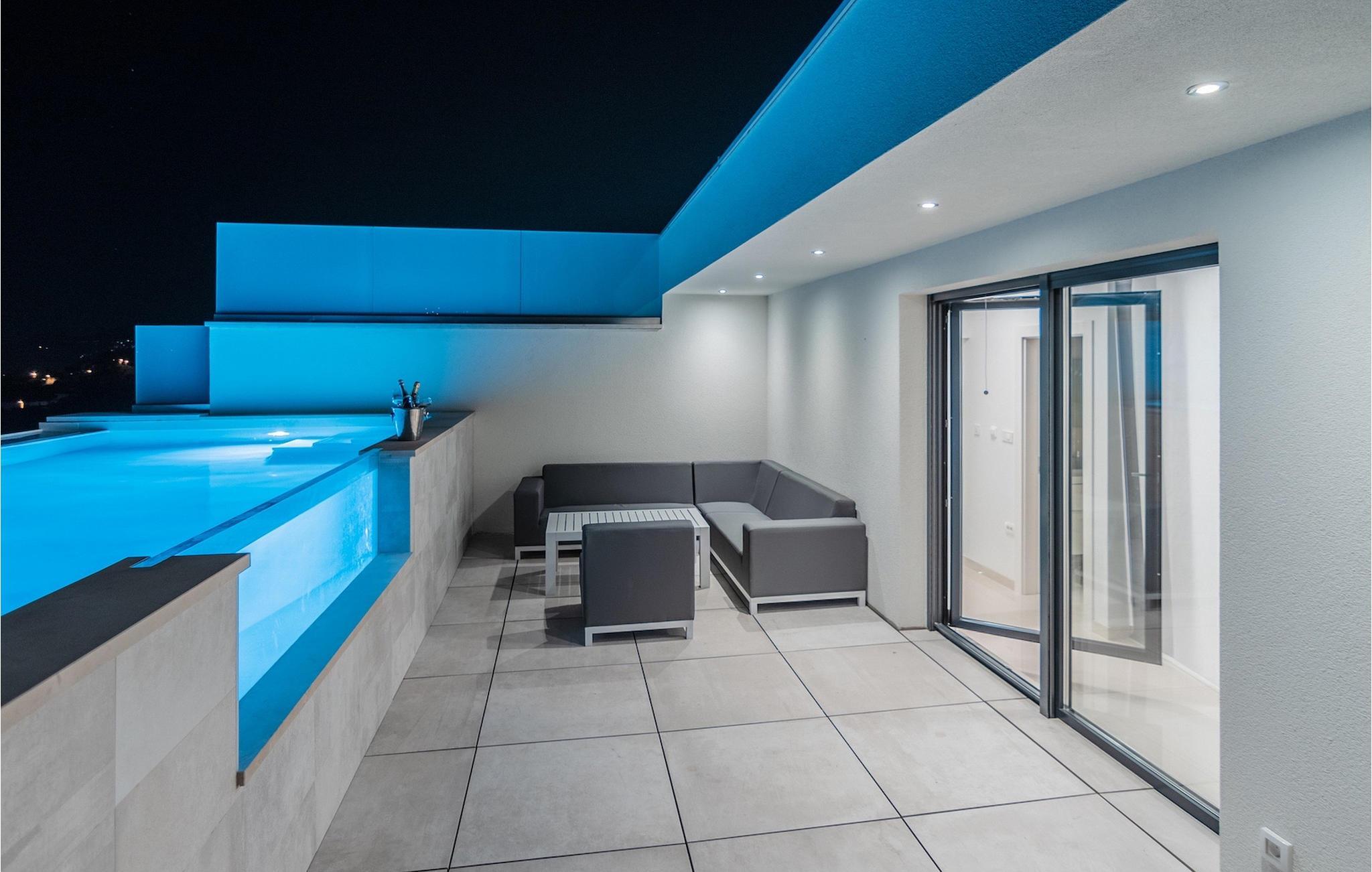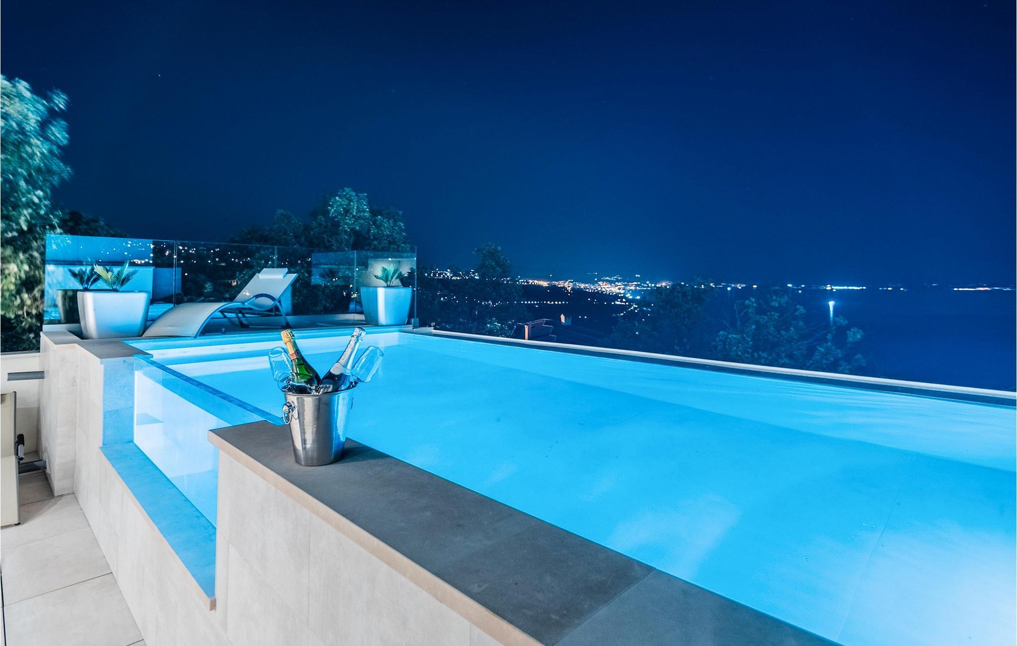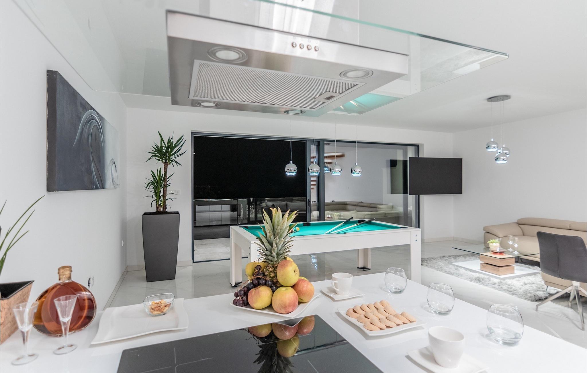 Die Villa ist in drei Ebenen unterteilt. Im Erdgeschoss befinden sich zwei Doppelbettzimmer mit jeweils eigenem Bad mit Dusche, TV und Klimaanlage. Im ersten Stock befinden sich ein moderner Wohn- und Essbereich mit Küche und ein Badezimmer. Der Esstisch lässt sich leicht zu einem Billardtisch umwandeln. Auf derselben Etage gibt es ein Extrazimmer für zwei Kinder mehr auf Anfrage. Die imposante Holztreppe führt zu einem weiteren Schlafzimmer mit Doppelbett im zweiten Stock. Das Zimmer verfügt über eigenes Badezimmer, TV und Klimaanlage. Auf jeder Etage dieser Villa steht Ihnen jeweils eine Terrasse zur Verfügung, auf der Sie mit Familie und Freunden die Sonne oder den Sternenhimmel genießen können. Den Pool auf dem Dach der Villa, der zum Schwimmen über den Wolken der Kvarner Bucht einlädt, werden Sie nur ungern verlassen.