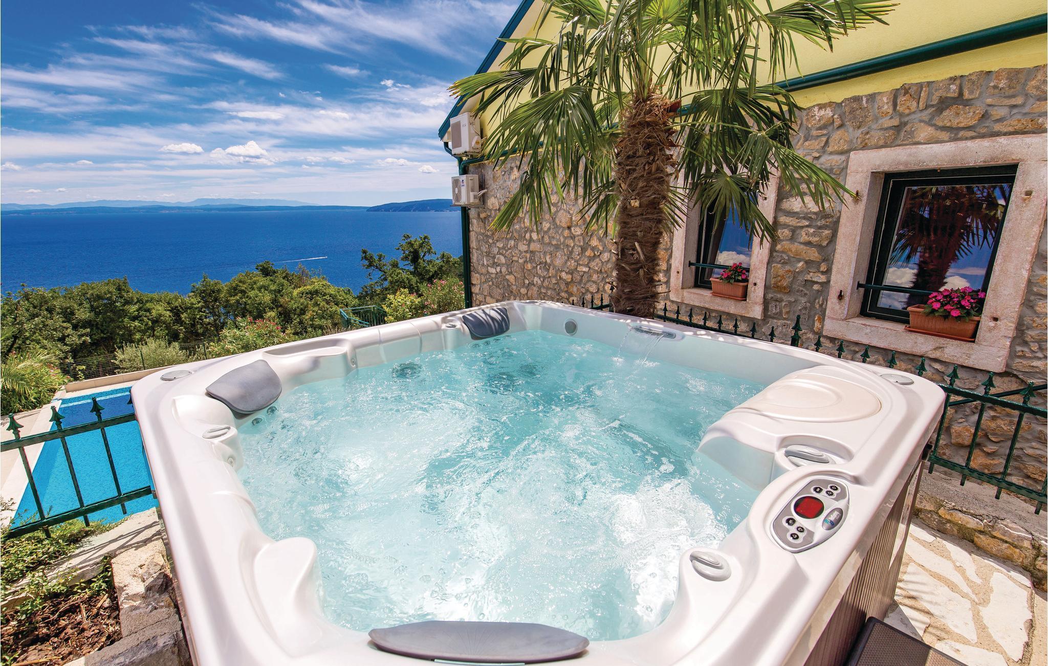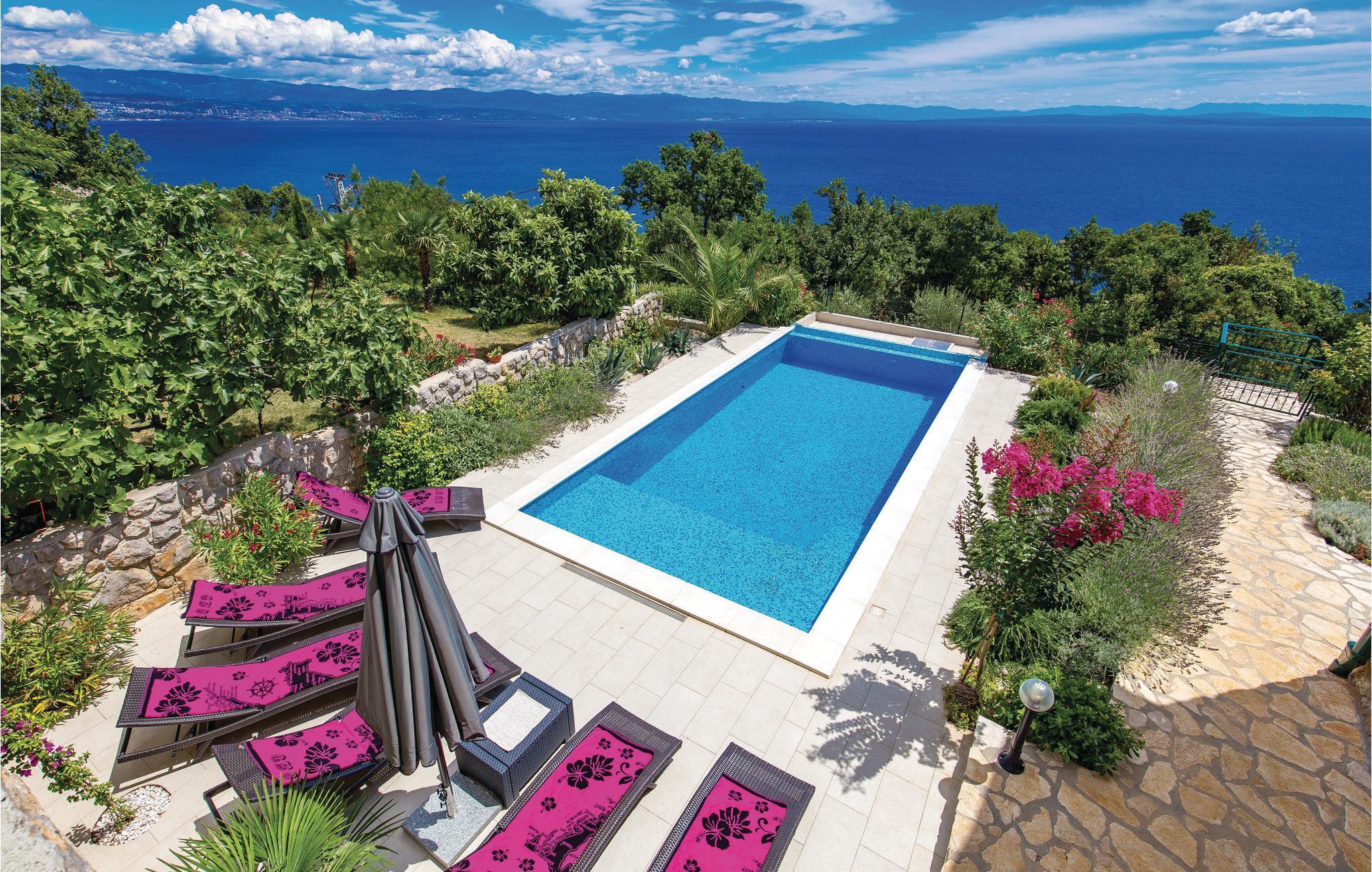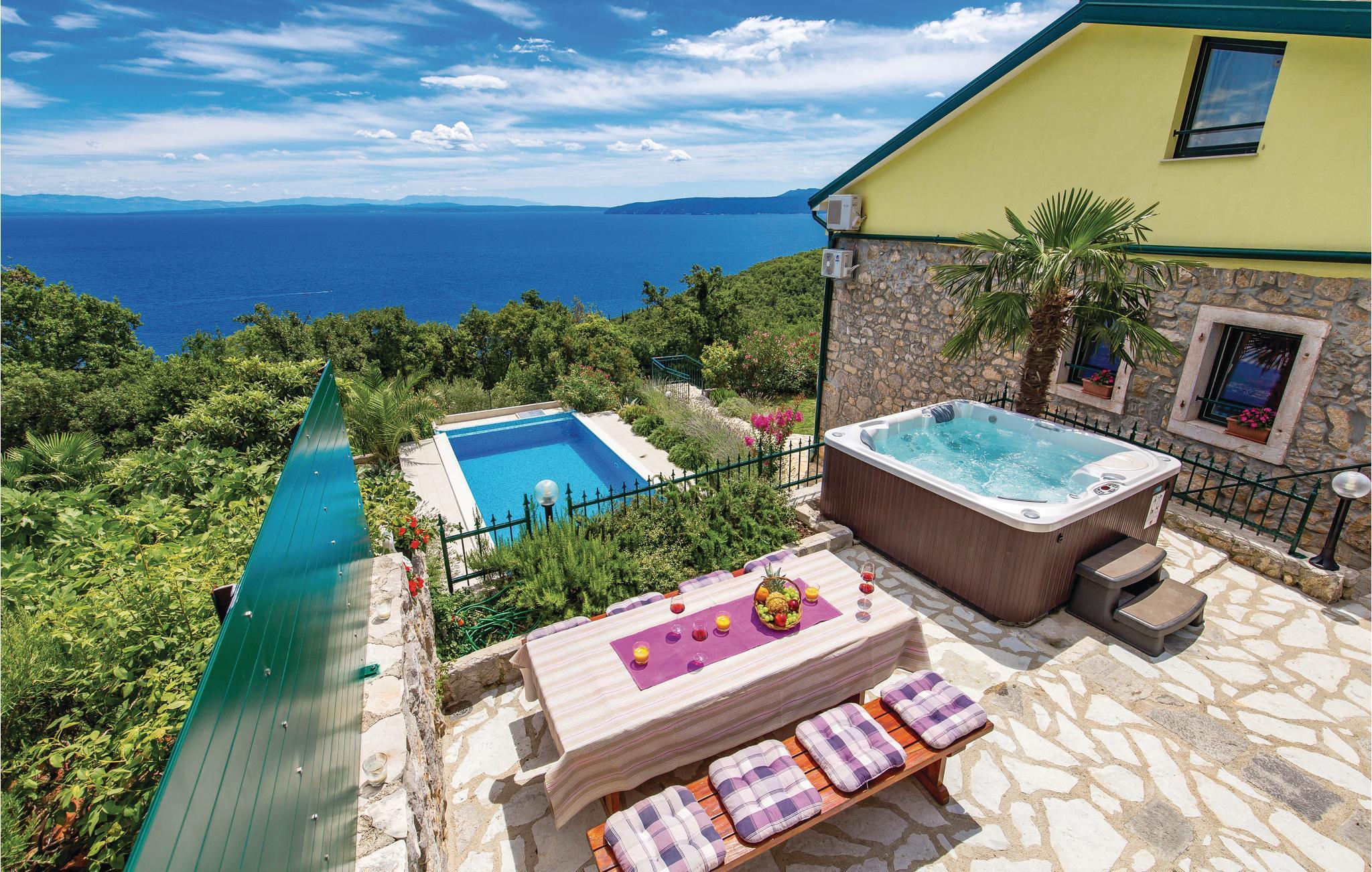 Diese authentische Steinhausdoppelhälfte wurde im Jahr 1856 erbaut, 2012 komplett renoviert und neu eingerichtet. Sie liegt ruhig, umgeben von viel Grün und bietet einen wunderschönen Blick auf das Meer und die Kvarner Bucht. Der erste Stock verfügt über ein großes Wohnzimmer und die Küche, während die Schlafzimmer im Stockwerk darüber sind, d.h. im Dachgeschoss mit einer niedrigsten Deckenhöhe von ca. 30 cm. Im Erdgeschoss erwartet Sie ein Fitness- und Freizeitraum, der mit der ersten Etage über eine Aussentreppe verbunden ist. Erfrischung bietet der Pool, dessen Besonderheit ist, dass er sowohl ein tiefes Becken (25m2), sowie ein Kinderbecken (5m2) hat. Sie brauchen nicht weiter als bis zum nächsten Strand, Medveja, zu fahren, da es dort viele Freizeitangebote gibt, die außer einem erfrischenden Bad noch Unterhaltung und Spaß bieten. Der Strand ist ideal für alle Altersgruppen. Abends können Sie in Opatija durch die Straßen bummeln. Wir empfehlen Ihnen auch, Fischspezialitäten in einem der vielen Restaurants zu kosten, die ein reiches, gastronomisches Angebot haben. Das Haus ist ideal für den gemeinsamen Urlaub von mehreren Familien oder Freunden. Der Vermieter wohnt etwas weiter weg.