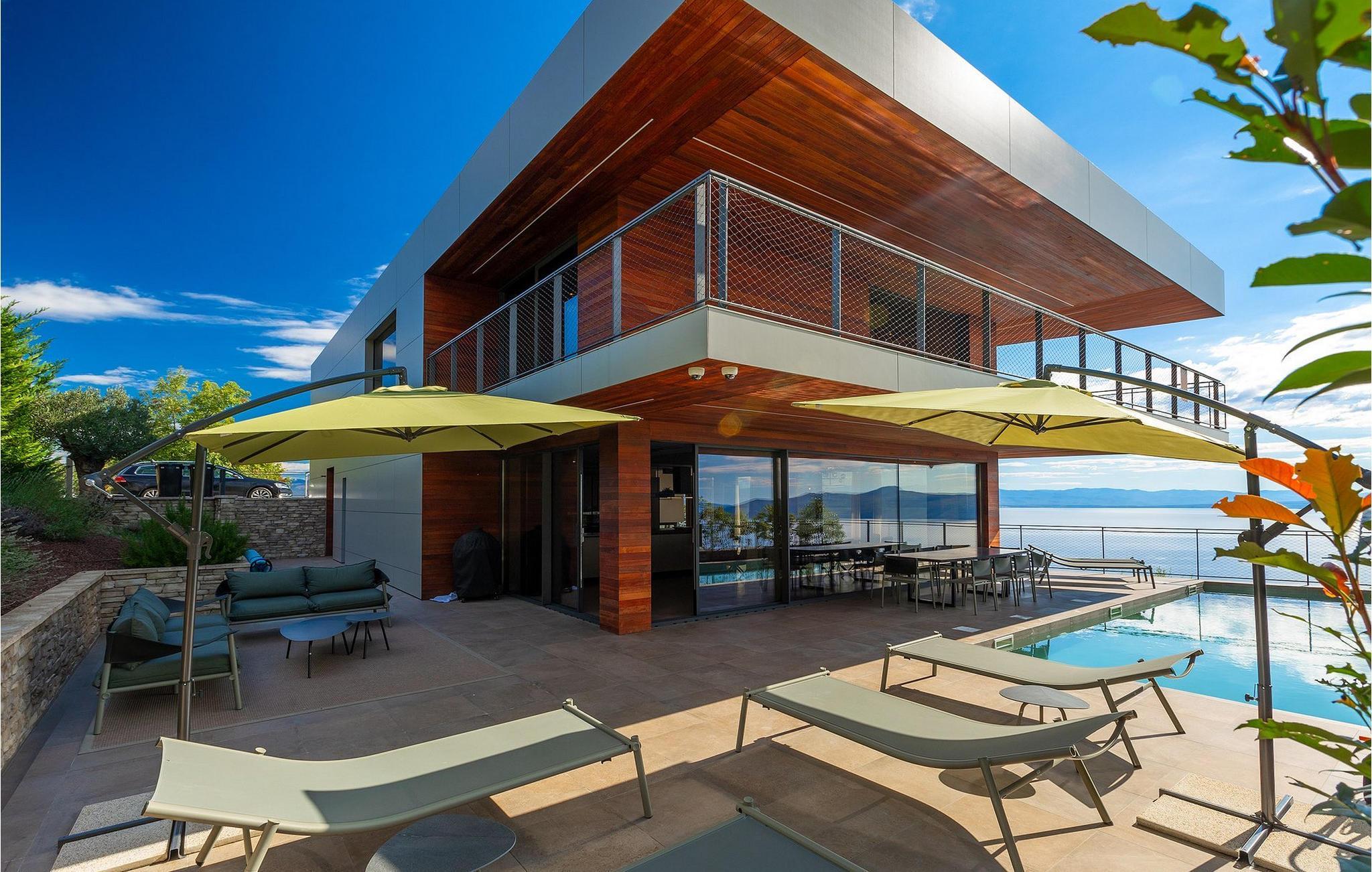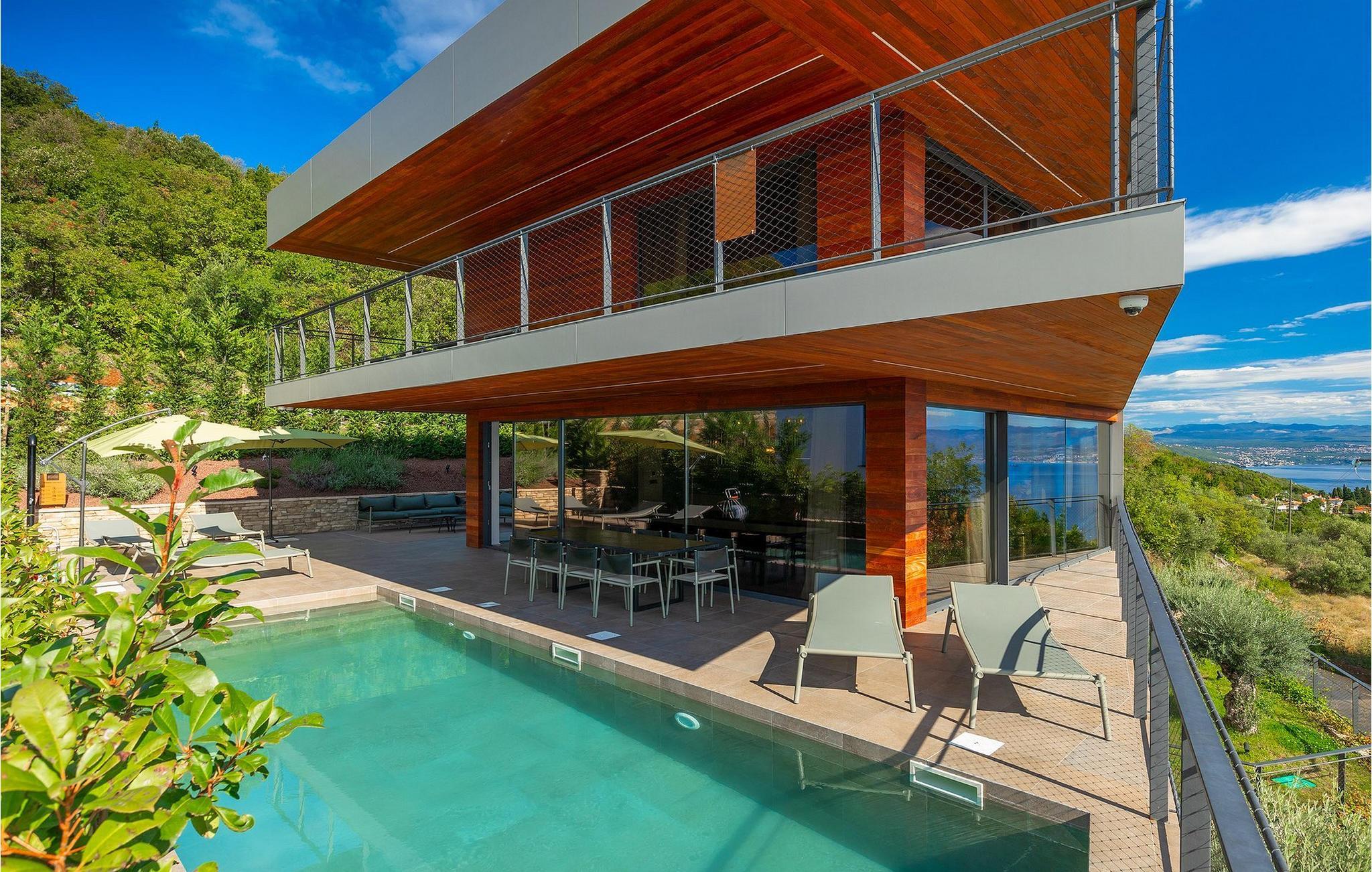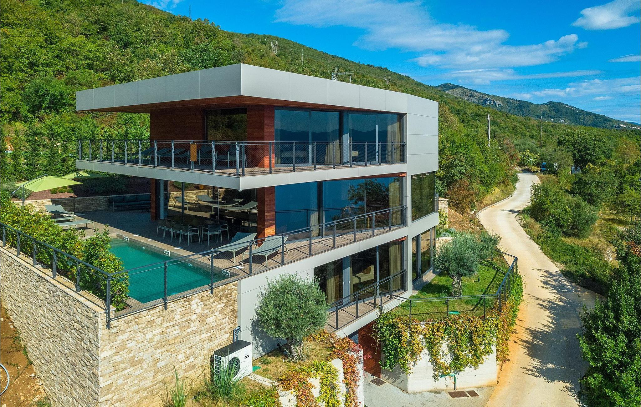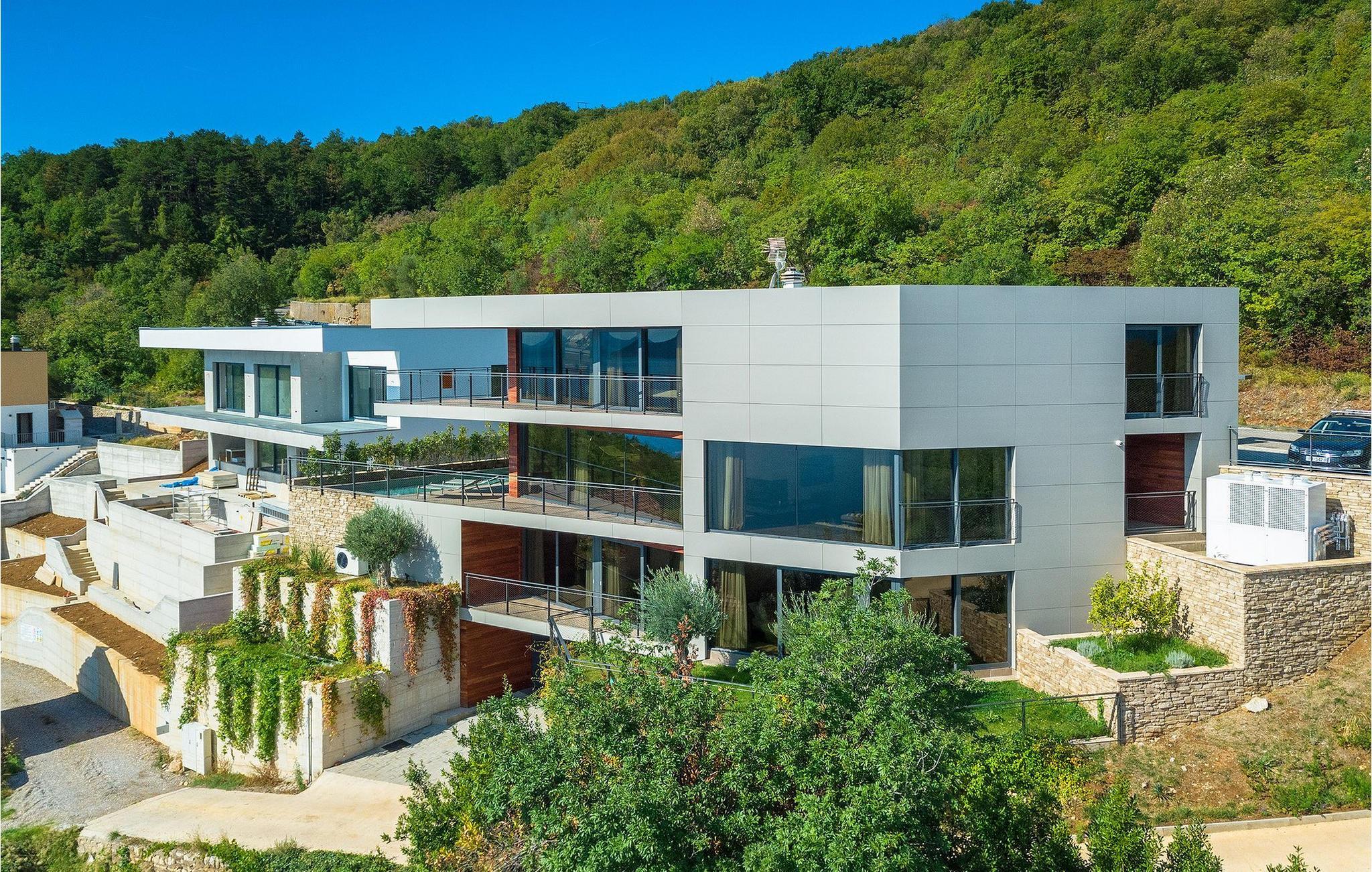 Die Luxusvilla Vista Hills bietet Ihnen einen unvergesslichen Urlaub mit königlicher Behandlung und Komfort. Die Villa verfügt über einen atemberaubenden Ausblick auf die Kvarner-Bucht und ist darauf ausgelegt, Ihren Aufenthalt mit Ruhe und in positiver Atmosphäre zu beeindrucken. Die Villa hat fünf Schlafzimmer für zehn Gäste, mit der Möglichkeit, bis zu zwei weitere Gäste auf Zustellbetten unterzubringen. Jedes Schlafzimmer ist klimatisiert und verfügt über ein eigenes Bad, einen Fernseher und Zugang zum Balkon. Im ersten Stock befinden sich drei moderne und luxuriöse Zimmer. Zwei weitere Zimmer befinden sich im dritten Stock. Im zweiten Stock der Villa befindet sich ein geräumiges Wohnzimmer mit hochwertigen italienischen Möbeln sowie ein Essbereich und eine komplett ausgestattete Küche, die nach den Anweisungen eines professionellen Kochs gestaltet wurde. Das Erdgeschoss der Villa bietet Ihnen eine Taverne mit Küche, ein idealer Ort für Geselligkeit. Ebenso befindet sich auf dieser Etage ein Wellnessraum mit Sauna, Whirlpool und Massageliege, wo Sie Körper und Geist aufladen können. Die Villa verfügt auch über ein Spielzimmer mit Spielzeug und Playstation, ein voll ausgestattetes Fitnessstudio und ein großes Büro. Olivenbäume sorgen für eine authentische mediterrane Atmosphäre und ein beheizter Pool mit Sonnenliegen und einem Loungebereich lädt zum Entspannen ein. Die Terrasse samt Esstisch und Grill ist vom inneren Essbereich aus zugänglich und ein idealer Ort zum Verweilen mit Familie sowie Freunden mit herrlichem Panoramablick. Neben der Unterkunft in der Villa, gibt es auf Anfrage und gegen Aufpreis verschiedene Zusatzleistungen wie ein privater Trainer, professioneller Koch, der köstlichte Spezialitäten zubereitet, ein Besuch von einem berühmten Sommelier, Schönheitsbehandlungen und Massagen, Yacht Verleih, Elektrofahrräder, Tauchlehrer und vieles mehr. Das Grundstück ist eingezäunt und bietet Parkplätze für 5 Fahrzeuge, 2 davon in der Garage.Nur einen Katzensprung von Opatija “der Perle der Adria” befindet sich die Luxusvilla Vista Hills, gelegen in einer kleinen Ortschaft Mošcenice. Die naheliegende Ortschaft Mošcenicka Draga ist bekannt für seinen schönen 2 km langen Kiesstrand Šipar und den Yachthafen. Rijeka, die größte Stadt der Kvarner Region, ist nur 20 km entfernt von der Villa. Sie können dort viele kulturelle und historische Denkmäler besuchen und die interessante lokale Geschichte, Kultur und Tradition kennenlernen. Die größte und bekannteste Manifestation in dieser Gegend ist der Karneval von Rijeka, heute einer der größten Karnevalsumzüge in Europa und der Welt. Im Jahr 2020 Rijeka war Kulturhauptstadt Europas.