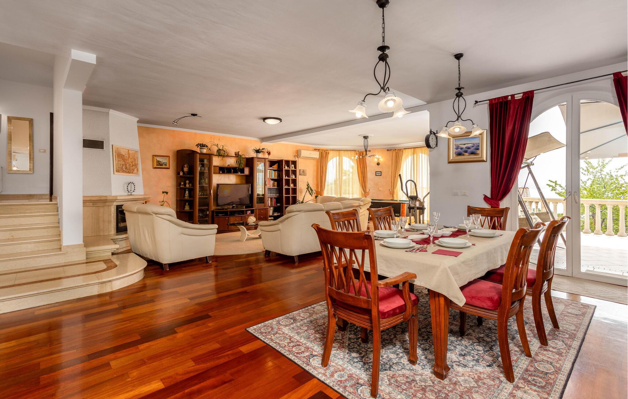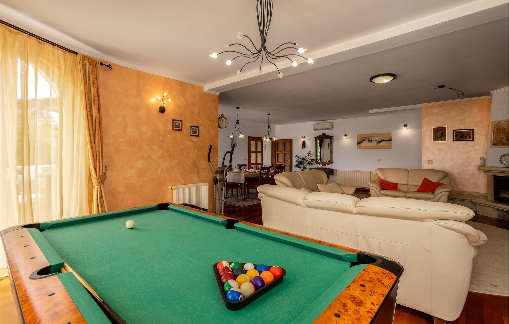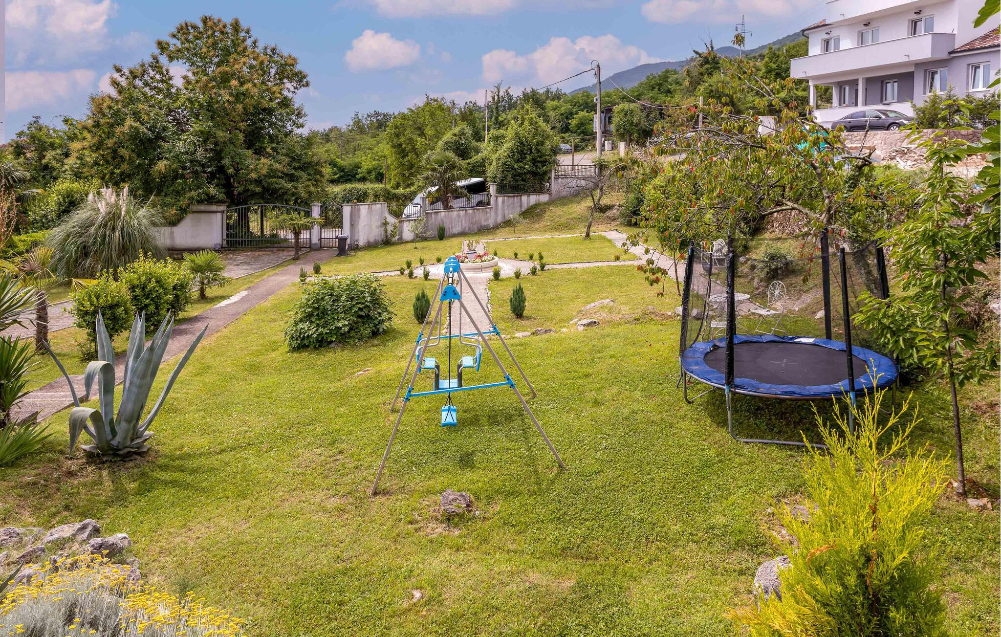 Verbringen Sie einen unvergesslichen Urlaub in diesem schönen Ferienhaus mit eigenem Swimmingpool in der Nähe von Opatija. Das Grundstück ist wunderbar angelegt und bietet viel Grün und eine Reihe von Annehmlichkeiten wie Pool, Liegestühle, Trampolin und Tischtennisplatte. Die Parkplätze befinden sich im unteren Grundstücksbereich, von wo Sie über Stufen zum Haus und Garten gelangen. Genießen Sie die Stunden im Freien auf der Terrasse und den fantastischen Blick auf das Meer und die Kvarner Bucht. Die Innenräume sind geräumig, lichtdurchflutet und klimatisiert. Vom Wohnbereich führen Innentreppen zu den Schlafzimmern und Bädern.