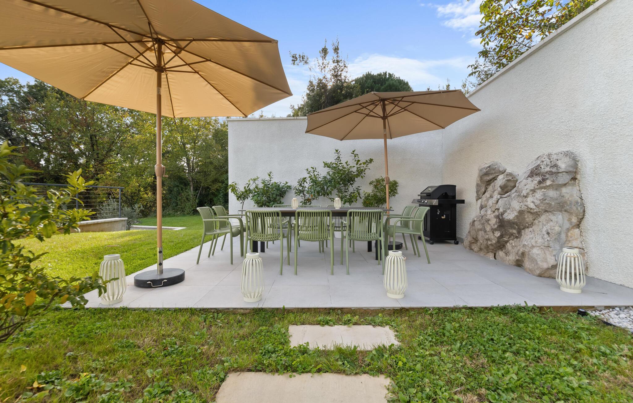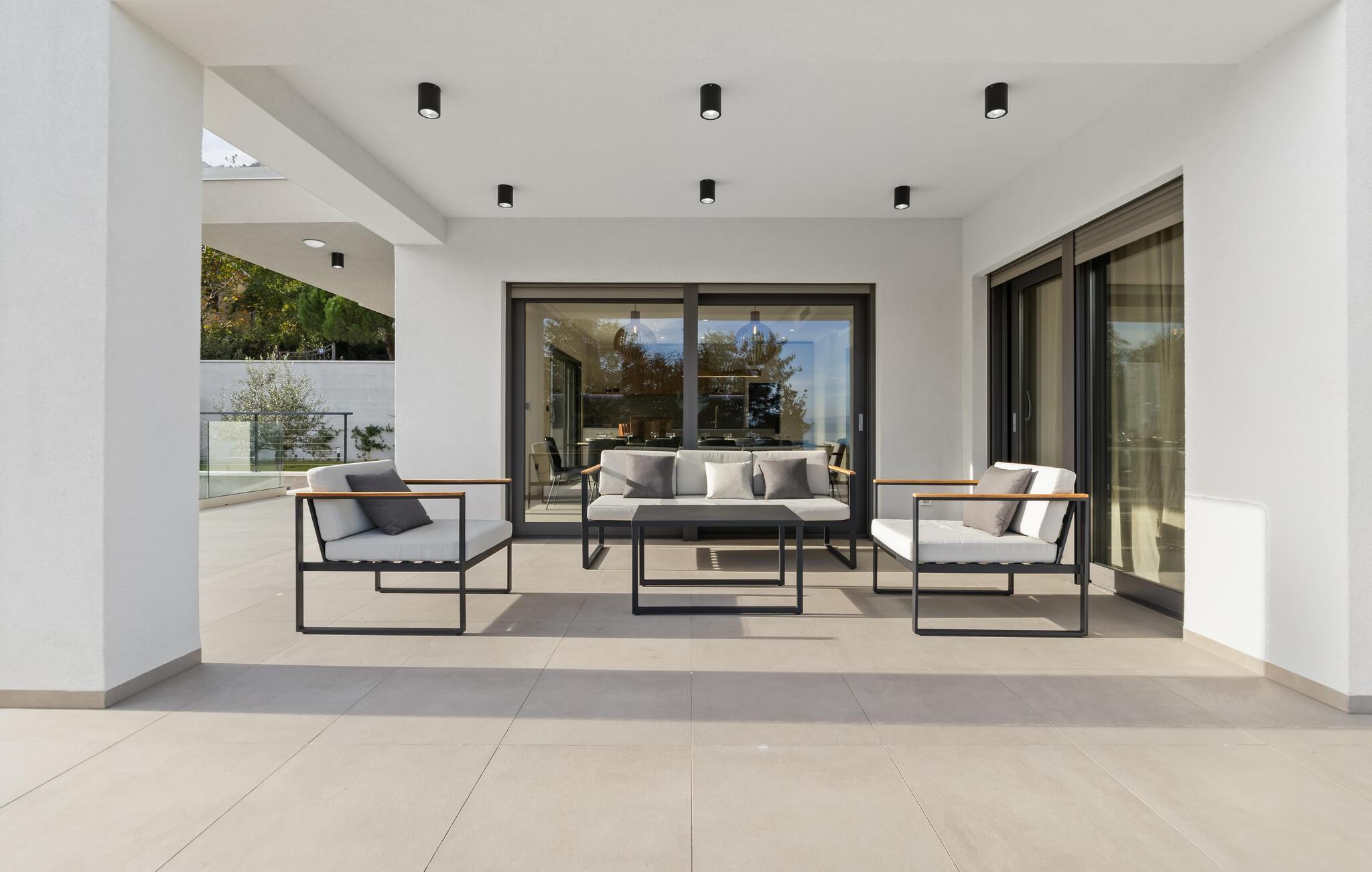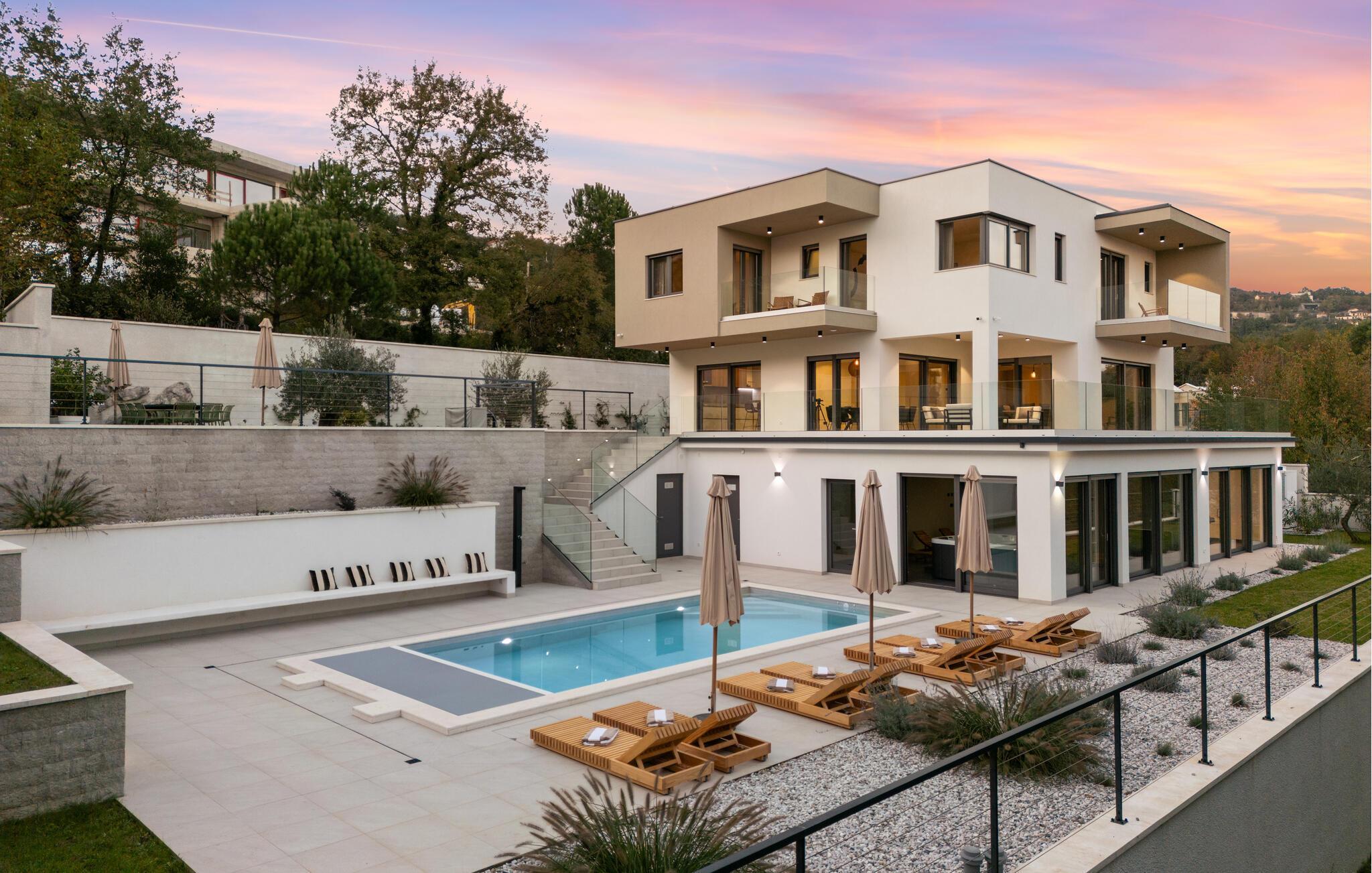 Der elegante Außenbereich lädt zum stundenlangen Sonnenbaden ein. Frühstücken Sie im Freien, feiern Sie laue Sommernächte am beleuchteten Pool und genießen Sie stimmungsvolle Barbecues im gepflegten Garten. Für romantische Zweisamkeit bei einem Glas Wein bieten sich die vielen Balkone mit Meerblick an.