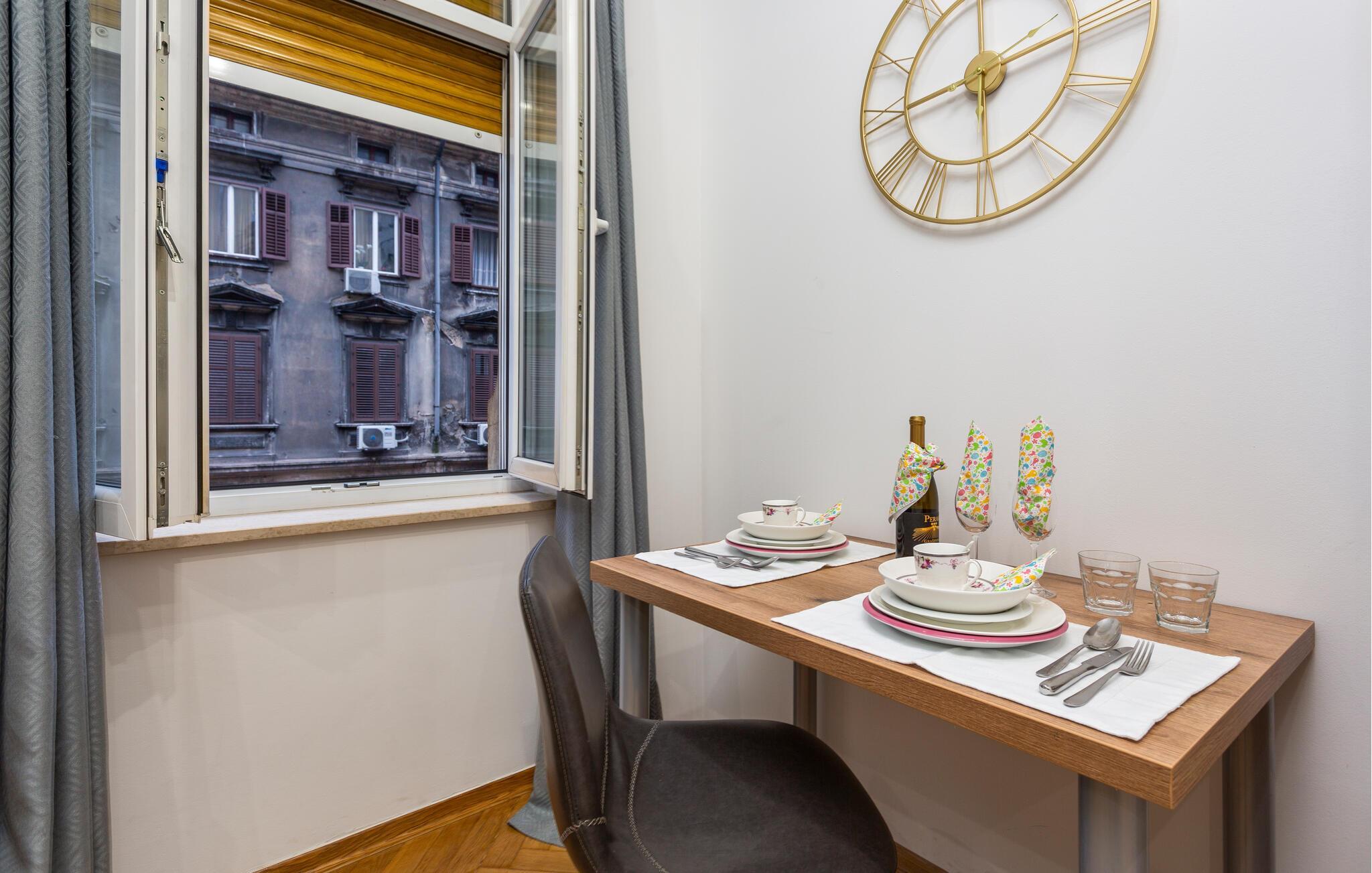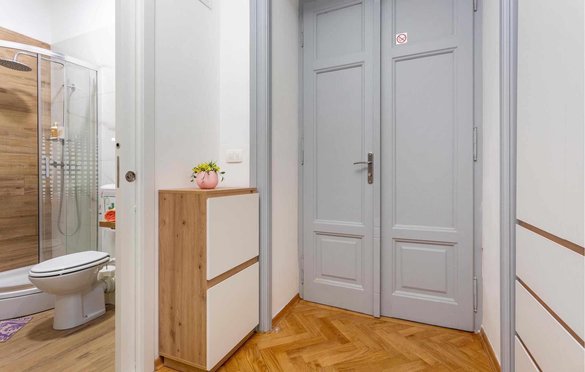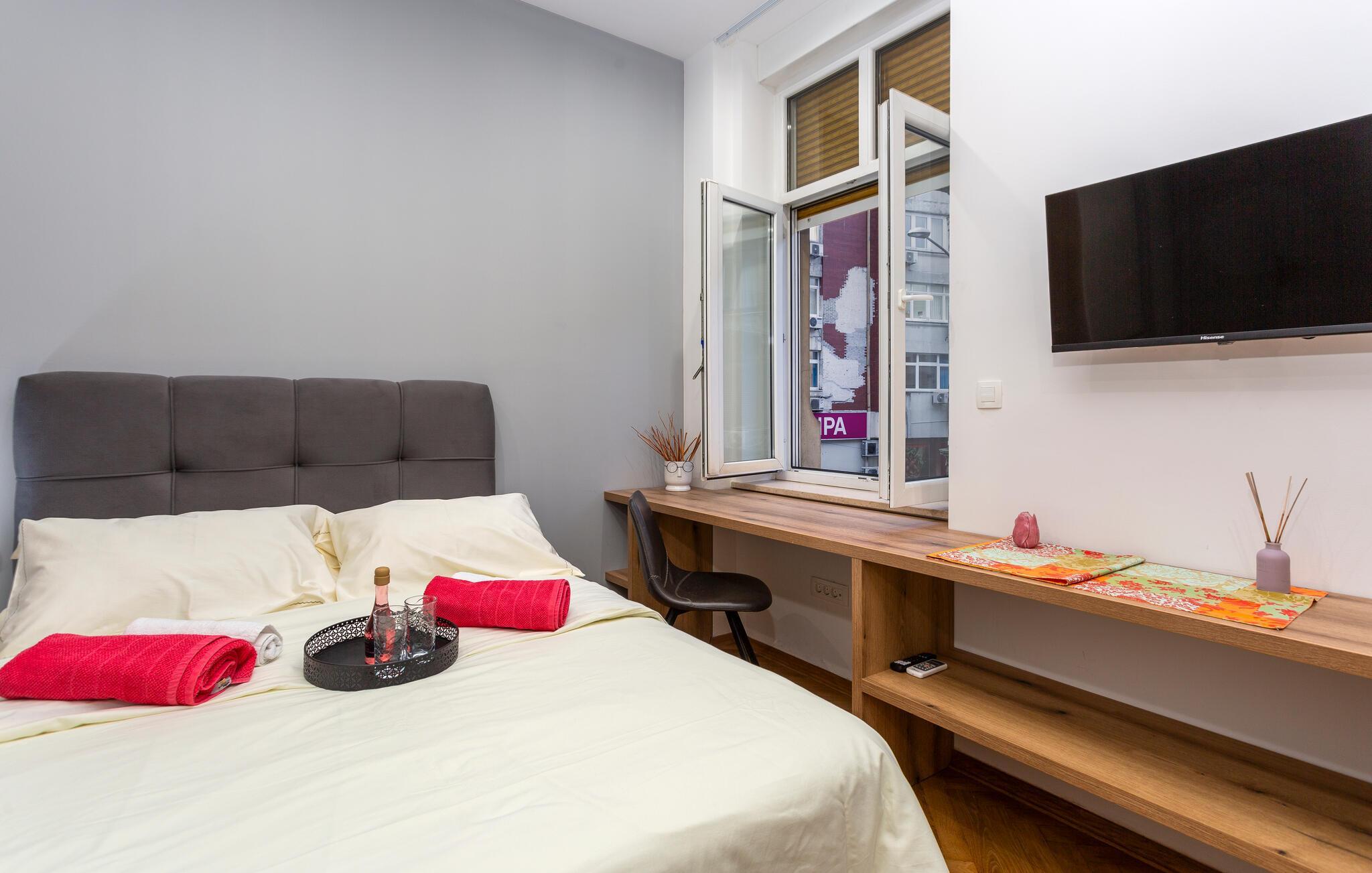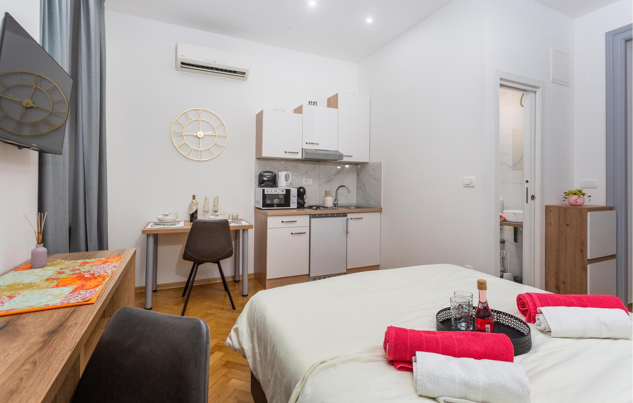 Dieses geschmackvoll eingerichtete Studio bietet Ihnen ein behagliches Refugium während Ihrer Entdeckungstouren durch die bezaubernde Hafenstadt Rijeka. Starten Sie den Tag mit einem ausgiebigen Frühstück, zubereitet in der modernen Küchenzeile, und genießen Sie Ihre Mahlzeiten am charmanten Essplatz. Verbringen Sie entspannte Abende bei einem guten Film und planen Sie die bevorstehenden Ausflüge bei einem Glas Wein.
