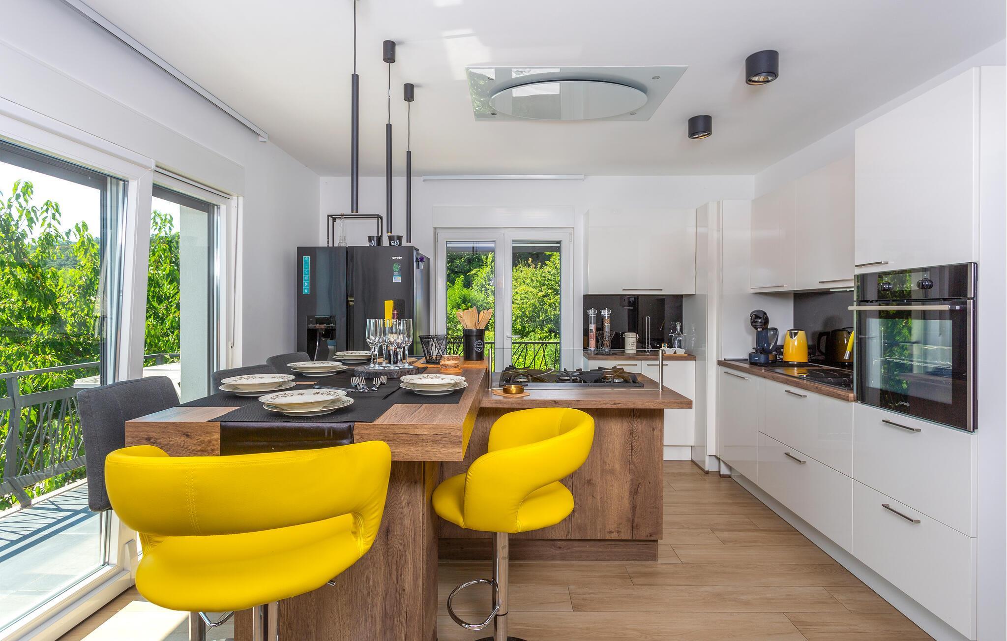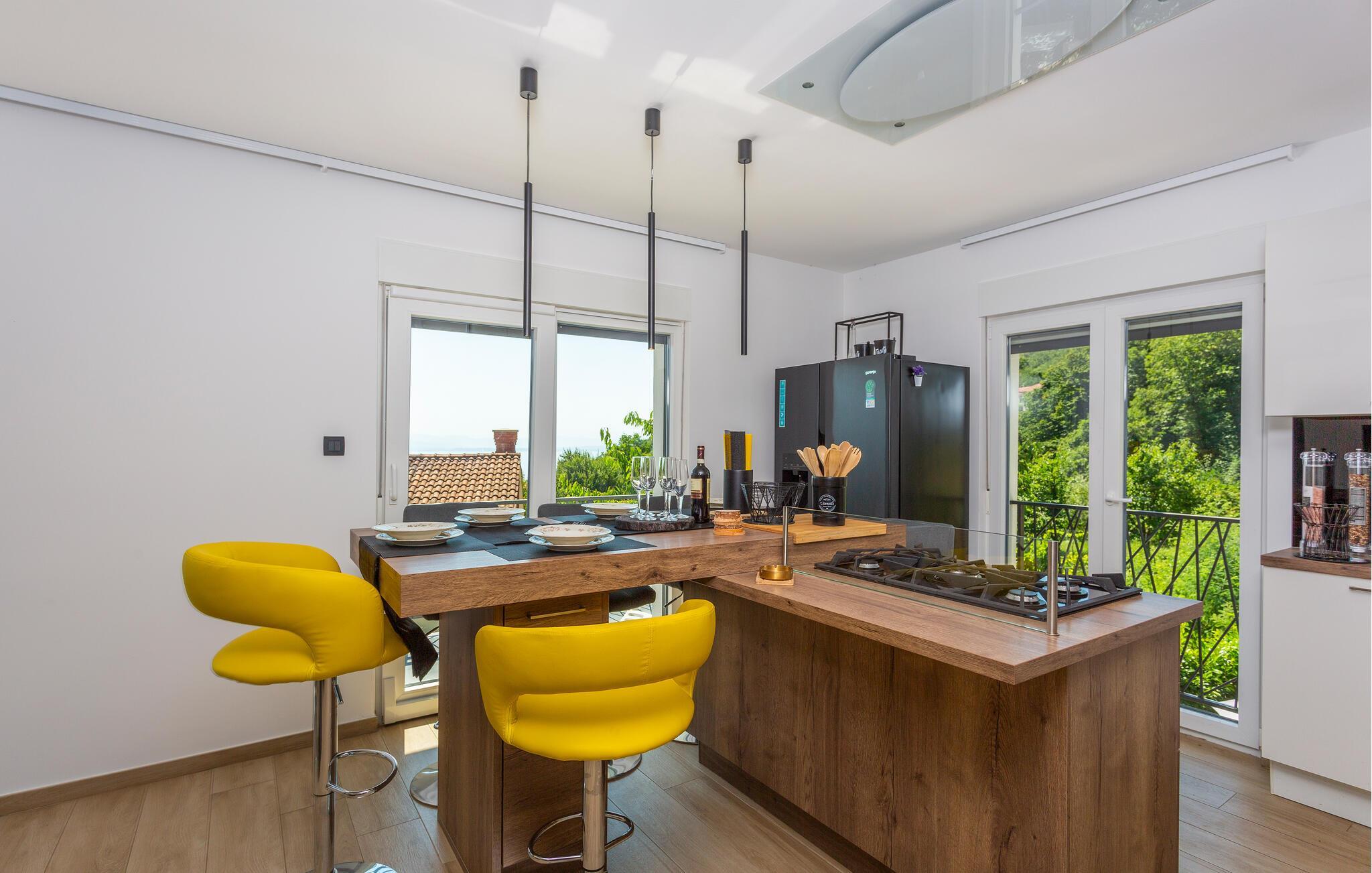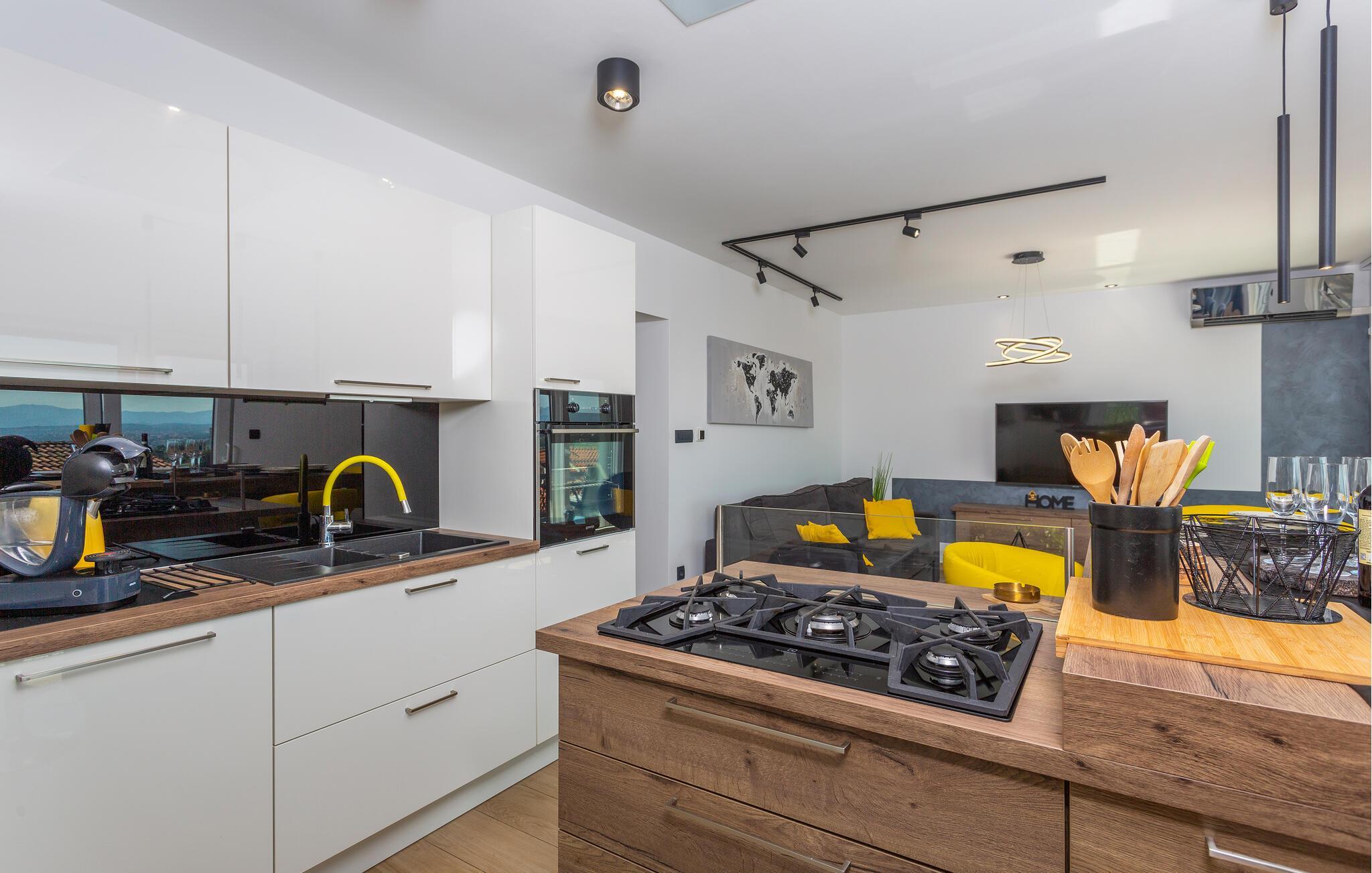 Erleben Sie Luxus und Komfort in Ihrer Ferienwohnung in Opatija-Rukavac, die sich durch ihre stilvolle Einrichtung und ein einladendes Ambiente auszeichnet. Die hellen Innenräume laden Sie ein, dank des modernen Komforts und einer entspannten Atmosphäre, zur Ruhe zu kommen. Das Kochen in der modernen Küche wird zum Erlebnis. Helfen Sie alle mit und entspannen Sie sich am Abend bei einem unterhaltsamen Film auf dem Sofa.