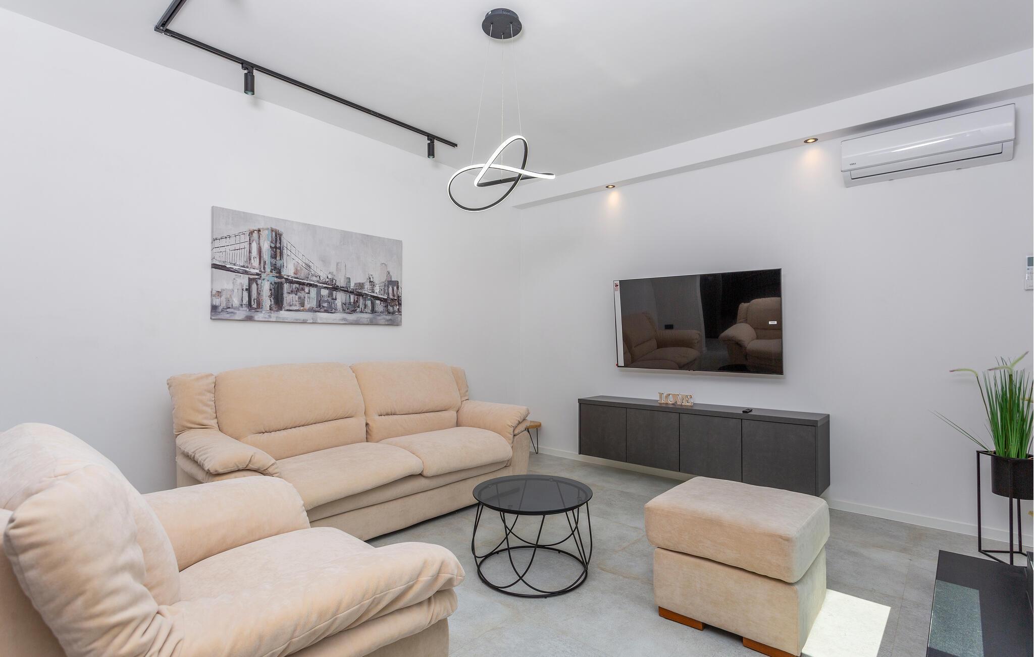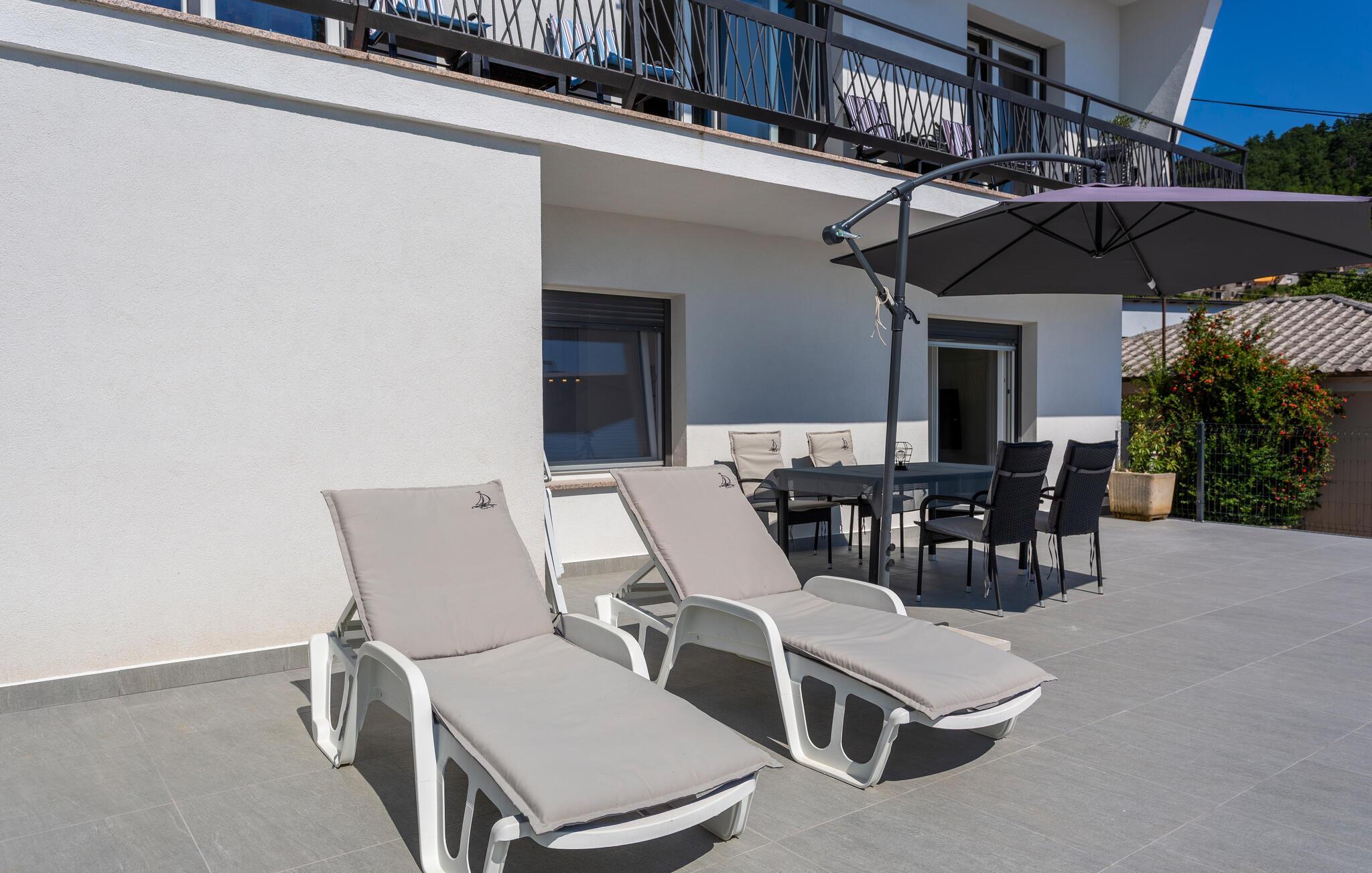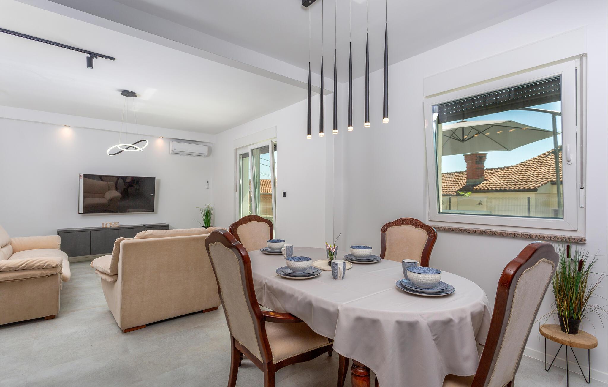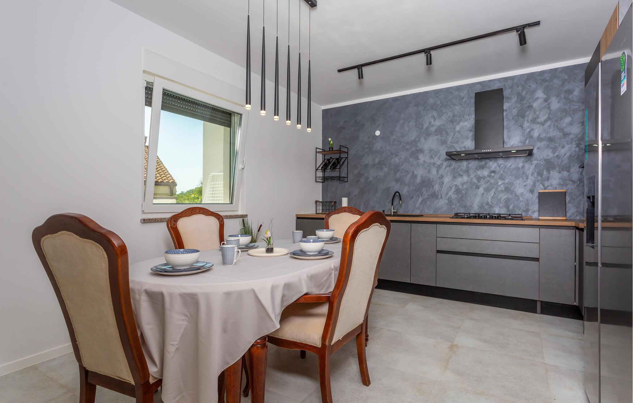 Erleben Sie Luxus und Komfort in Ihrer Ferienwohnung in Opatija-Rukavac, die sich durch ihre stilvolle Einrichtung und ein einladendes Ambiente auszeichnet. Die hellen Innenräume laden Sie ein, dank des modernen Komforts und einer entspannten Atmosphäre, zur Ruhe zu kommen. Das Kochen in der modernen Küche wird zum Erlebnis. Helfen Sie alle mit und entspannen Sie sich am Abend bei einem unterhaltsamen Film auf dem Sofa.