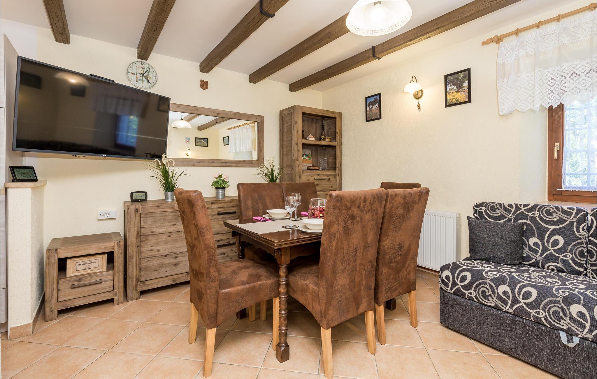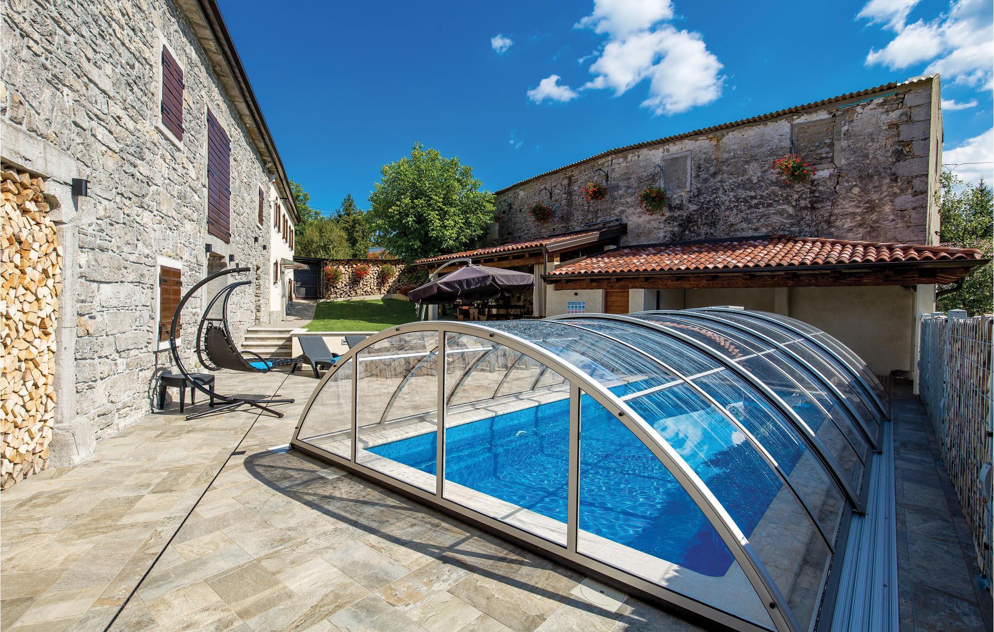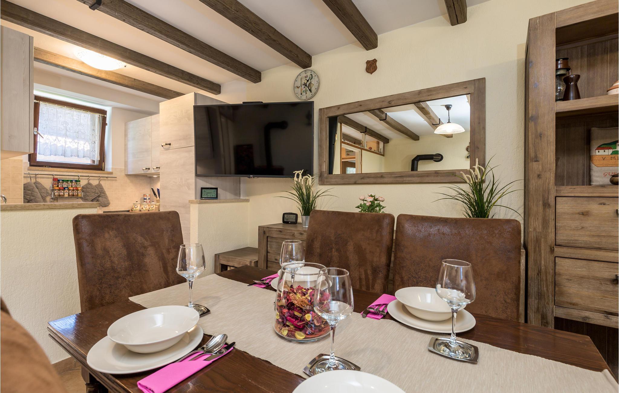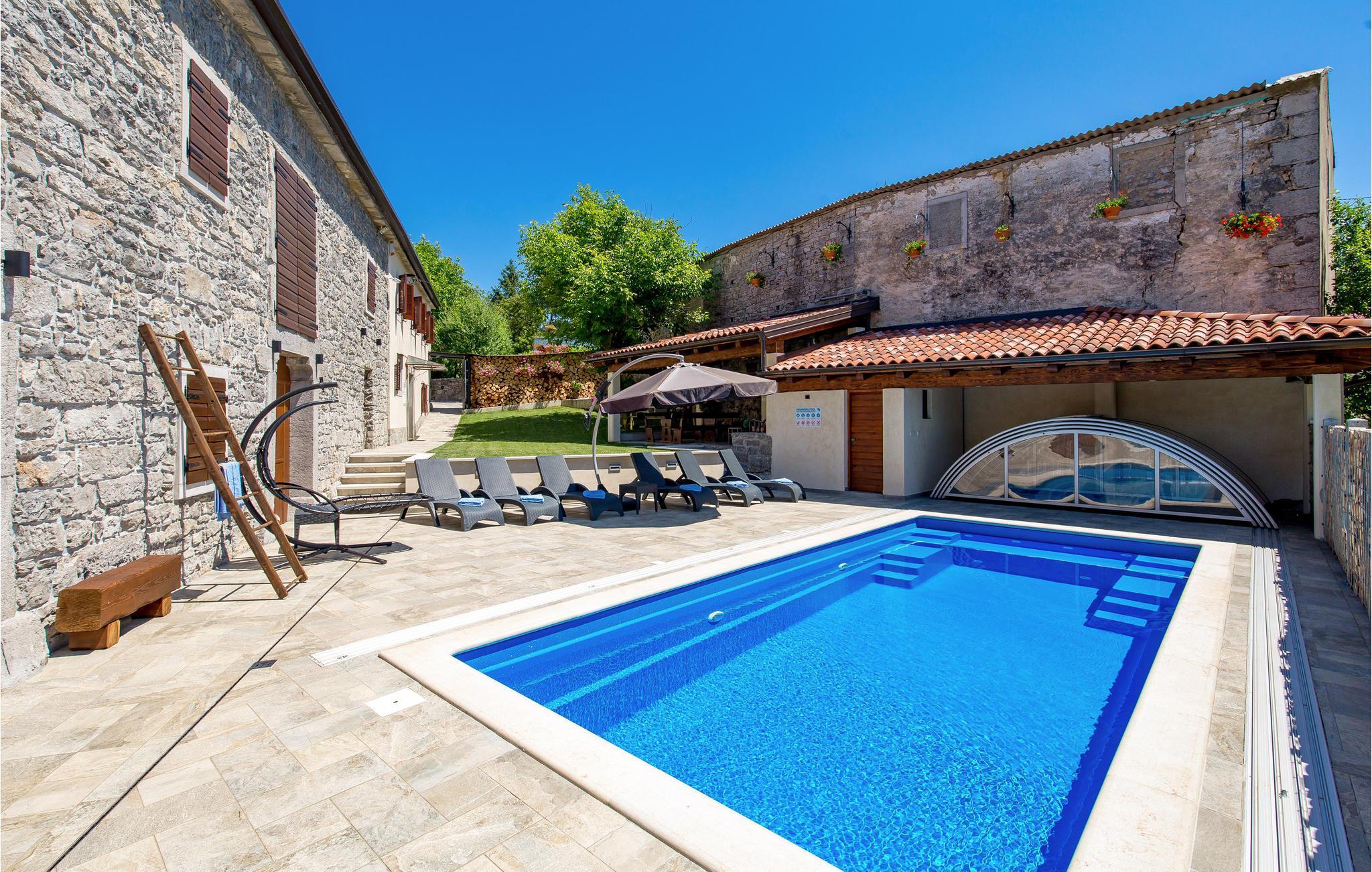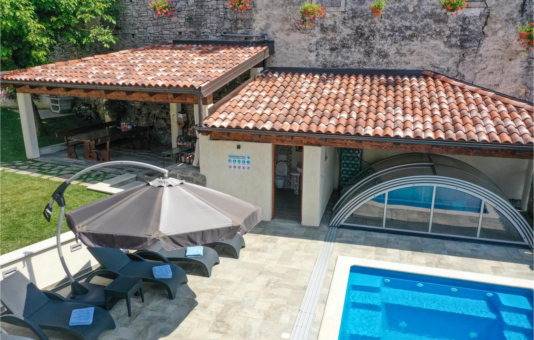 Das charmante Ferienhaus liegt im kleinen Ort Vele Mune. Hier werden Sie einen perfekten Urlaub verbringen, Sie sind umgeben von einer wunderschönen Landschaft, Obstgärten, Wiesen, Teichen und Wäldern. Das Haus ist komfortabel und praktisch eingerichtet. Im Erdgeschoss liegt der Wohnraum und im Obergeschoss sind die Schlafzimmer. Der Hof ist großzügig; hier gibt es eine Terrasse, einen Pool und einen Grill. Der Pool ist mit einem UV-Sterilisator ausgestattet, der zusätzlich für die Wasserhygiene sorgt. Mit dem Billard und Darts werden Sie viel Spaß haben. Das Klima der gebirgigen Küste sorgt für warme, sonnige Tage und frische Nächte. An der Riviera von Opatija liegen schöne Strände, im alten Kastav und in Rijeka gibt es ebenfalls viel zu sehen und zu erleben. Die Kvarner Bucht beherbergt die besten Restaurants Kroatiens, sie alle verwöhnen Sie mit einer exzellenten, mediterranen Küche. In Absprache mit dem Eigentümer ist es möglich, 3 Fahrräder für Erwachsene und 2 für Kinder zu benutzen. Eine Poolkuppel sorgt für angenehmen Spaß auch in der Vor-und Nachsaison.