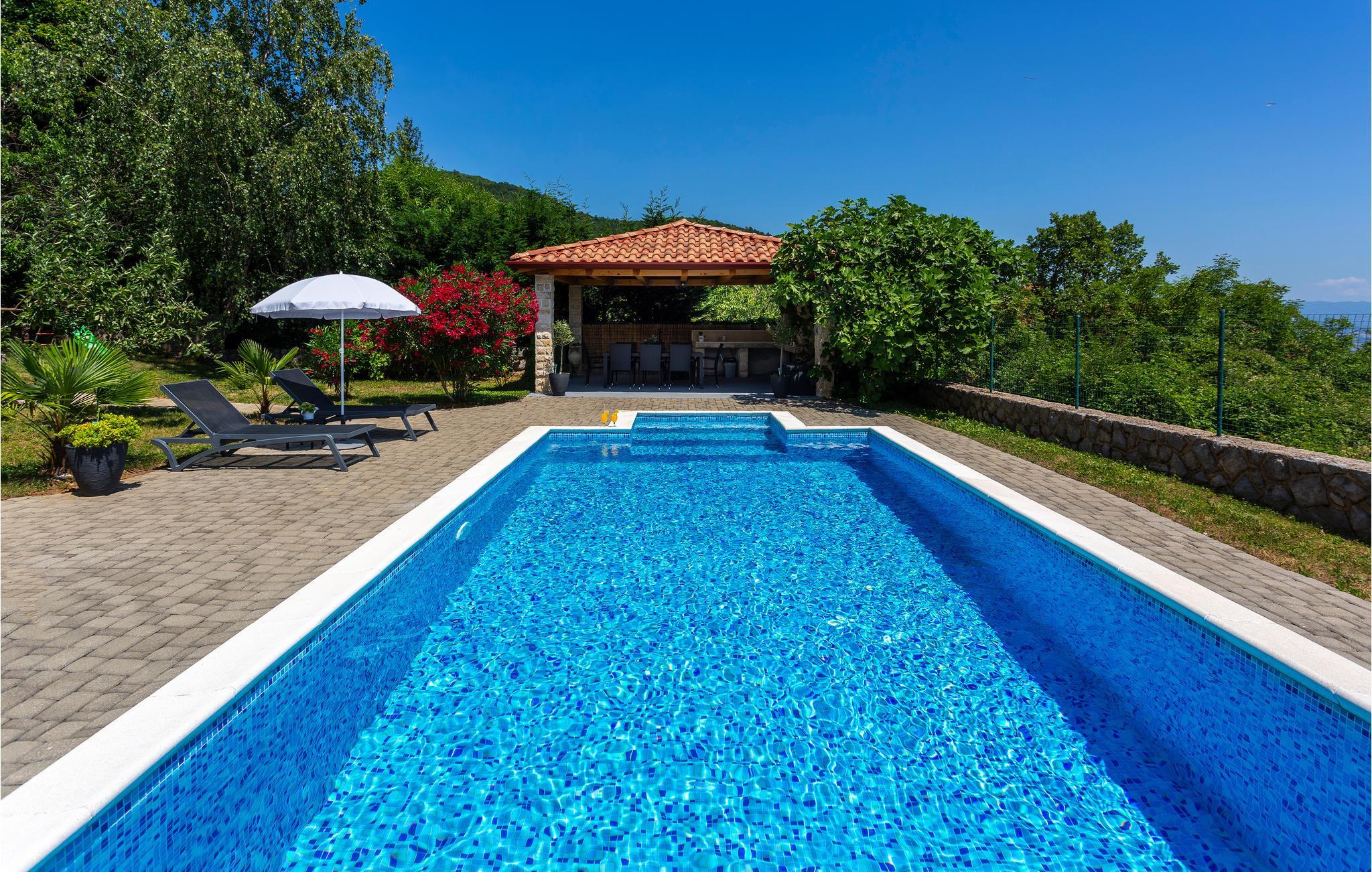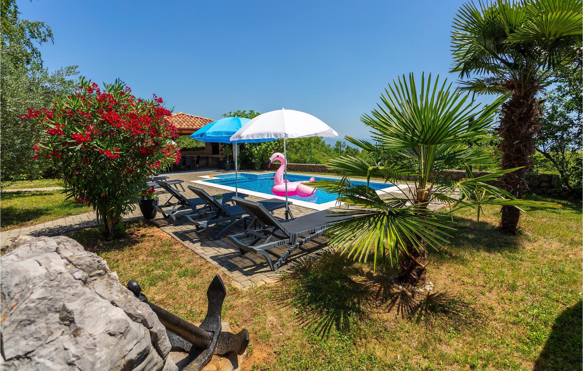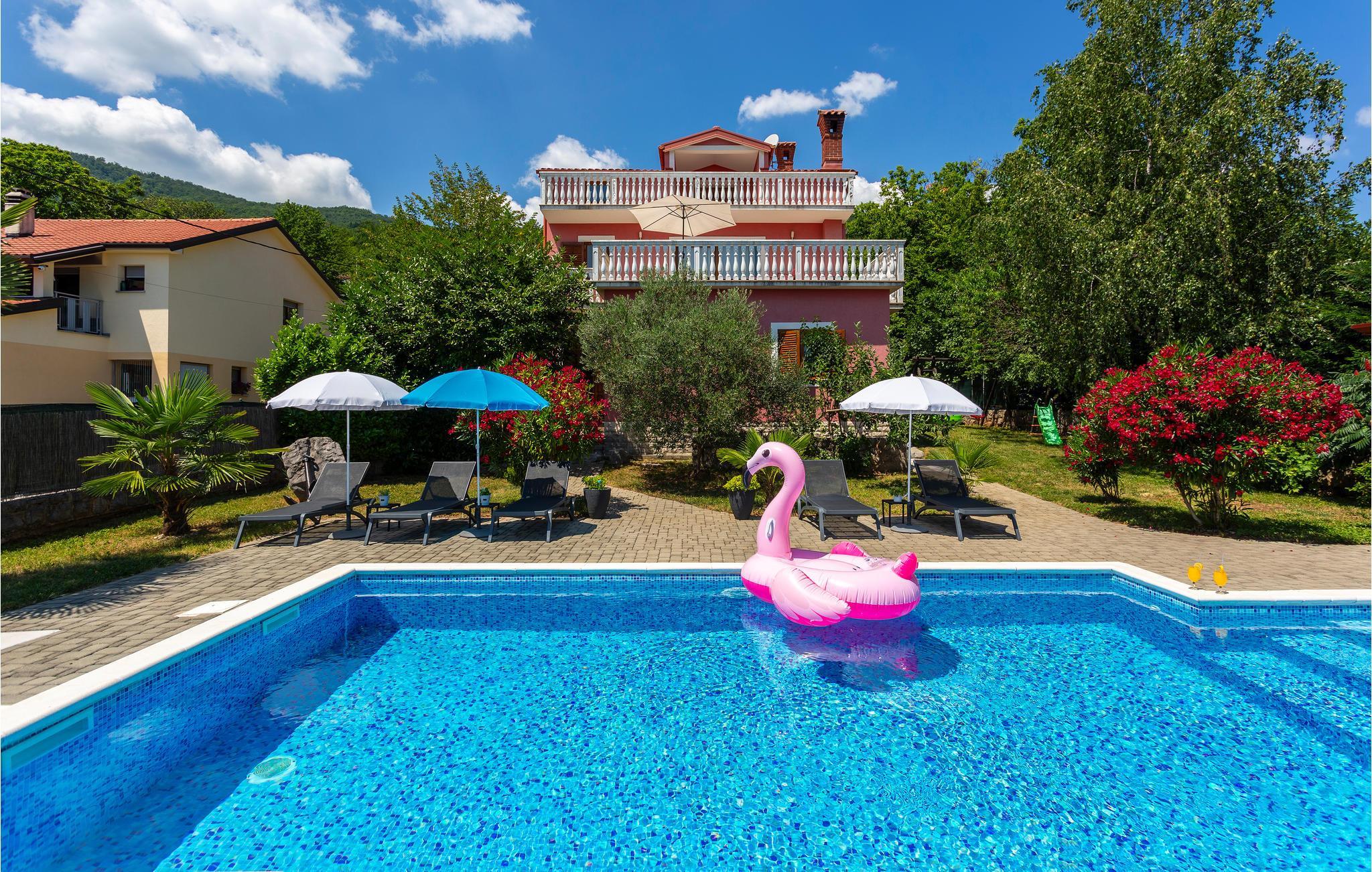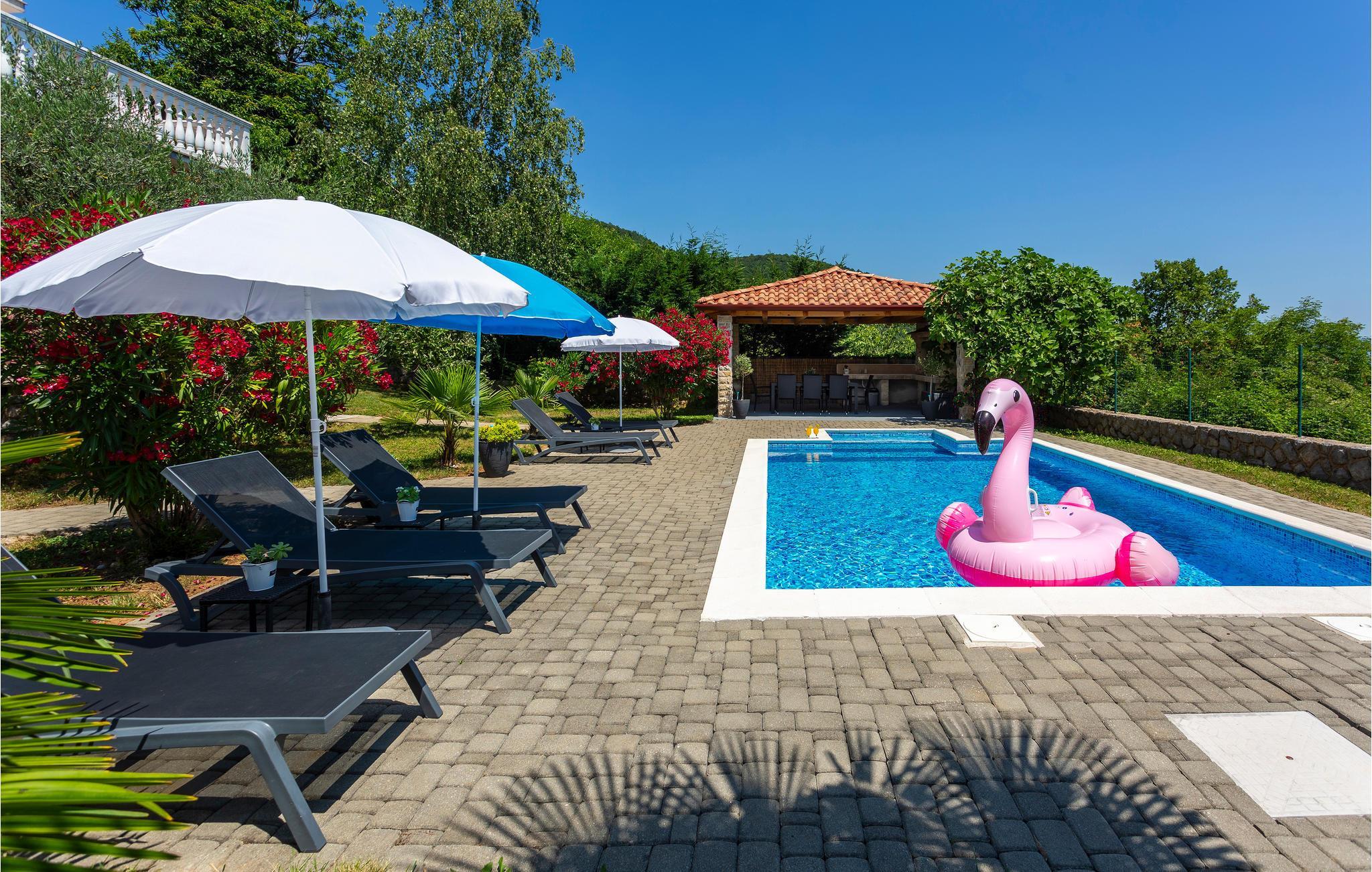 Dieses Ferienhaus befindet sich auf den Berghängen des Ucka Gebirges mit einem wunderschönen Ausblick auf die Kvarner Bucht. Das Haus hat zwei Stockwerke mit Innentreppen. Die große Terrasse ist im Obergeschoß, mit einer Spielecke für Kinder und wird den Ansprüchen zweier Familien gerecht. Die meiste Zeit werden Sie am Pool und auf der überdachten Terrasse im Garten verbringen, wo Sie am Grill leckere Speisen zubereiten können. Nur ein paar Autominuten entfernt sind die bekannten Strände Moscenicka draga und Icici gelegen. Lernen Sie beim Abendspaziergang auch den bekannten Ferienort Opatija und seine Strandpromenade kennen, welche sich über mehrere Kilometer durch die Küstenorte zieht.