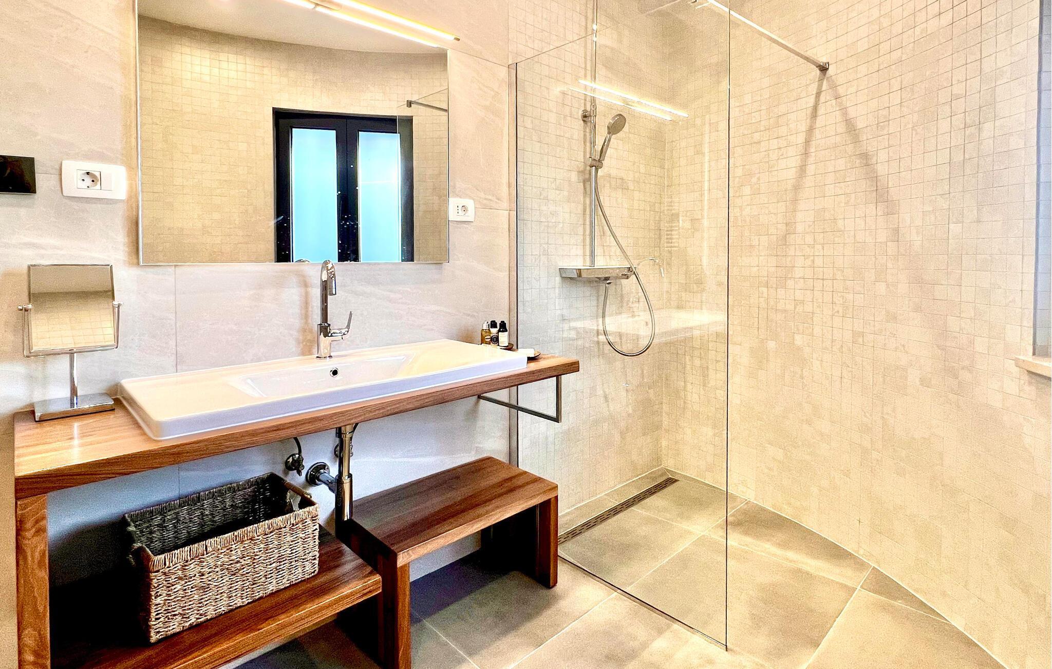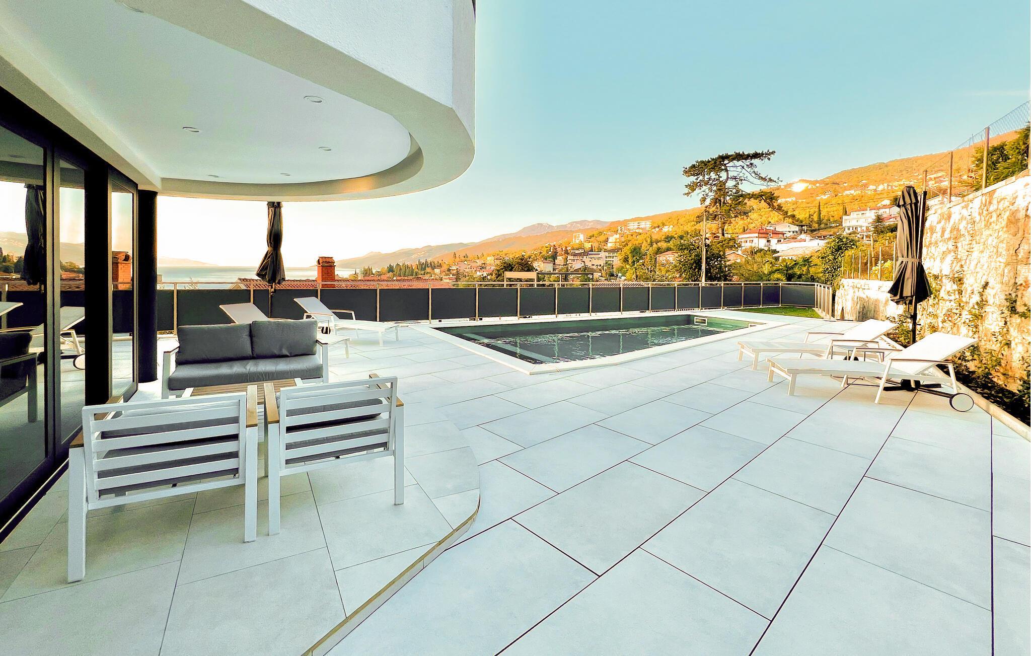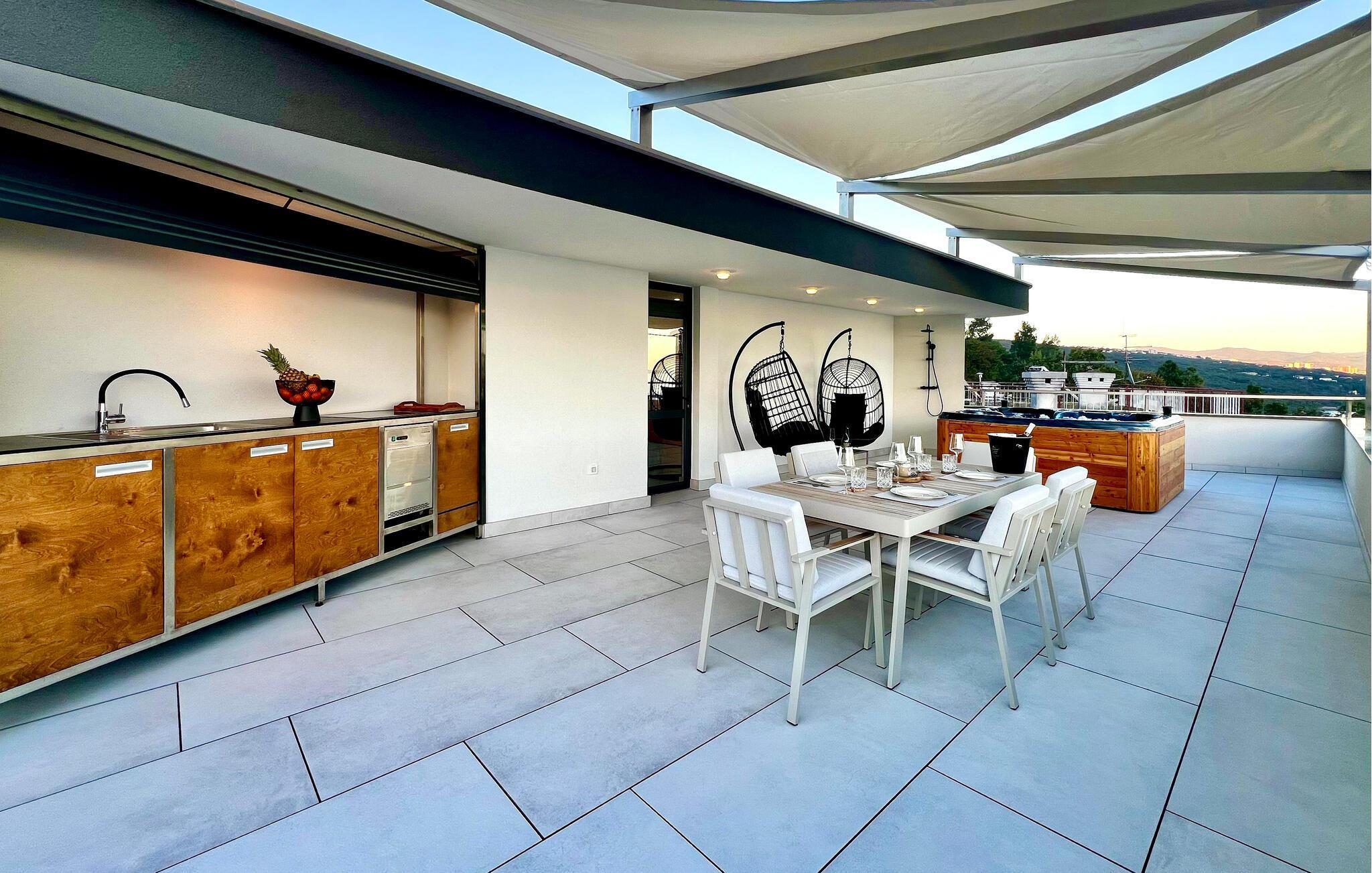 Auf der sichtgeschützten Poolterrasse genießen Sie Privatsphäre – starten Sie mit einem Frühstück im Freien in den Tag und freuen Sie sich auf stundenlanges Sonnenbaden. Gönnen Sie sich wohlige Momente im Whirlpool auf der Panoramaterrasse und servieren Sie sich Köstlichkeiten vom Grill.