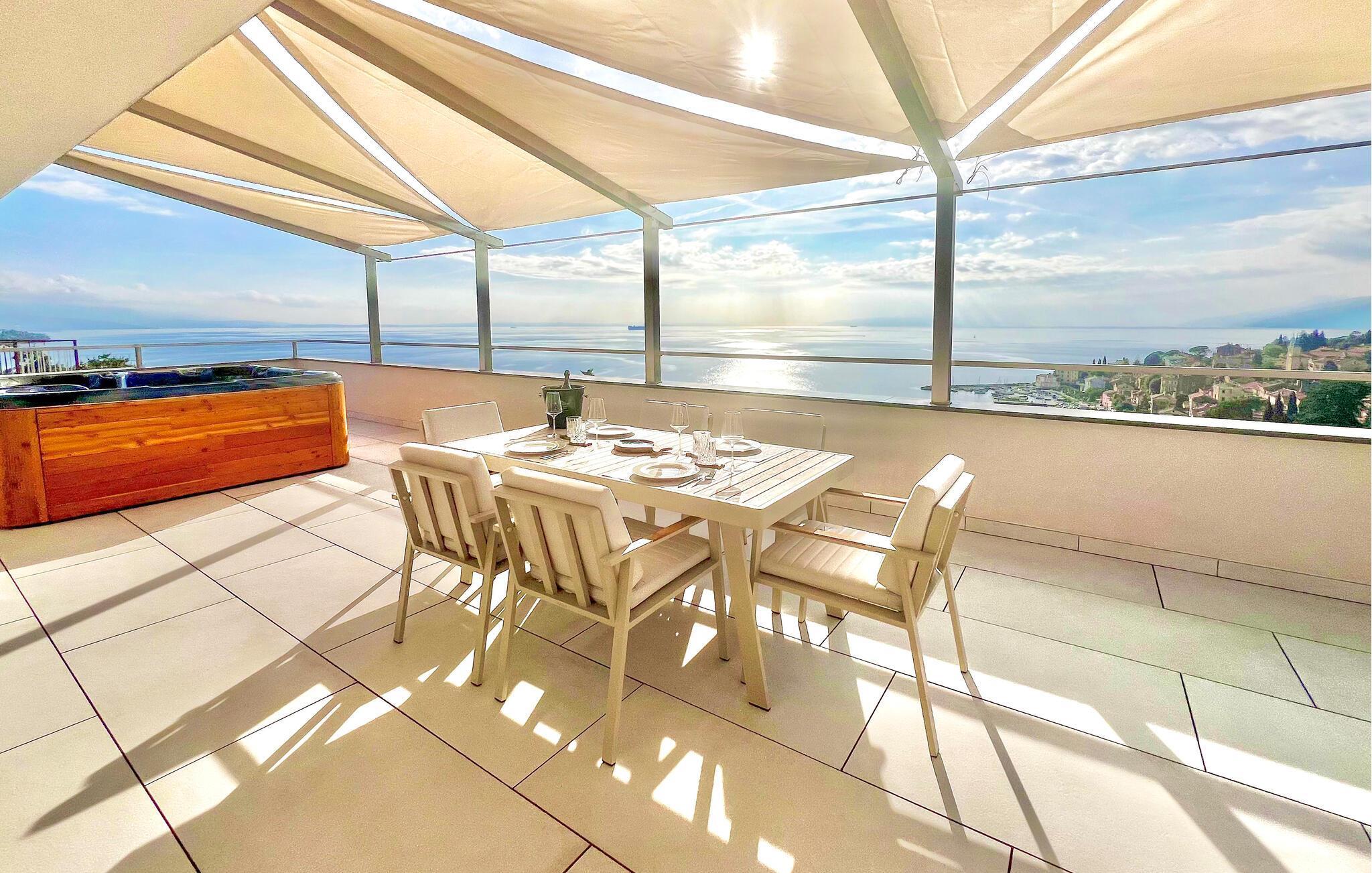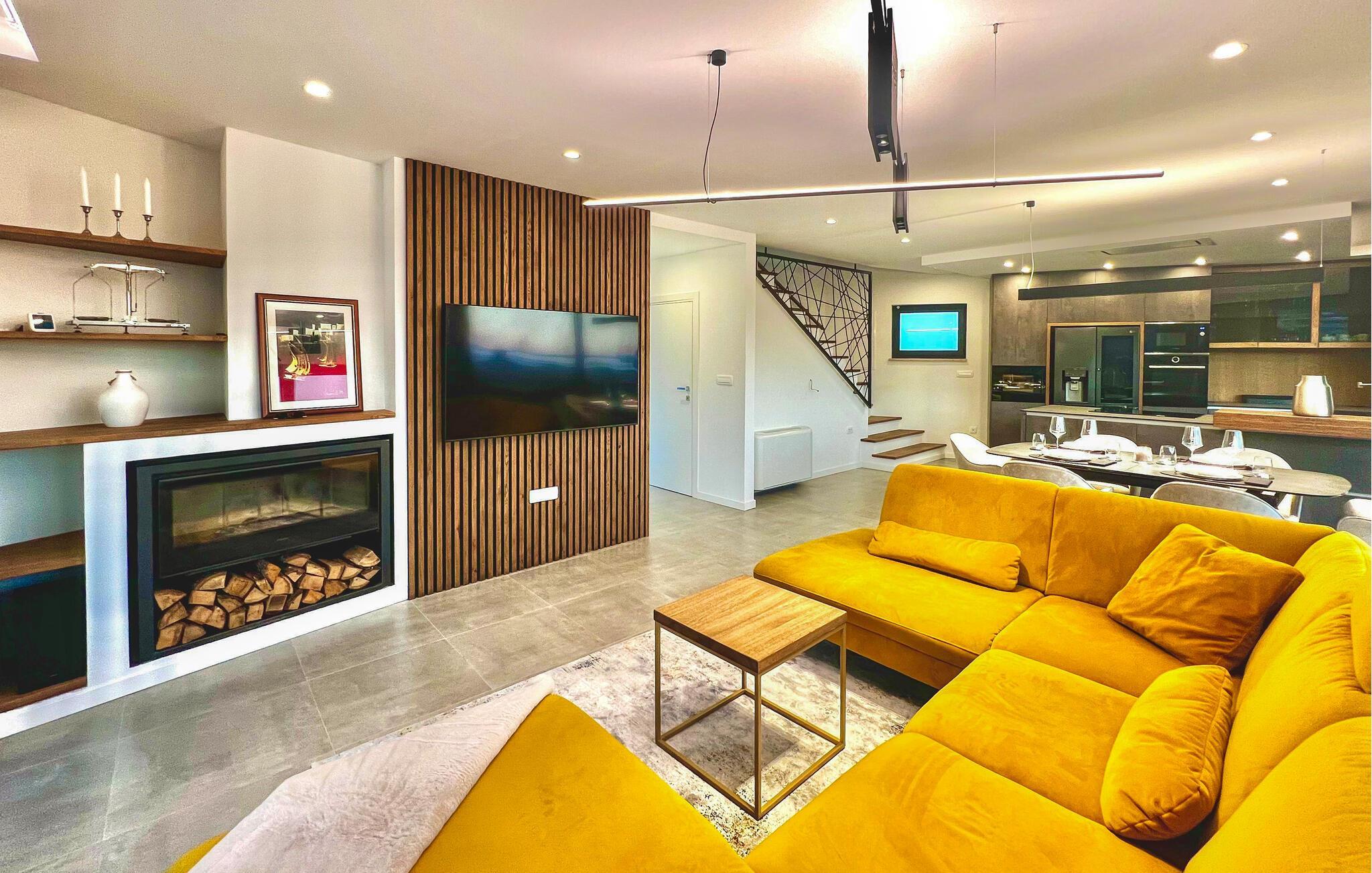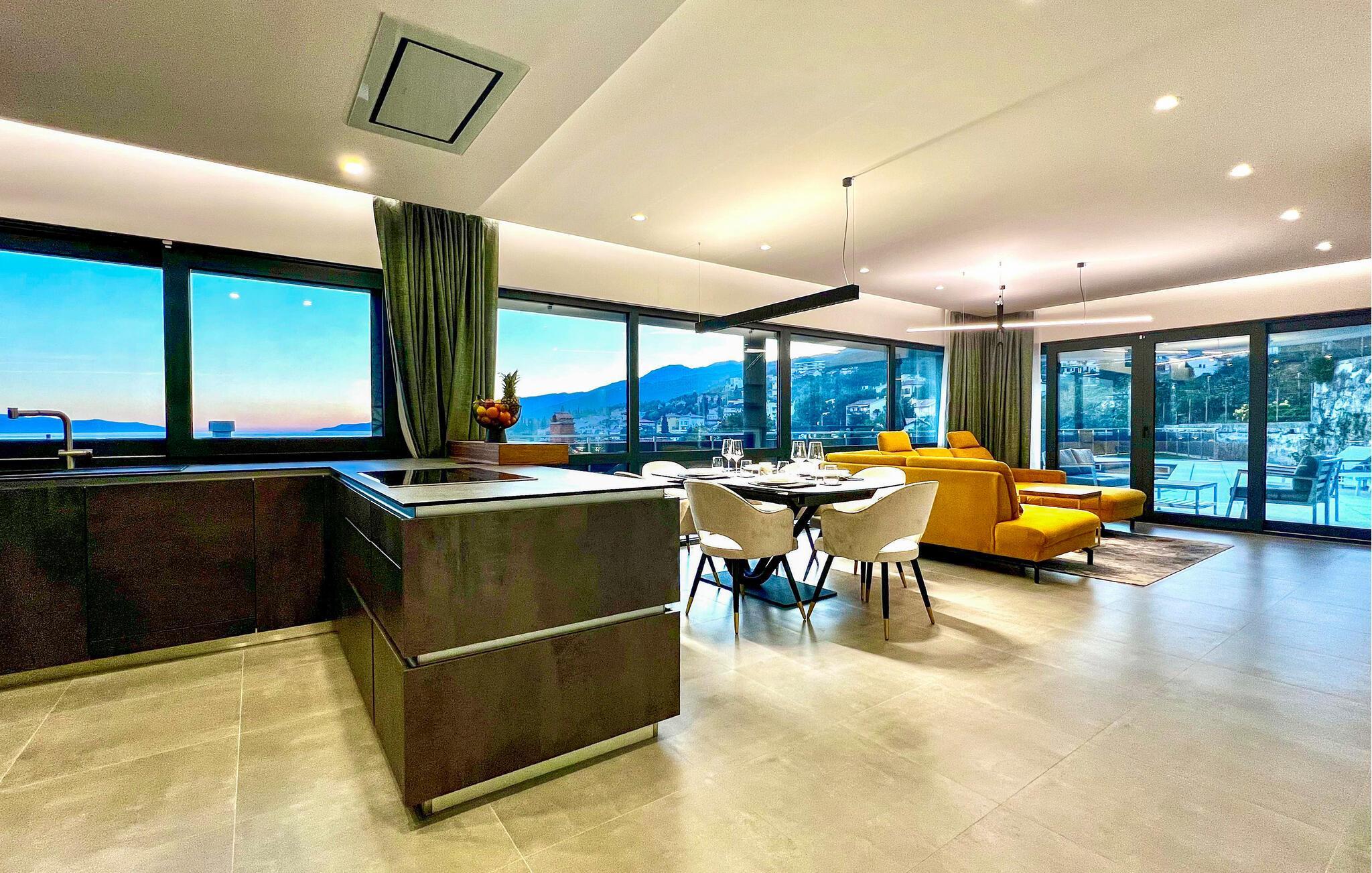 Dieses außergewöhnliche Luxusobjekt verwöhnt Sie mit einem stilvollen, hochwertig ausgestatteten Interieur und einem fantastischen Panoramablick aufs Meer. Zaubern Sie kulinarische Highlights in der modernen Küche und genießen Sie Ihre Mahlzeiten im offenen Wohnbereich, in dem große Fensterfronten für viel natürliches Licht sorgen. Abends wird die geschmackvolle Einrichtung durch eine warme Beleuchtung in Szene gesetzt – lassen Sie den Kamin für zusätzliche Behaglichkeit sorgen, während Sie auf dem Sofa entspannen.